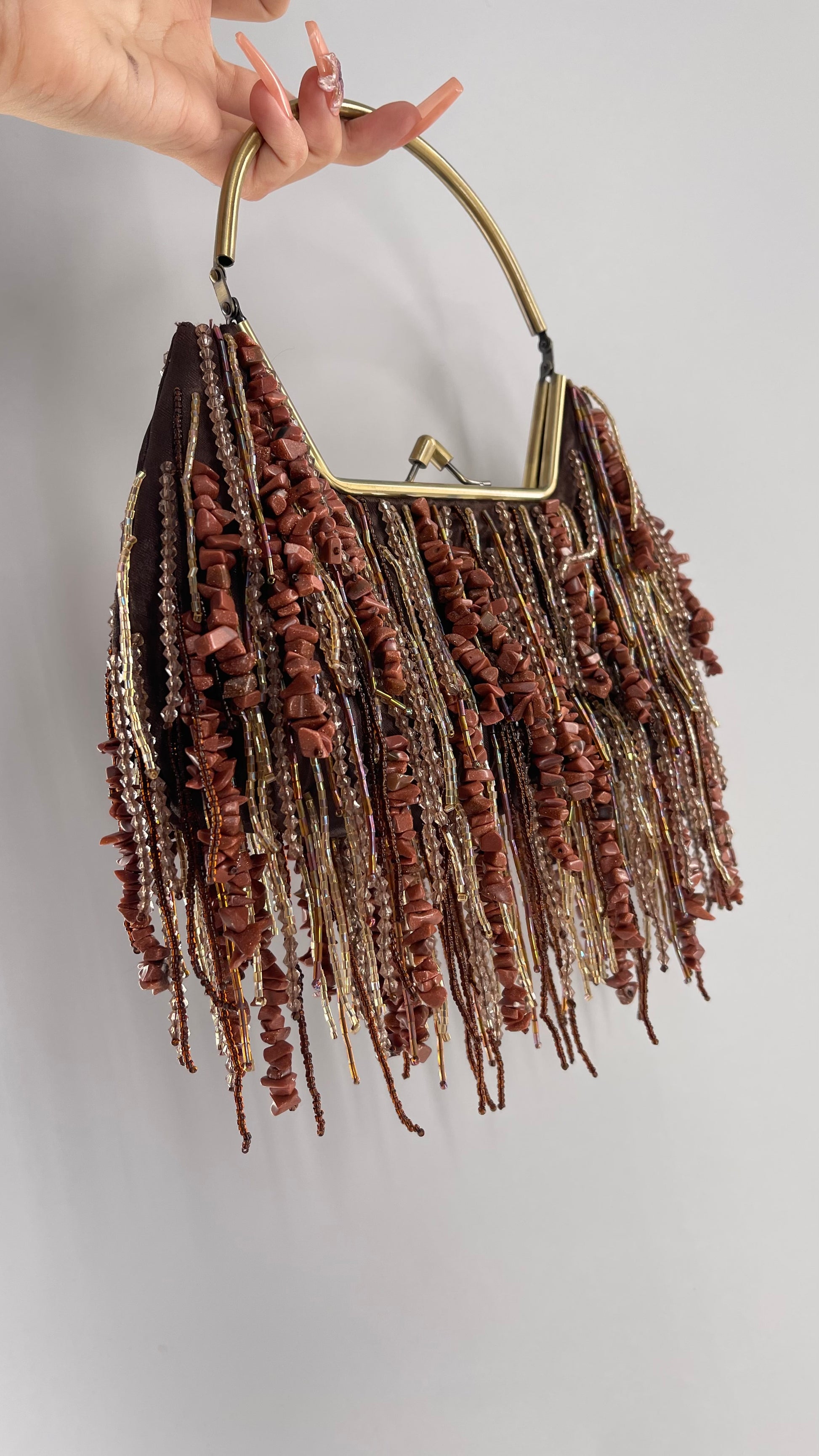 Vintage Purse Covered in Strands of Brown Beads and Gold Stone