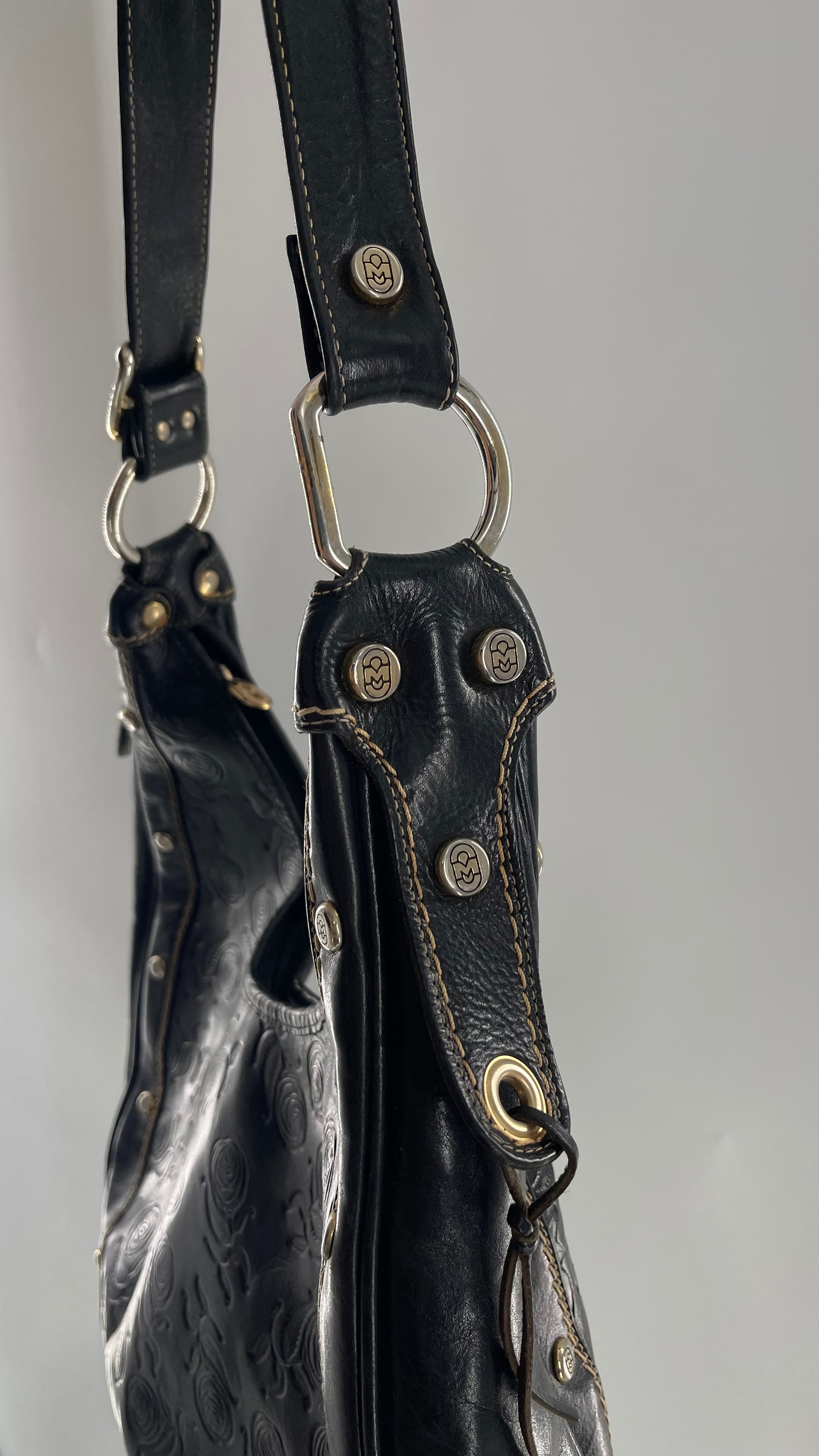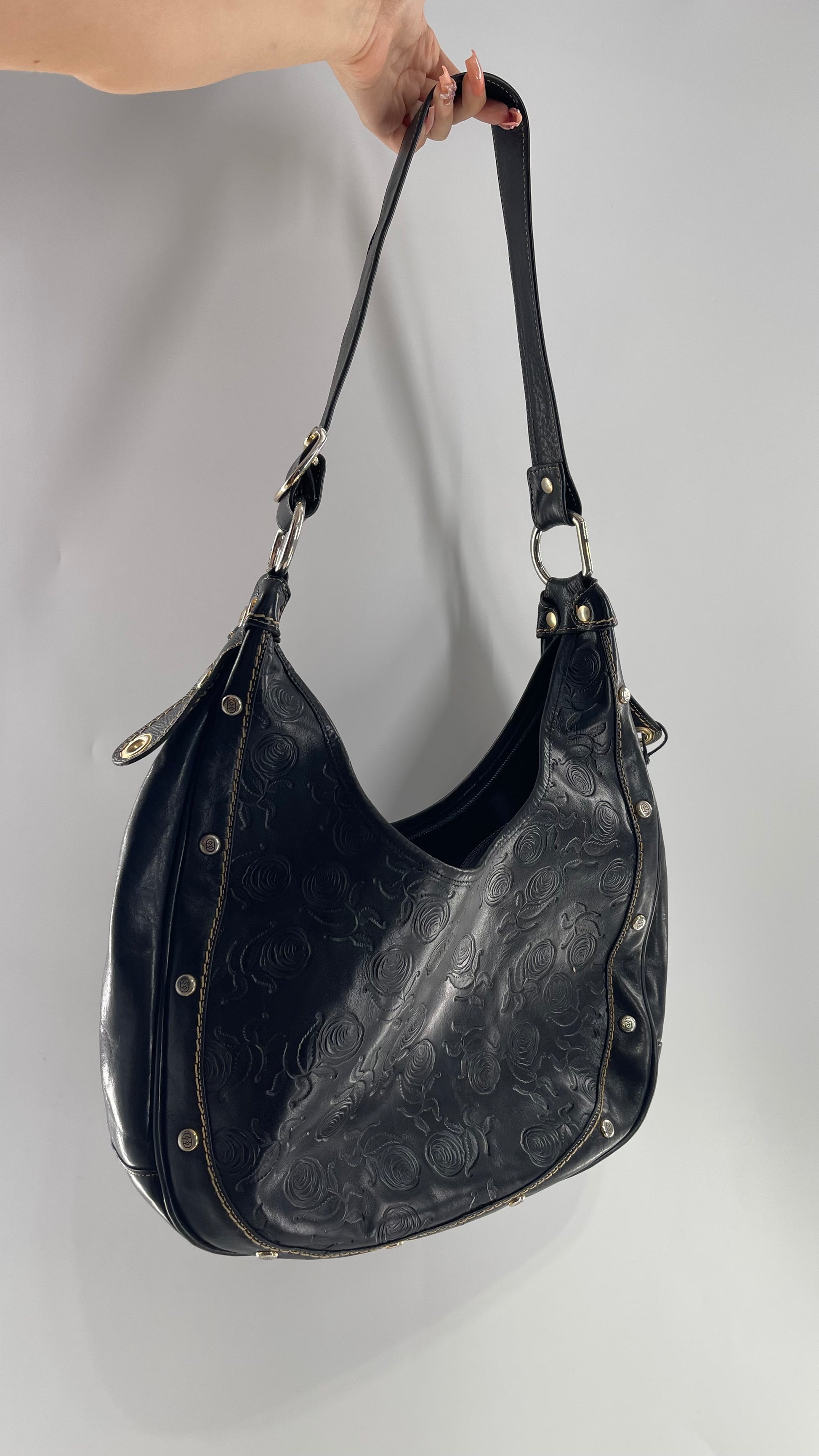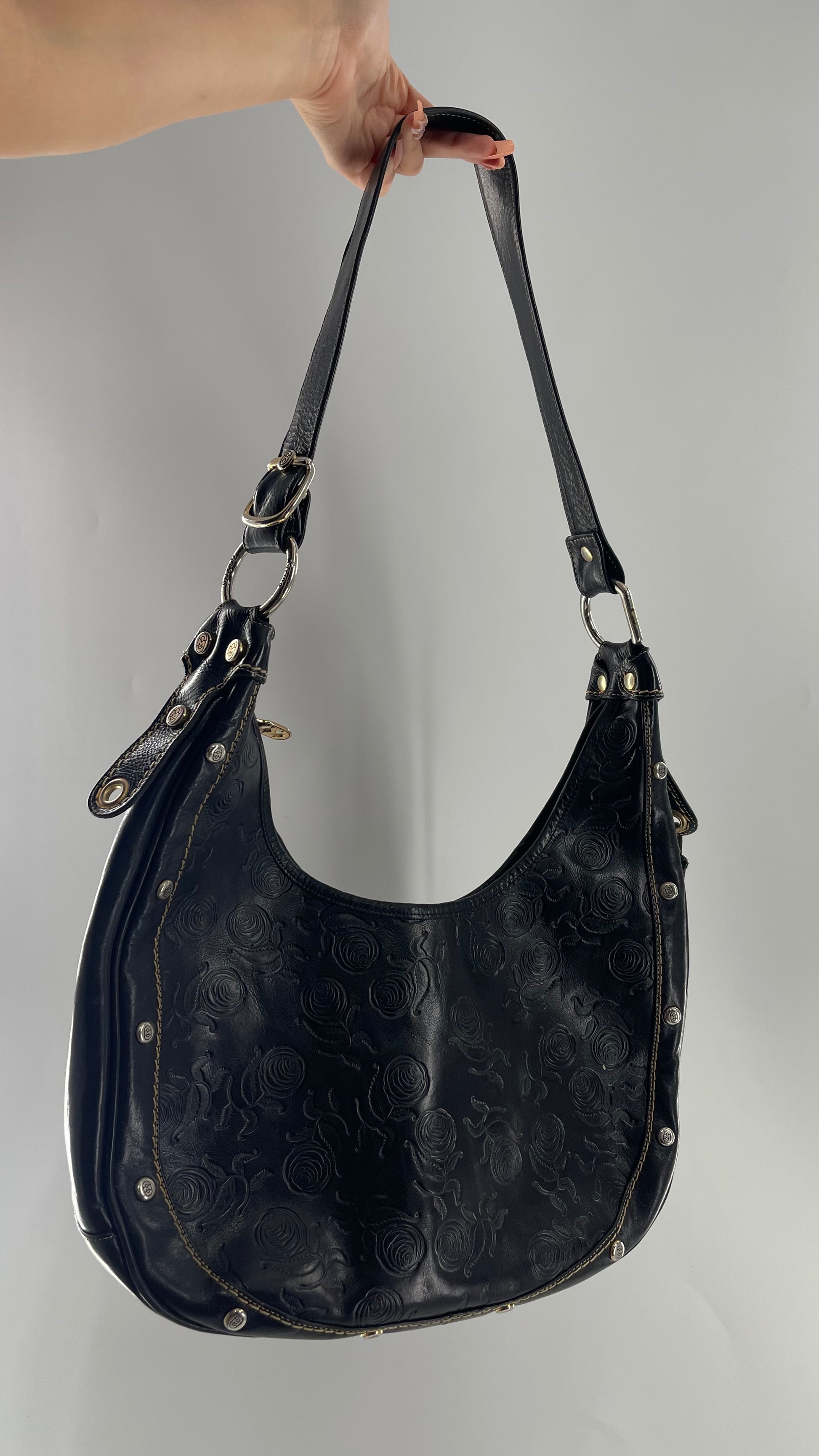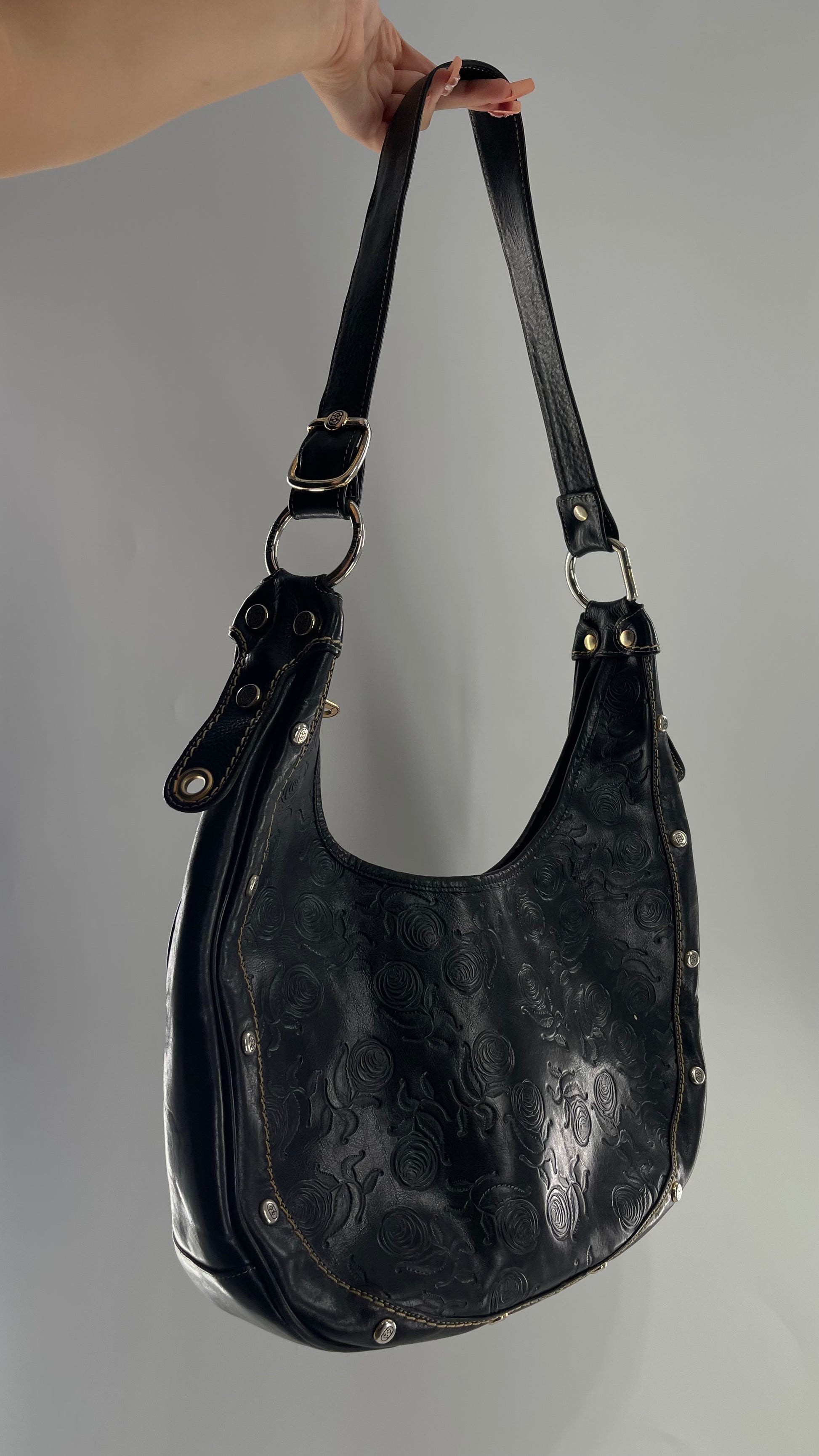 Vintage Marino Orlandi Black Leather Embossed Rose Studded Satchel Bag