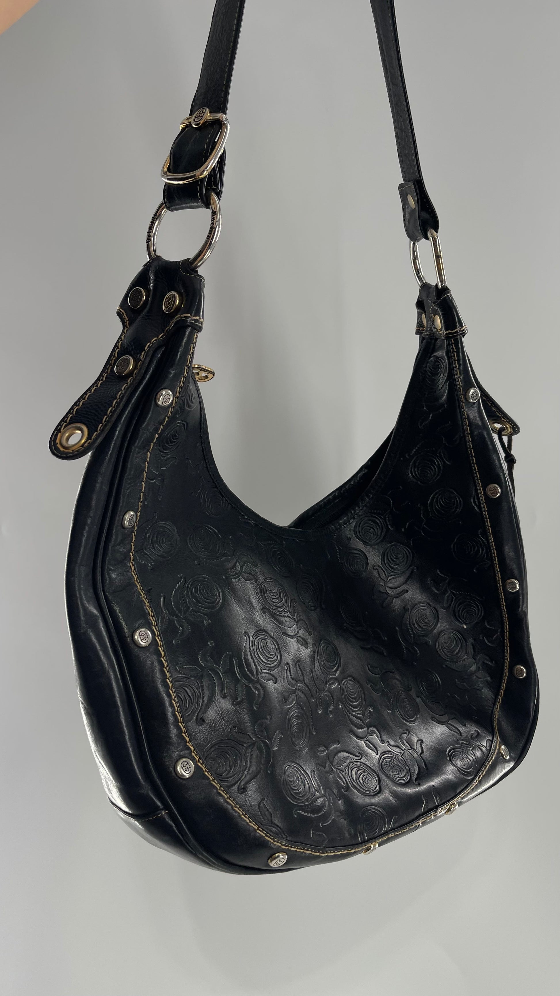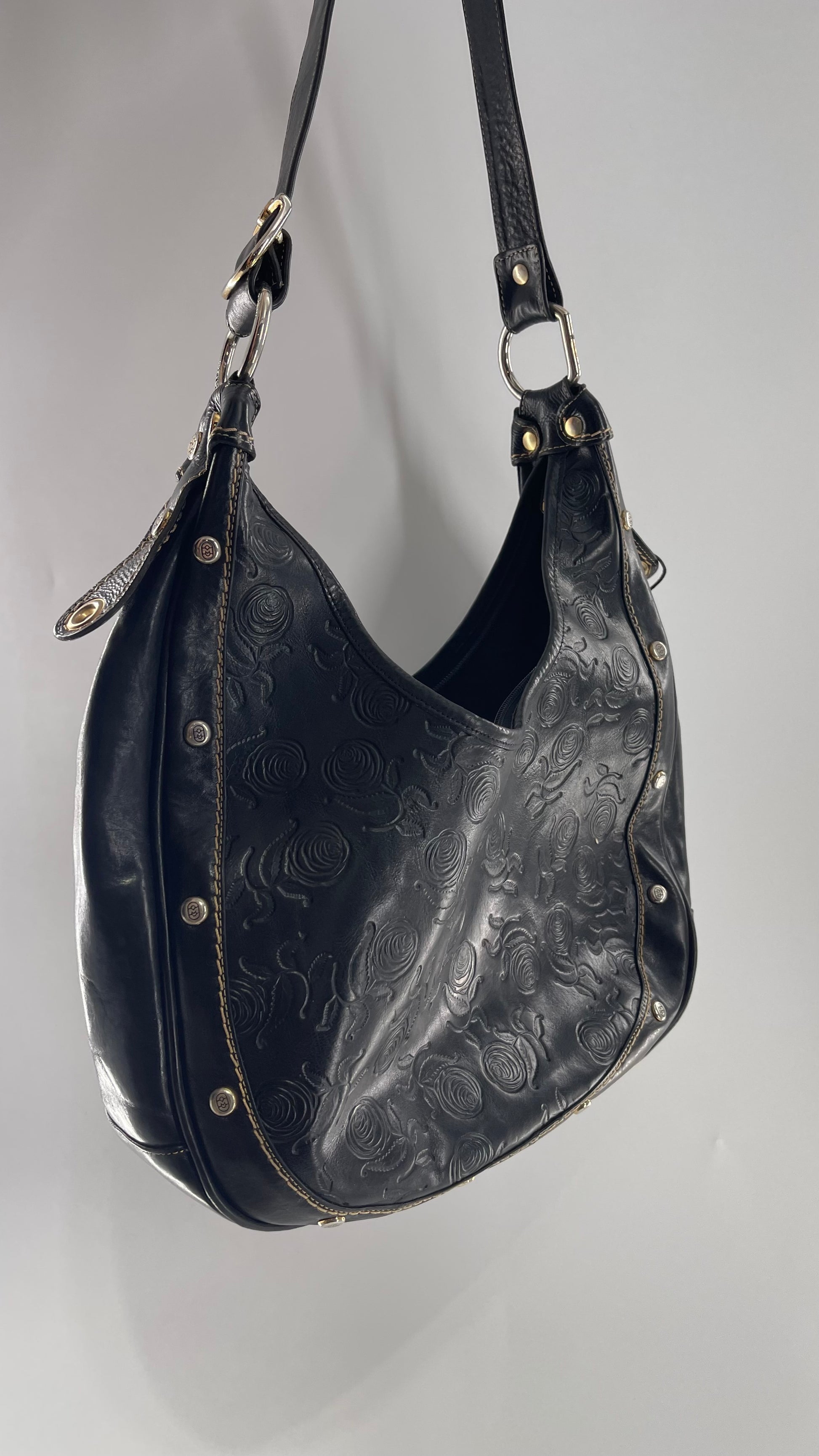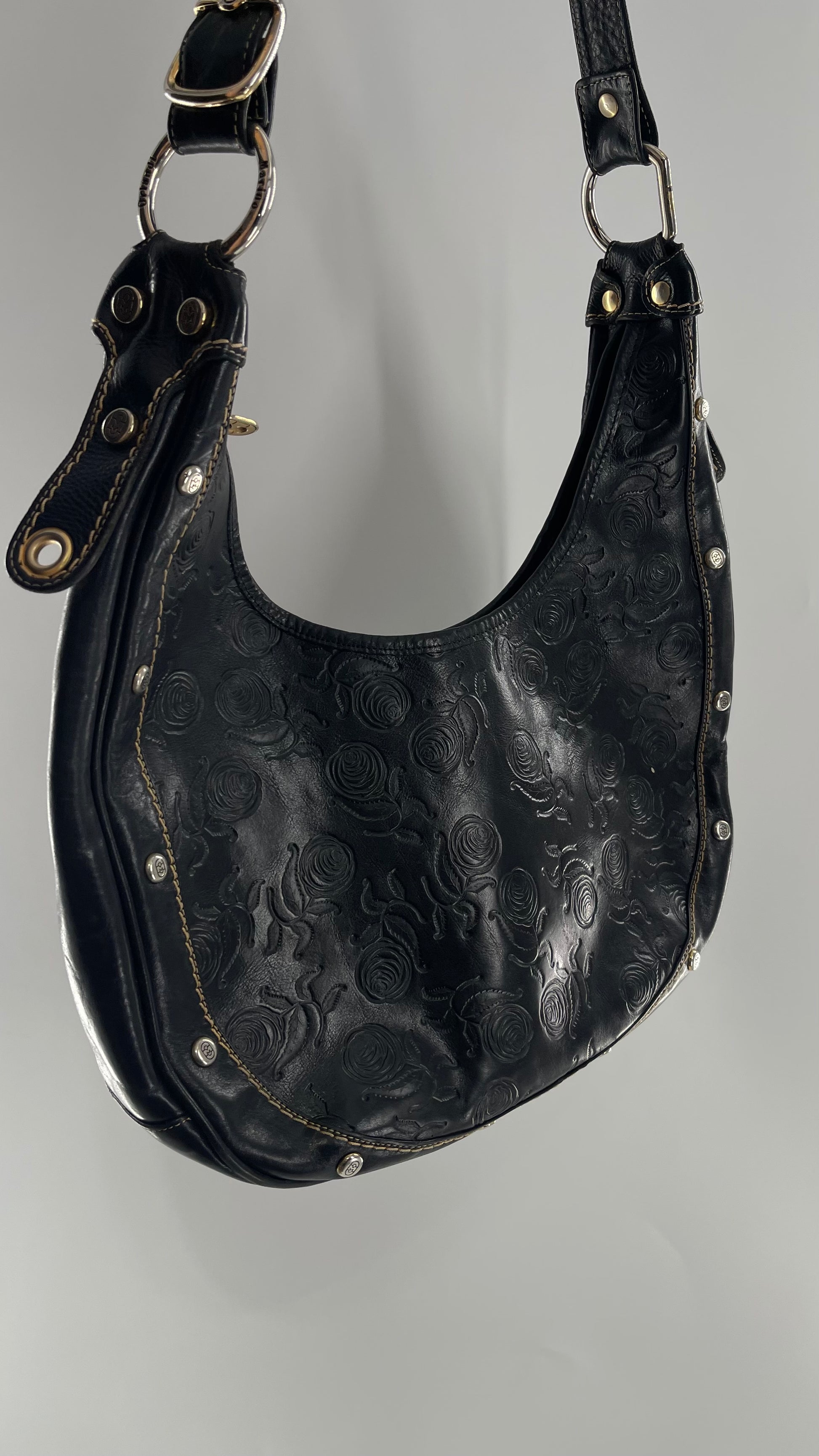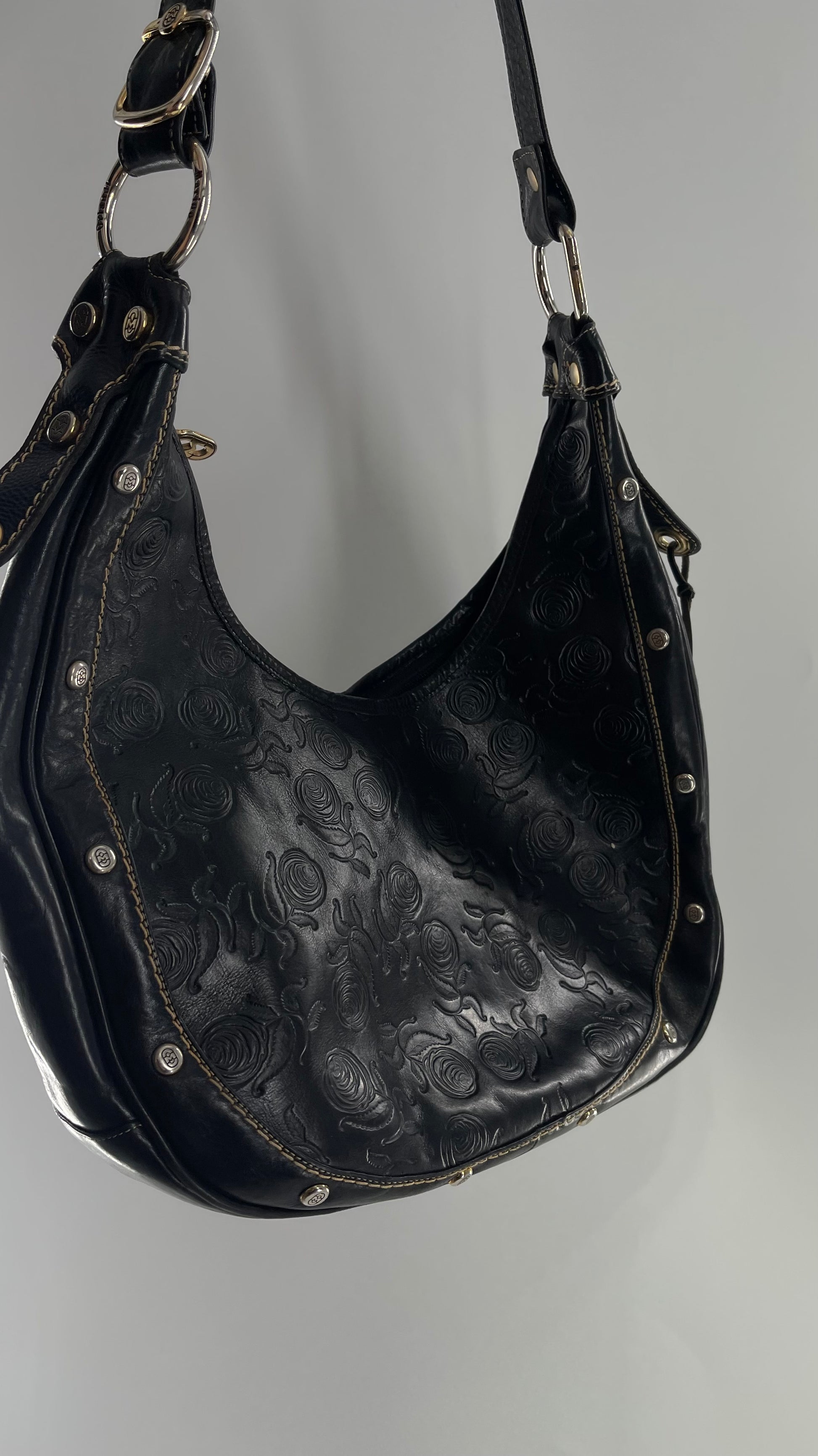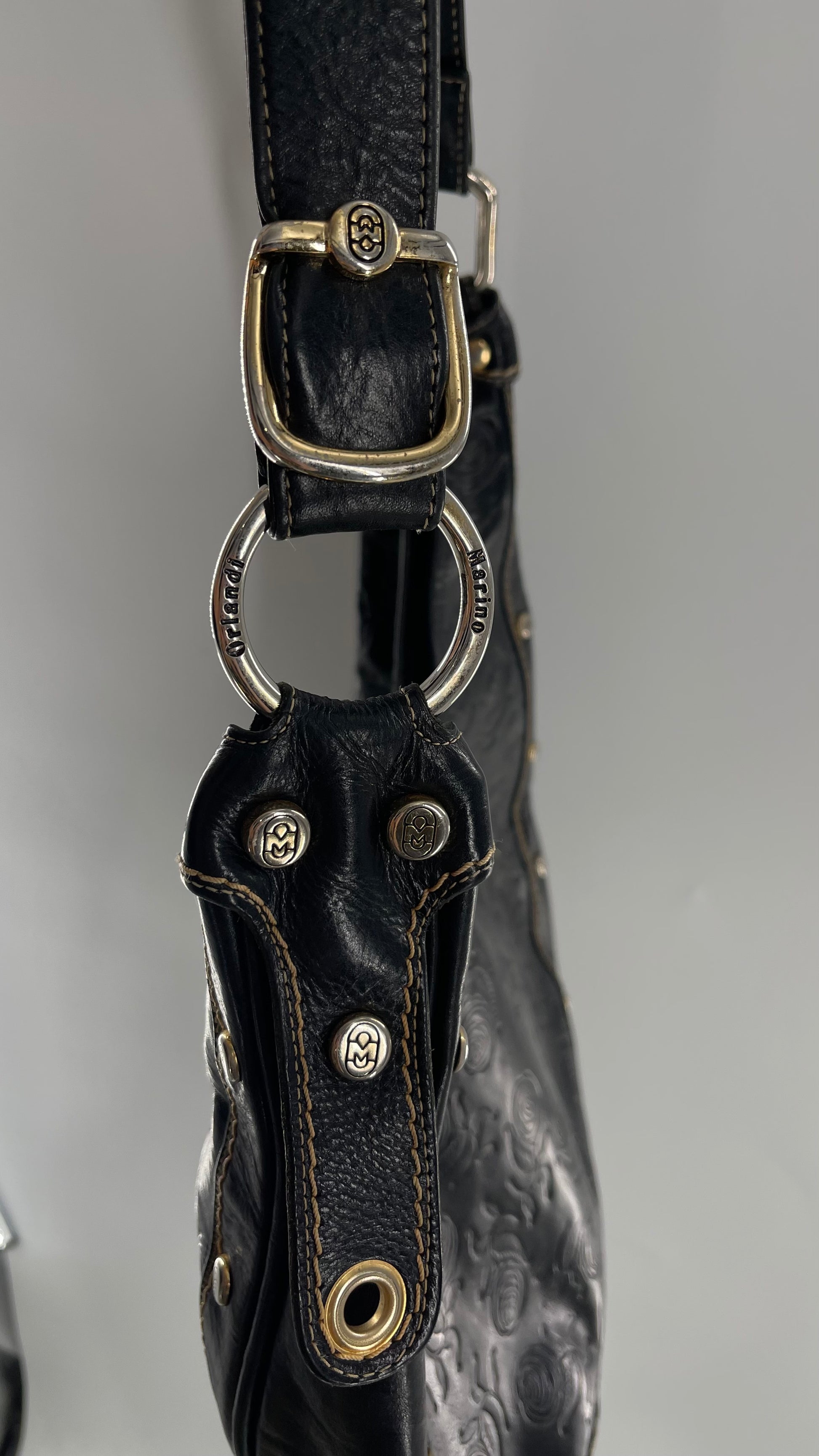 Vintage Marino Orlandi Black Leather Embossed Rose Studded Satchel Bag