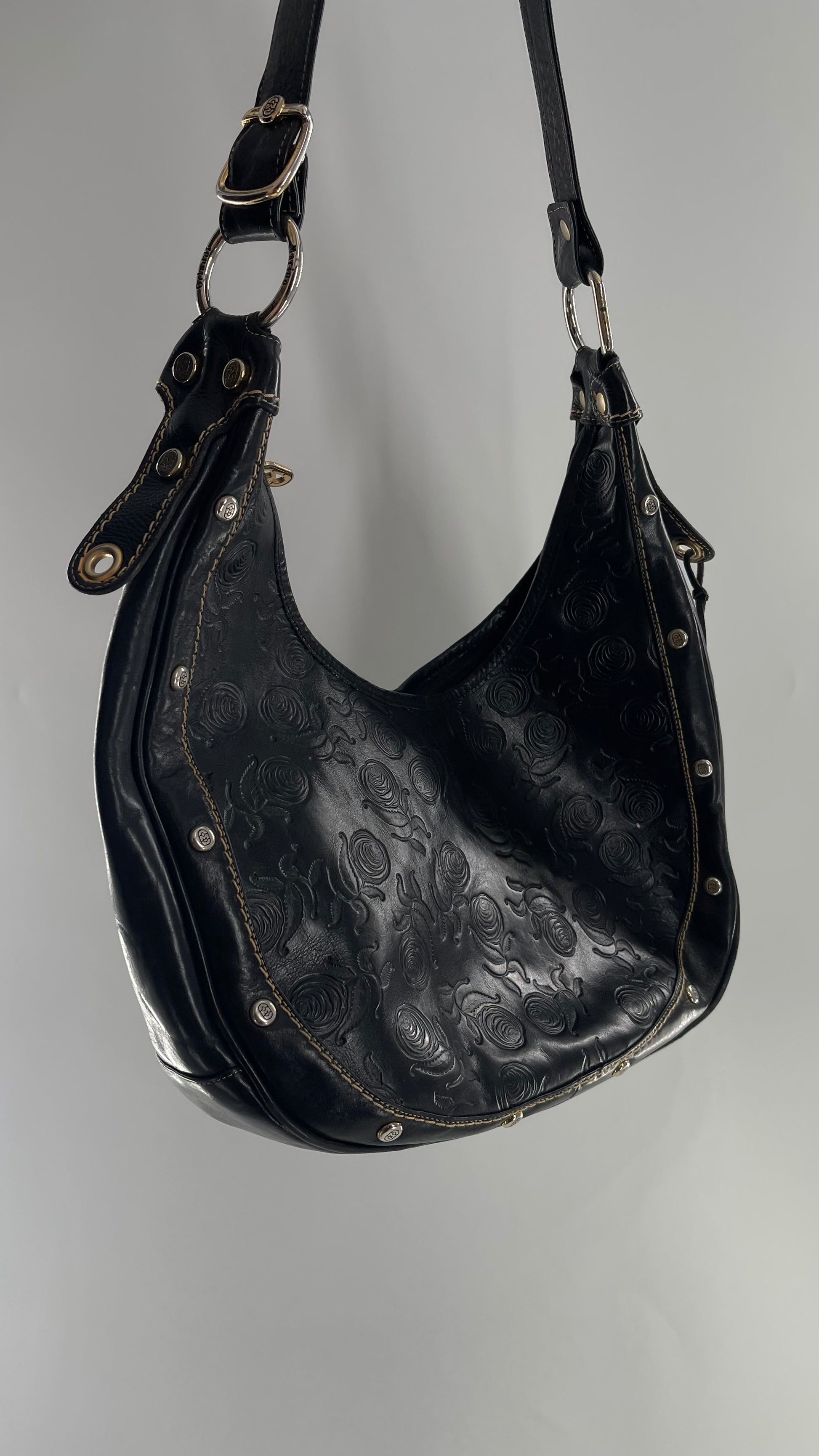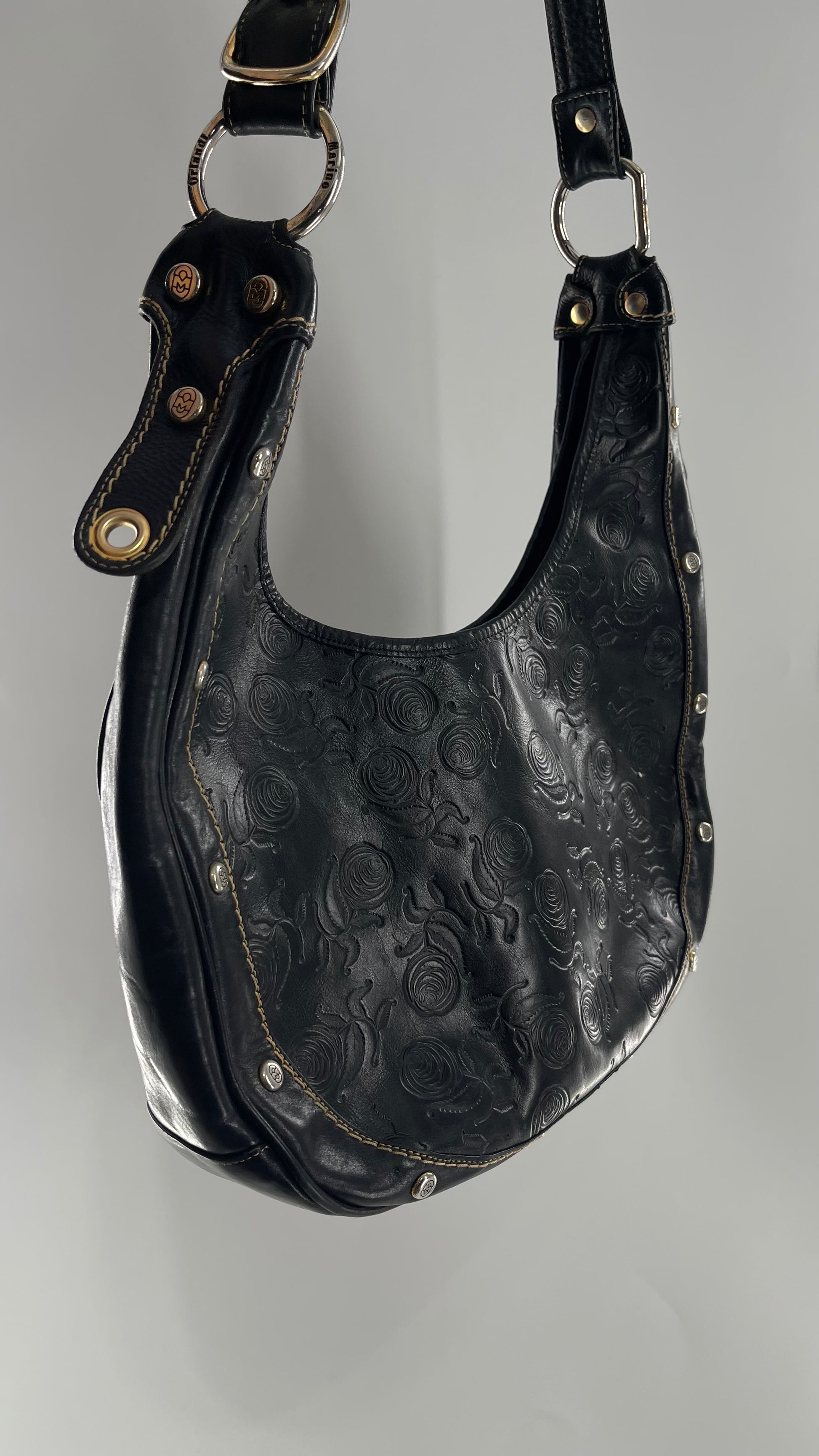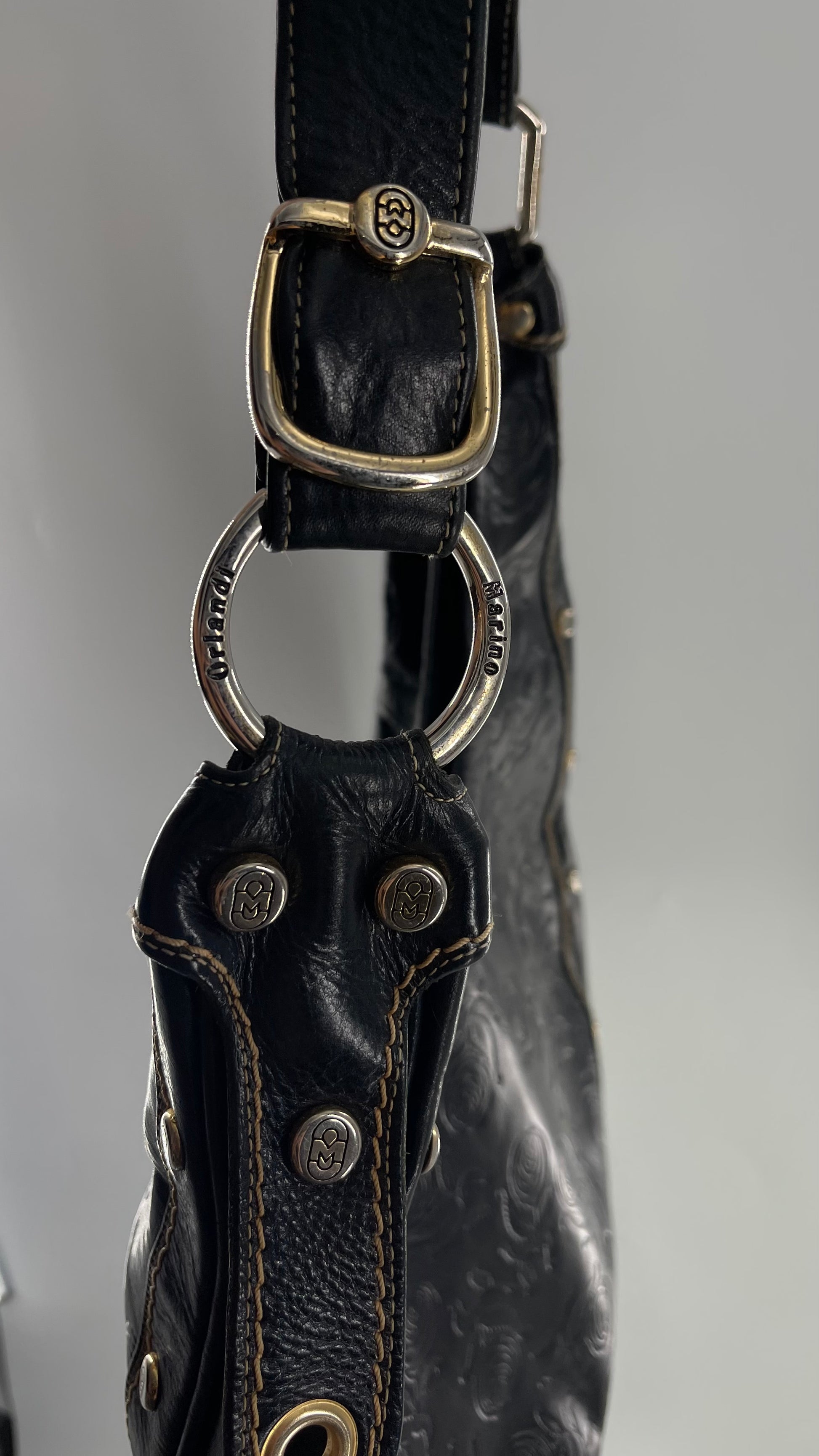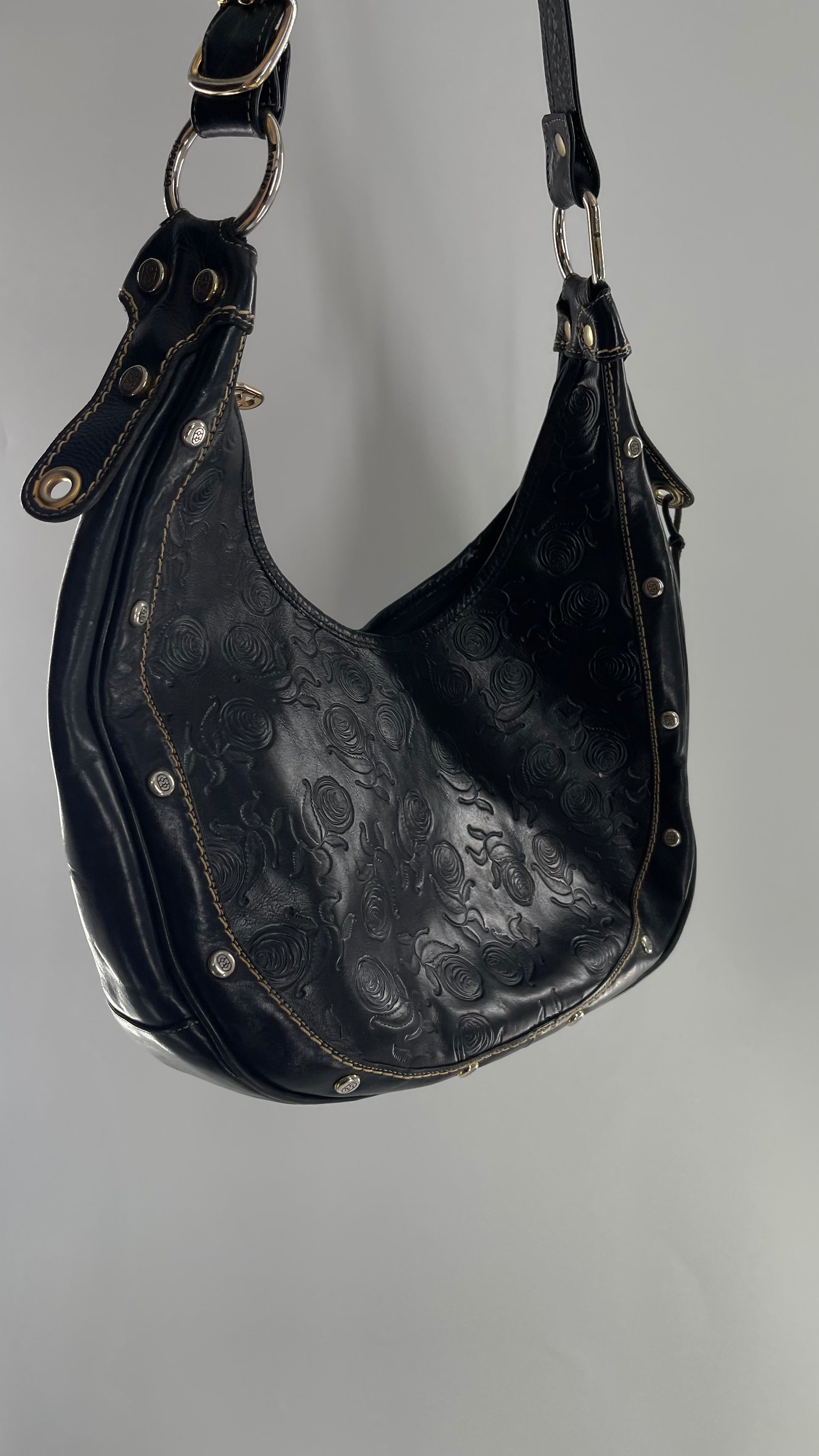 Vintage Marino Orlandi Black Leather Embossed Rose Studded Satchel Bag
