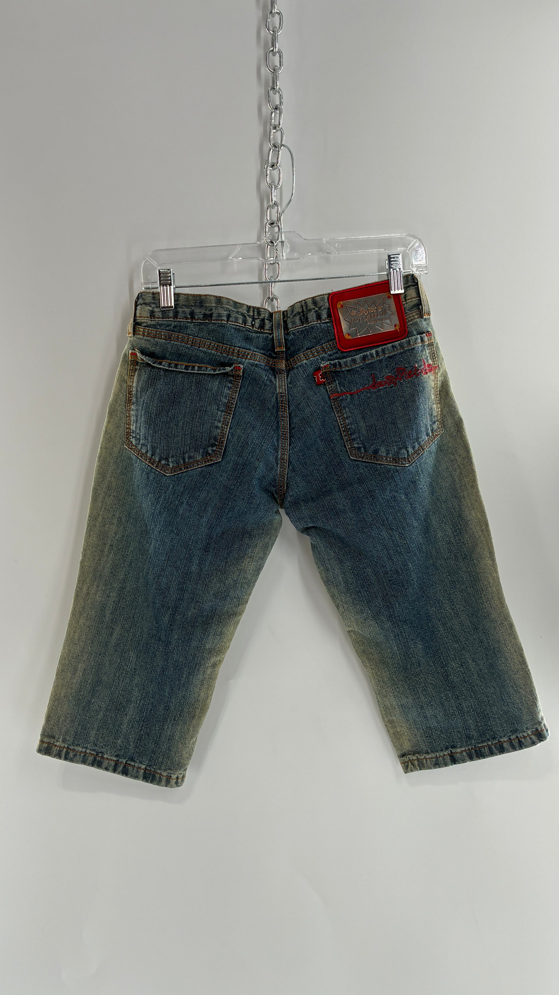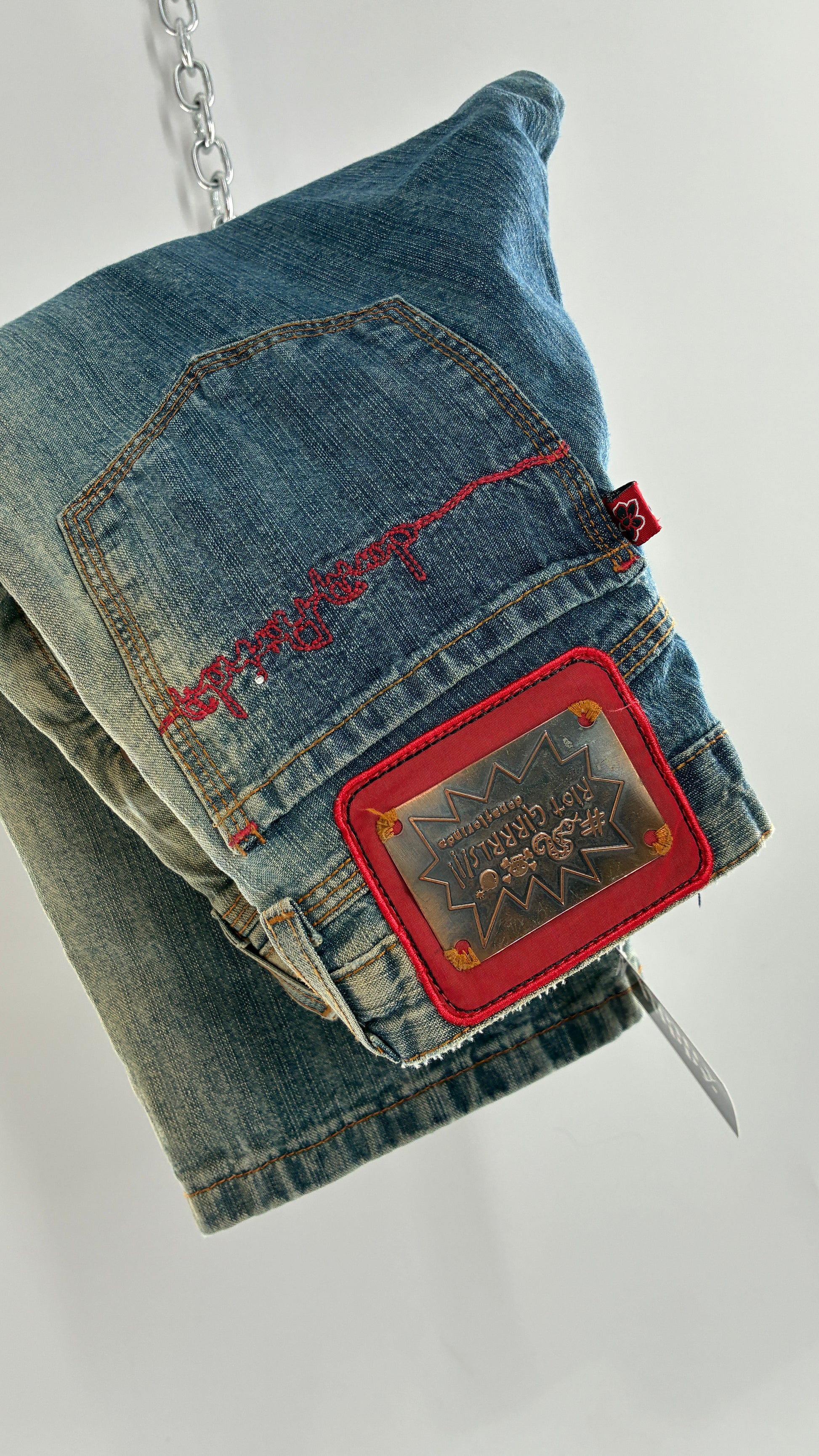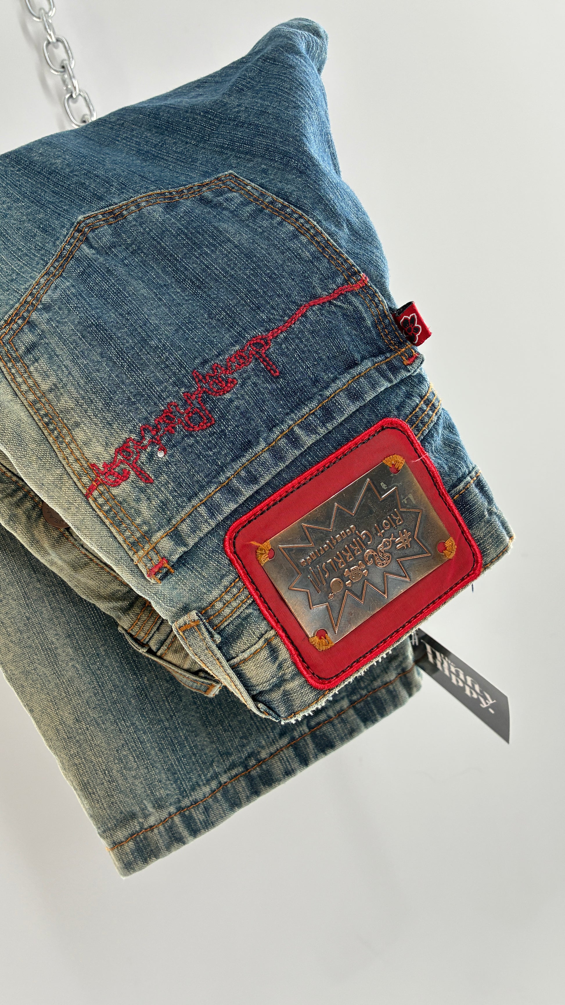 Rare Vintage DONA FLORINDA RIOT GIRLS Faded Wash Denim with Heavy Metal Jacron and Embroidery (38)
