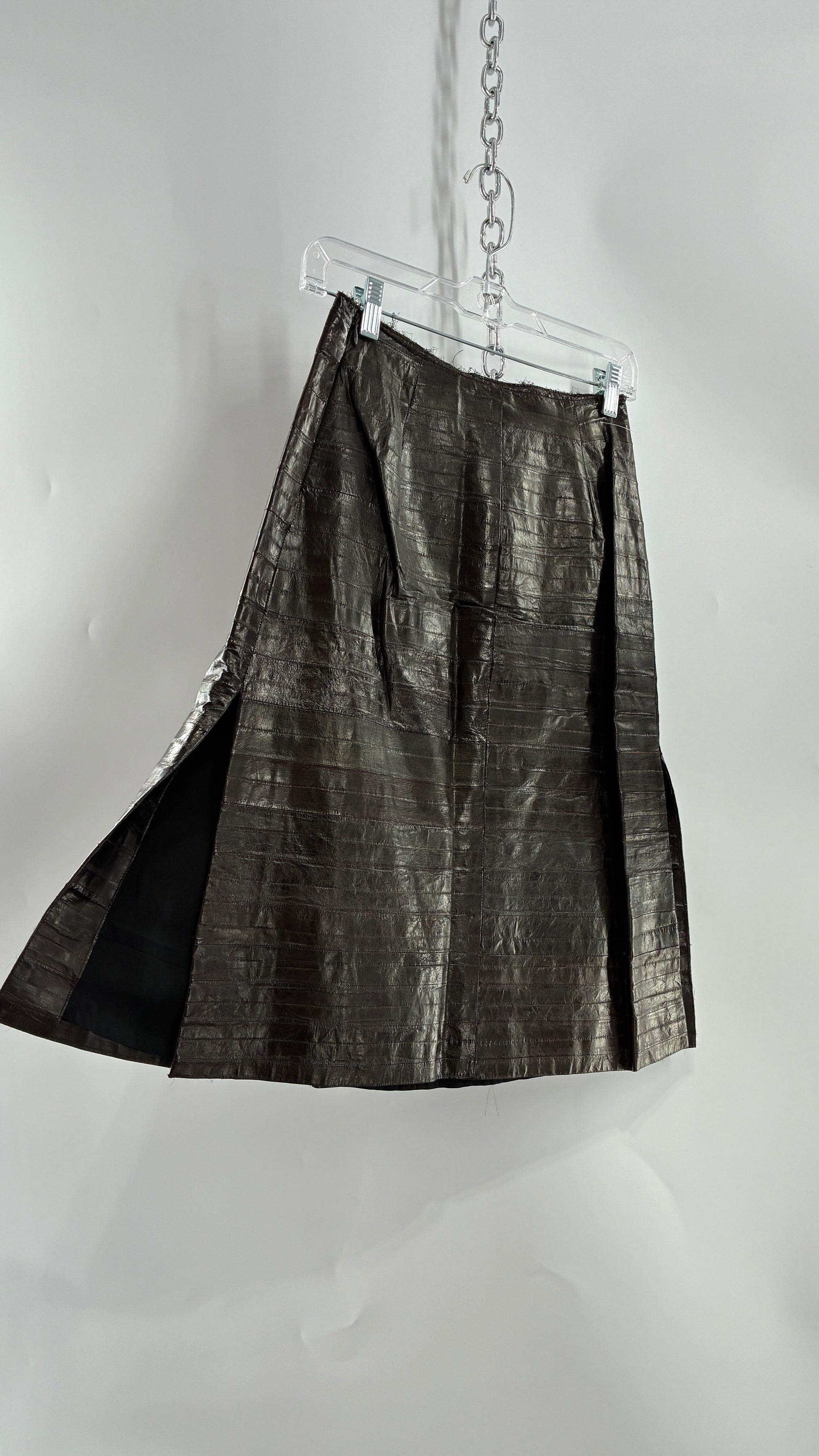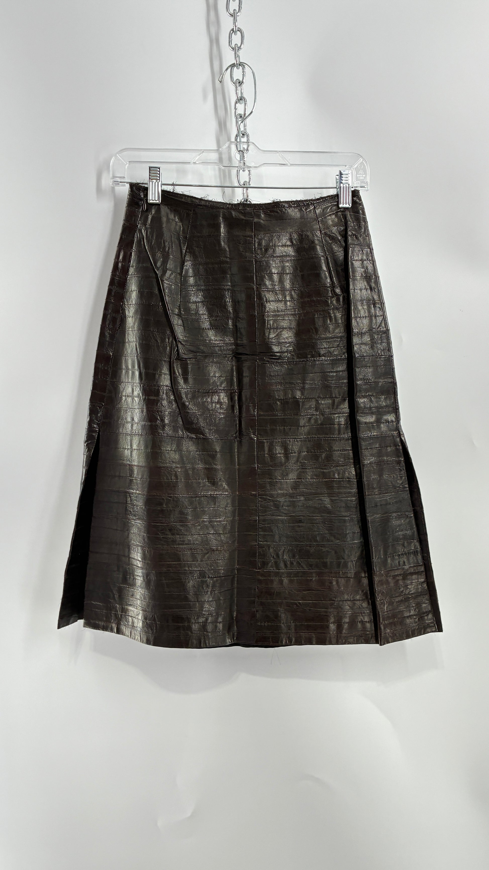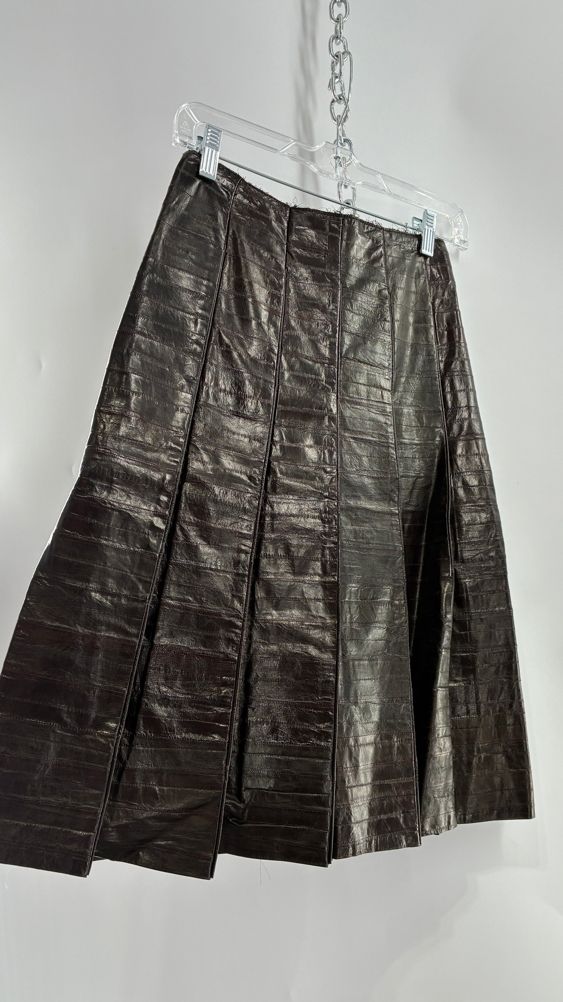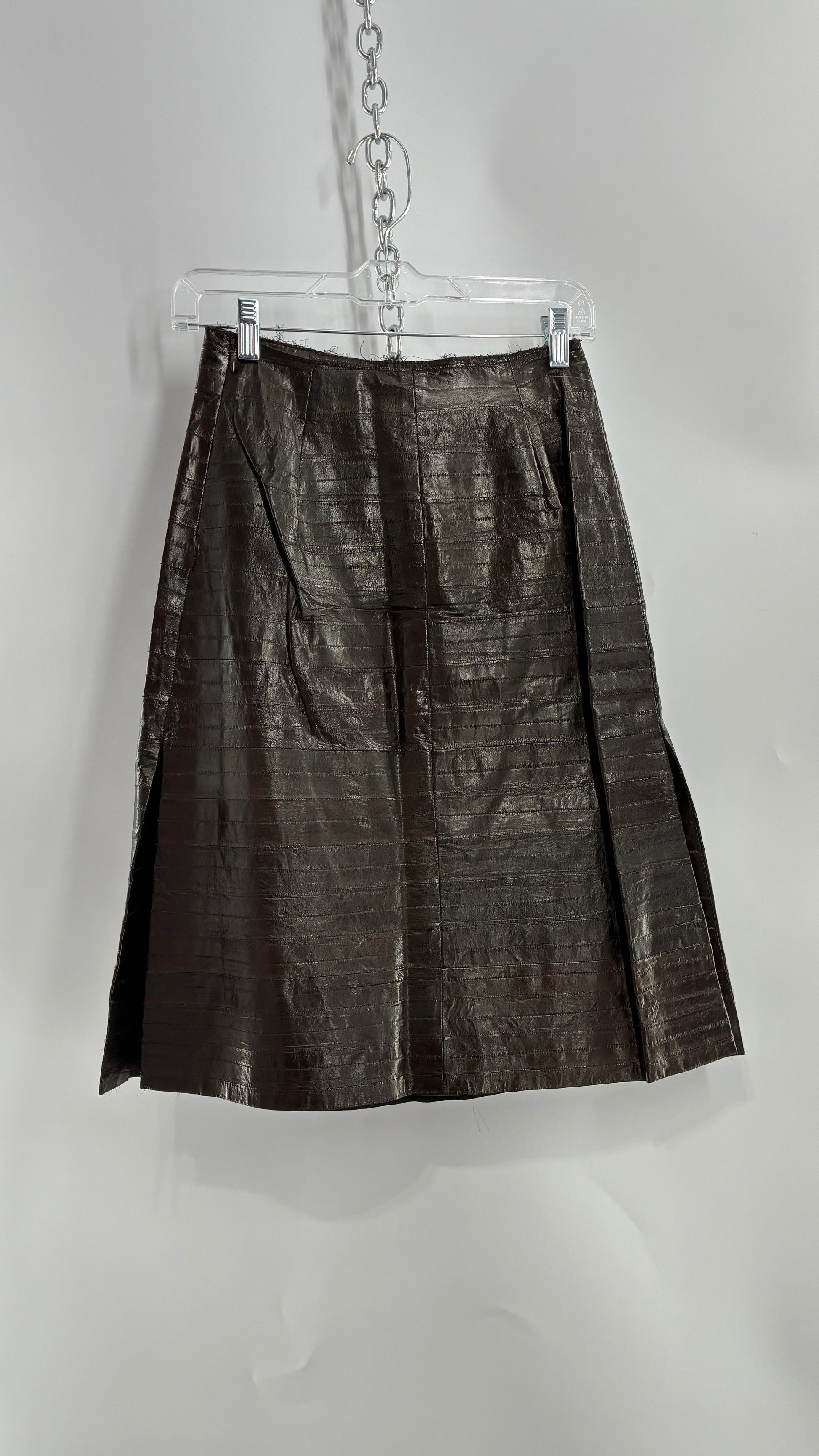 Vintage Handmade Pleated Dark Brown Genuine Leather Patchwork Skirt (XS)