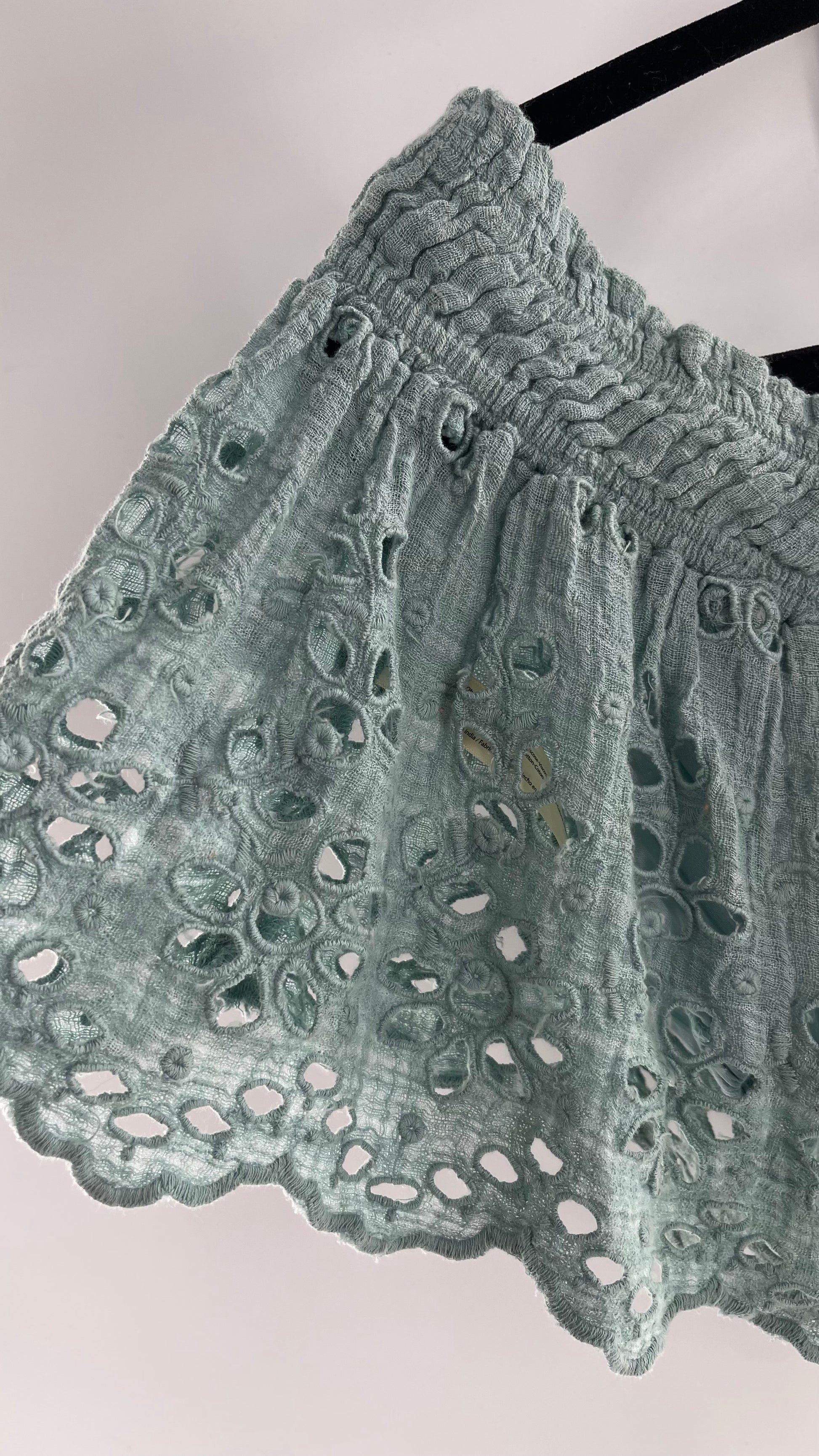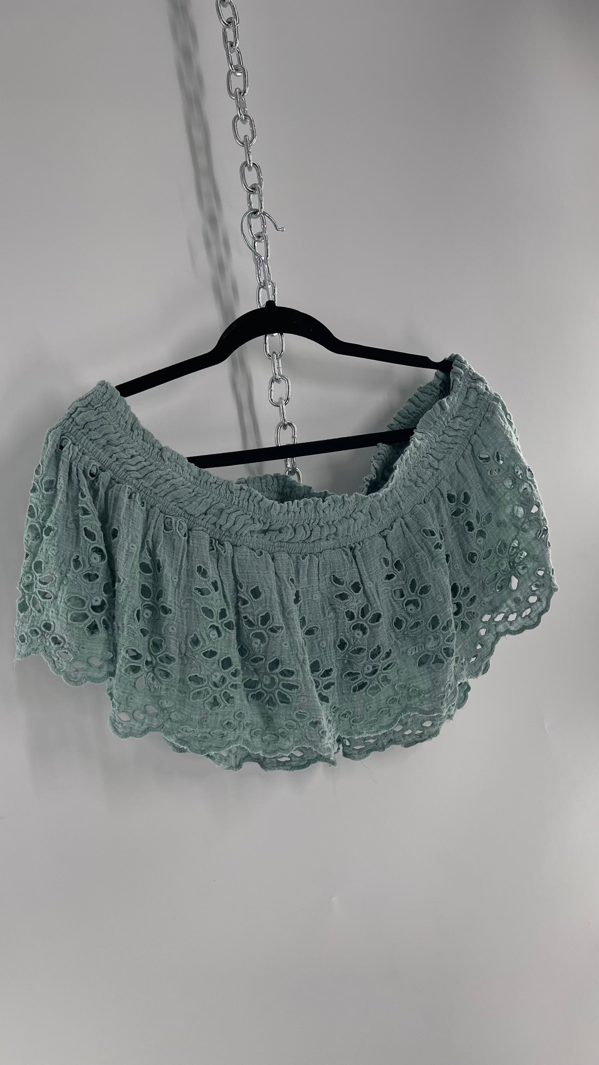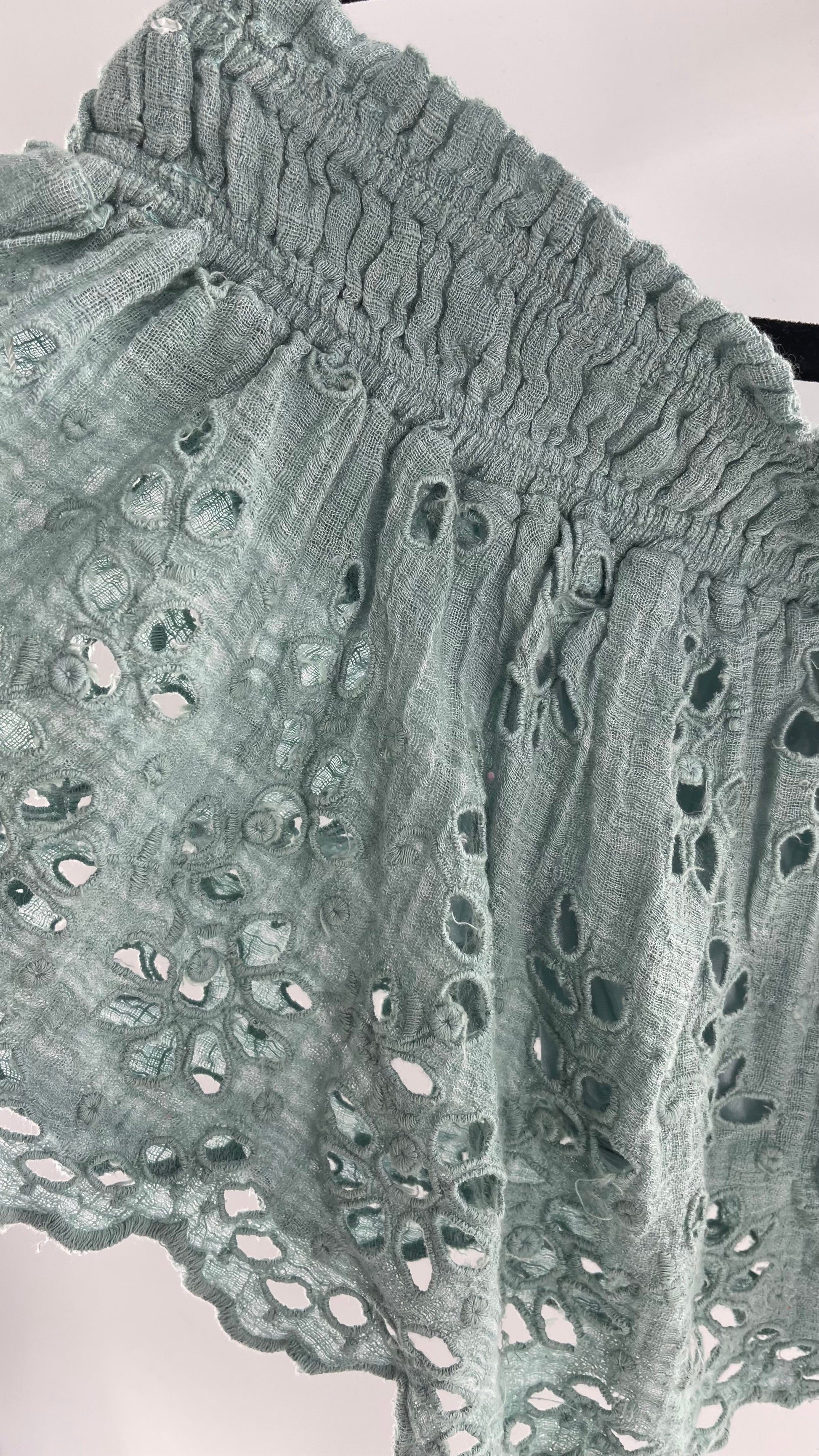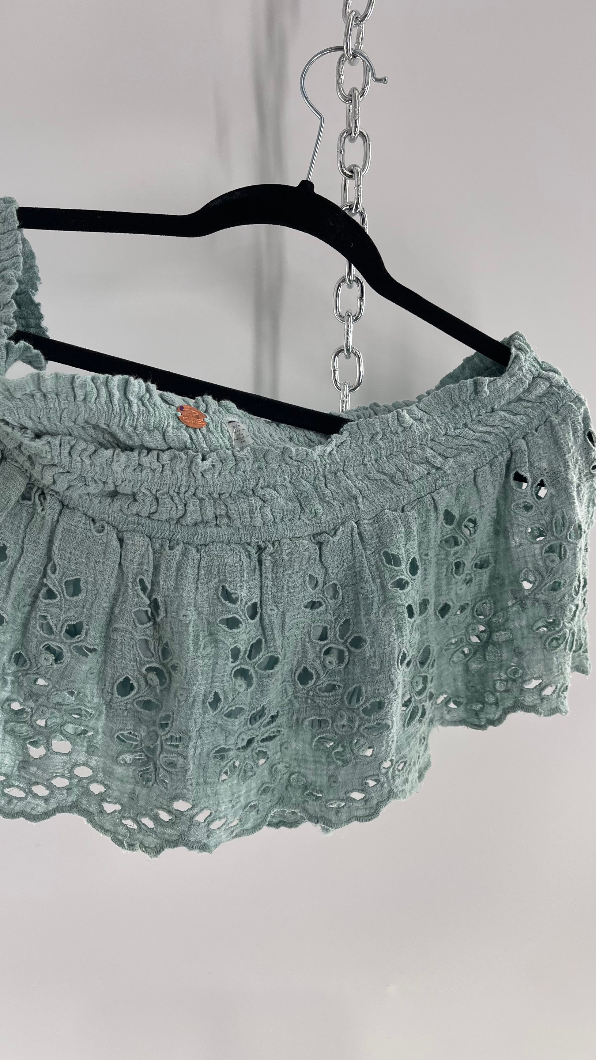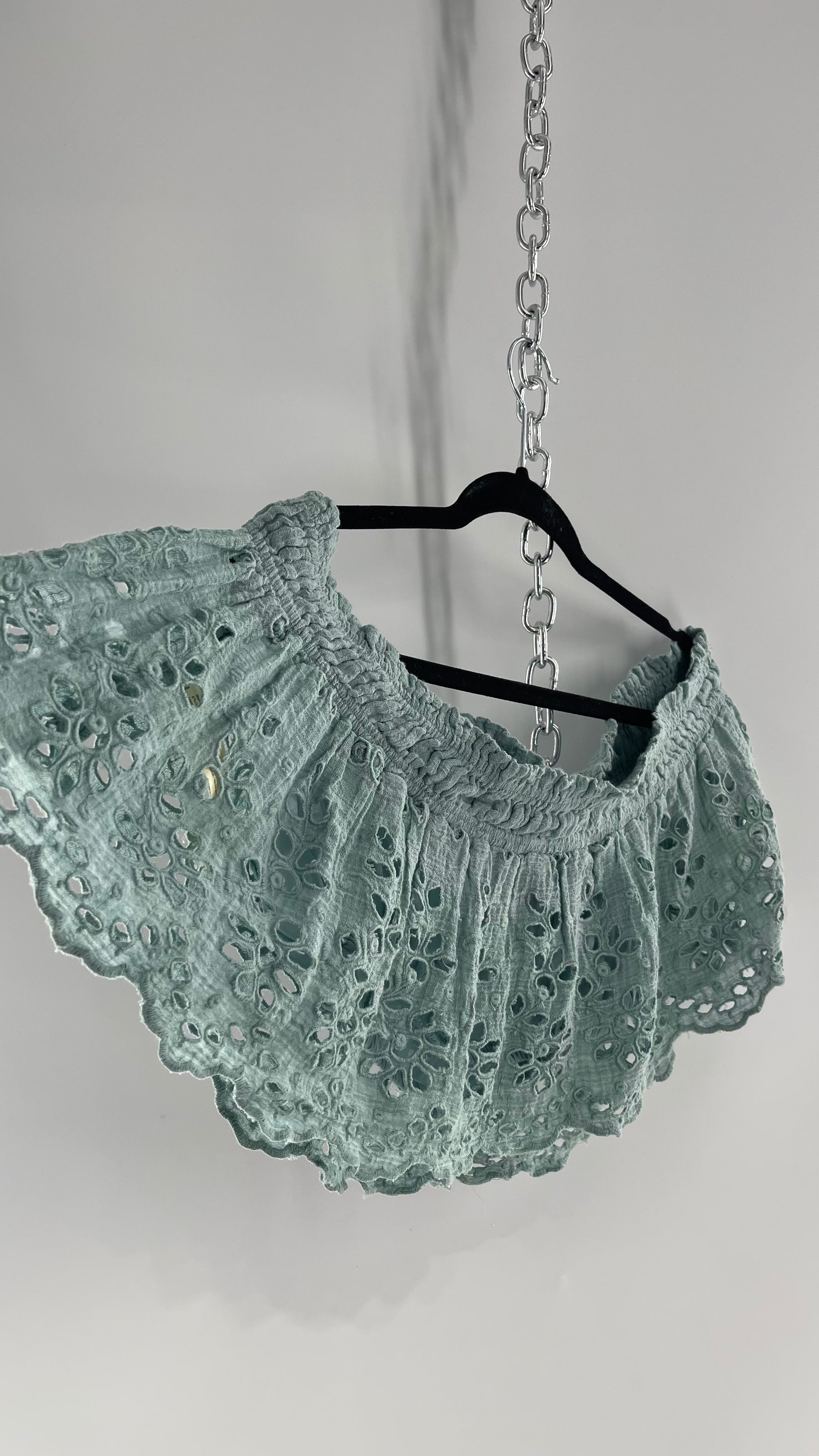 Free People Eyelet Cotton Teal Blue Off the Shoulder Ruffle Bandeau (Medium)