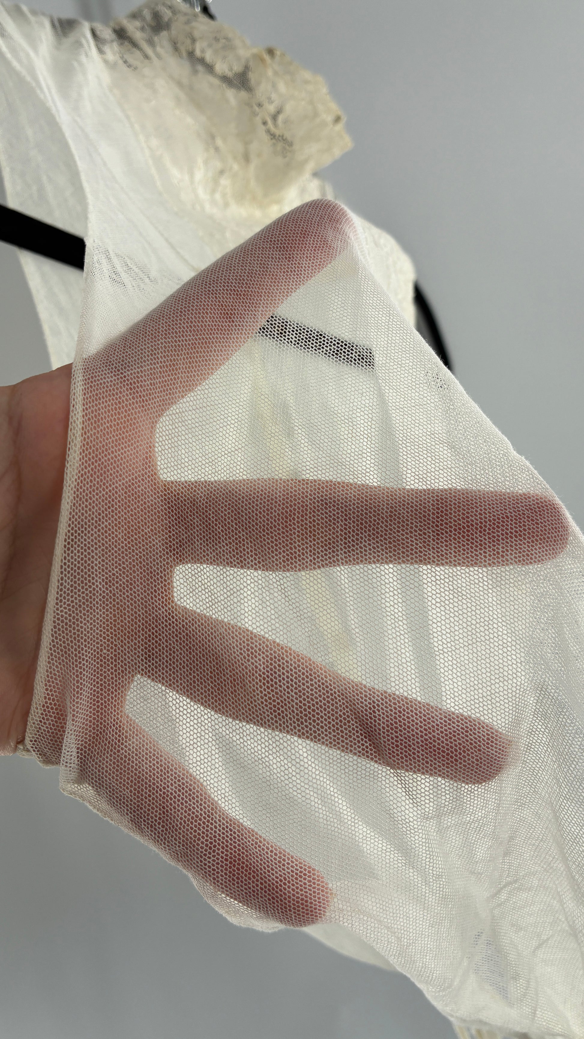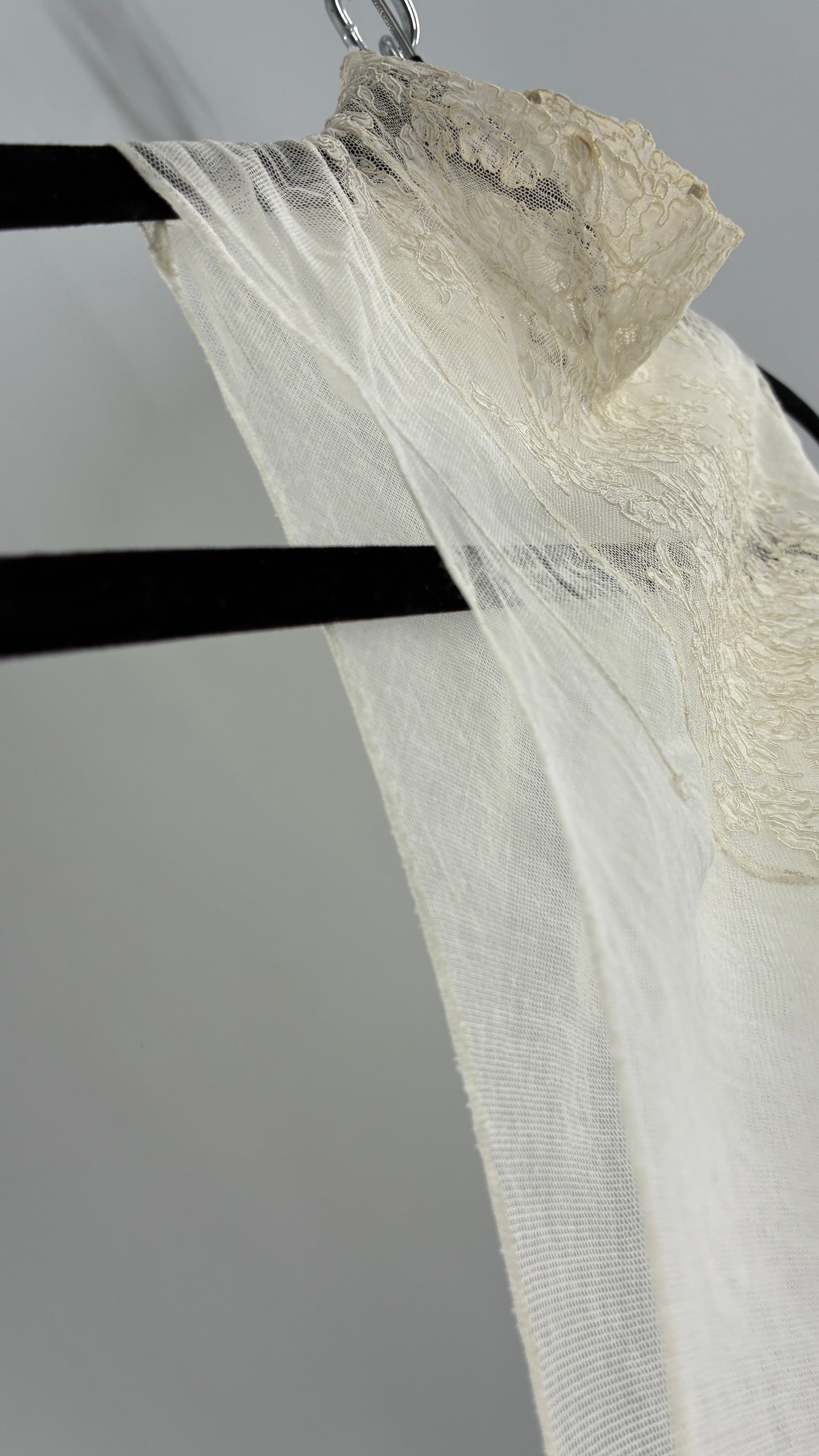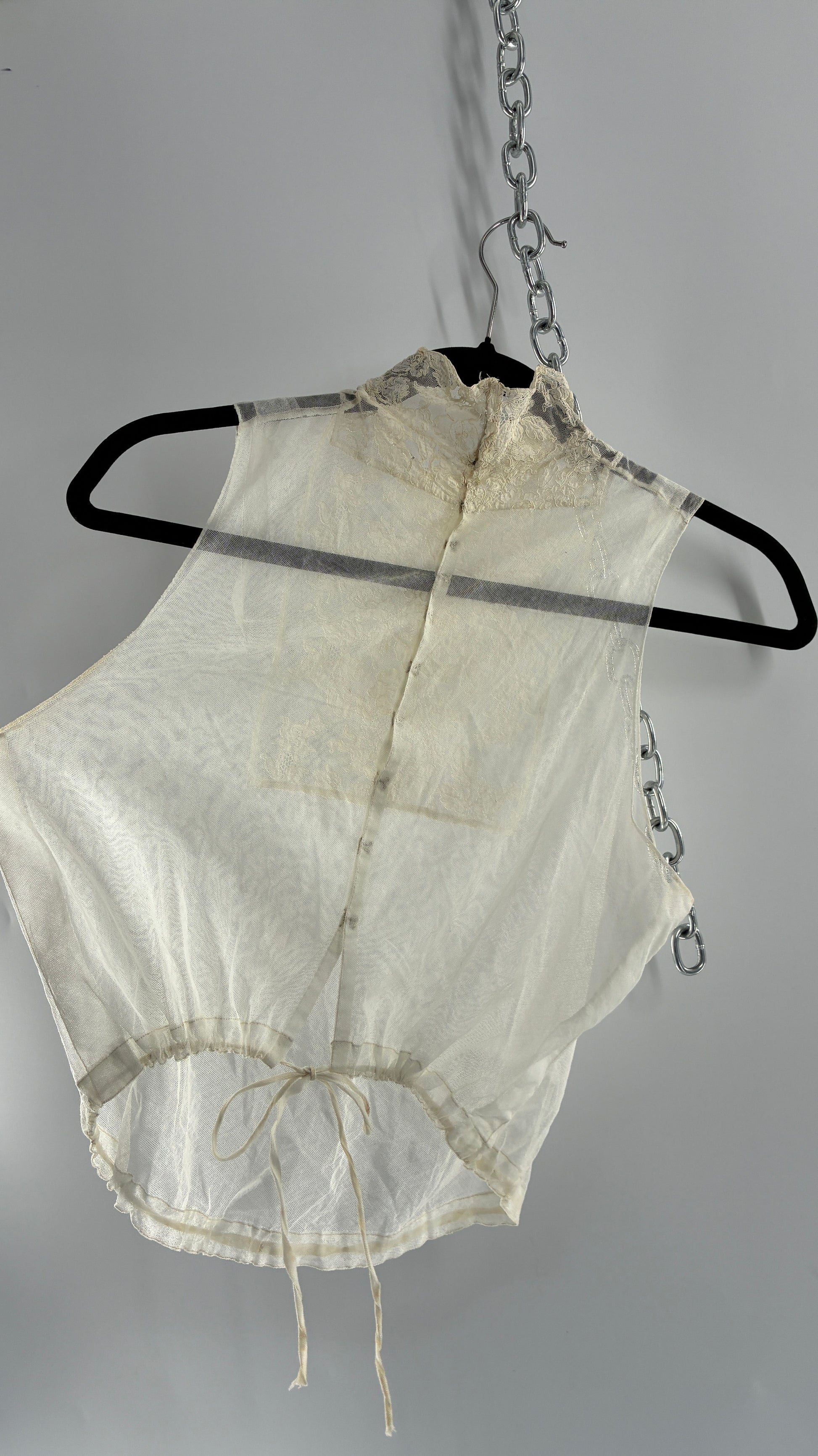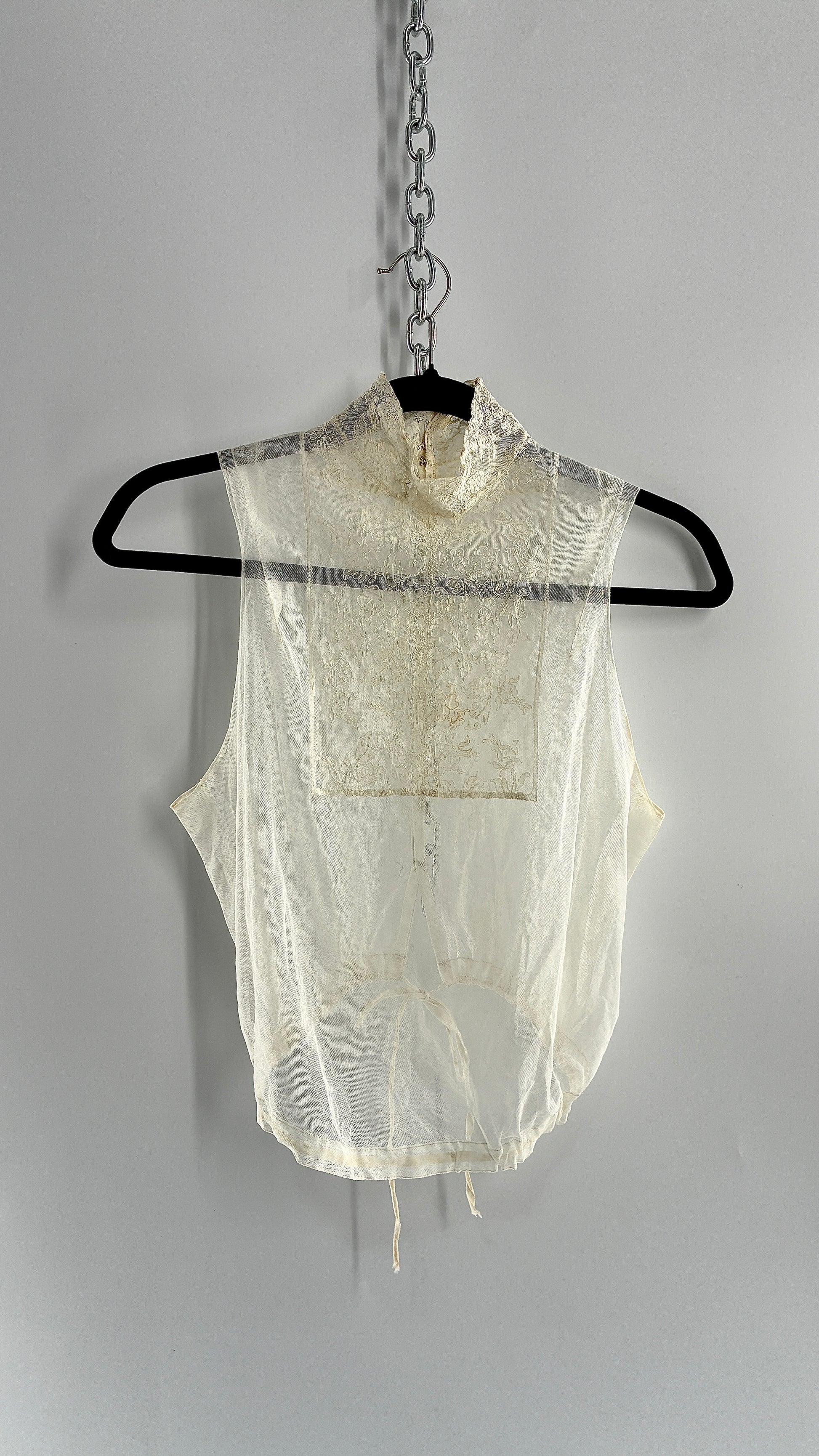 Vintage Antique Sheer Delicate Mesh, Mock Neck, Lace Paneled Camisole with Drawstring Waistline (XS/S)