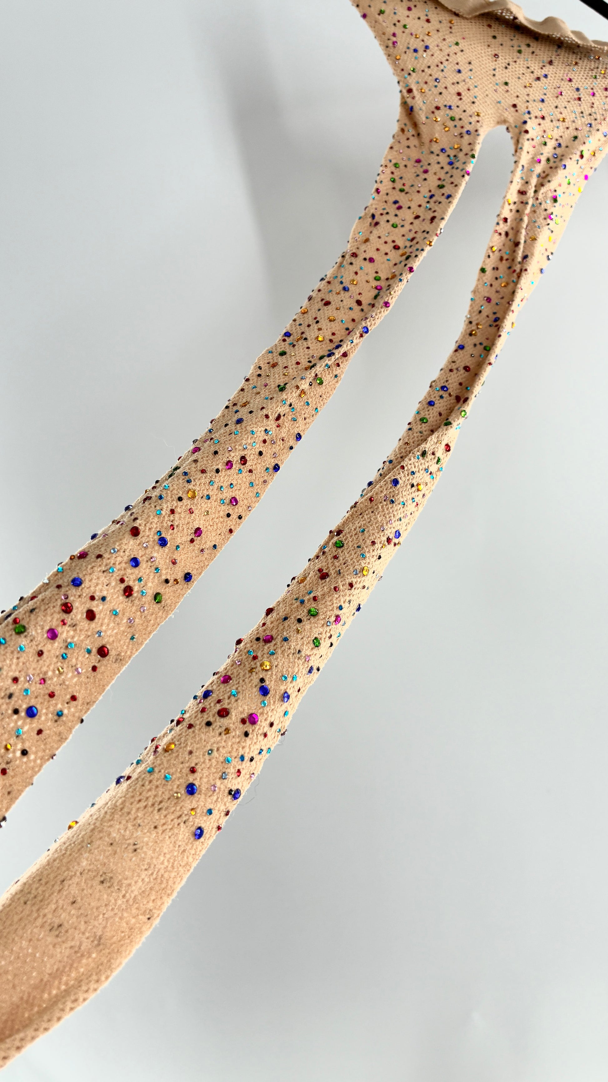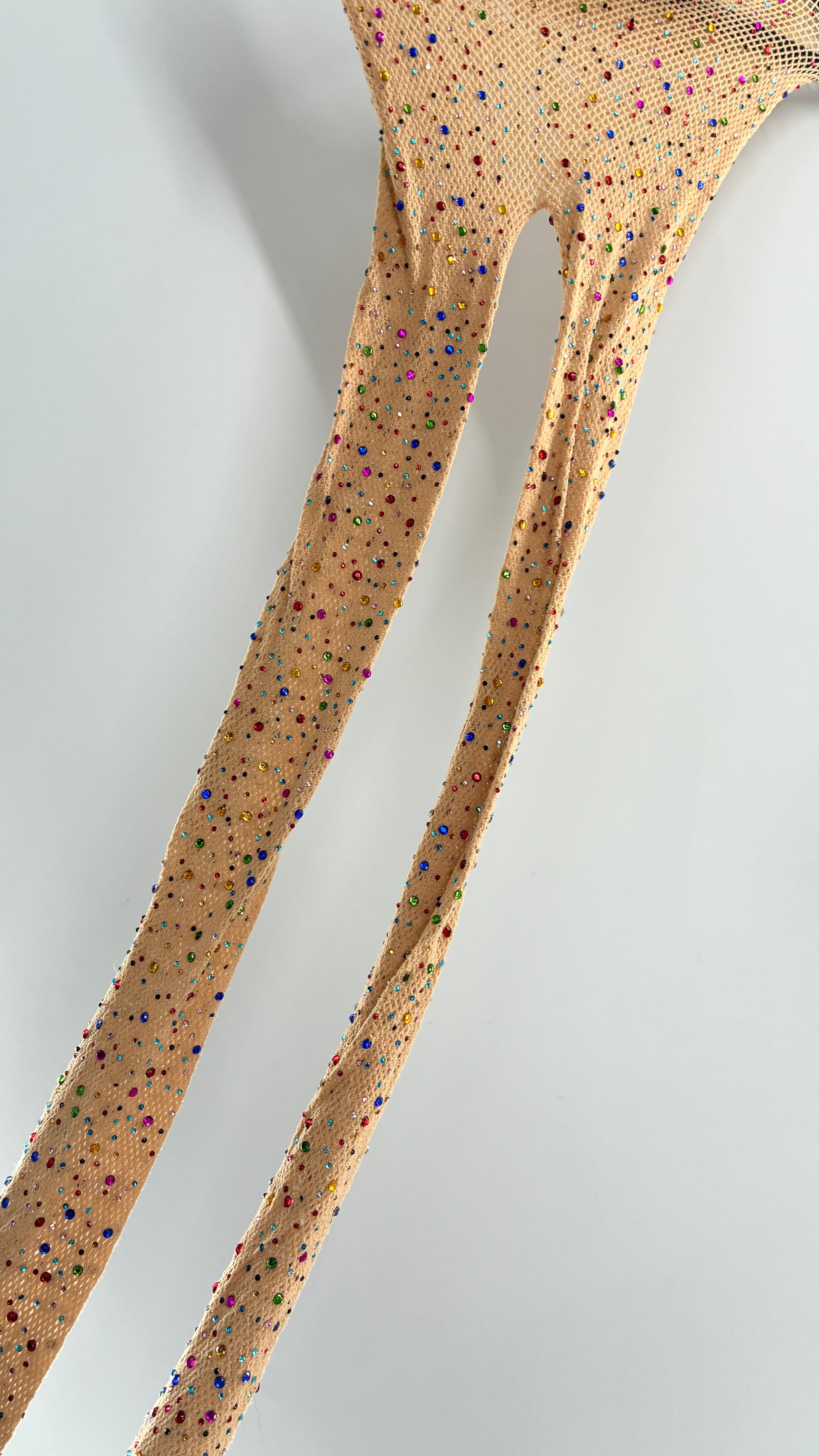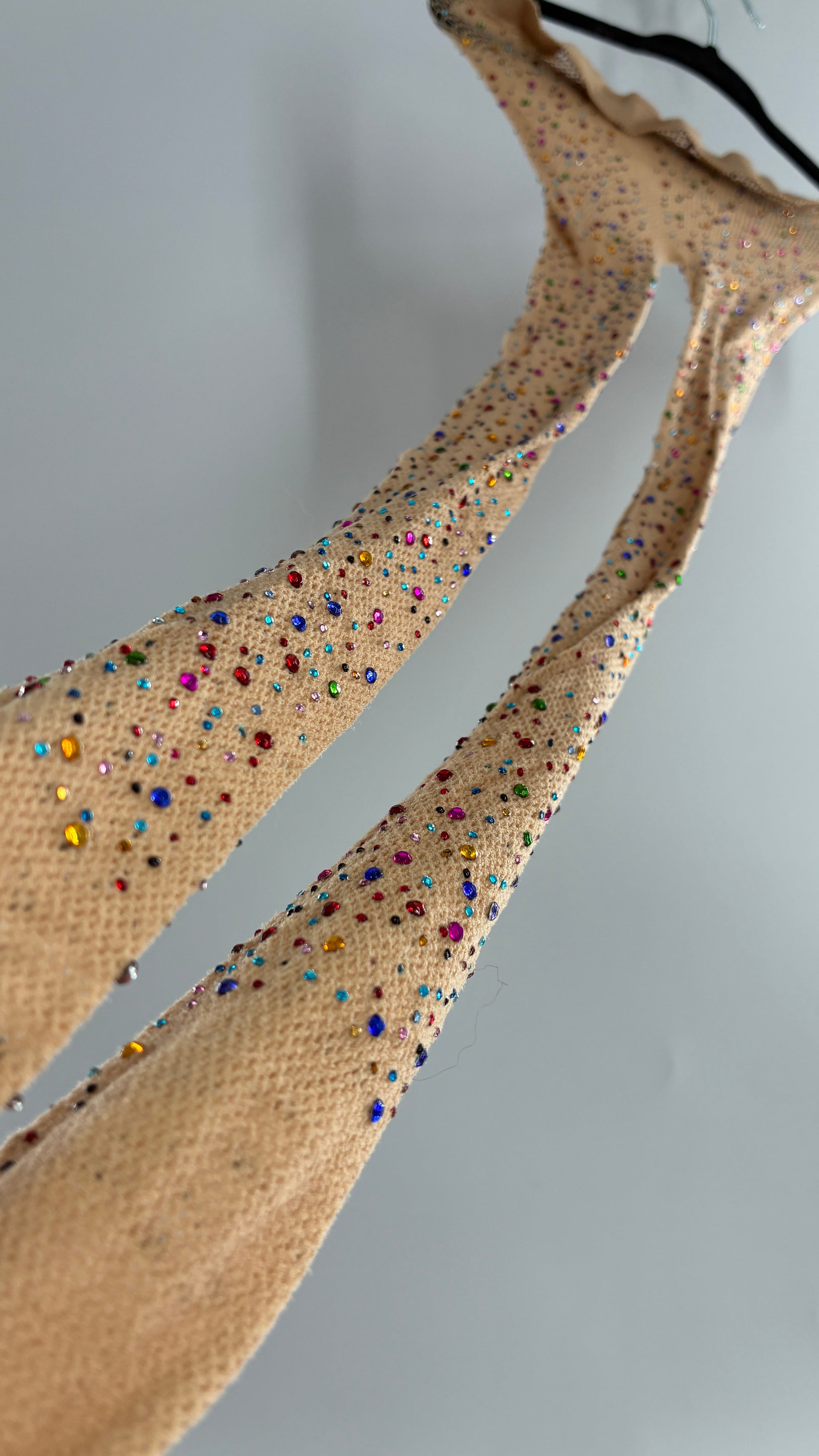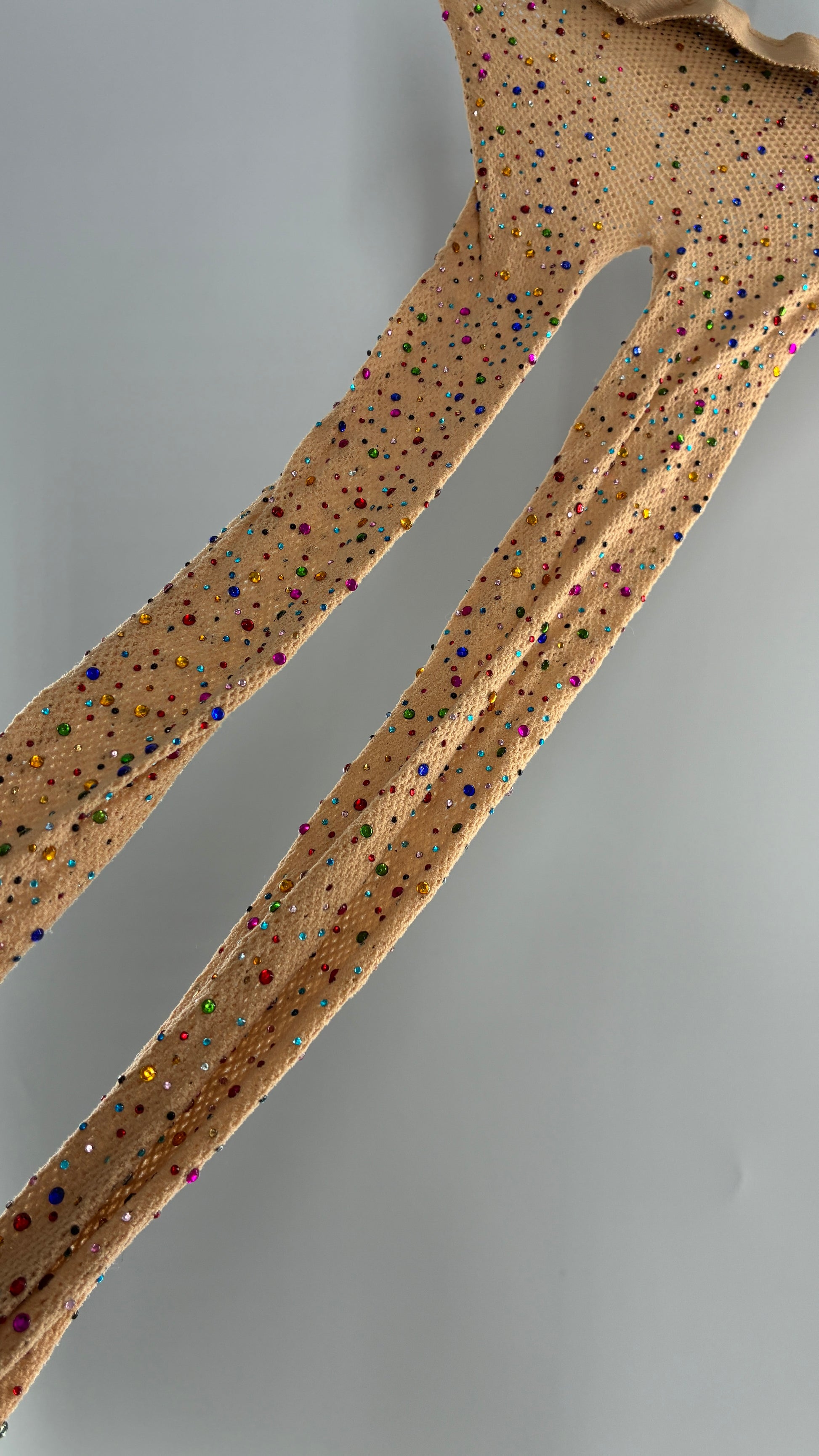 Beige Mesh Tights with All-Over Multicolored Rhinestones