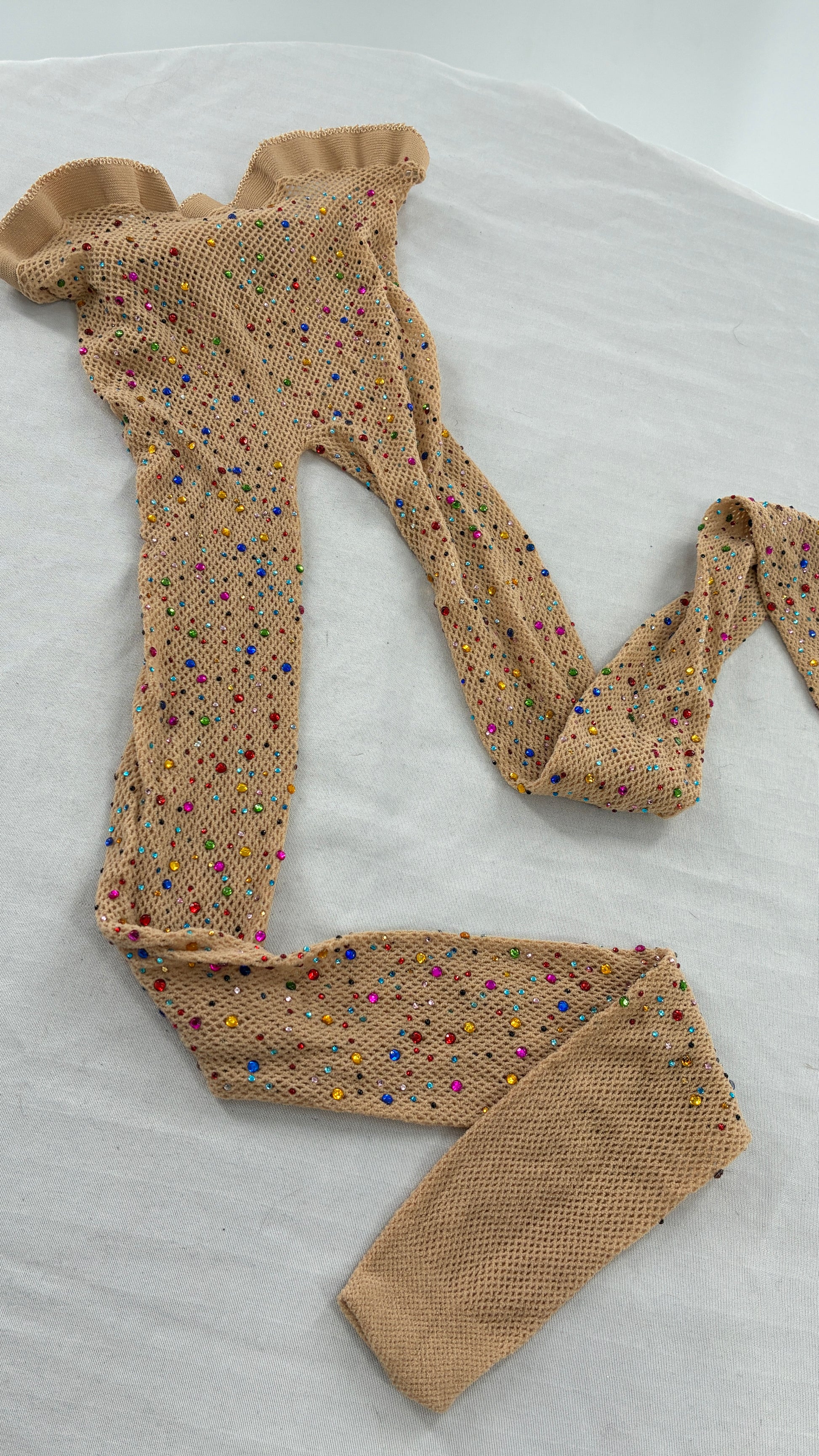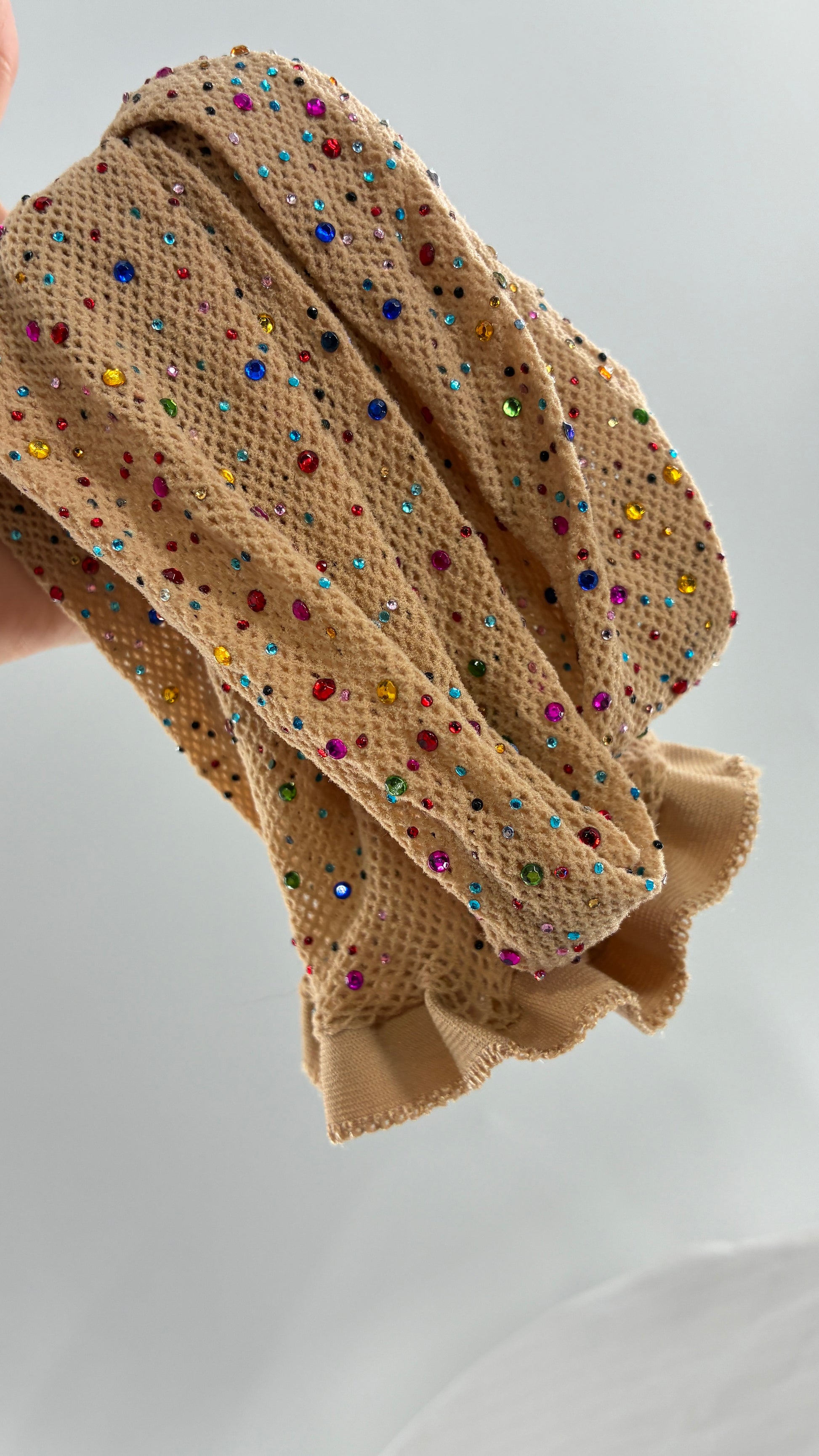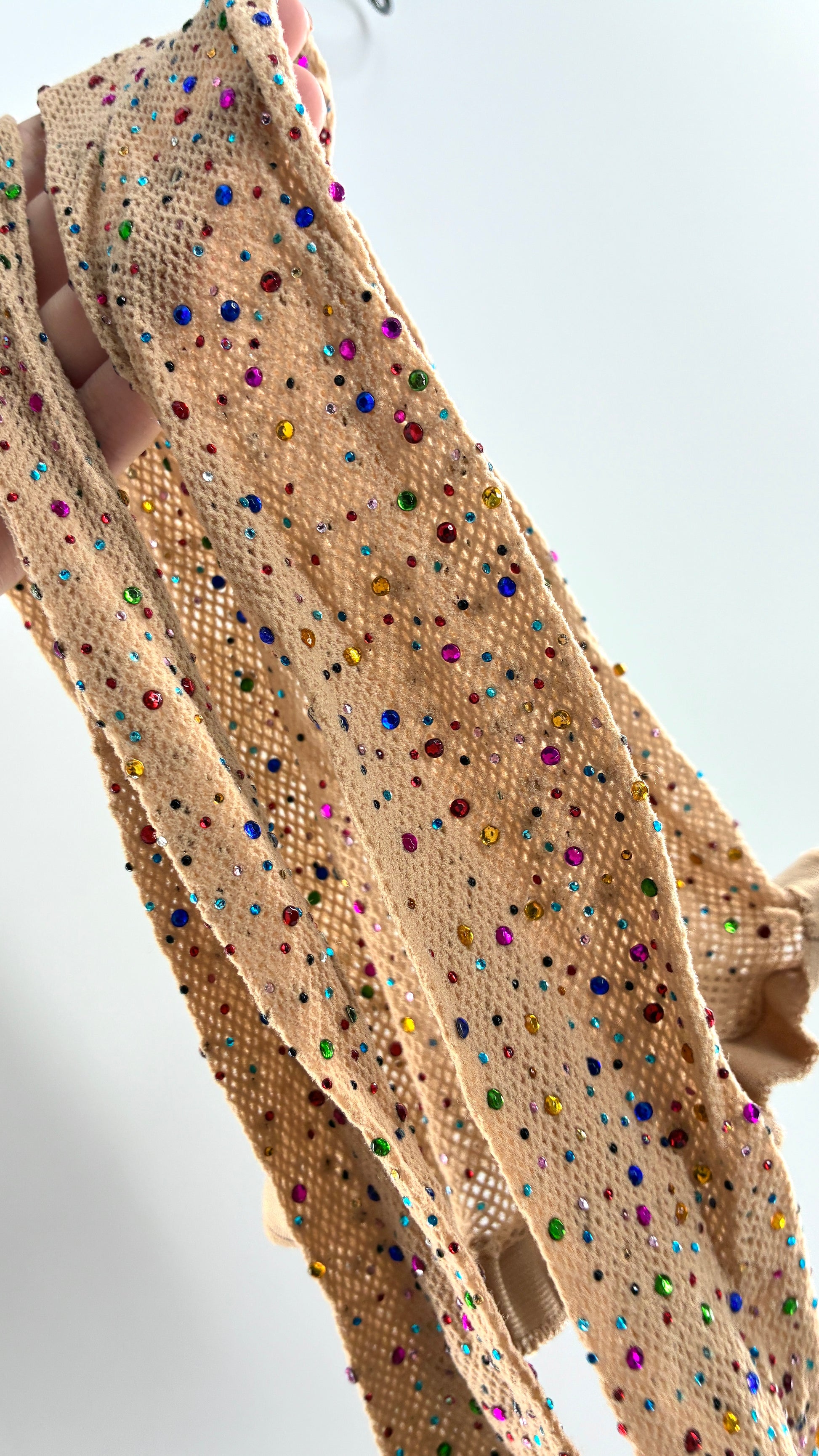 Beige Mesh Tights with All-Over Multicolored Rhinestones