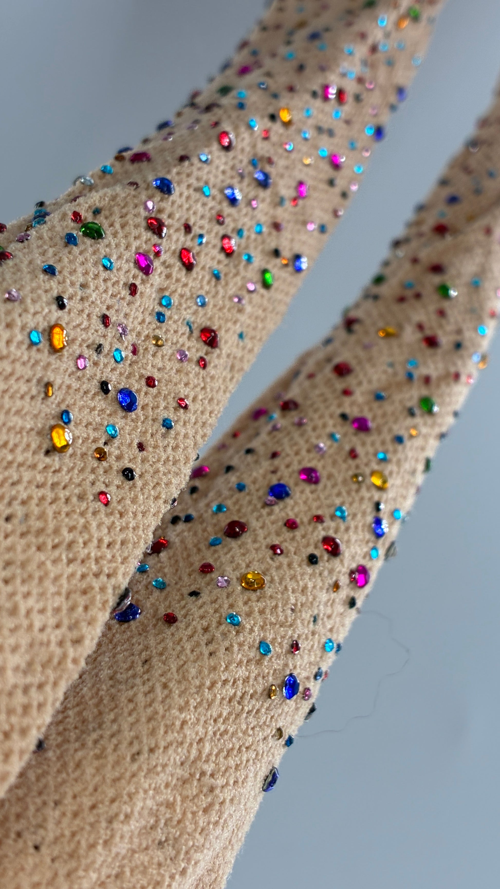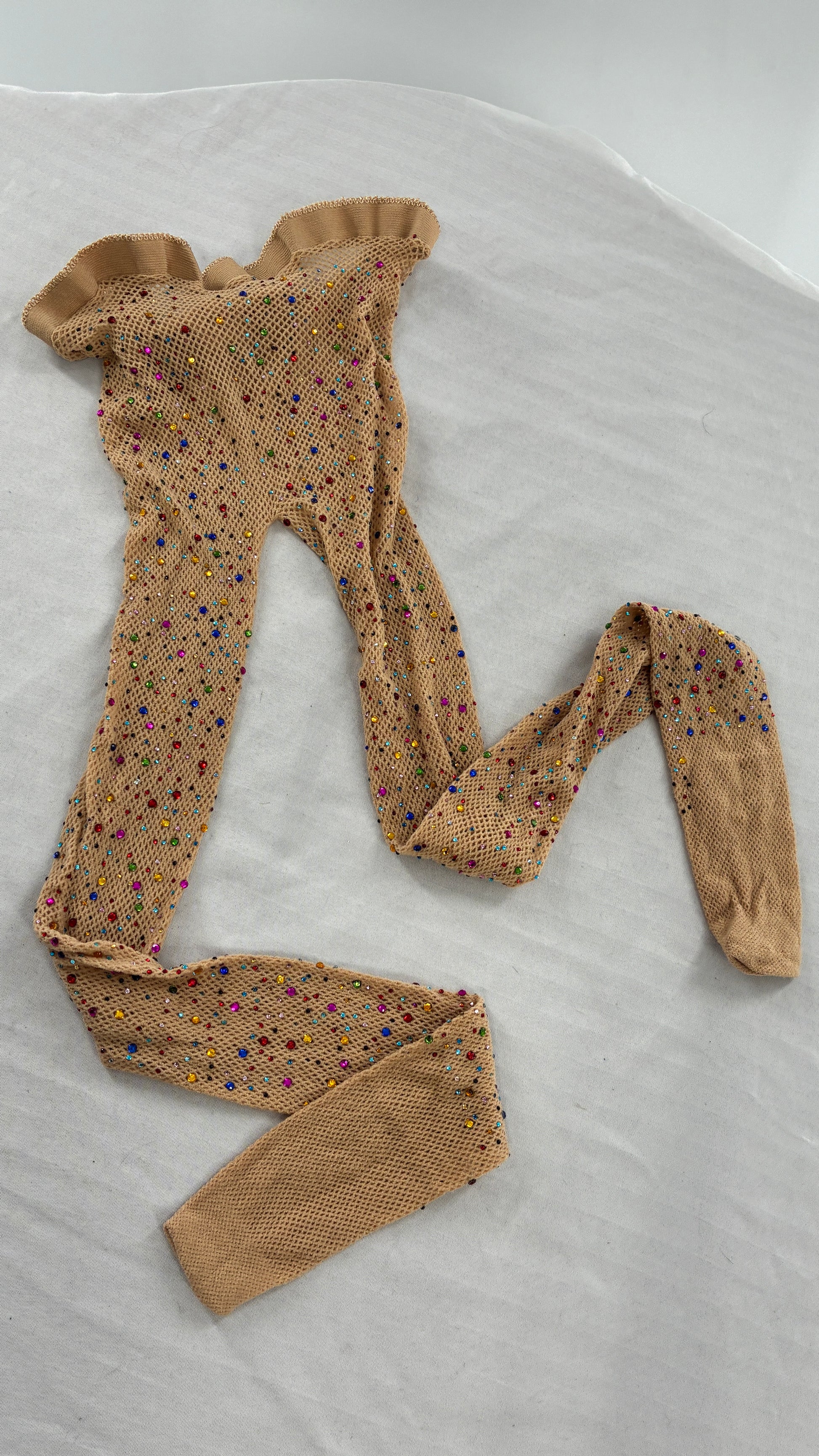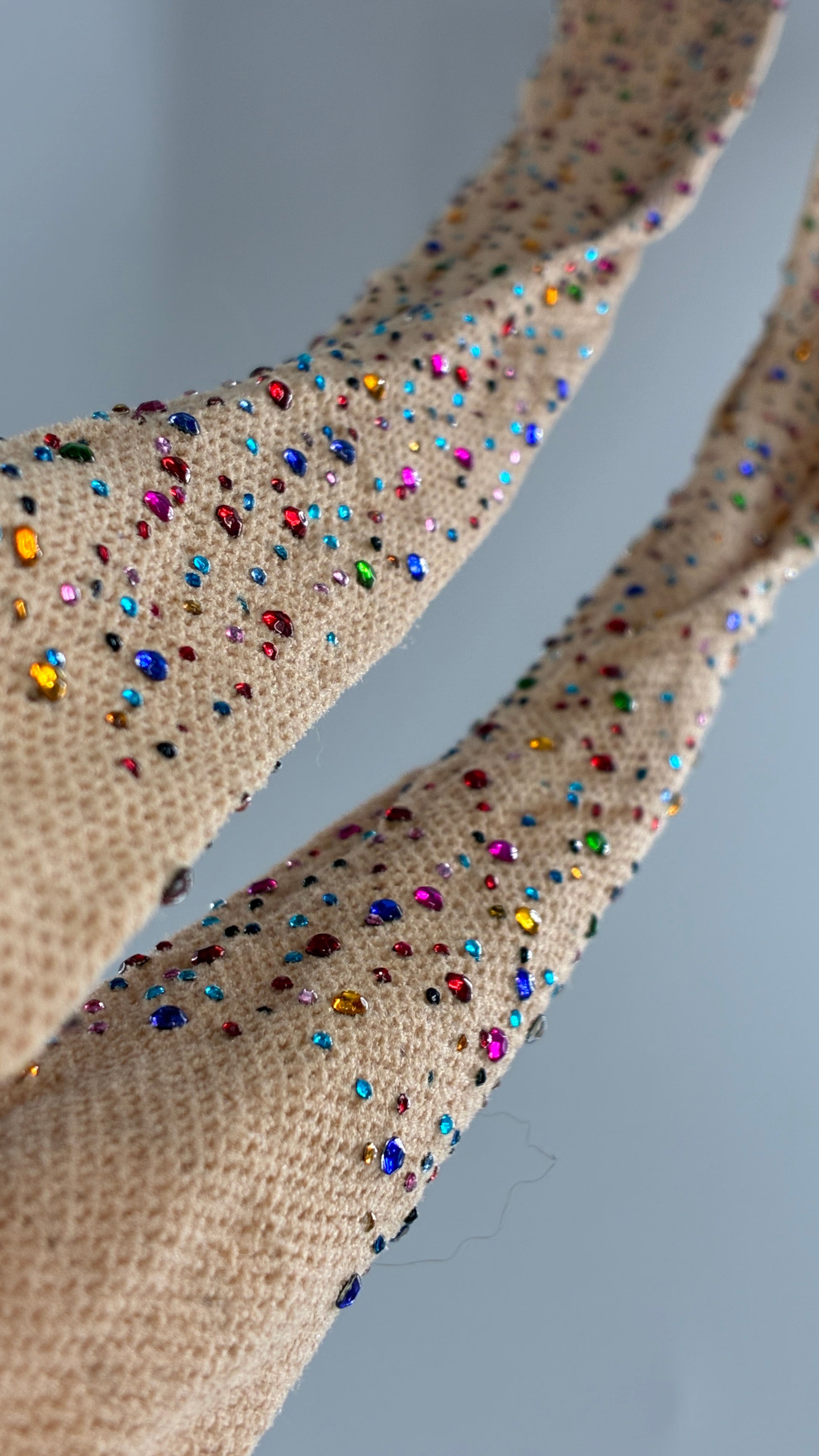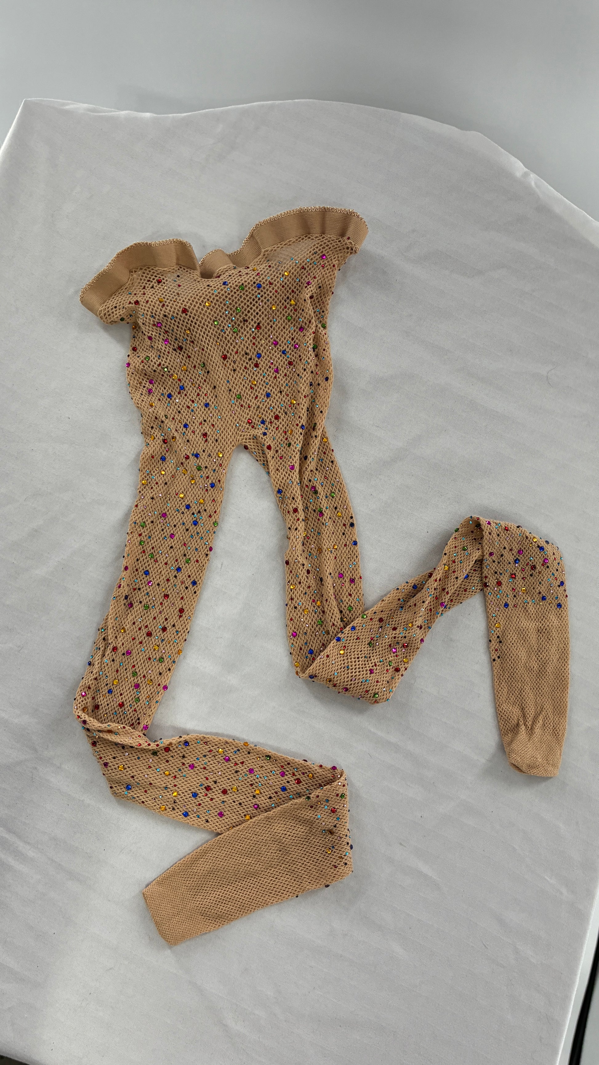 Beige Mesh Tights with All-Over Multicolored Rhinestones
