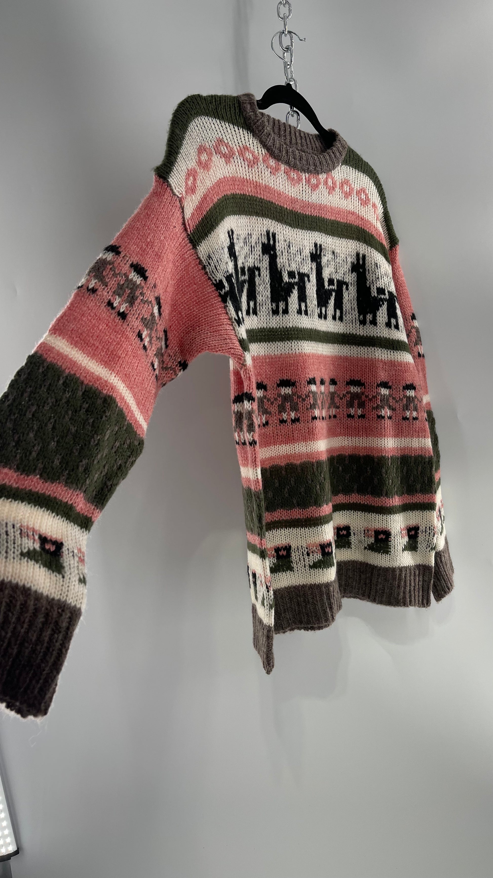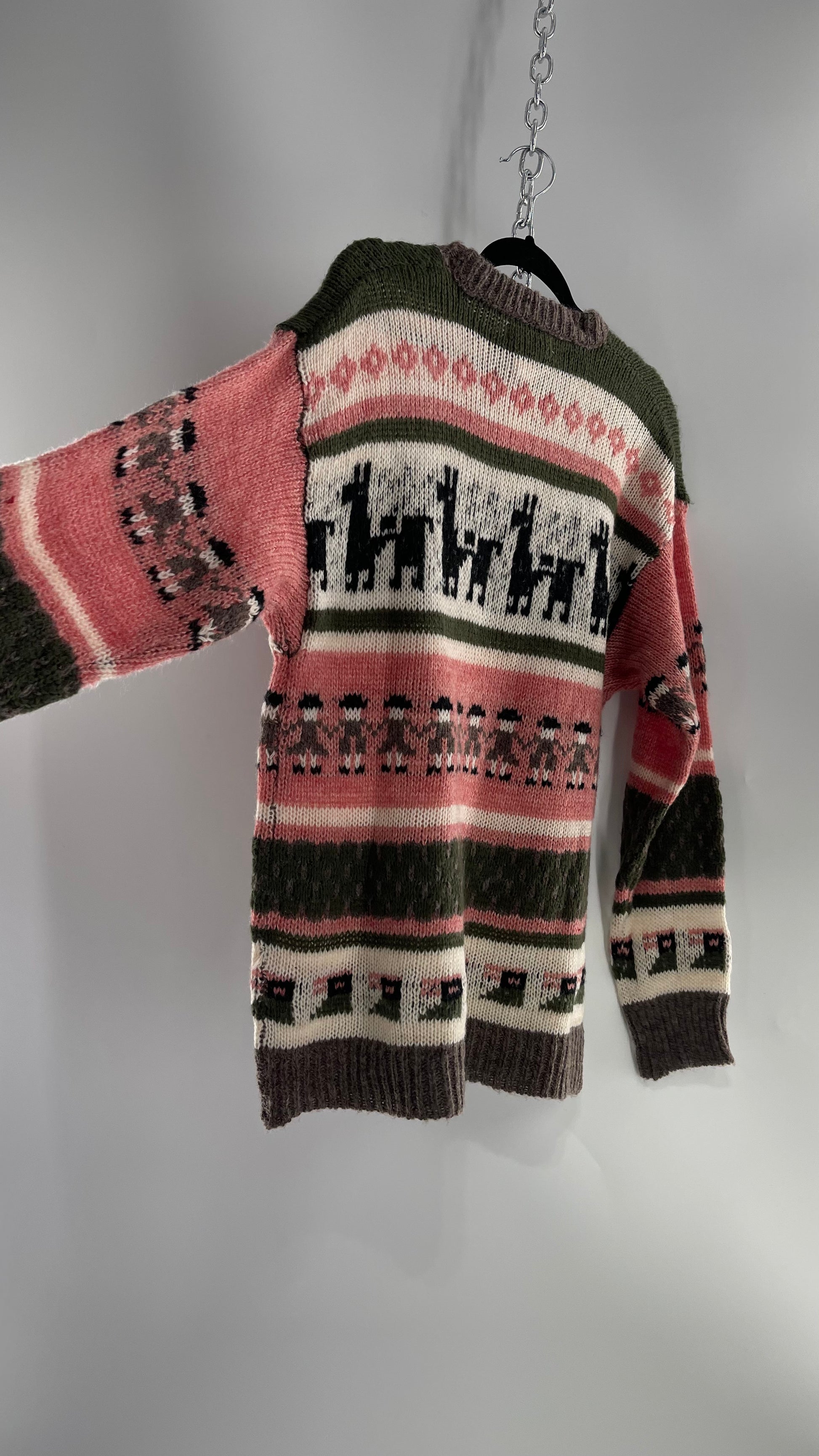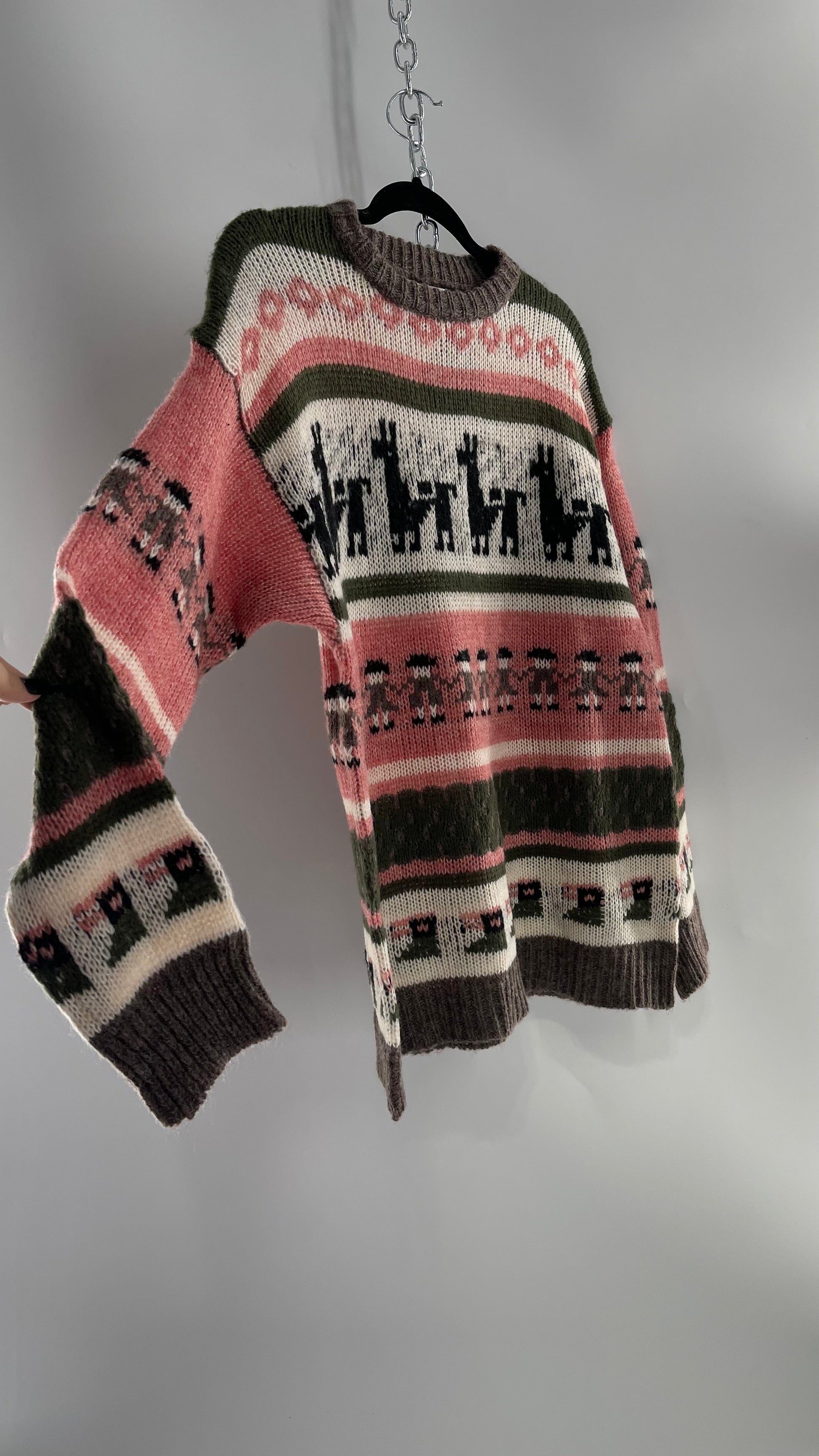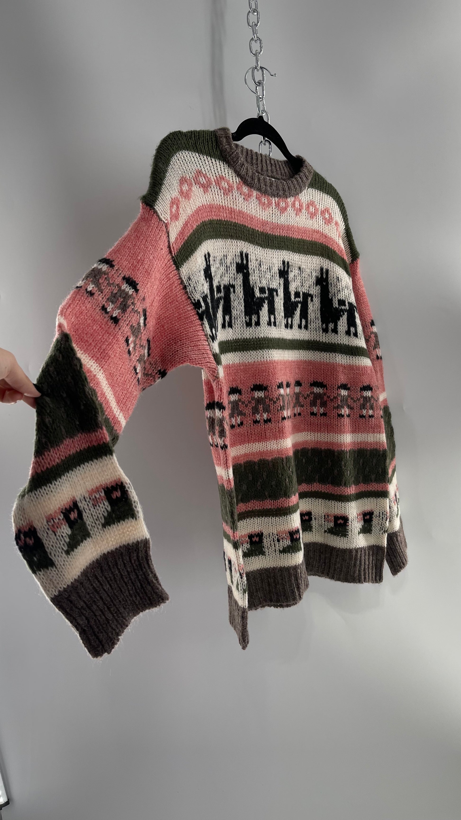 Cooke Collective Knit Llama/Alpaca Graphic Sweater with Army Green, Pink and White Colorway (Medium)