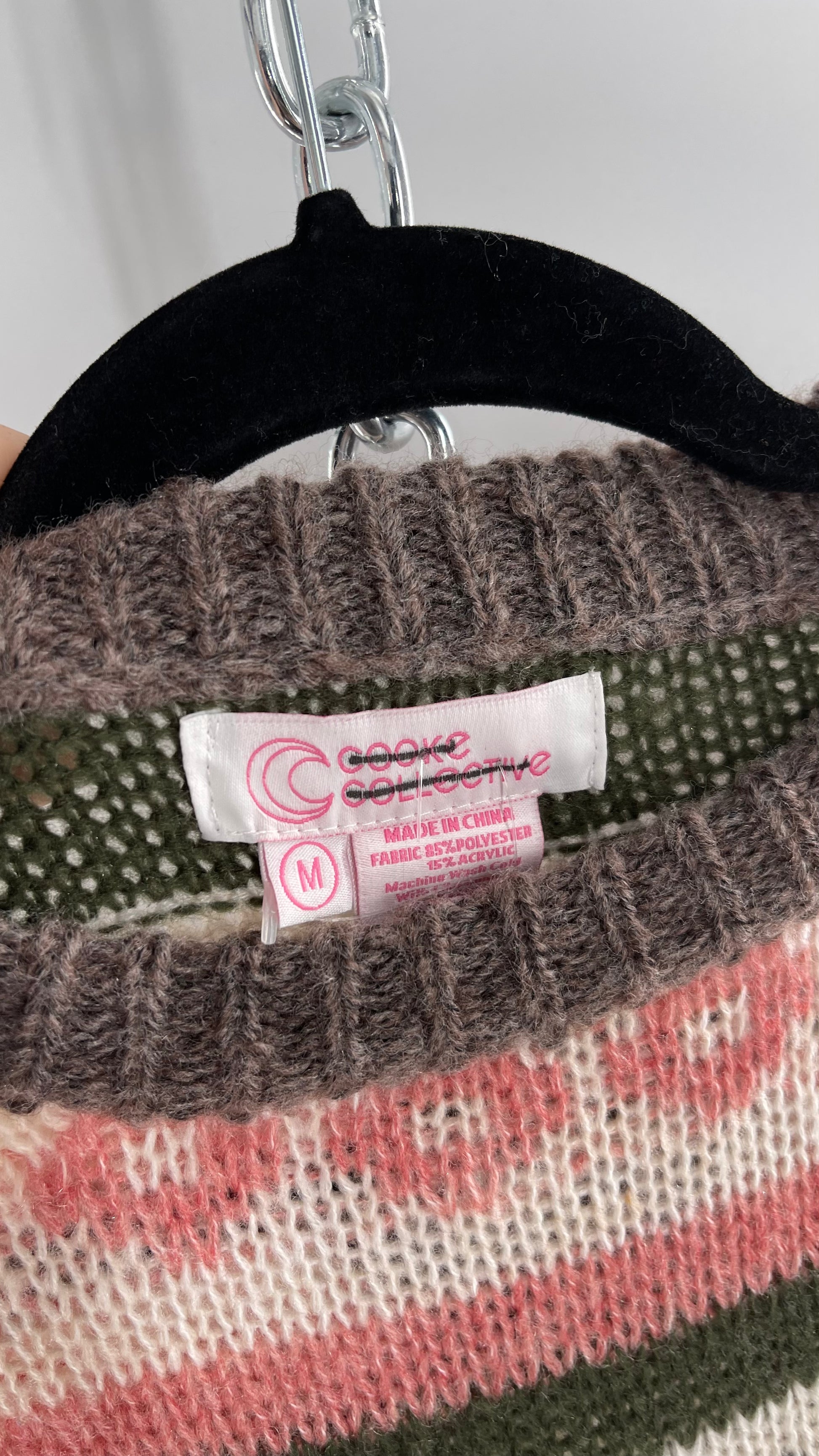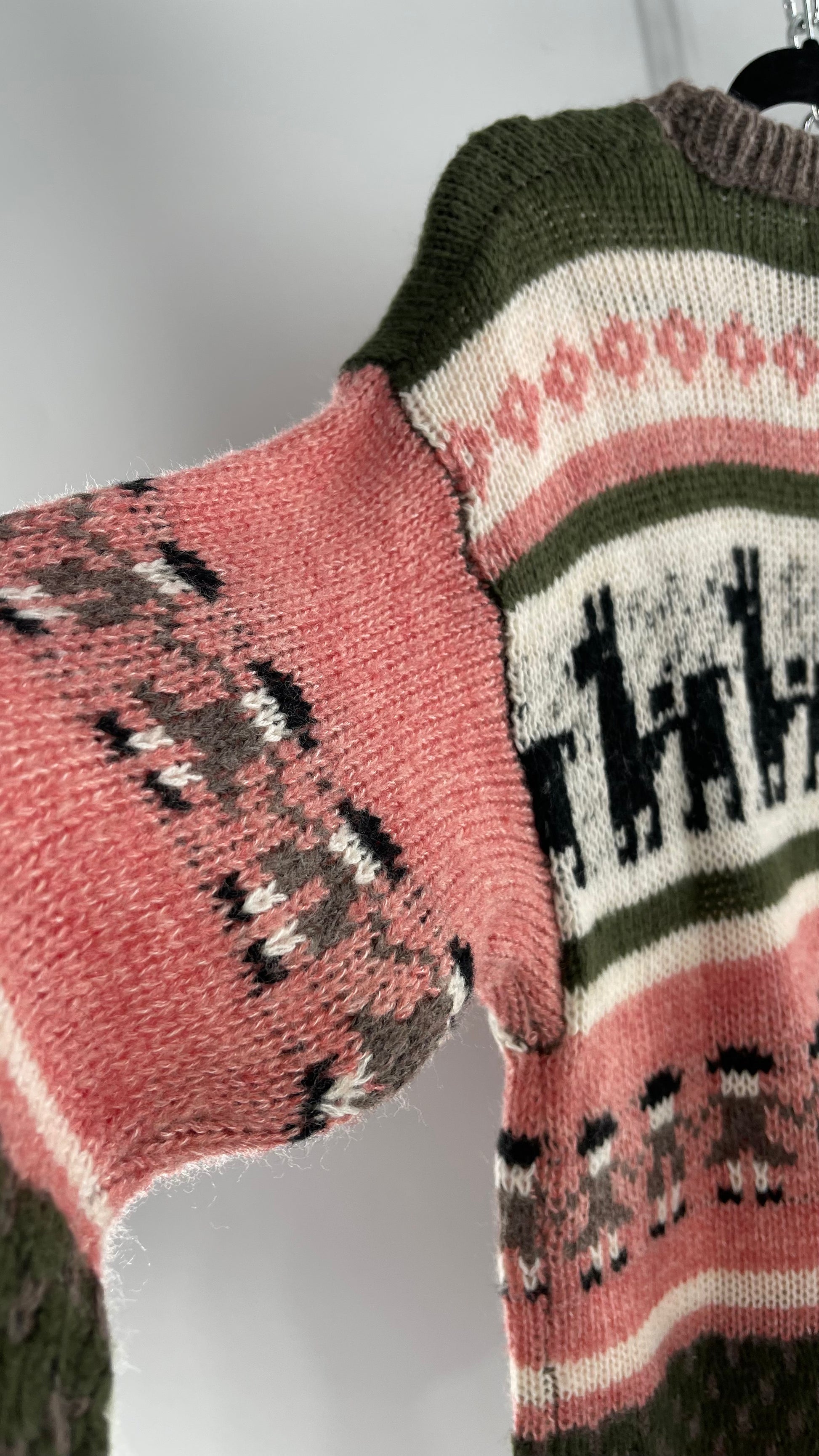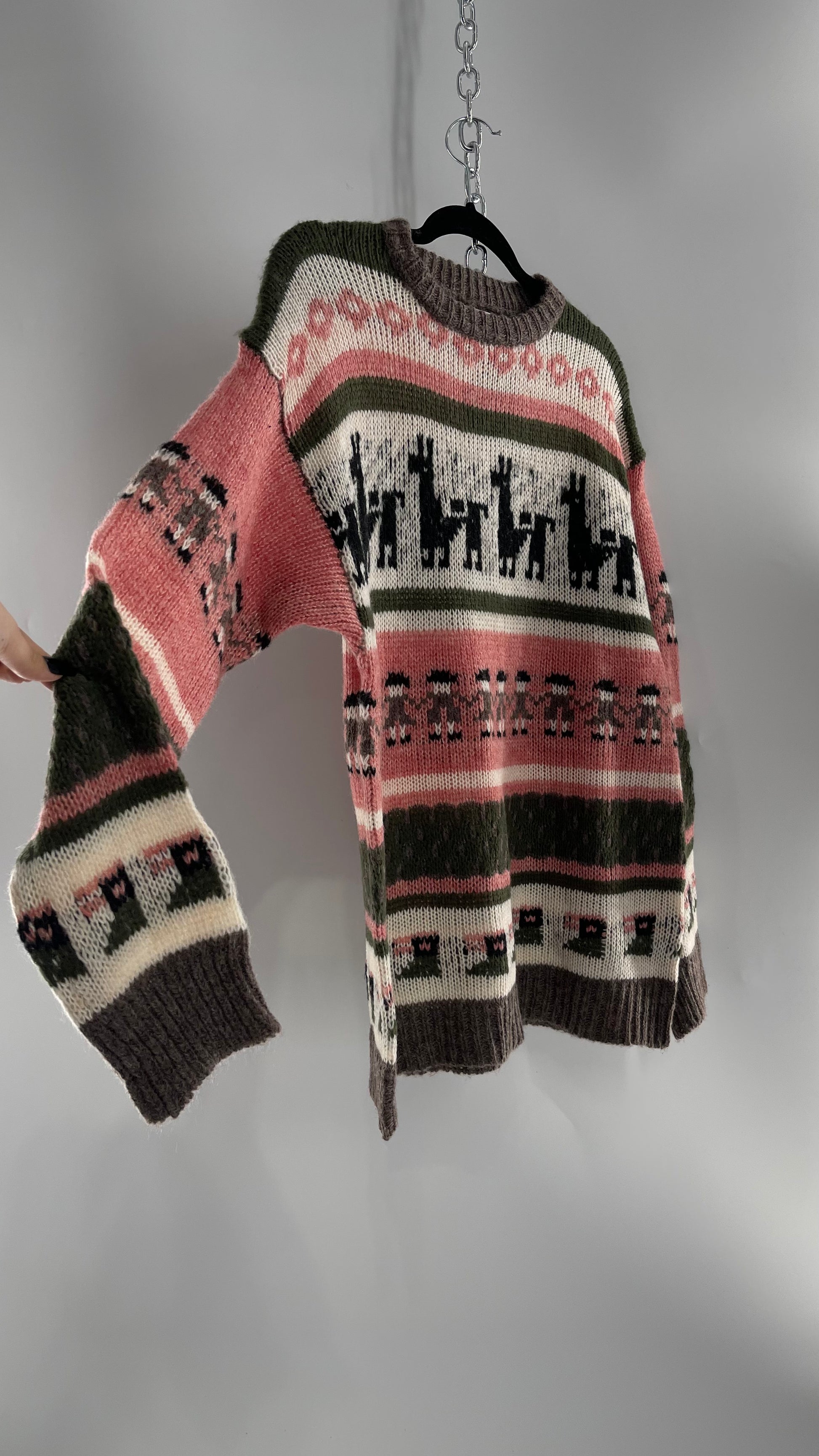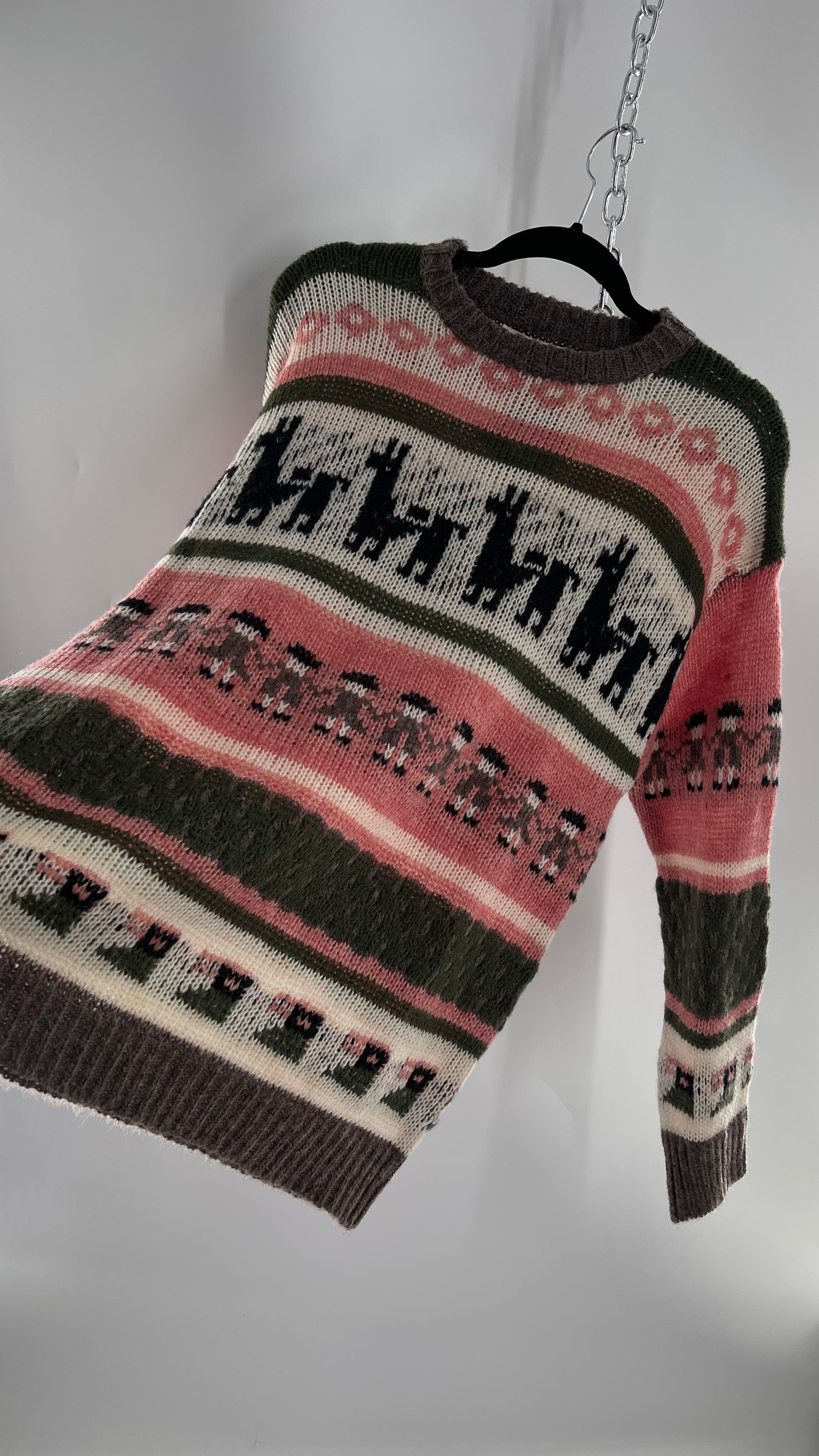 Cooke Collective Knit Llama/Alpaca Graphic Sweater with Army Green, Pink and White Colorway (Medium)