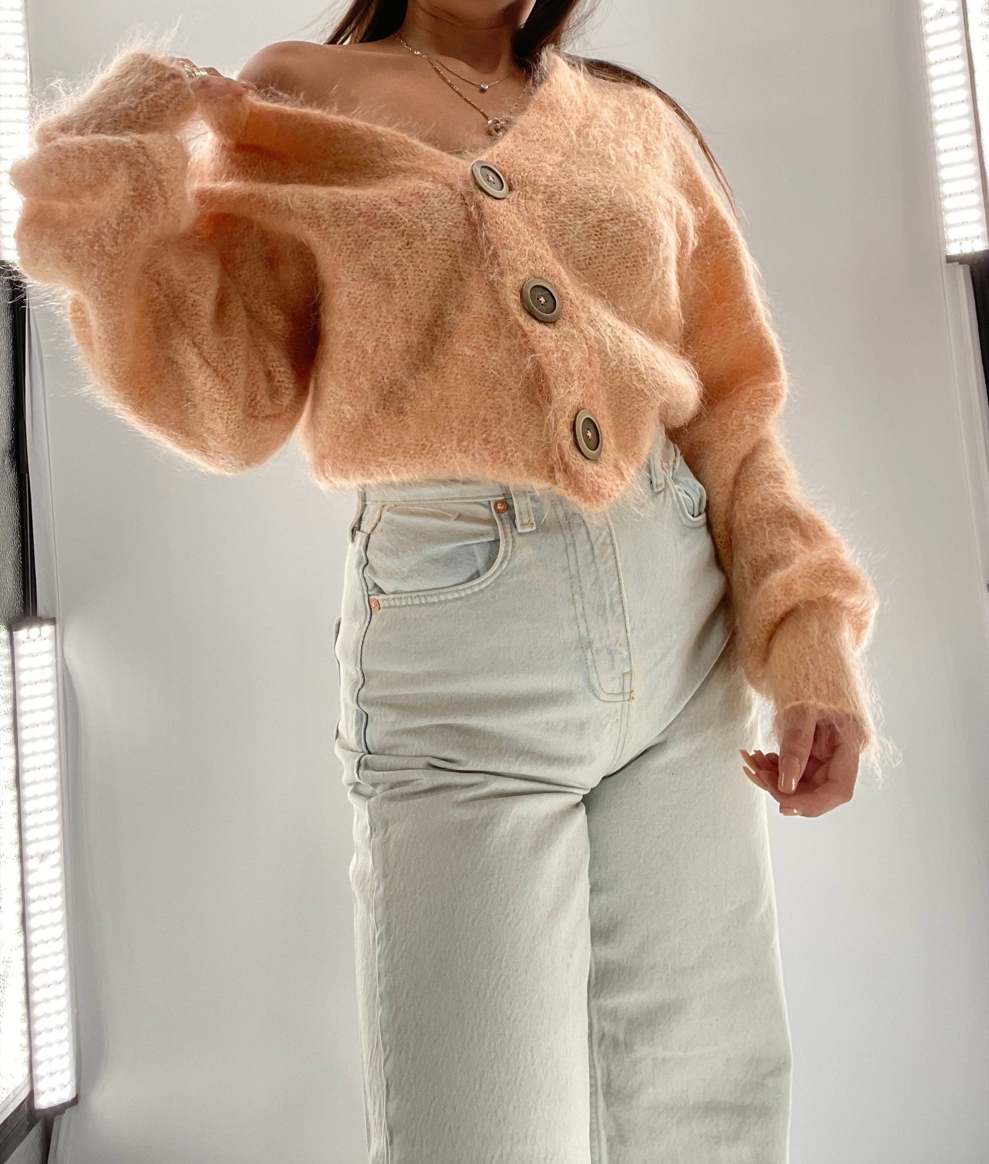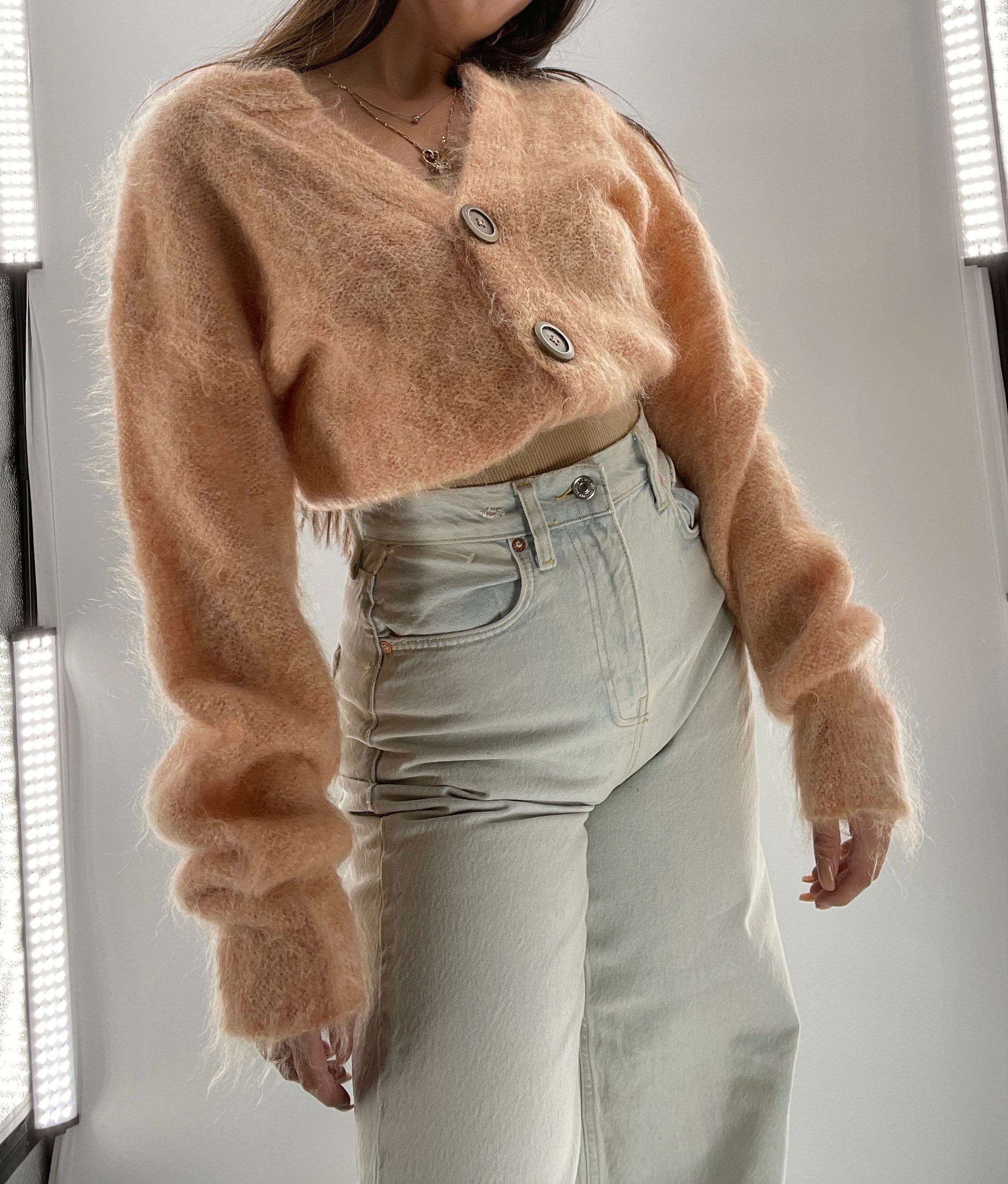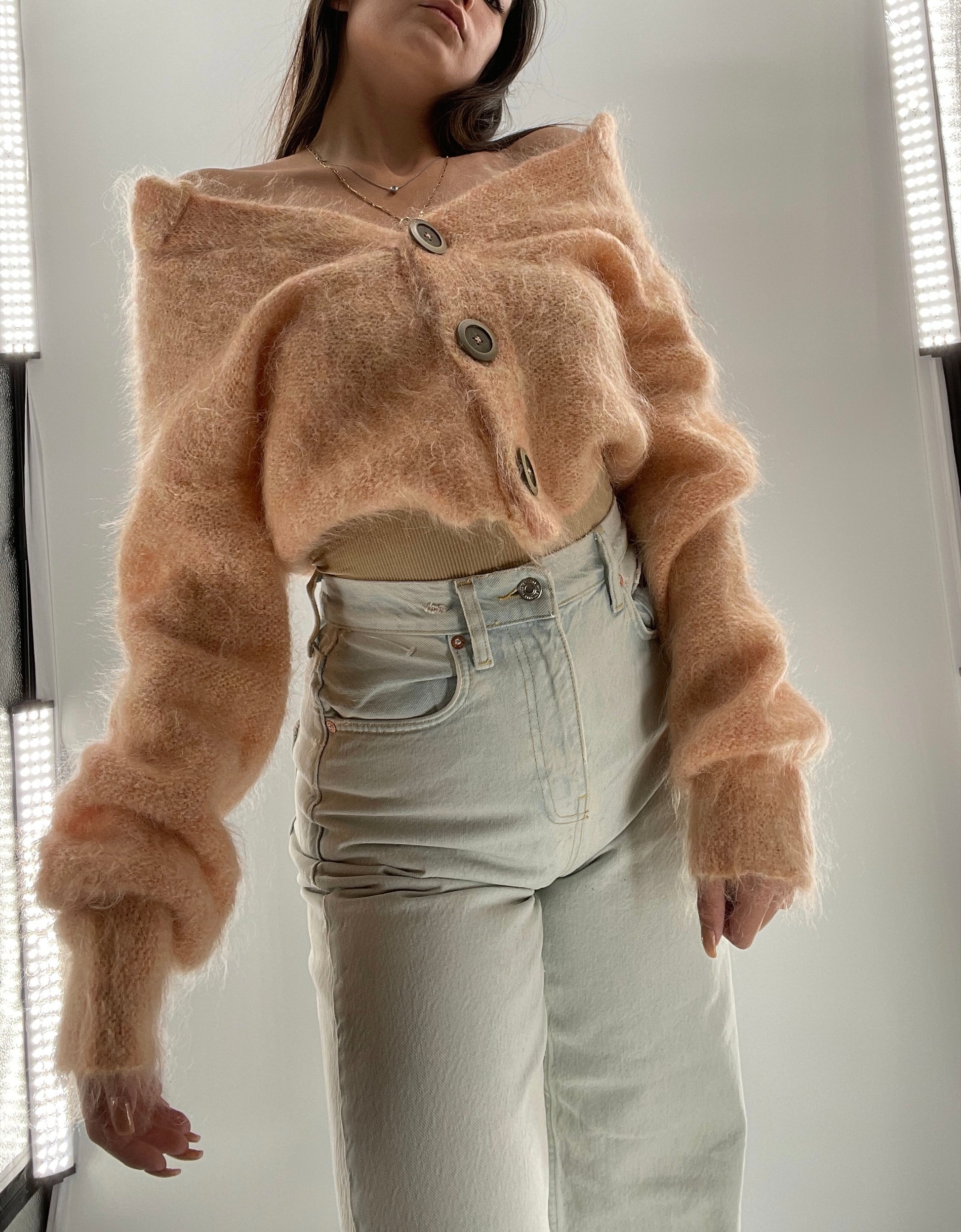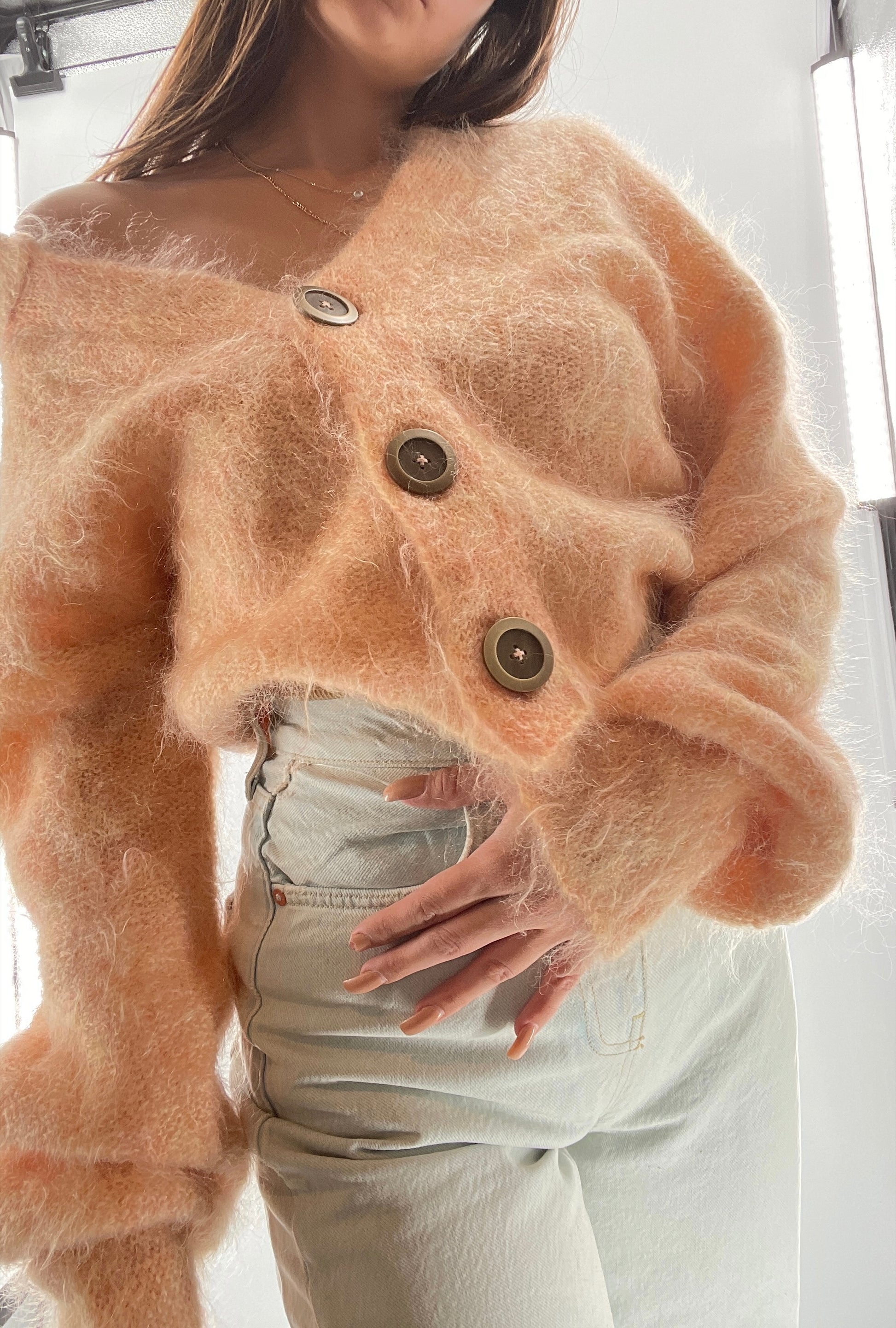 Free People 86% Mohair salmon/pink cropped cardigan with balloon sleeves, pleated back and wooden oversized buttons