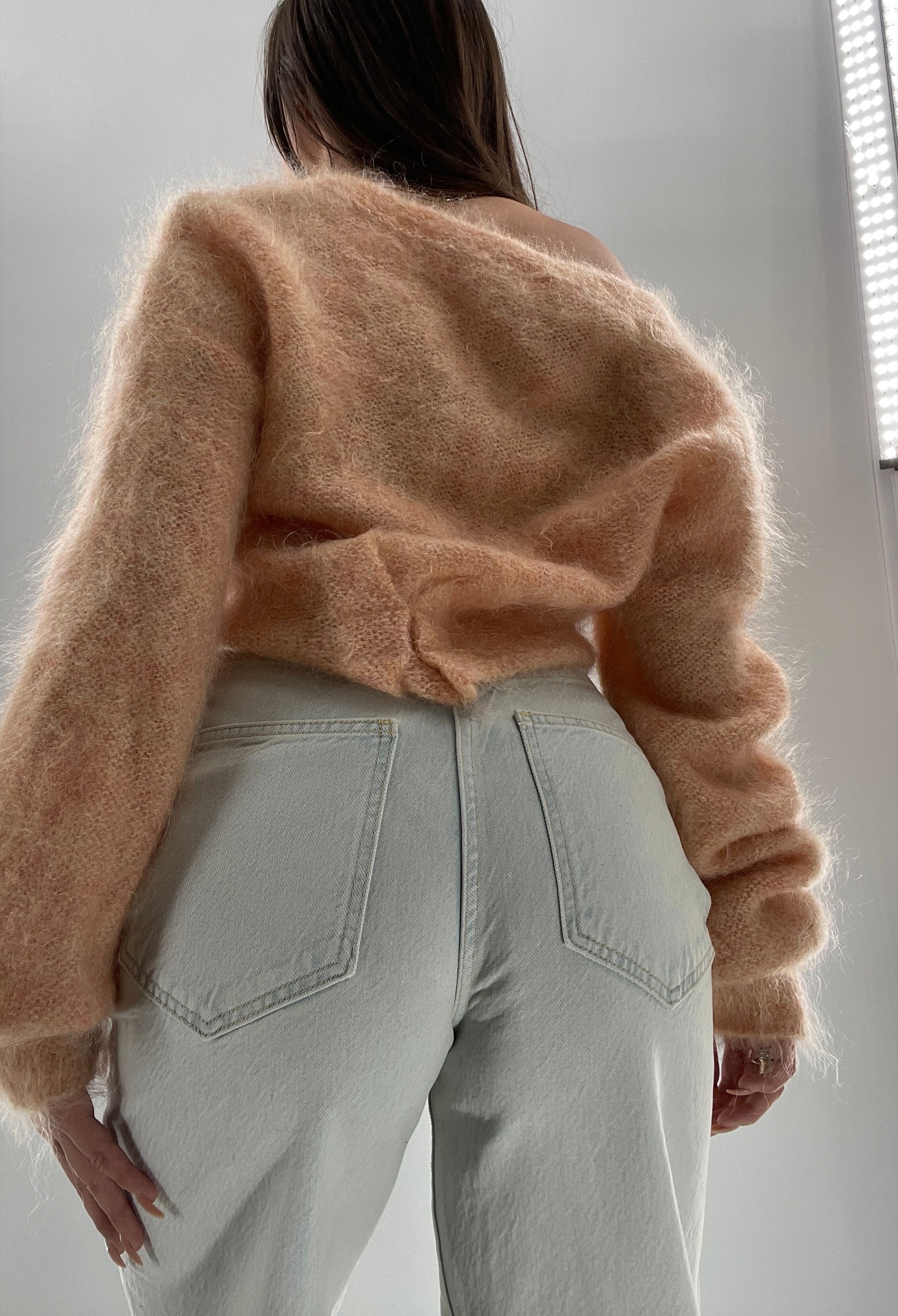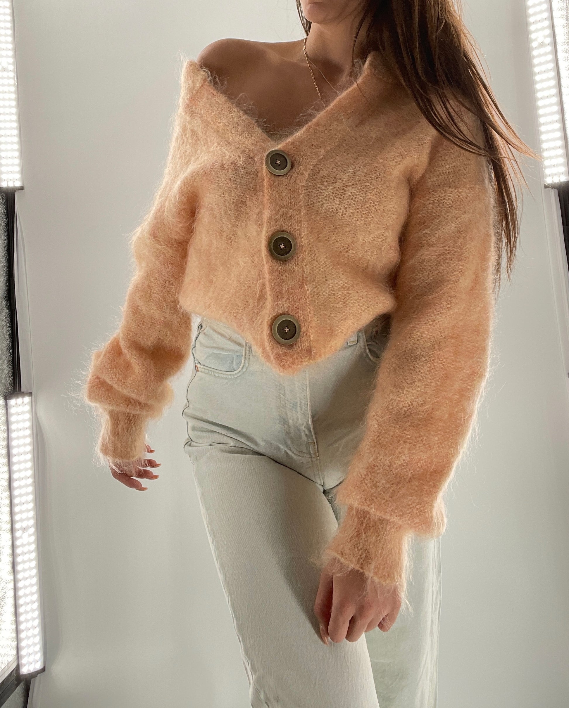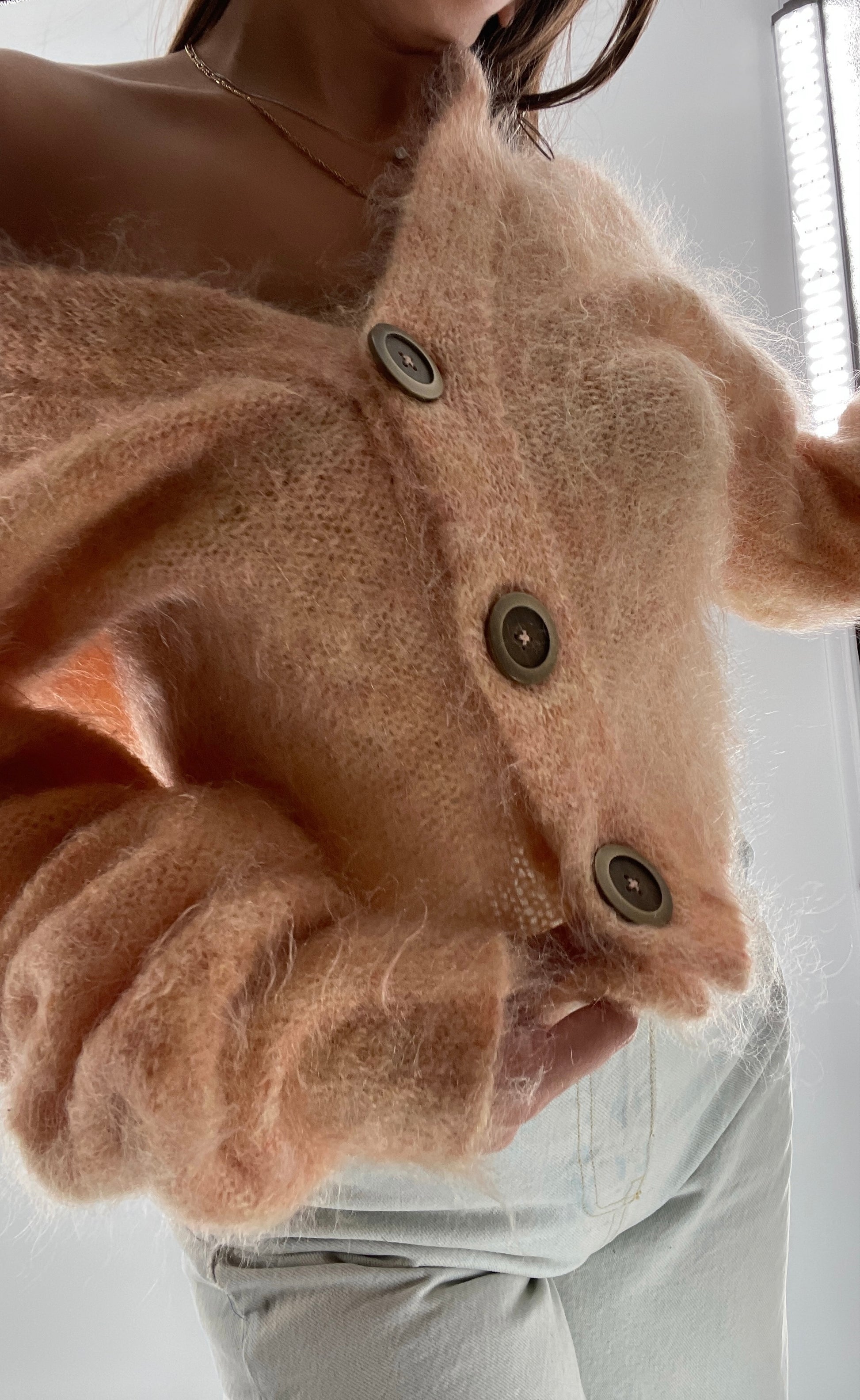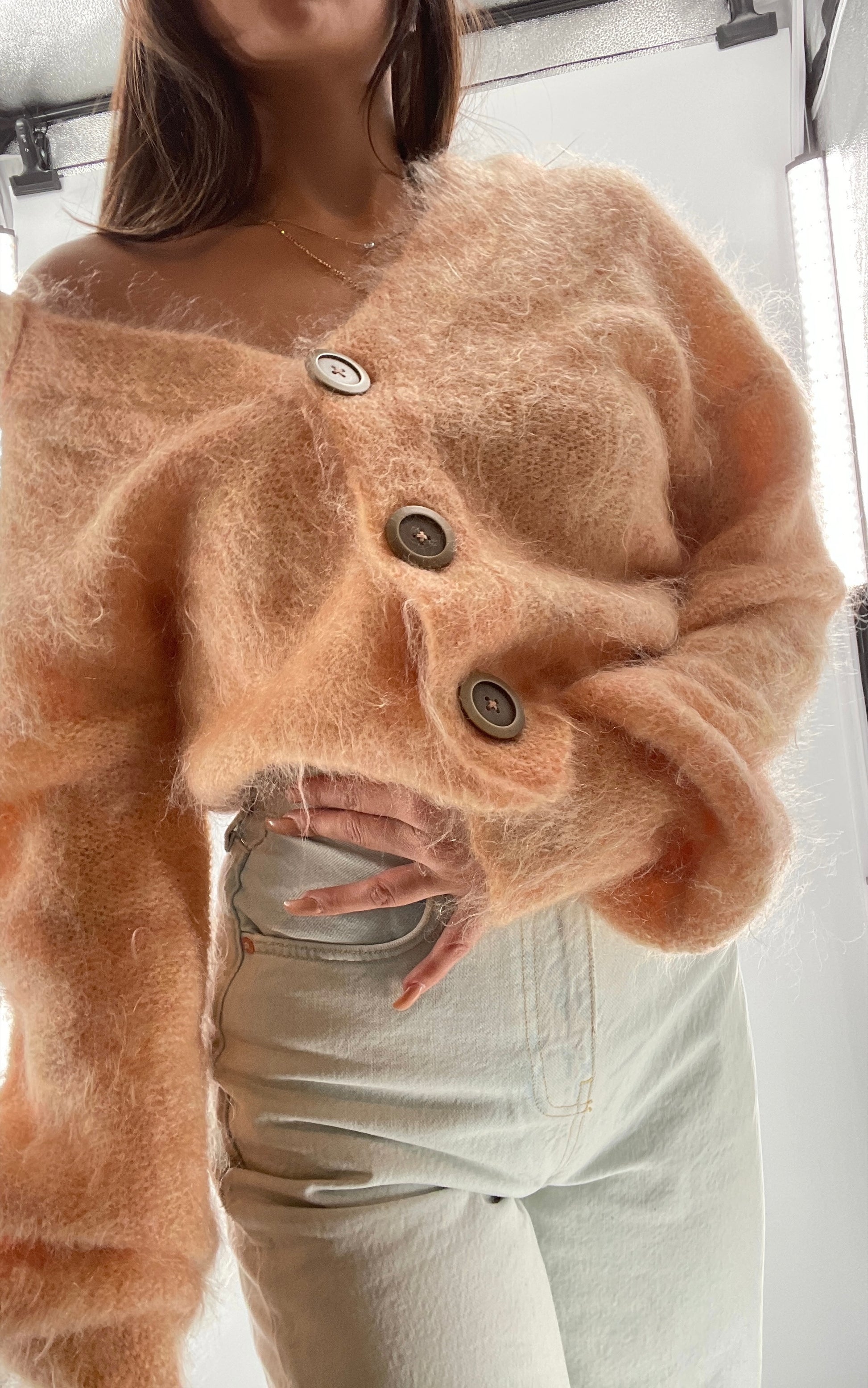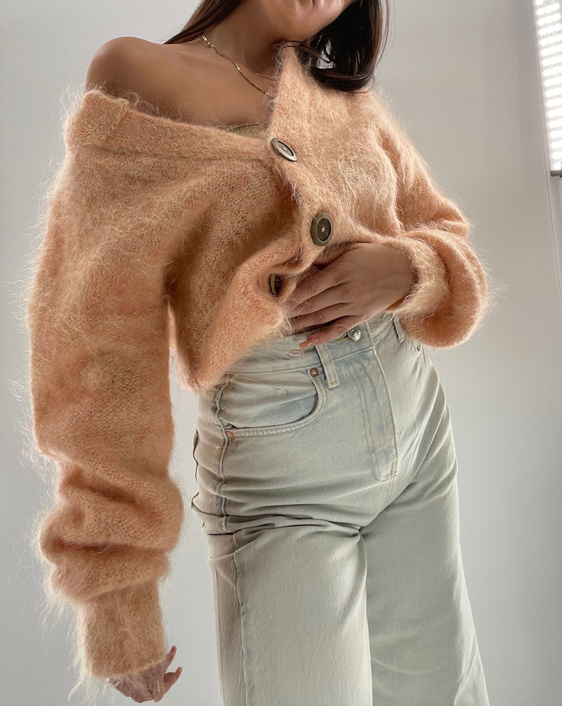 Free People 86% Mohair salmon/pink cropped cardigan with balloon sleeves, pleated back and wooden oversized buttons