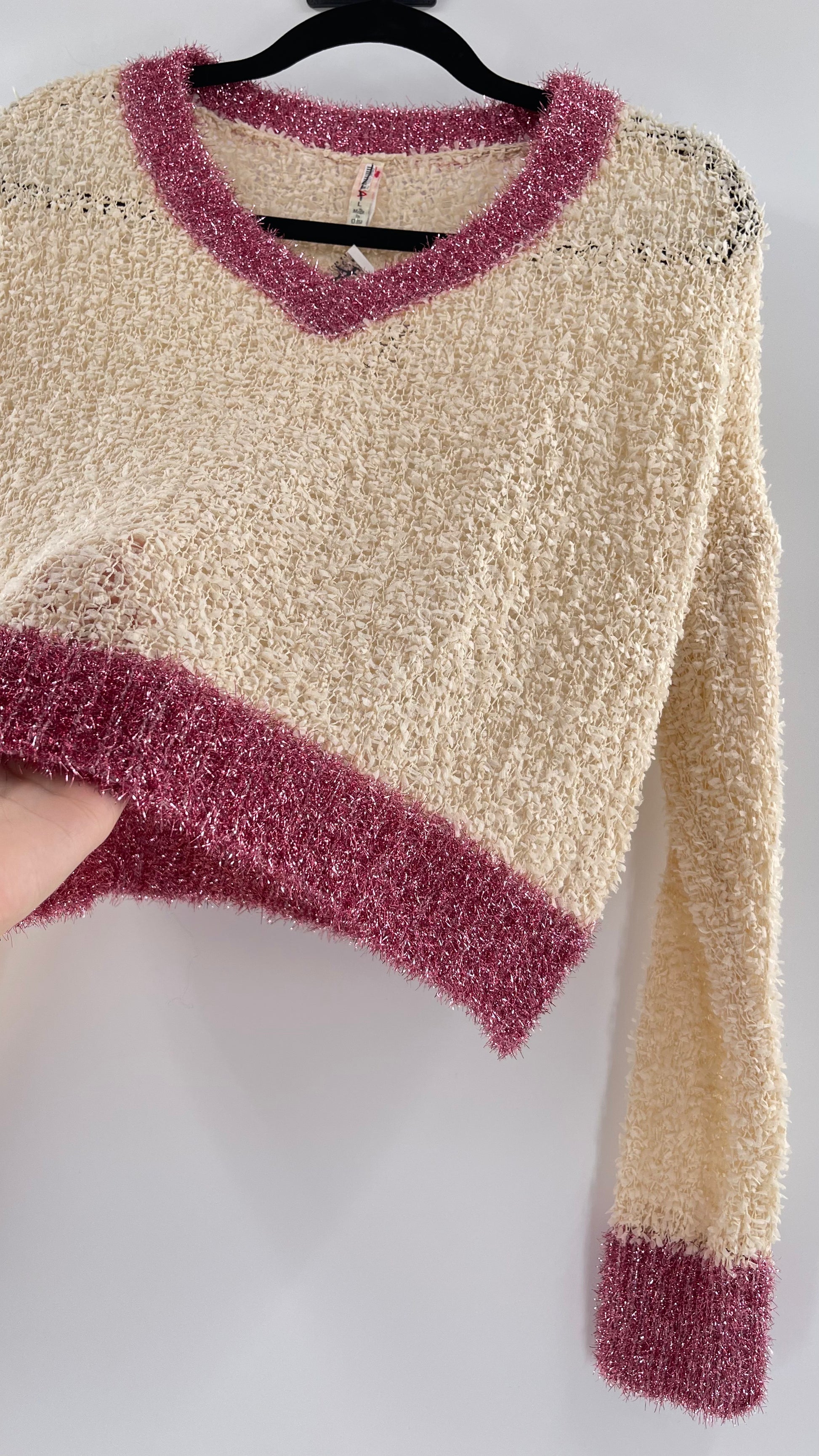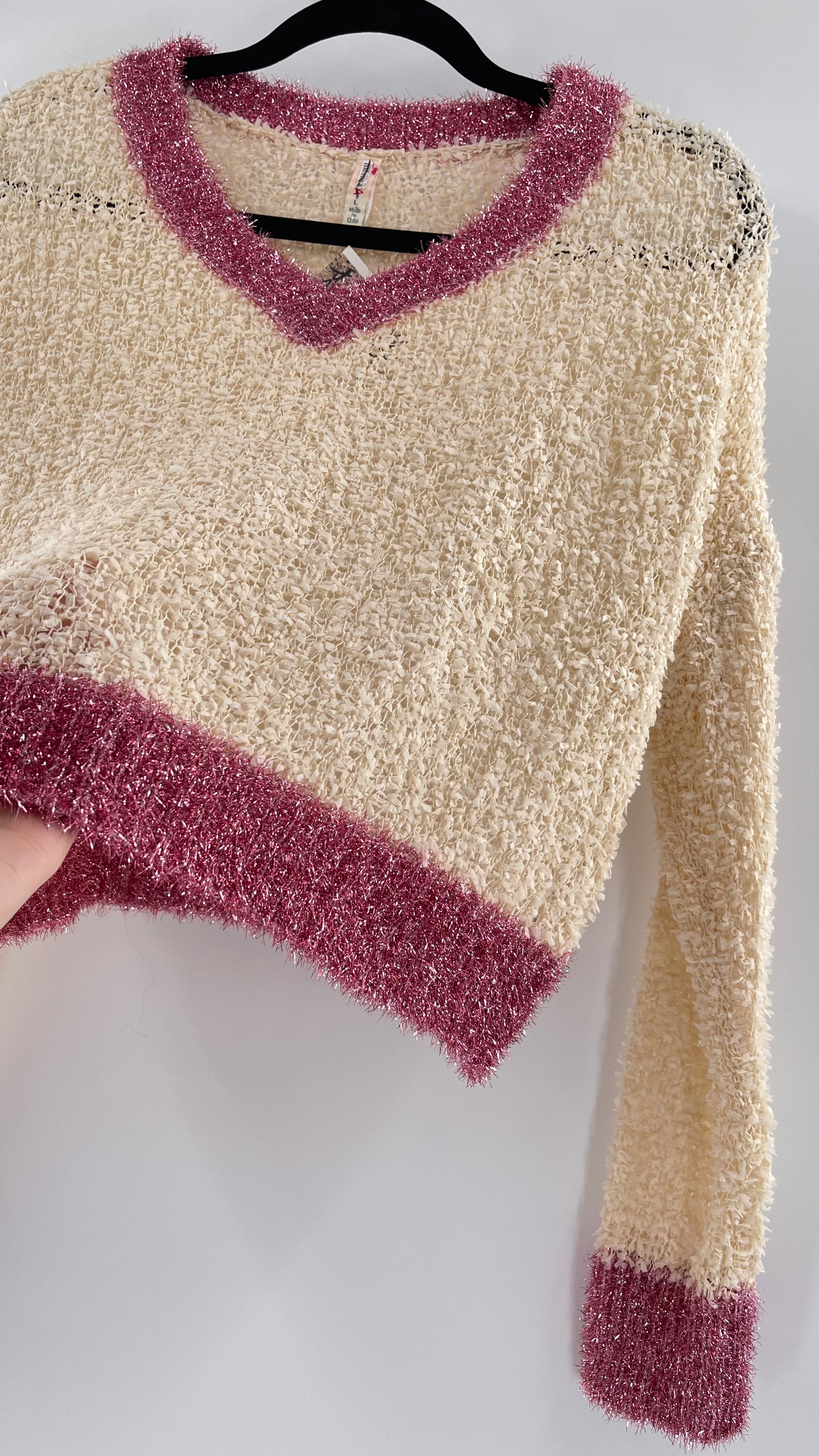 Anthropologie RAGA Cream and Fuchsia Tinsel Varsity Sweater (Large)