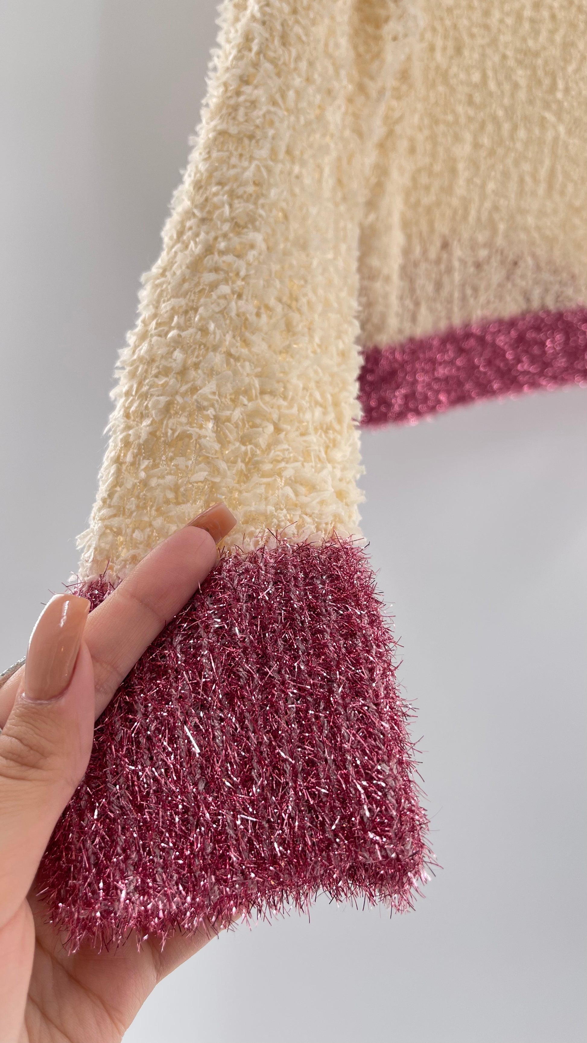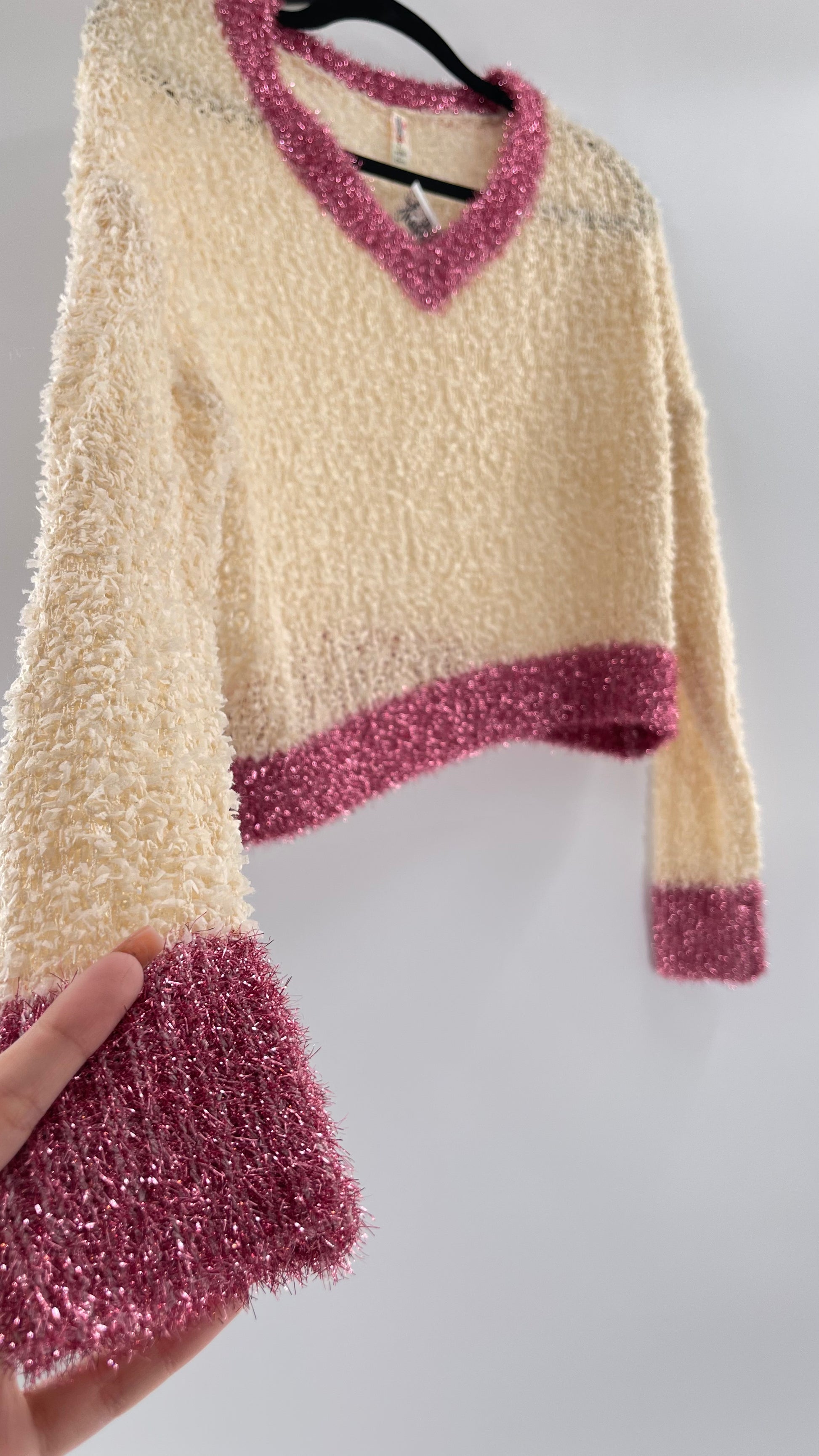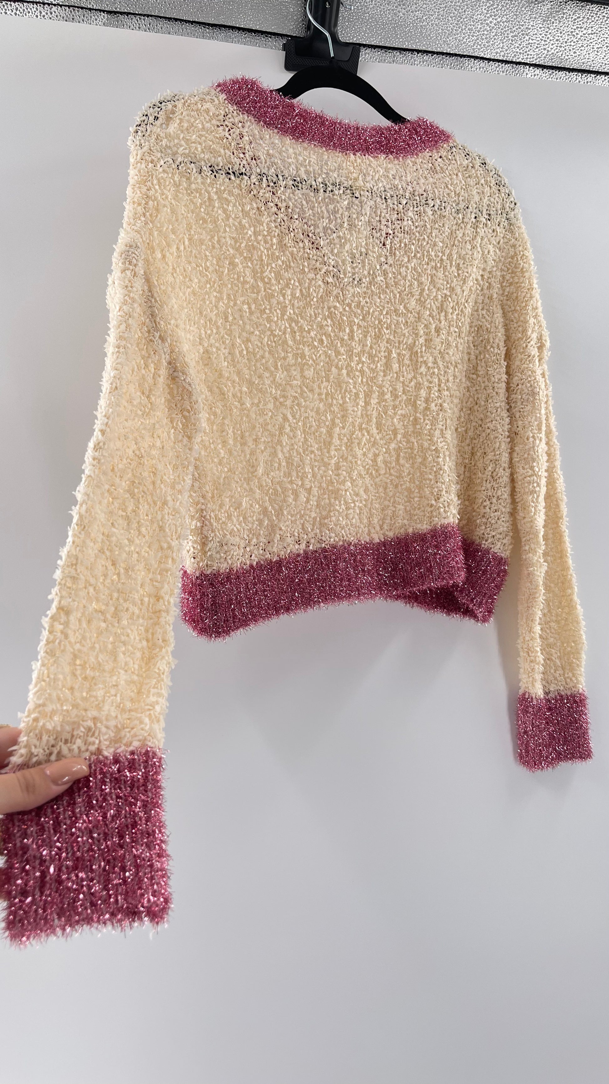 Anthropologie RAGA off white textured varsity style sweater with fuchsia tinsel trim |