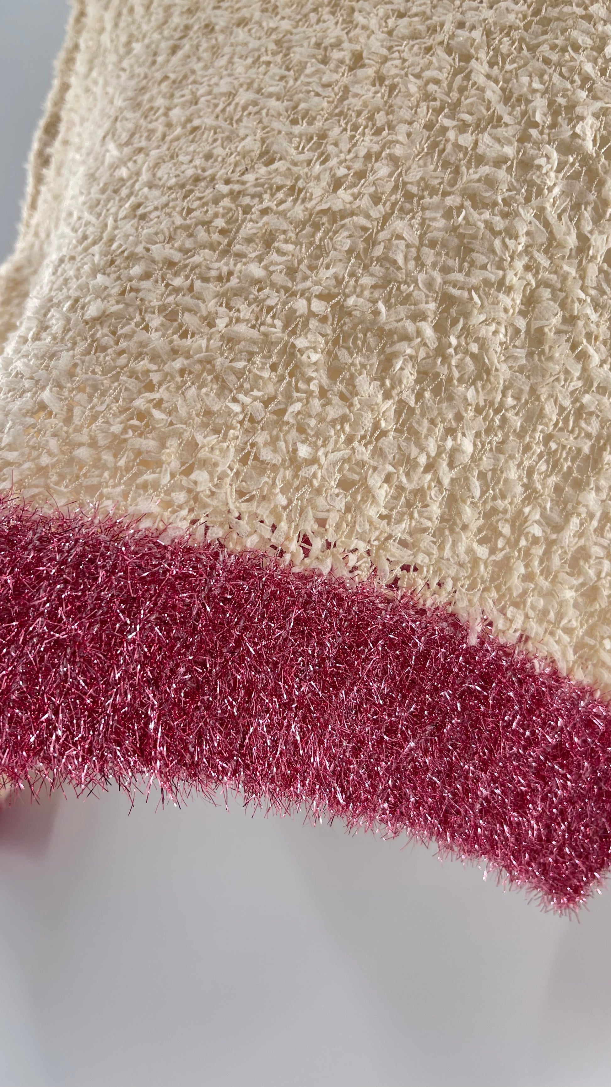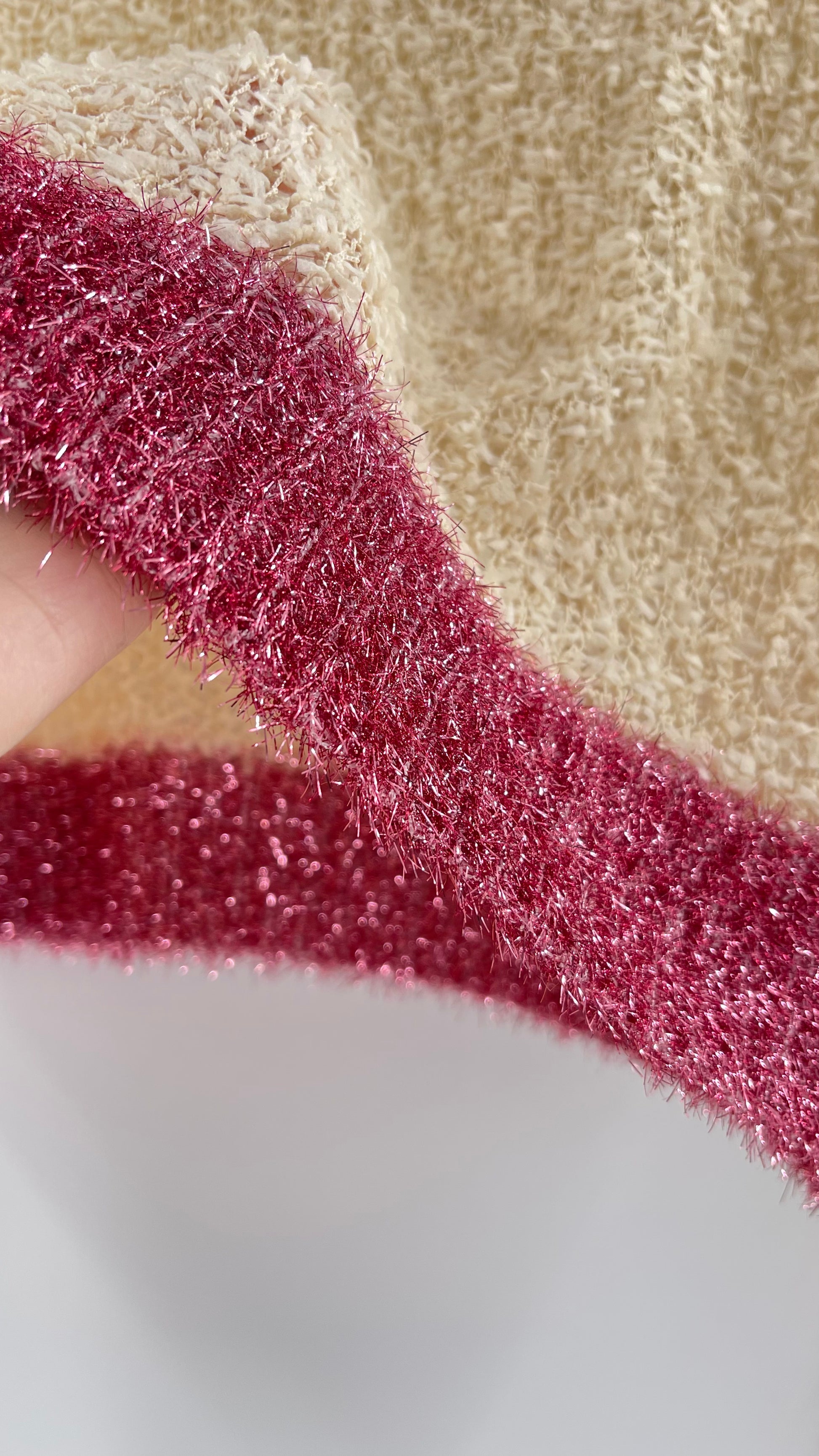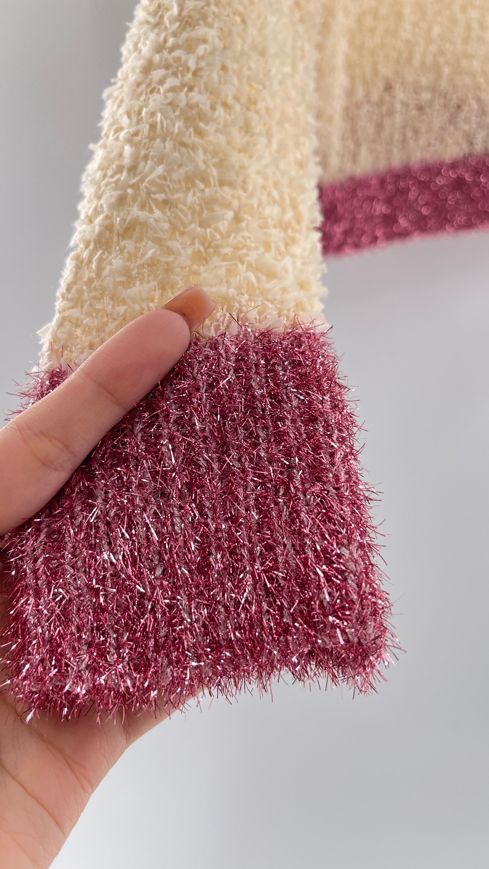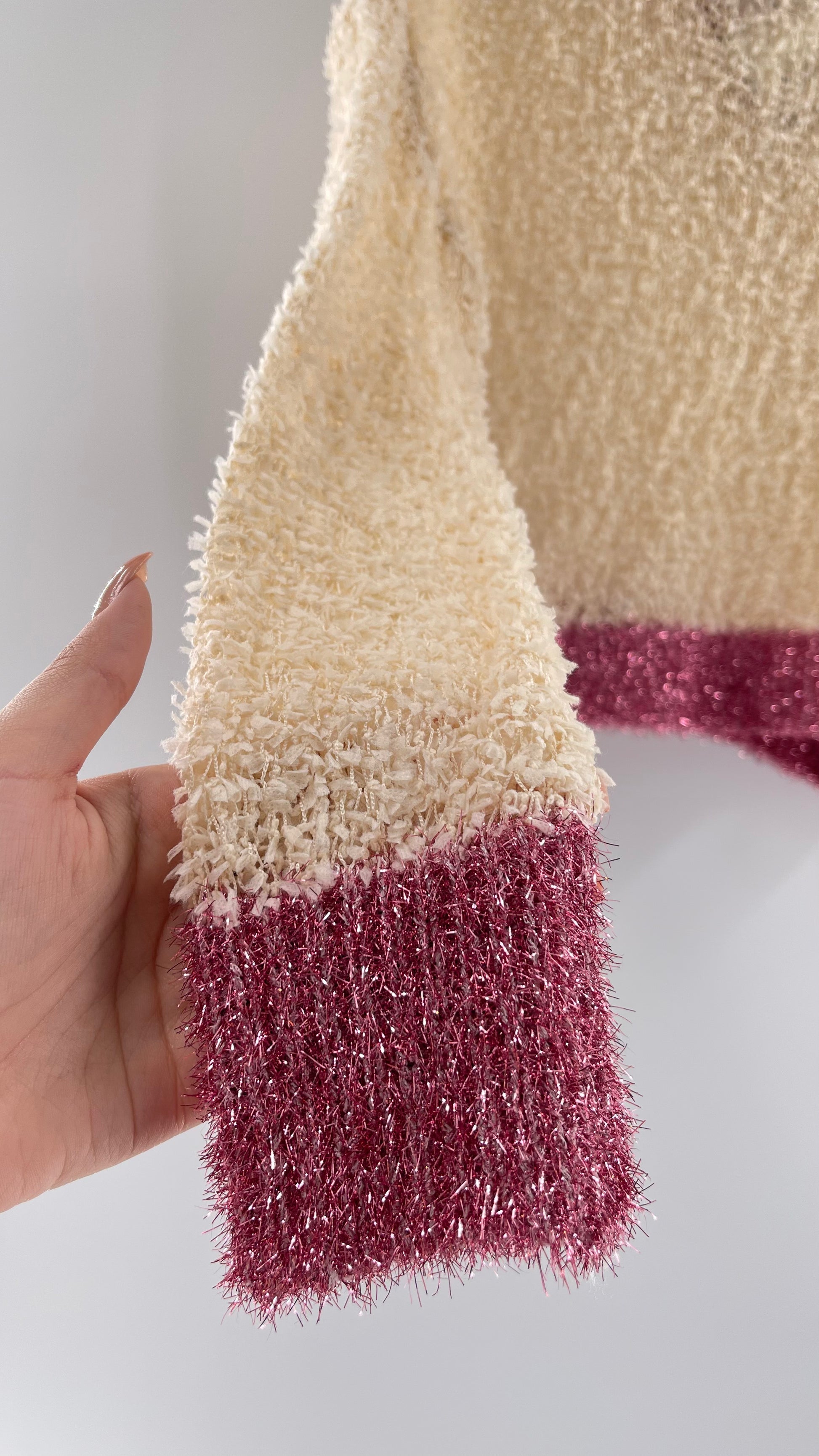 Anthropologie RAGA off white textured varsity style sweater with fuchsia tinsel trim |