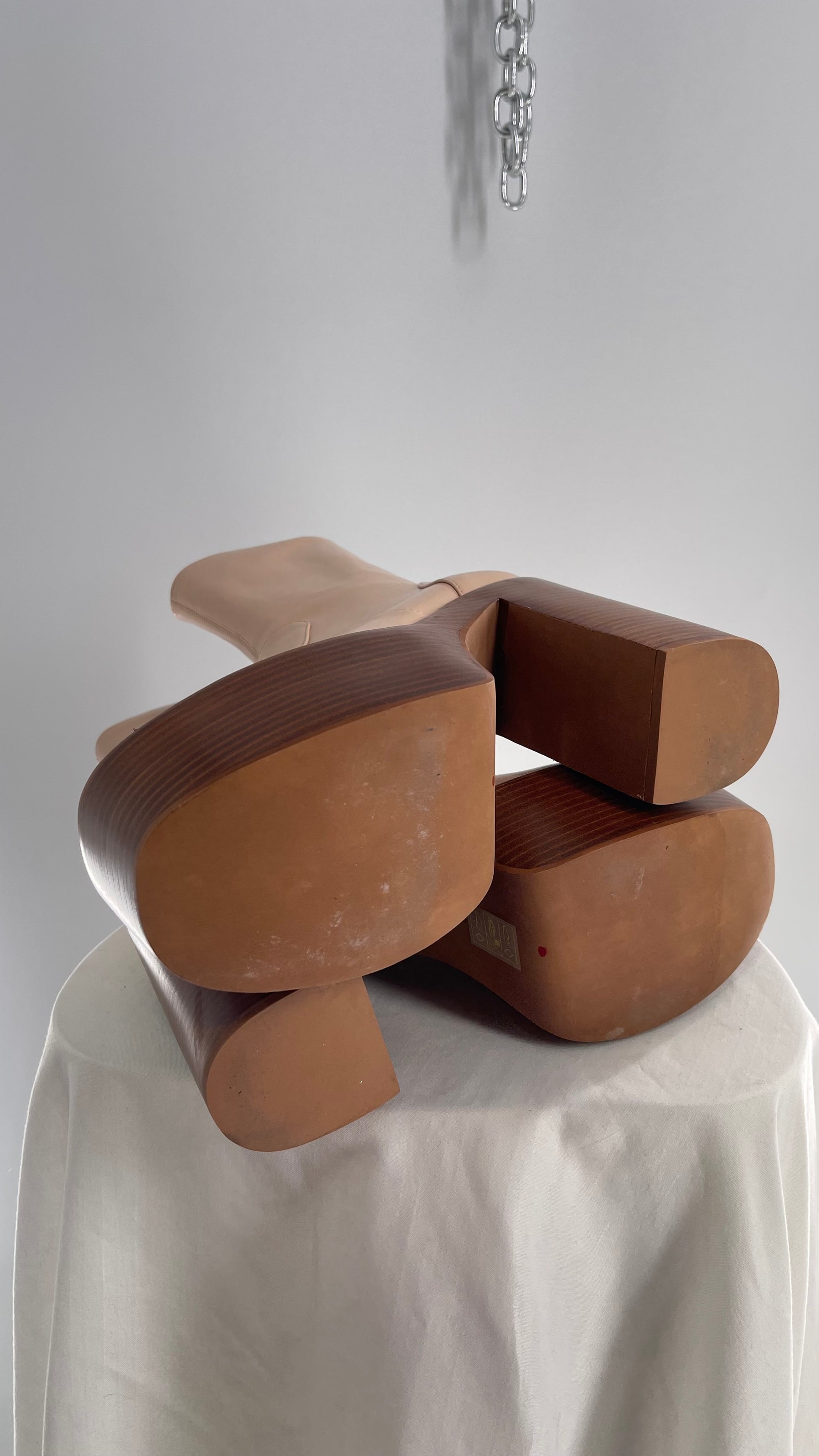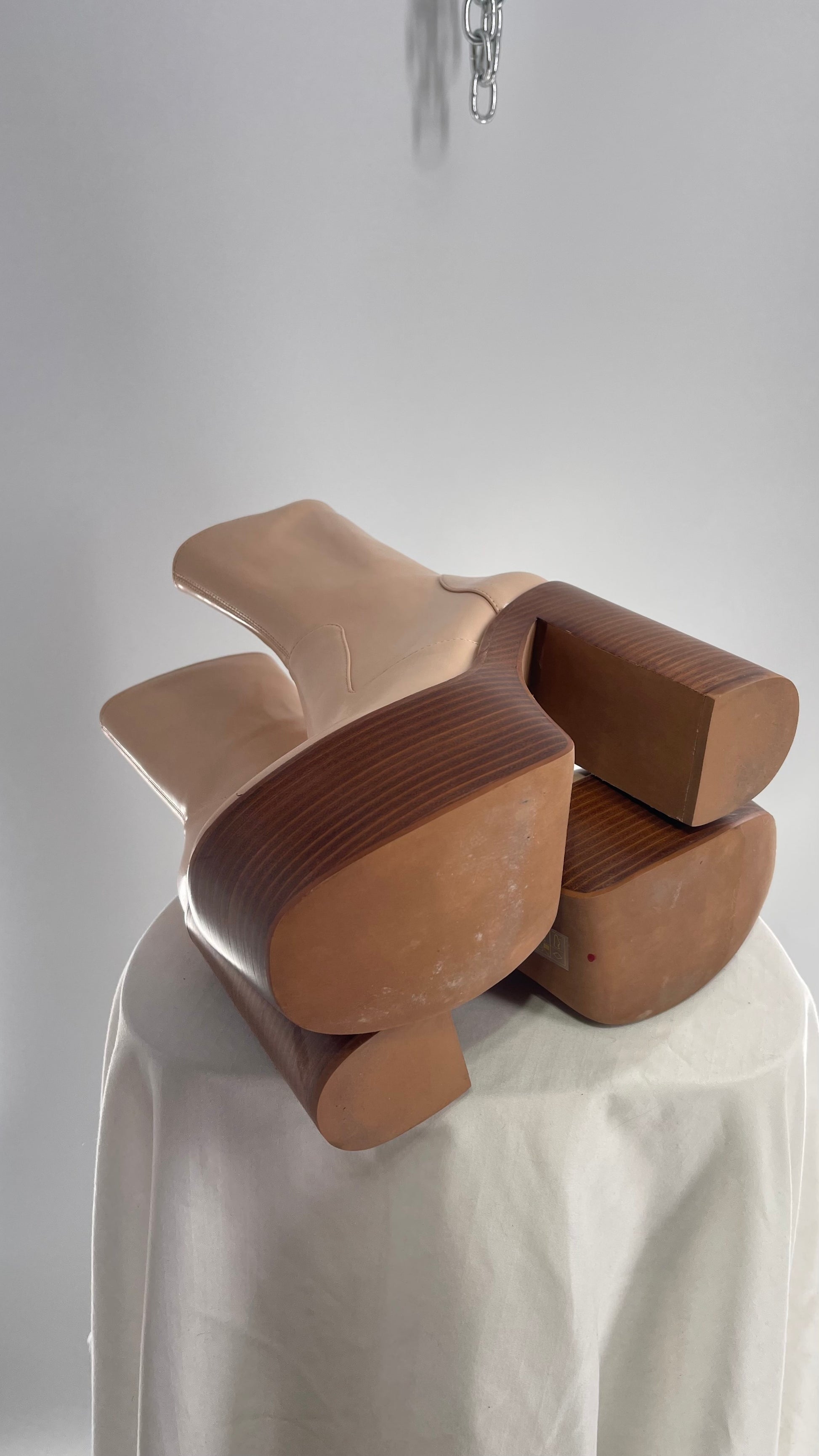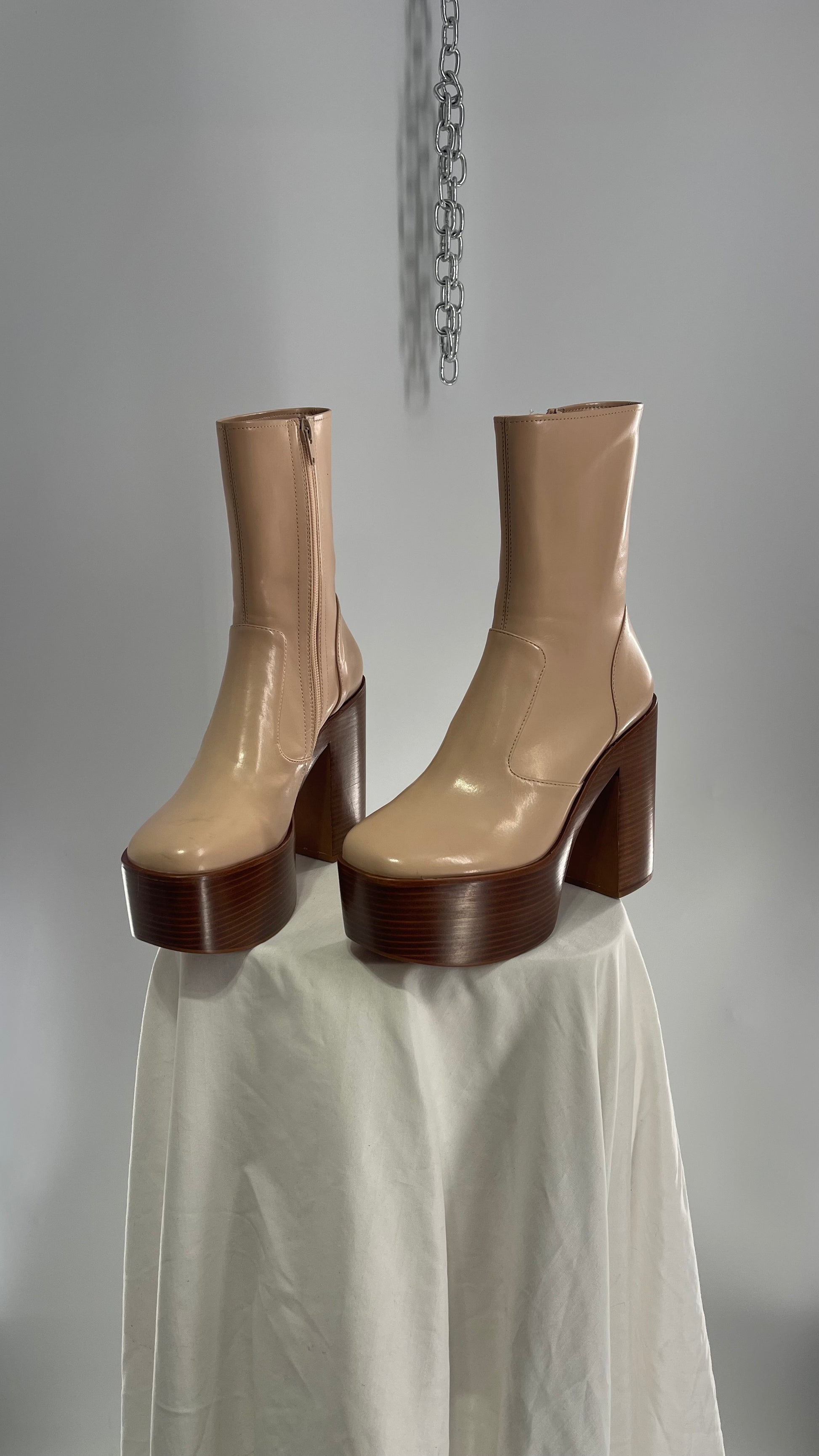 Free People X Jeffrey Campbell Mexique GoGo Boots • Beige Patent Boot with Wood Grain Chunky Block Heel and Platform (8)