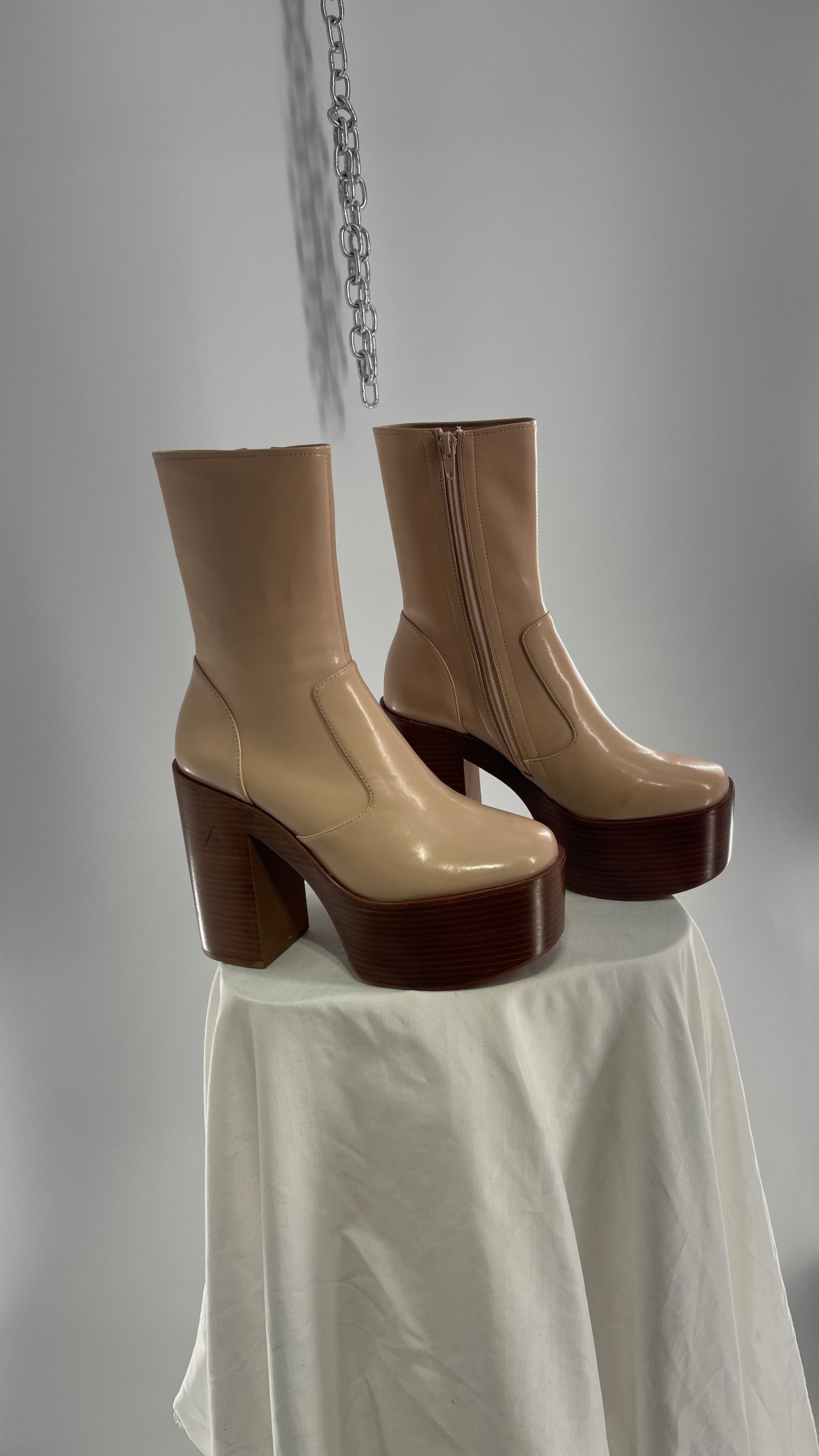 Free People X Jeffrey Campbell Mexique GoGo Boots • Beige Patent Boot with Wood Grain Chunky Block Heel and Platform