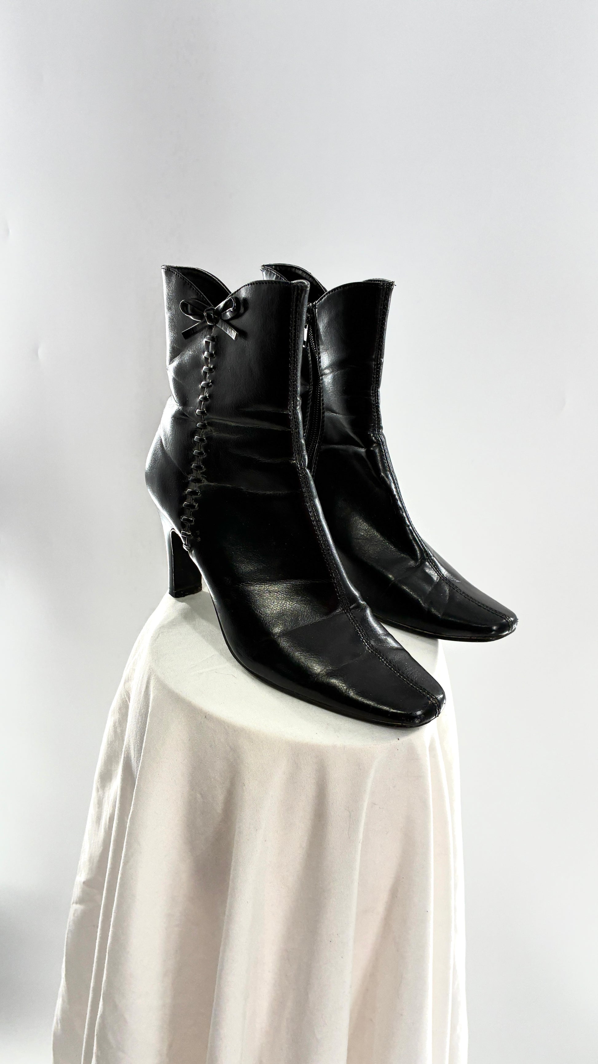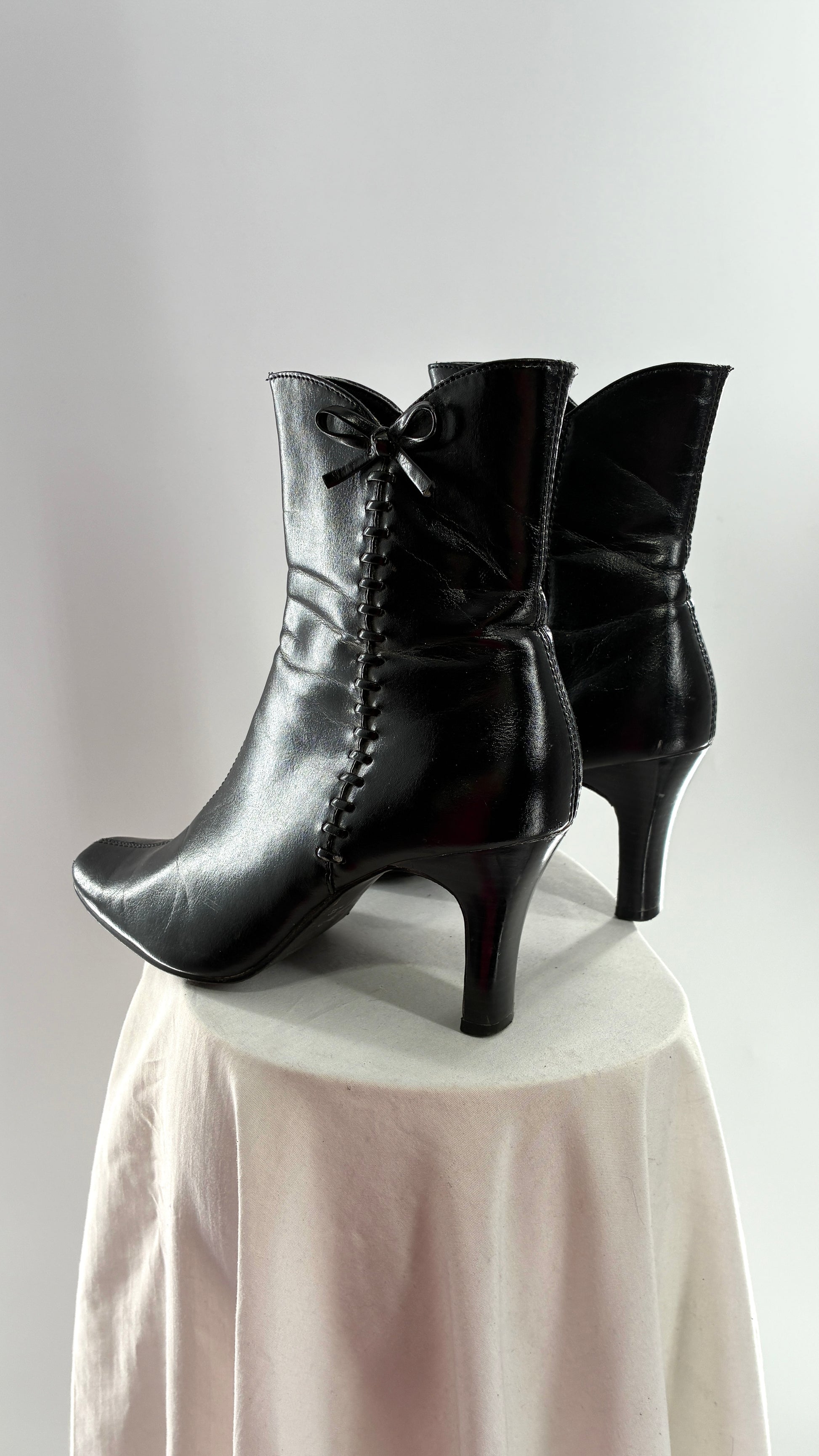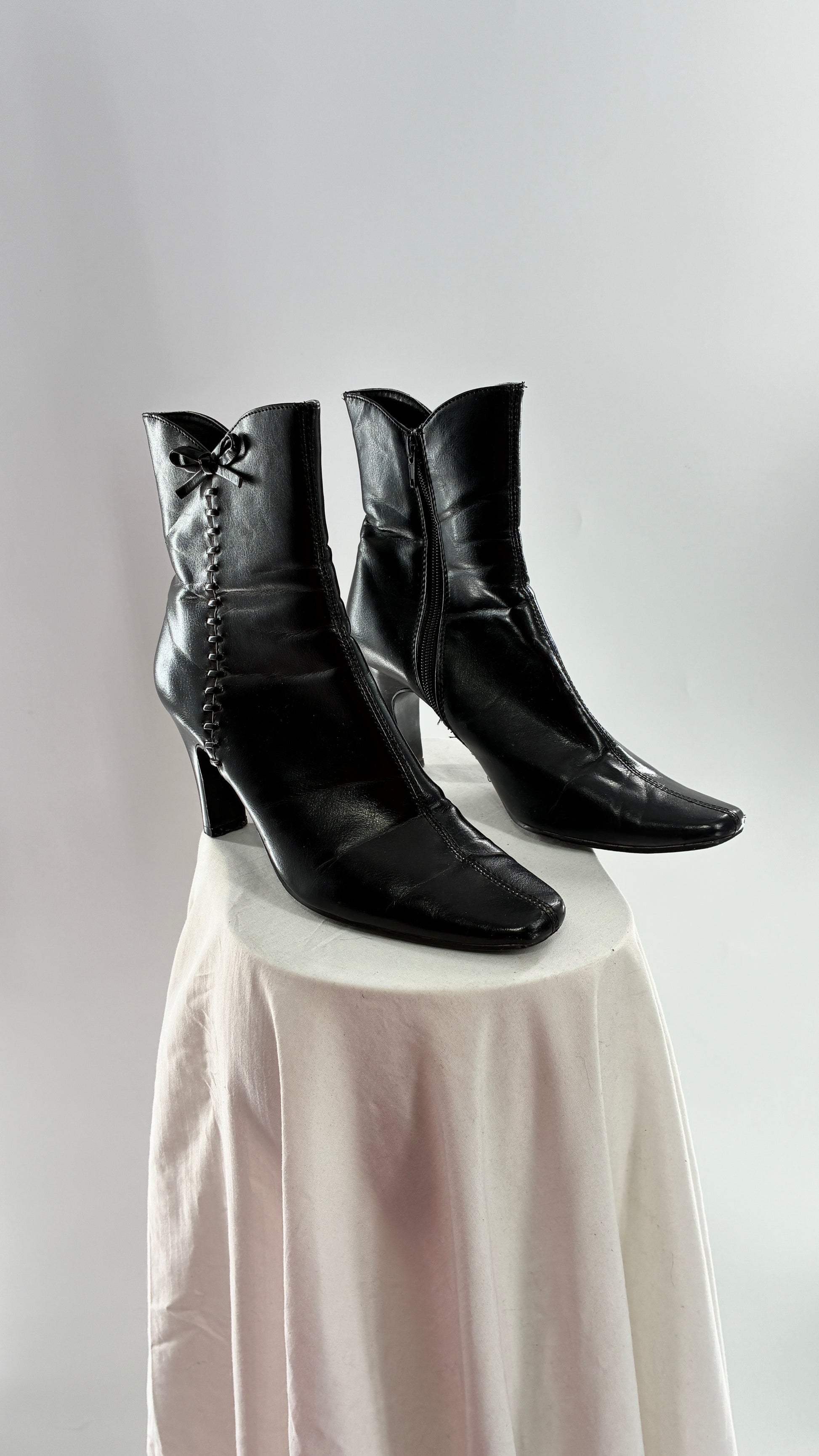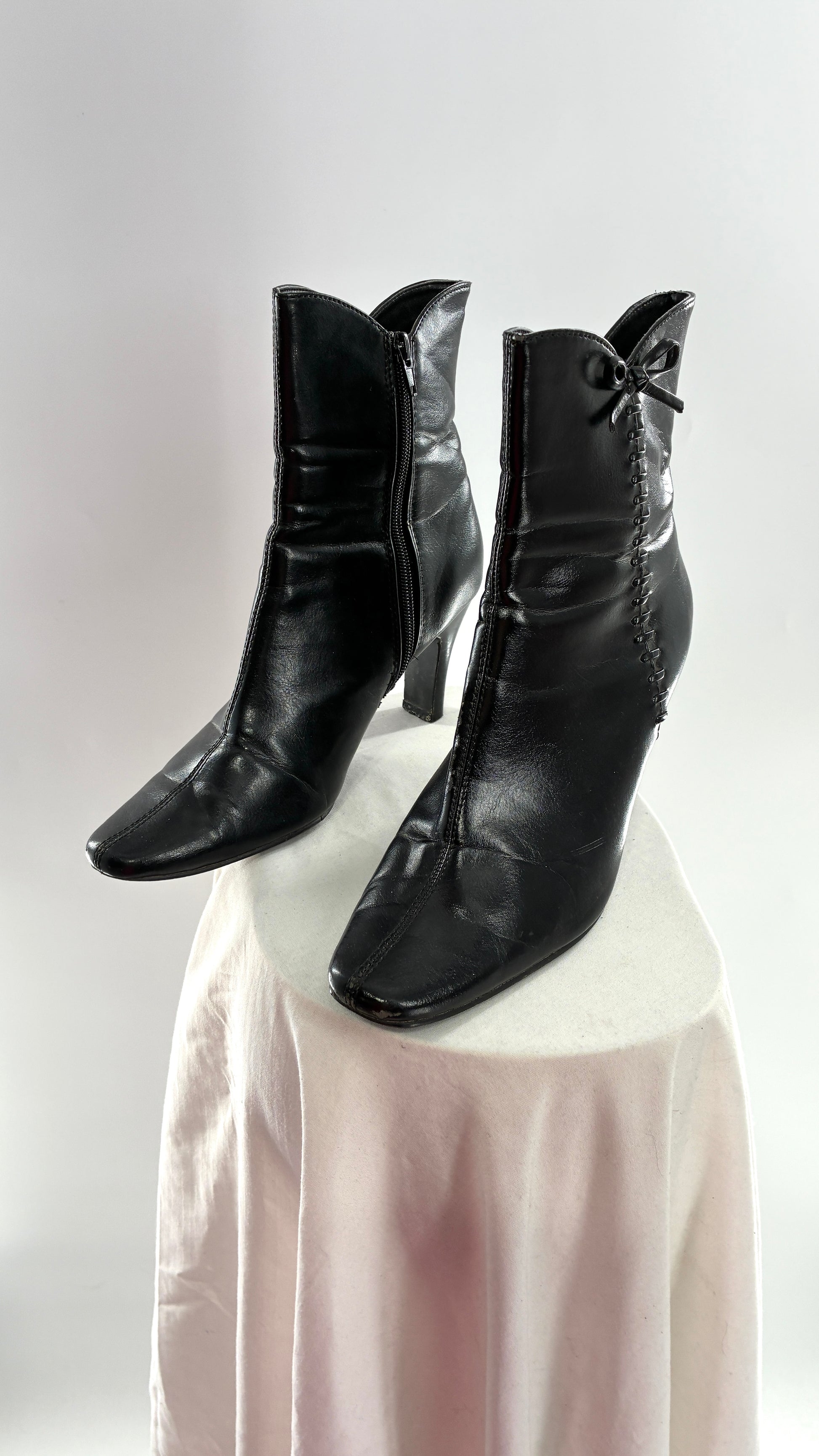 Vintage EXPRESSIONS Black Square Toe Kitten Heel Boots with Lace Up, Bow Side Details (8)