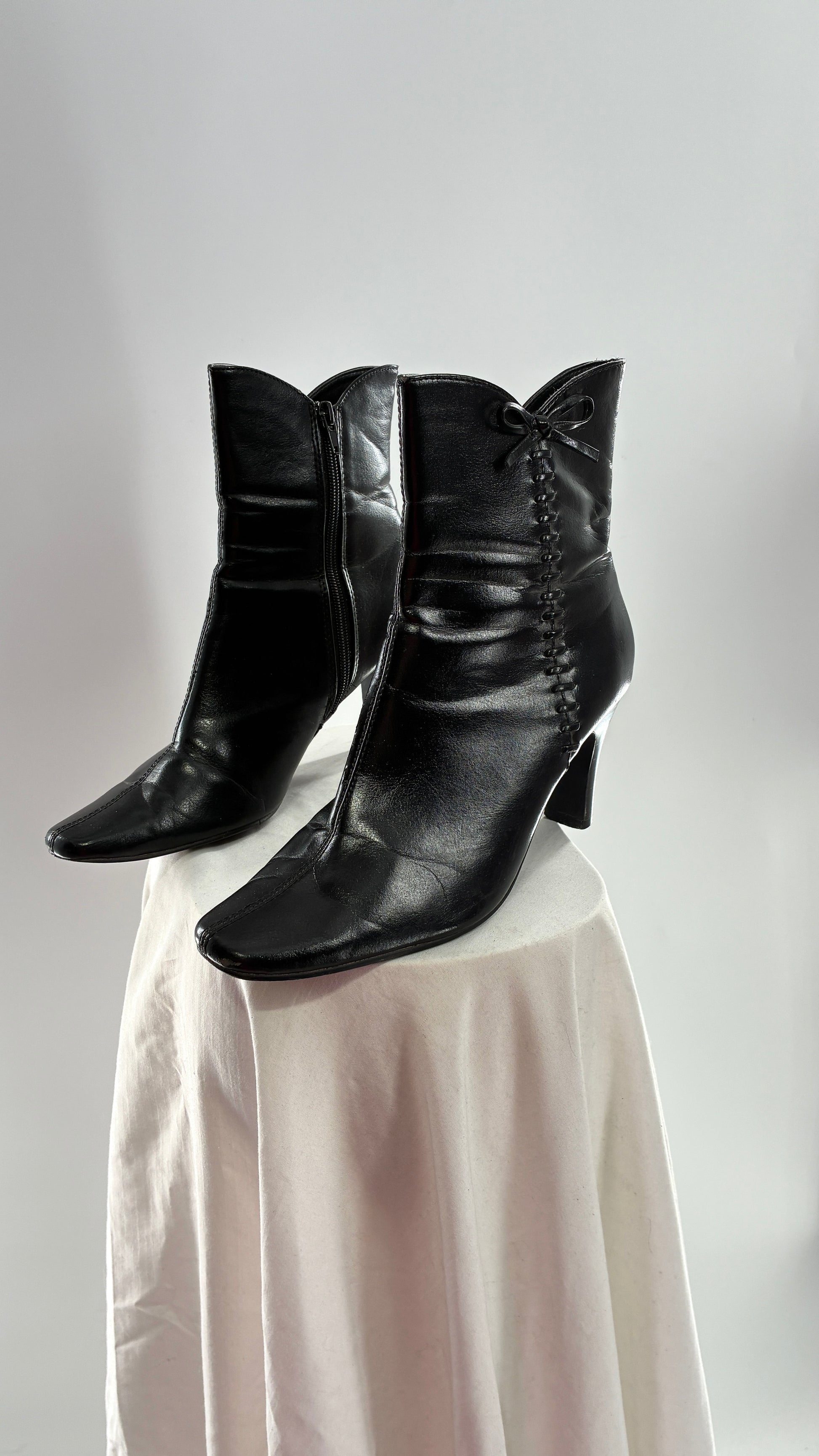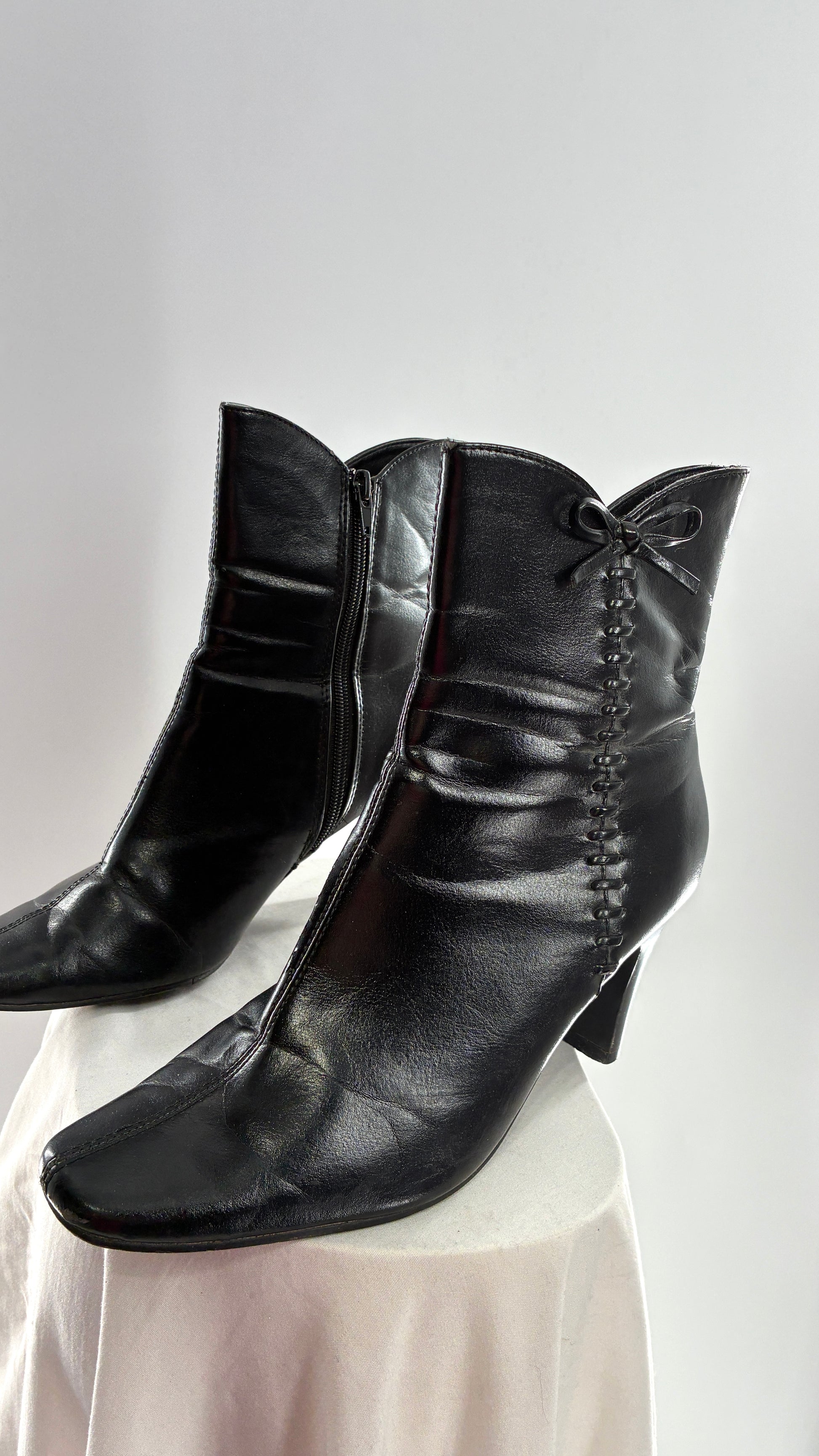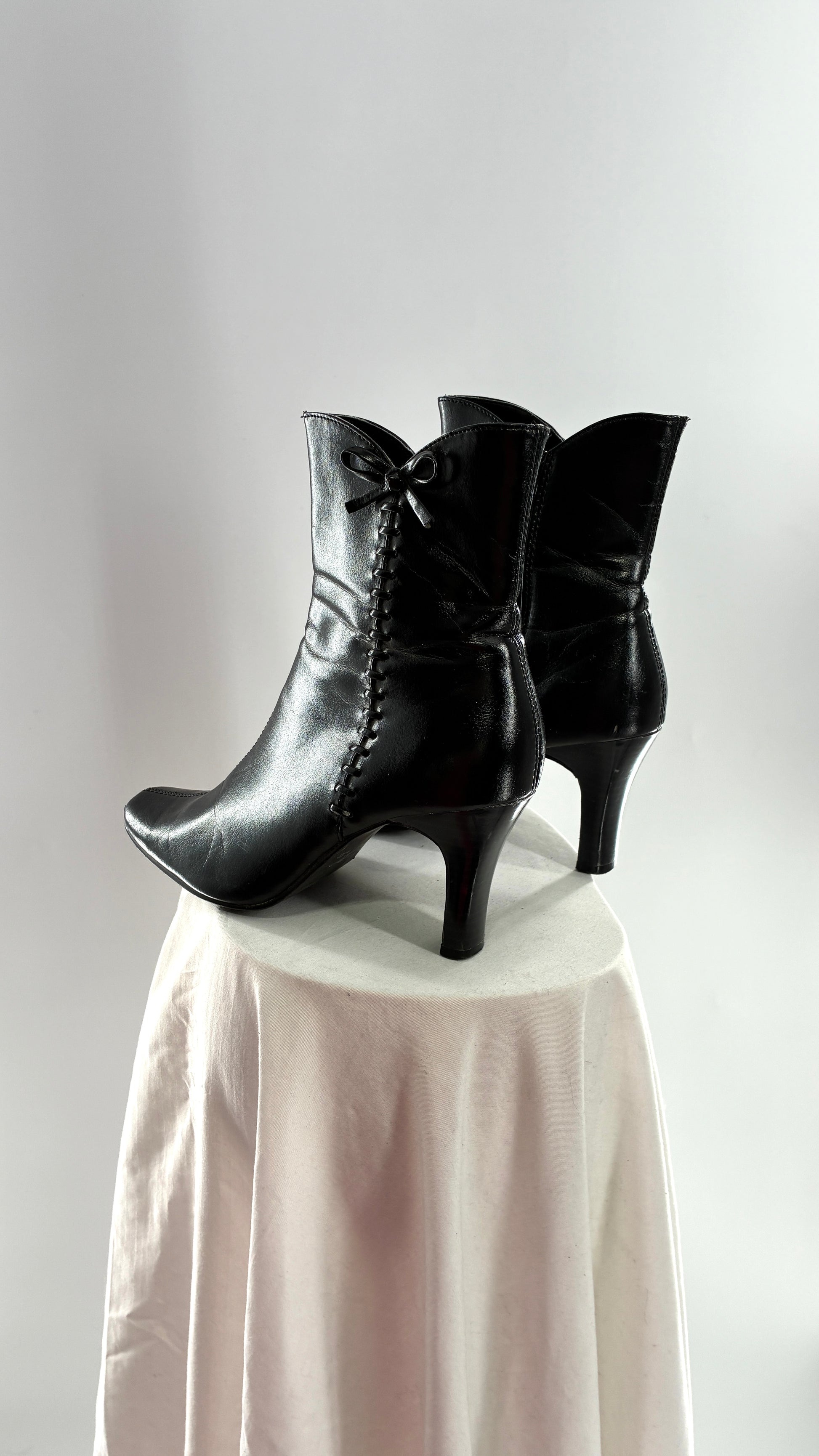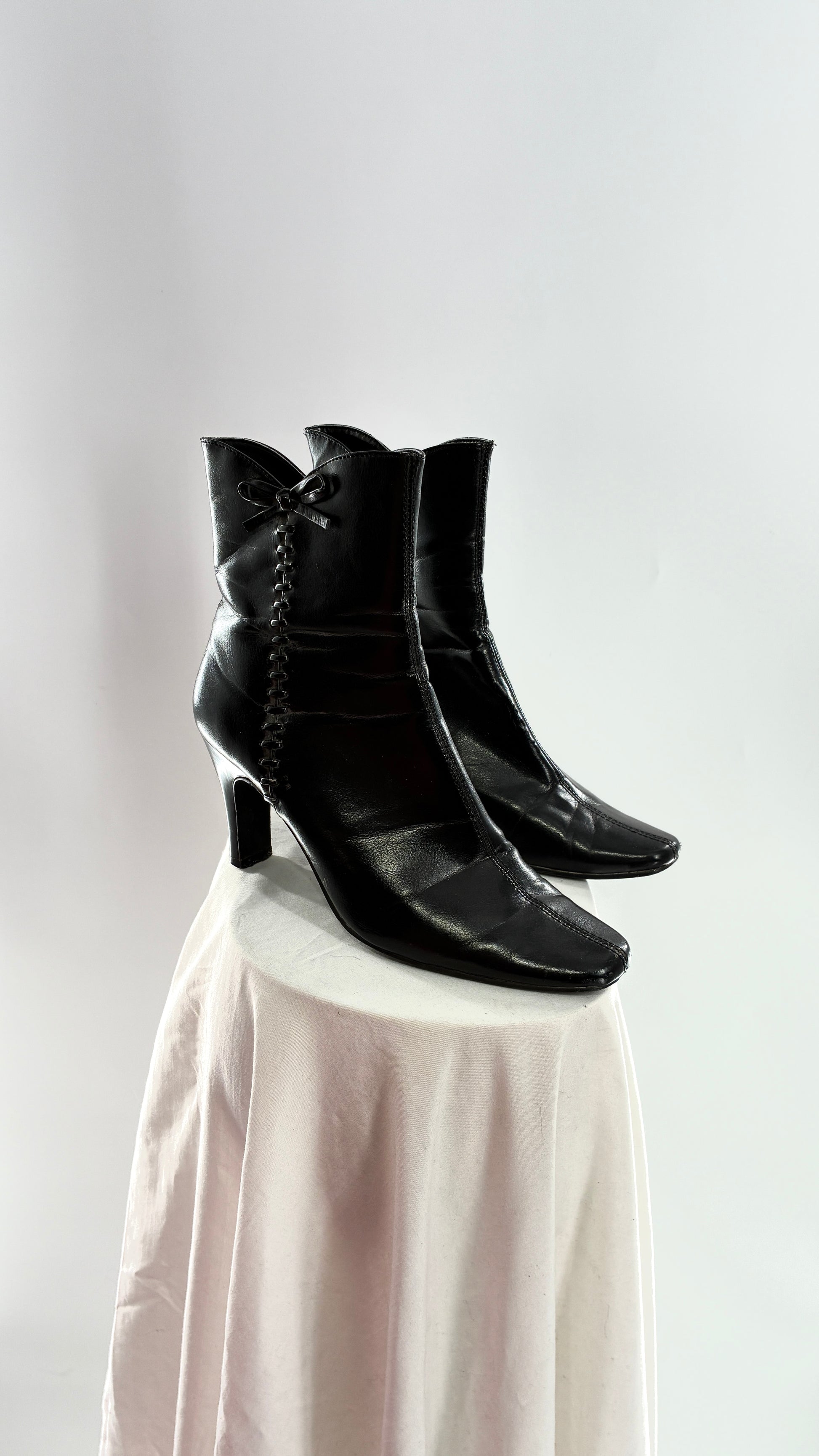 Vintage EXPRESSIONS Black Square Toe Kitten Heel Boots with Lace Up, Bow Side Details (8)