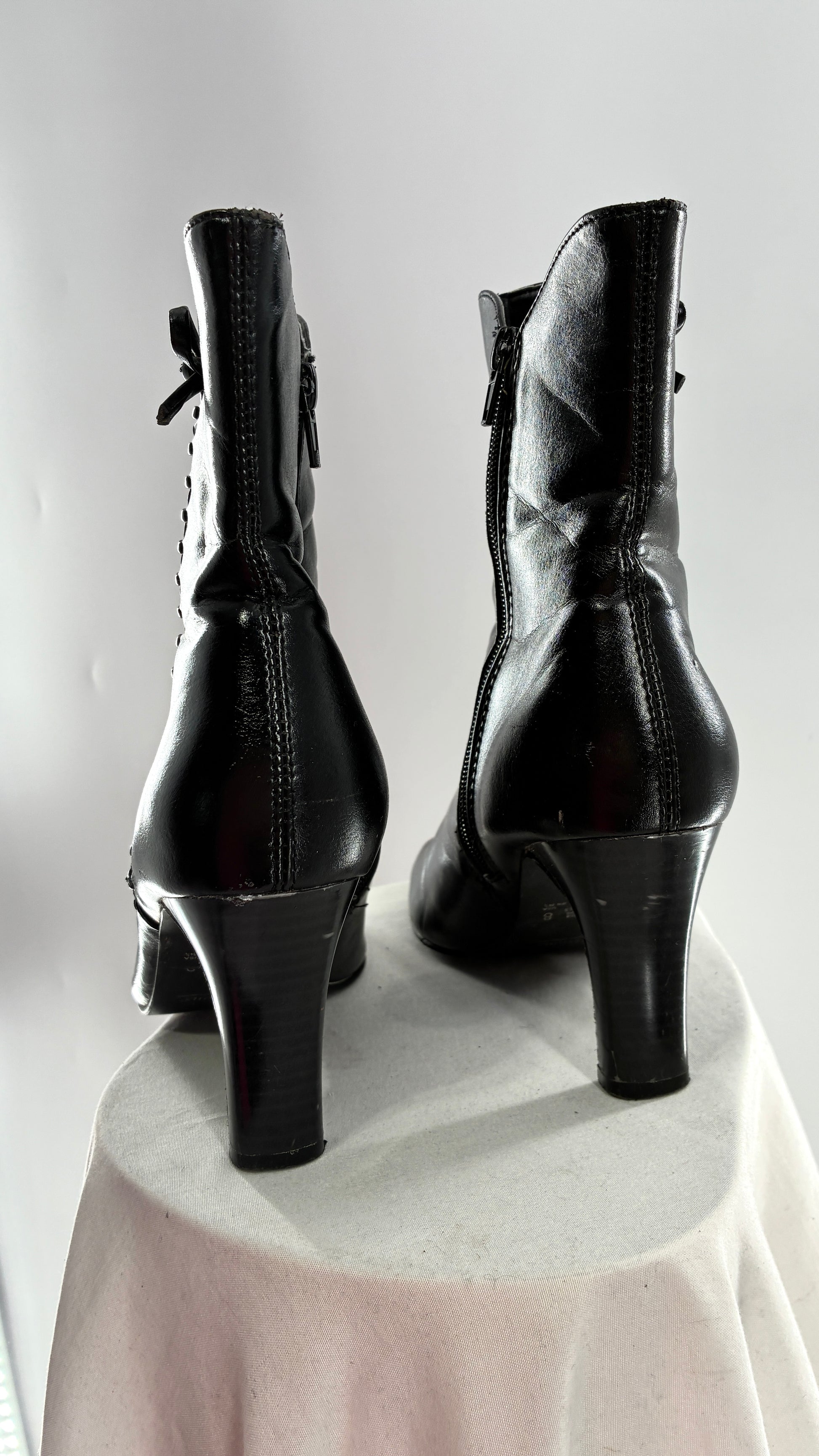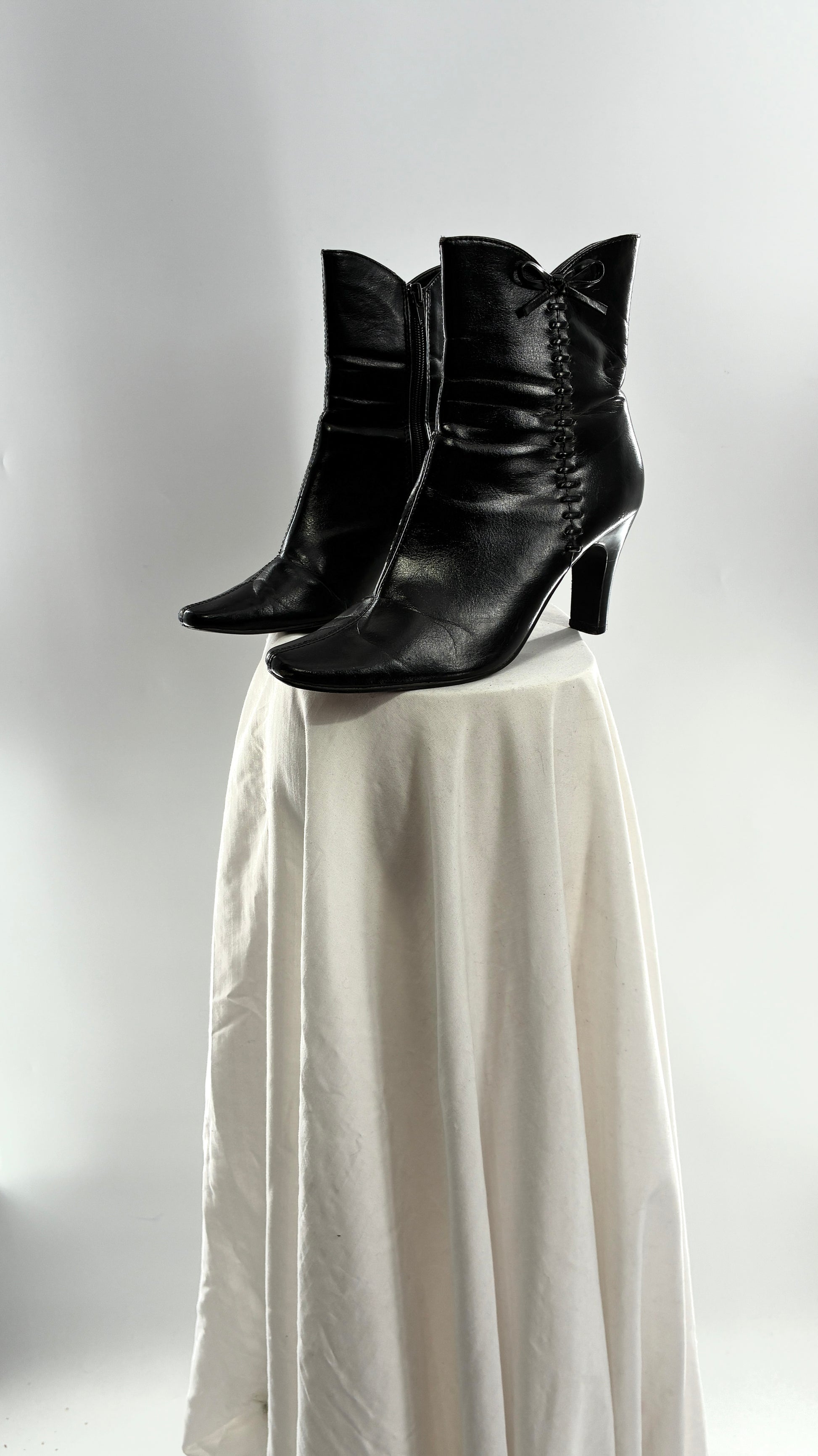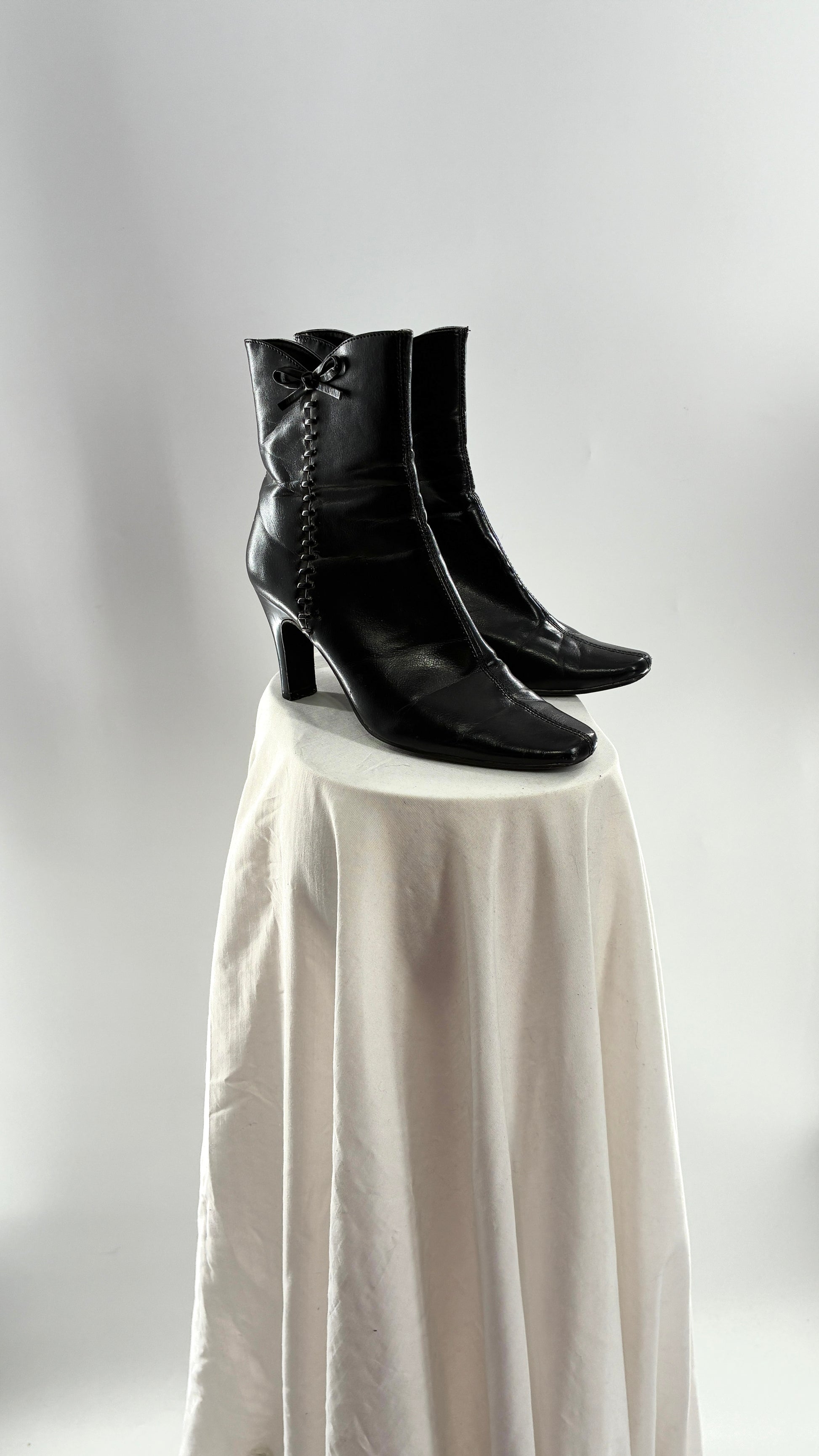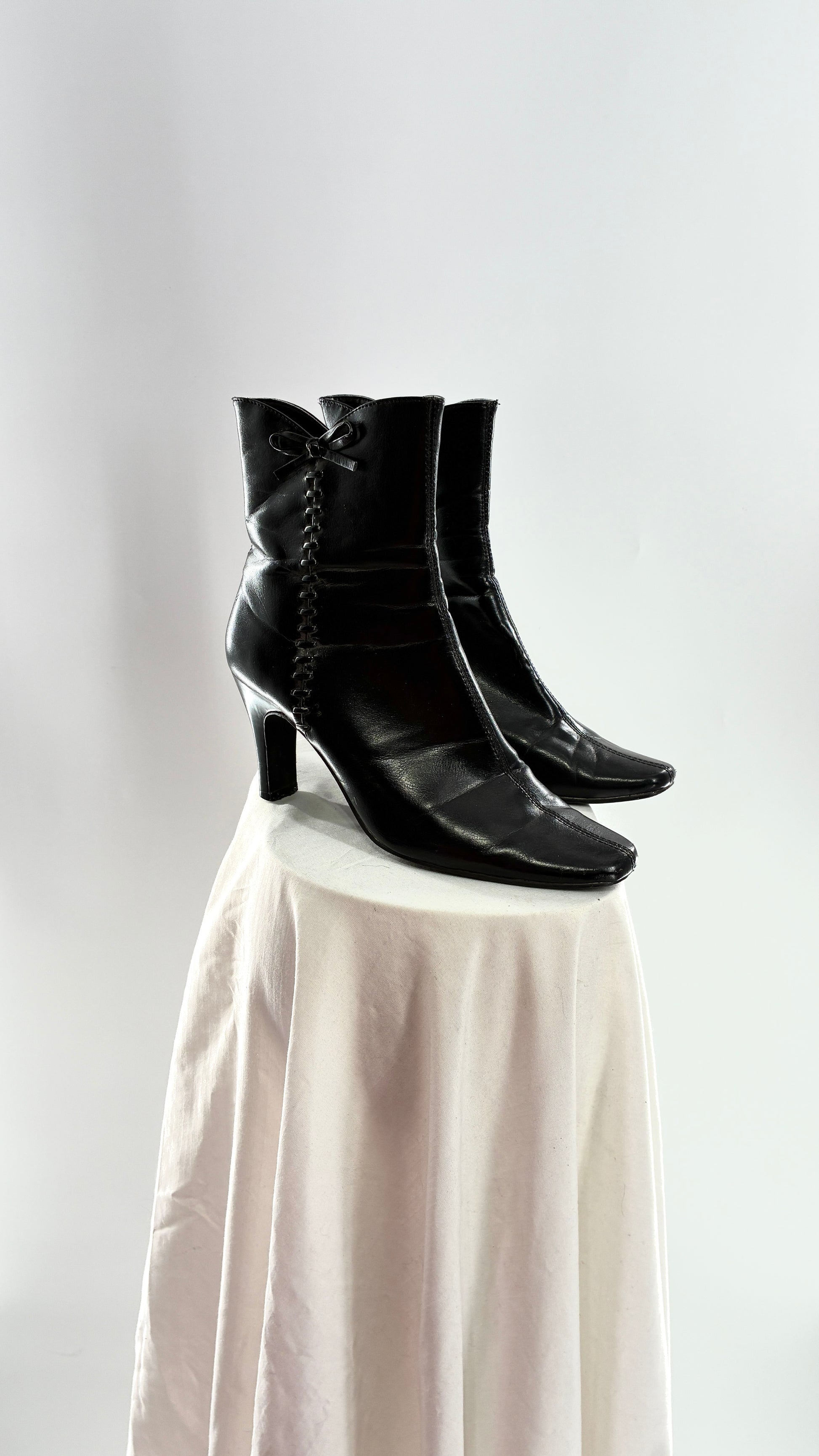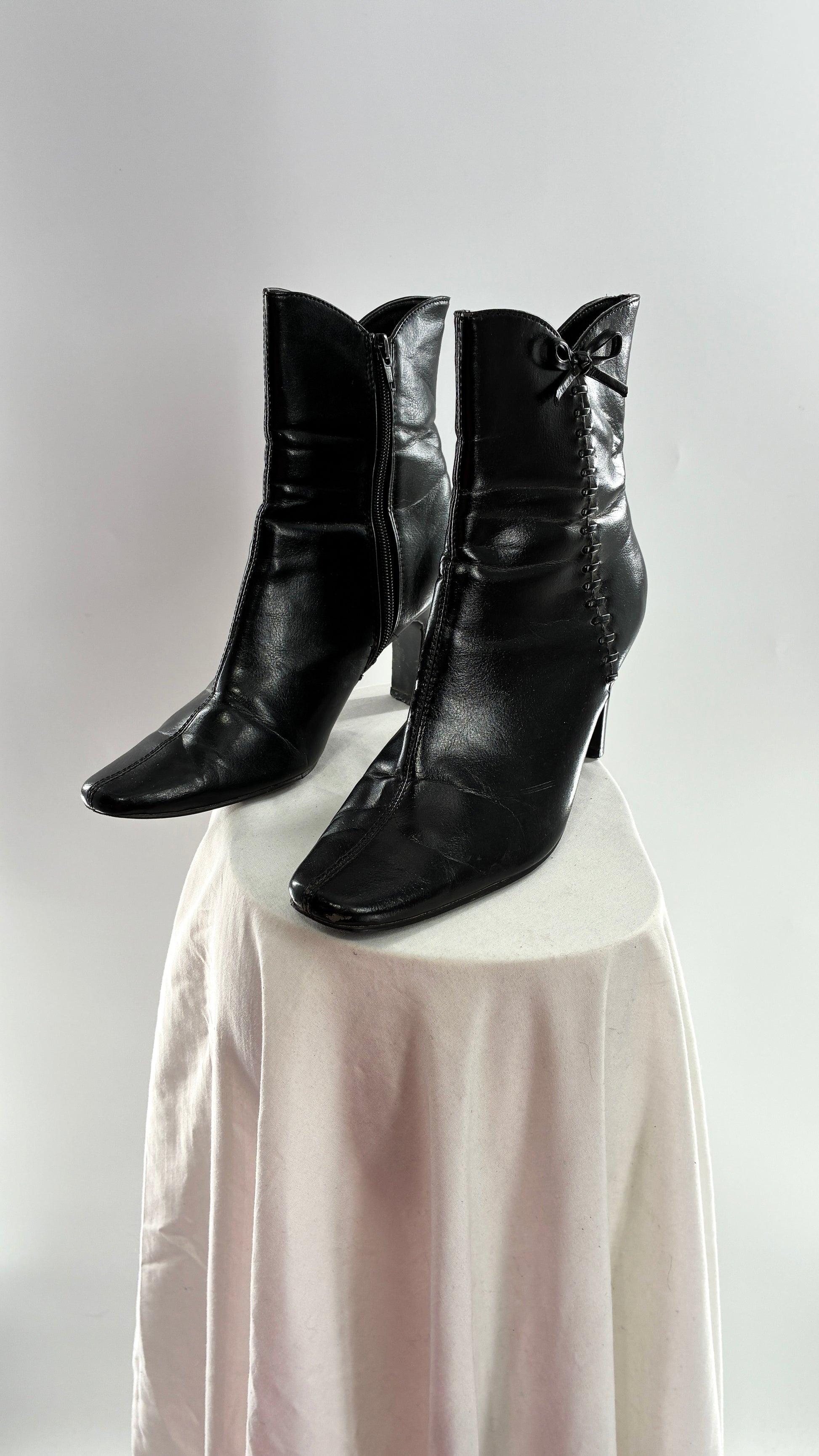 Vintage EXPRESSIONS Black Square Toe Kitten Heel Boots with Lace Up, Bow Side Details (8)