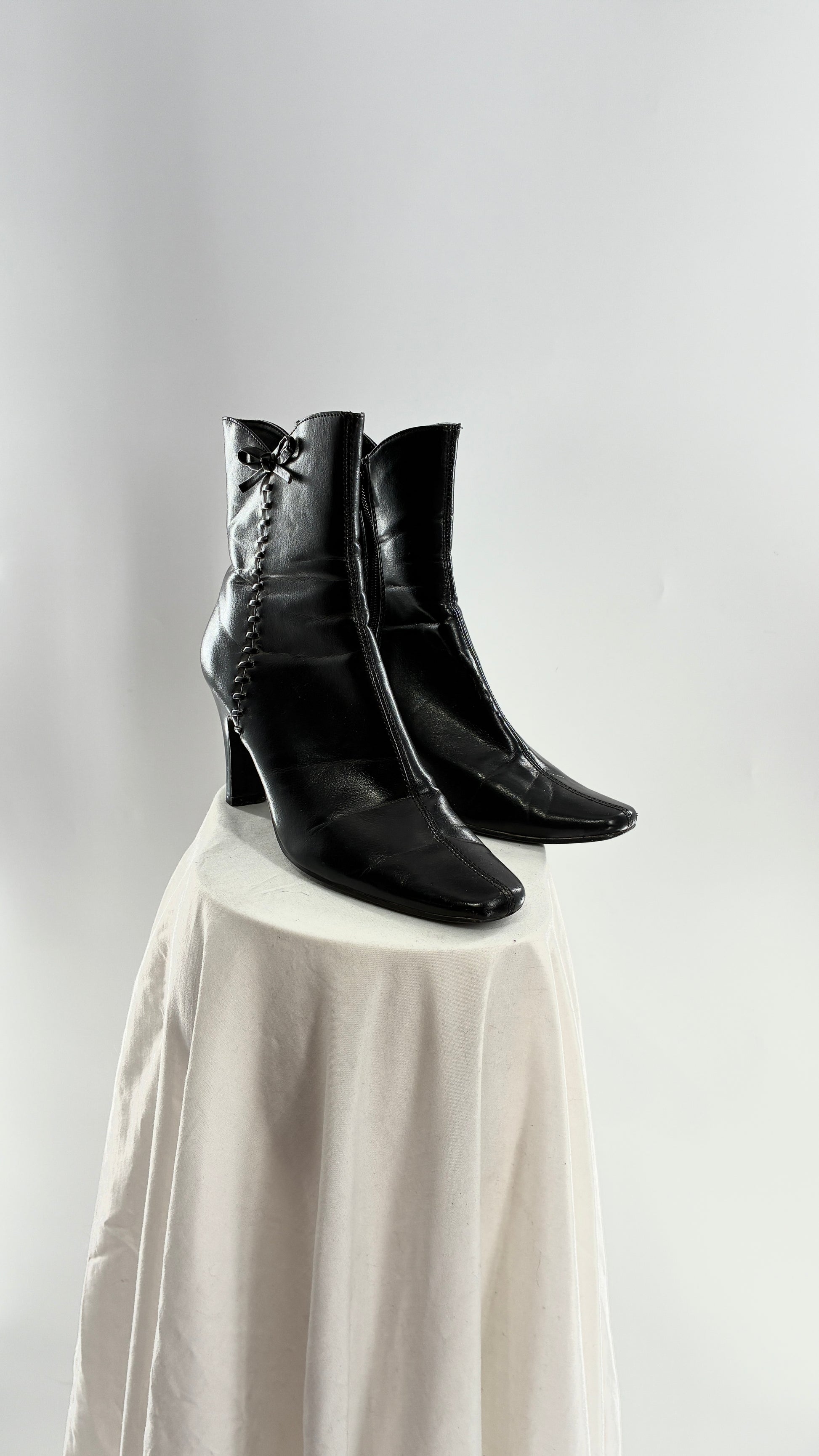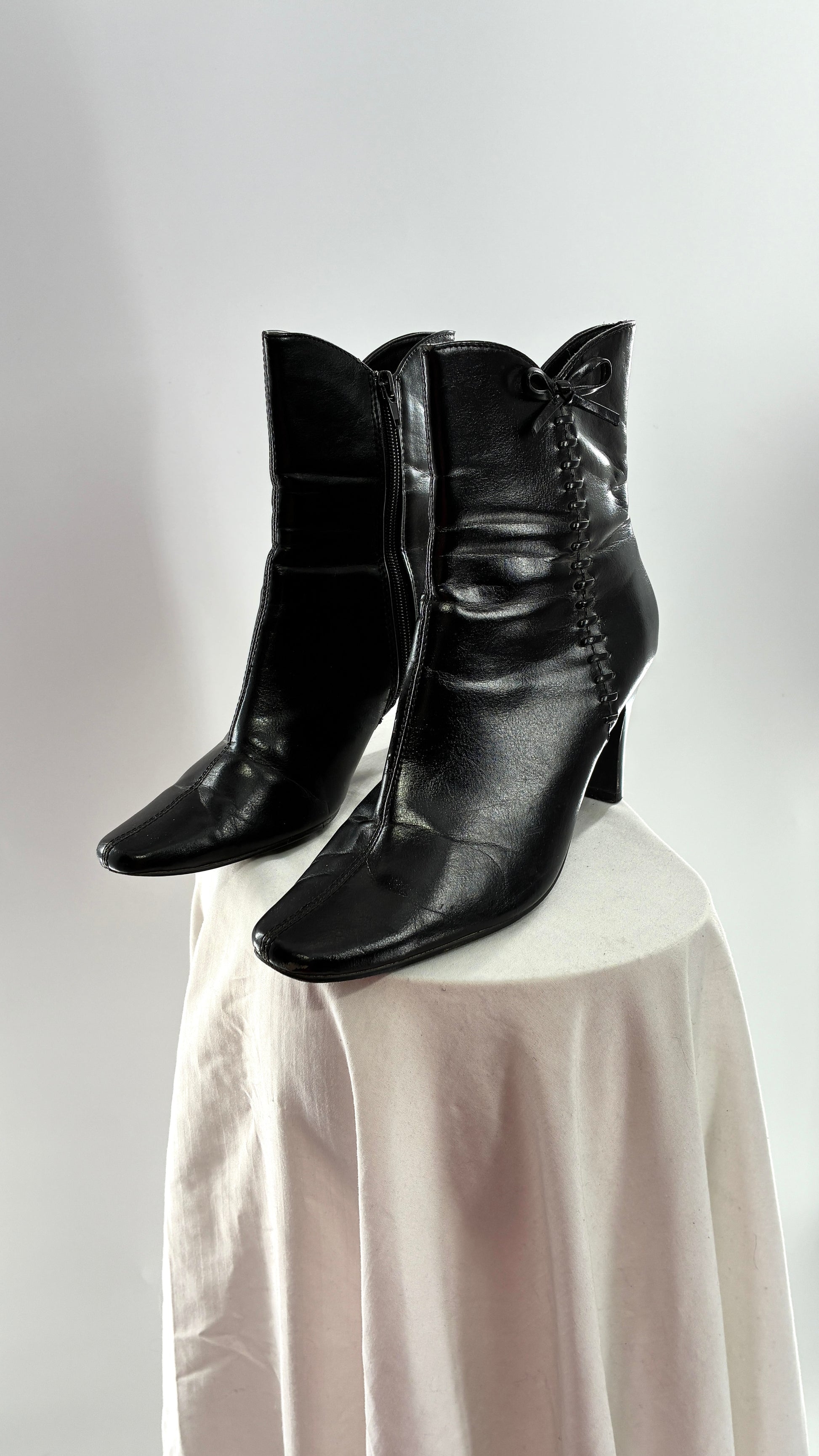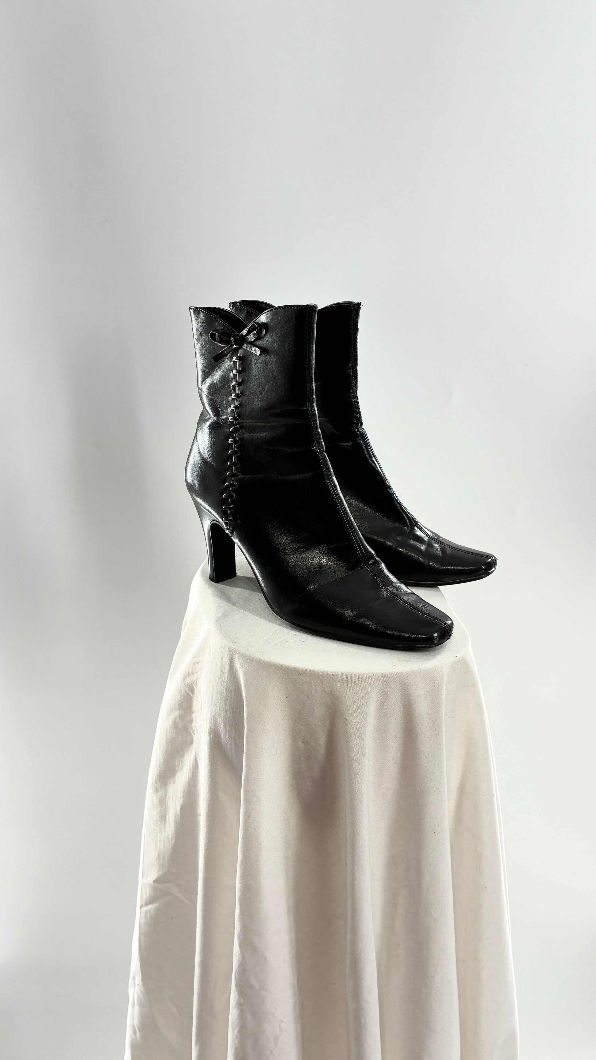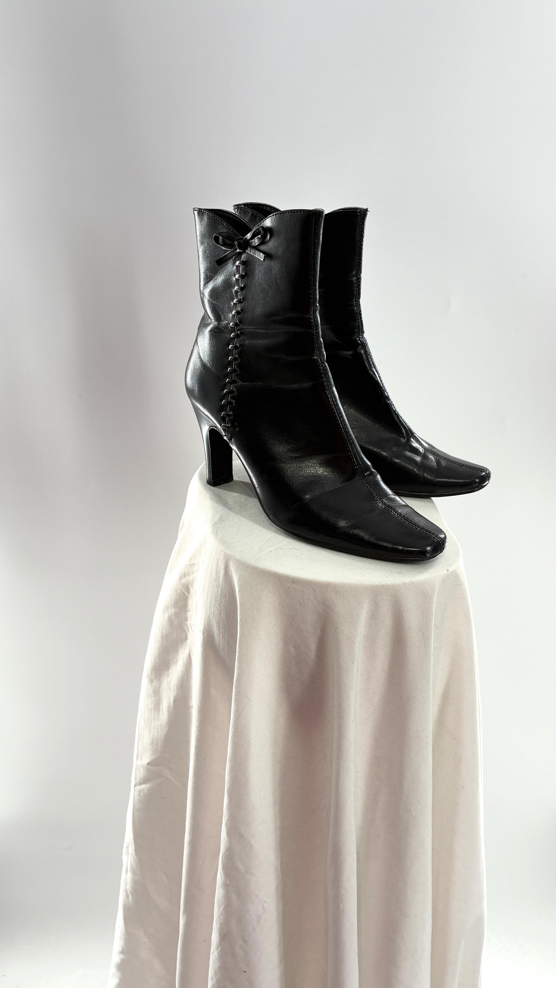 Vintage EXPRESSIONS Black Square Toe Kitten Heel Boots with Lace Up, Bow Side Details (8)