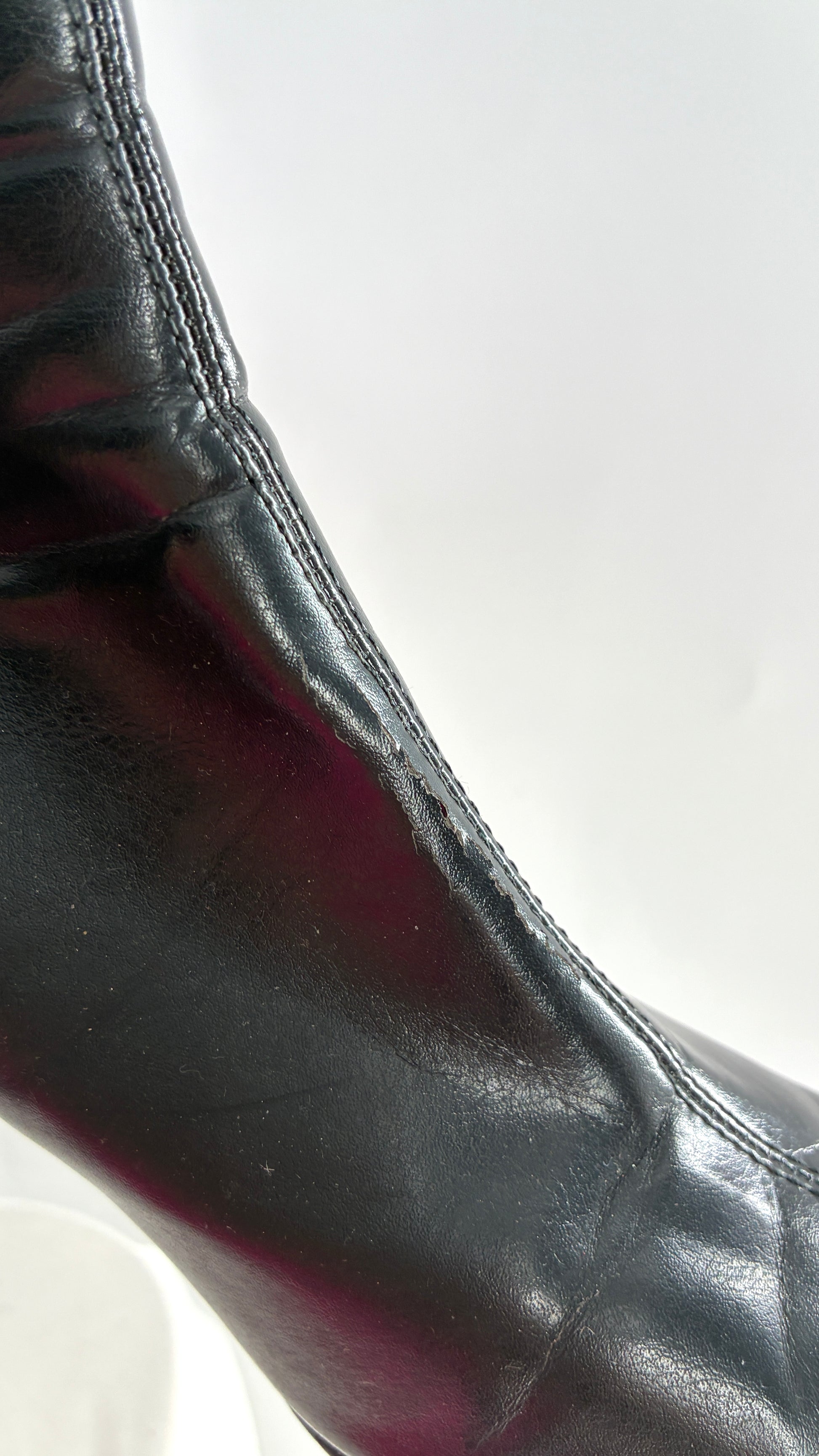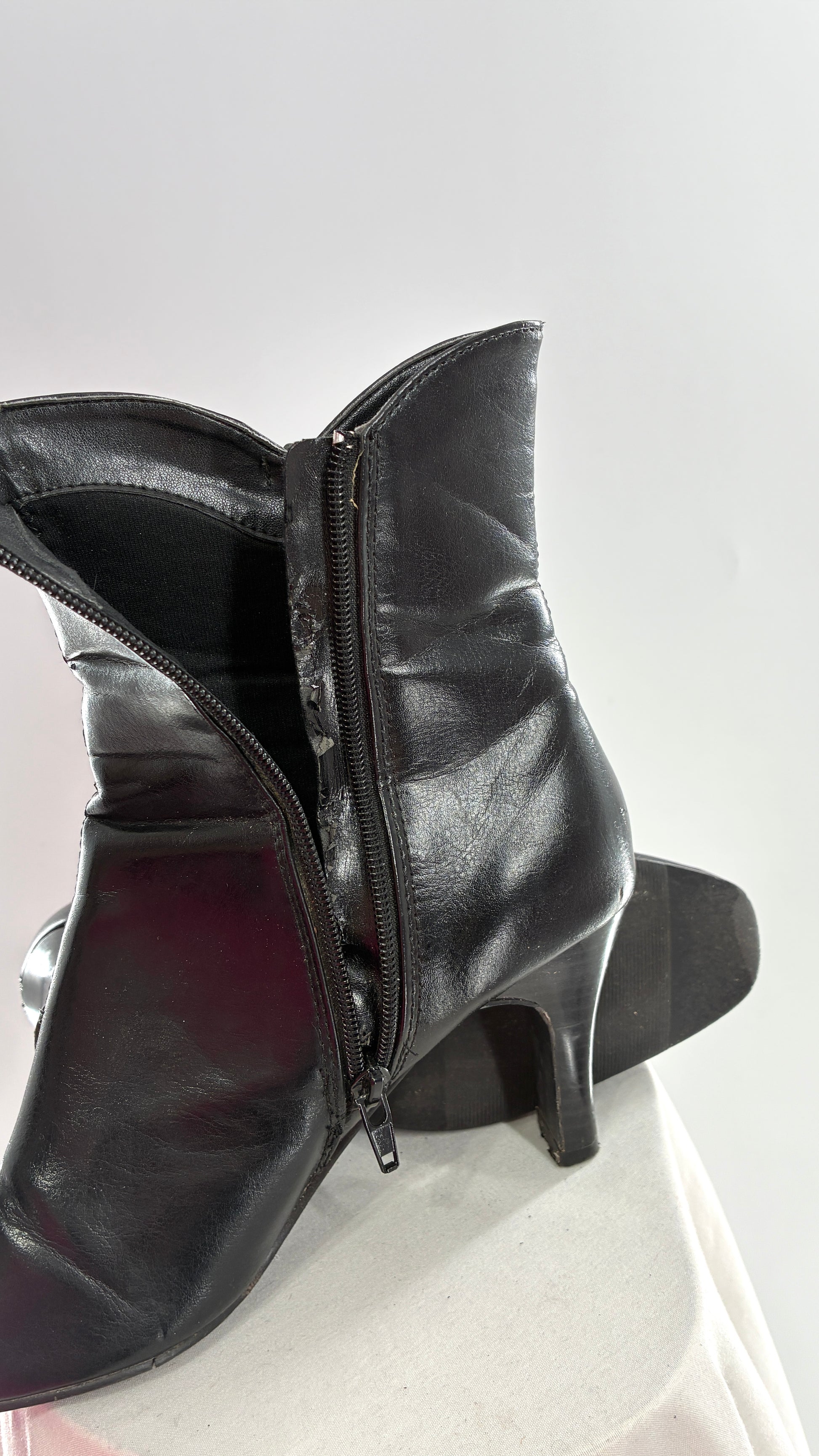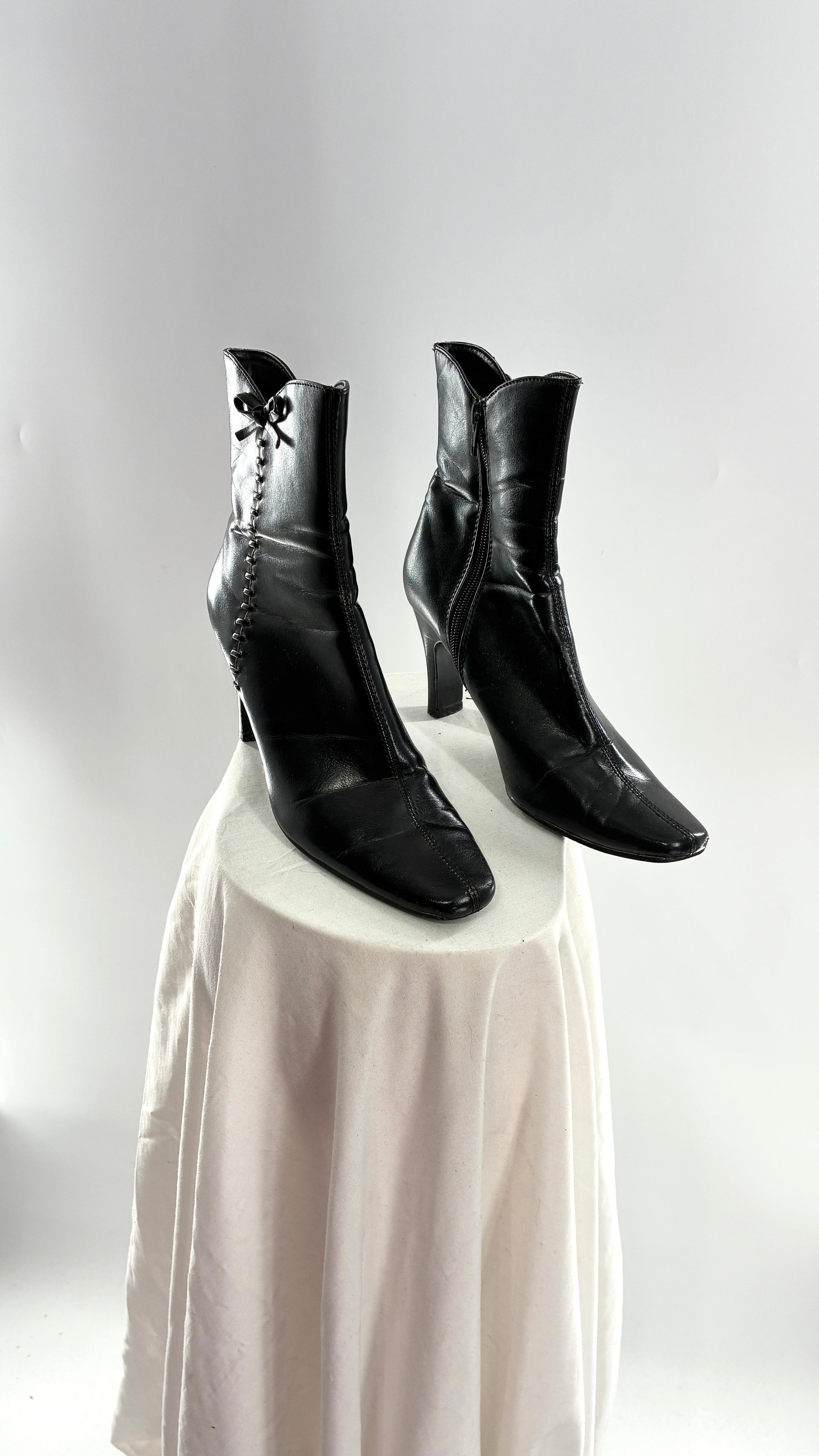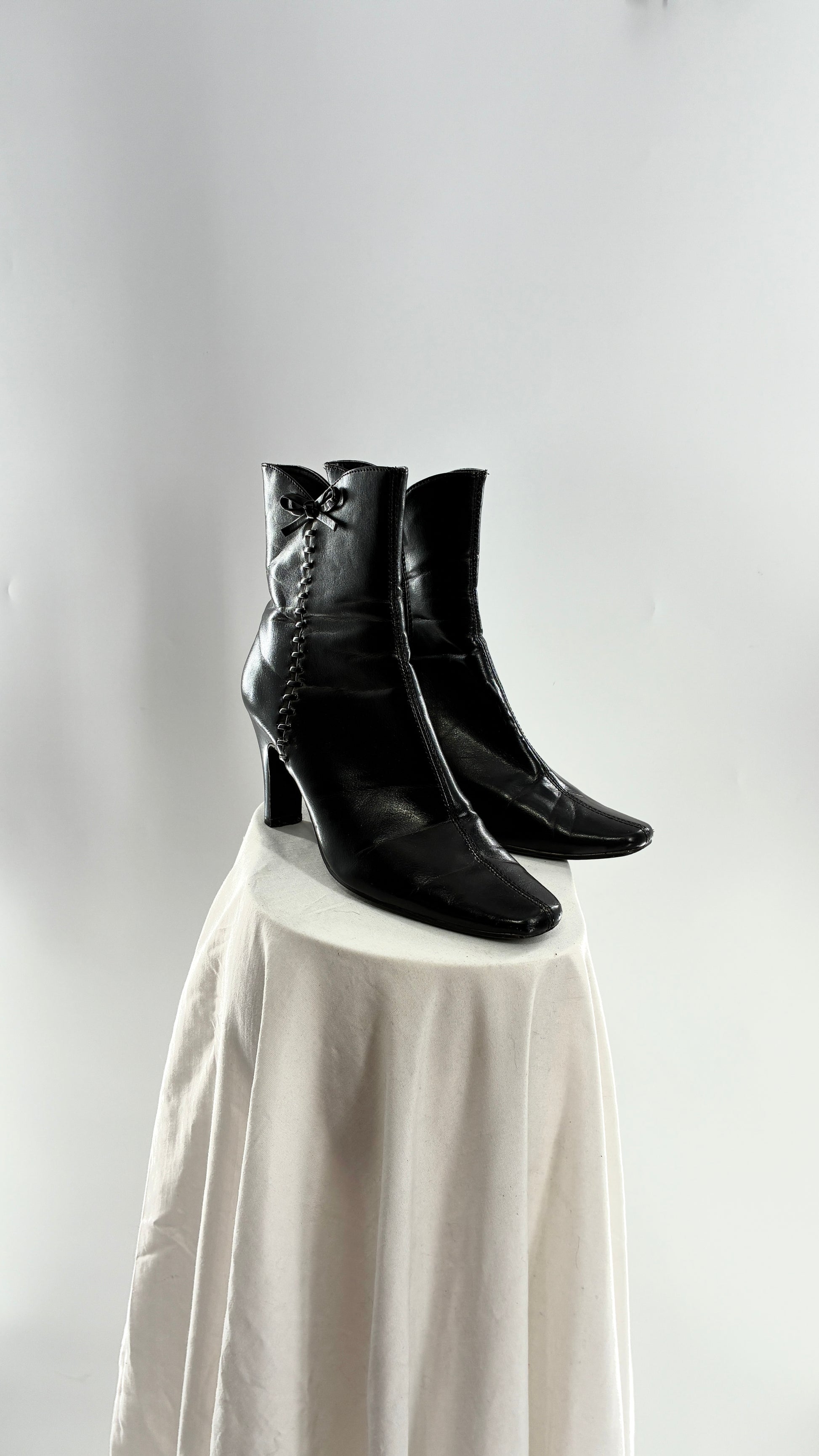 Vintage EXPRESSIONS Black Square Toe Kitten Heel Boots with Lace Up, Bow Side Details (8)