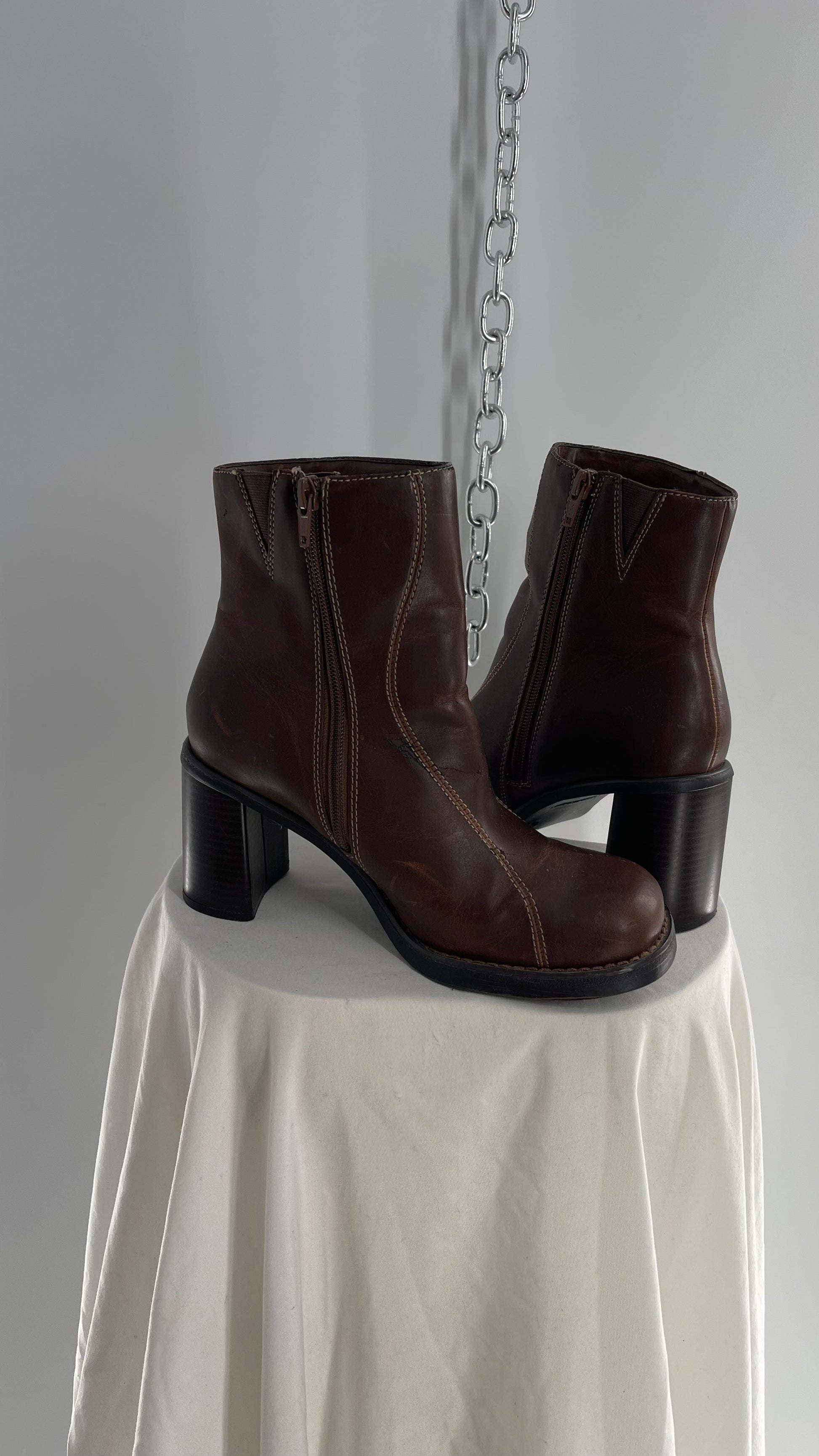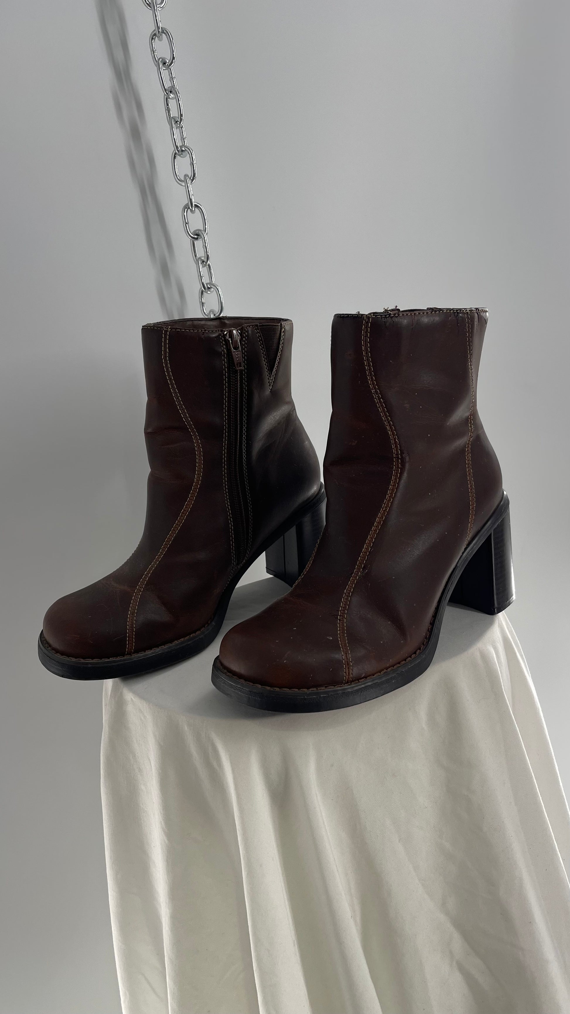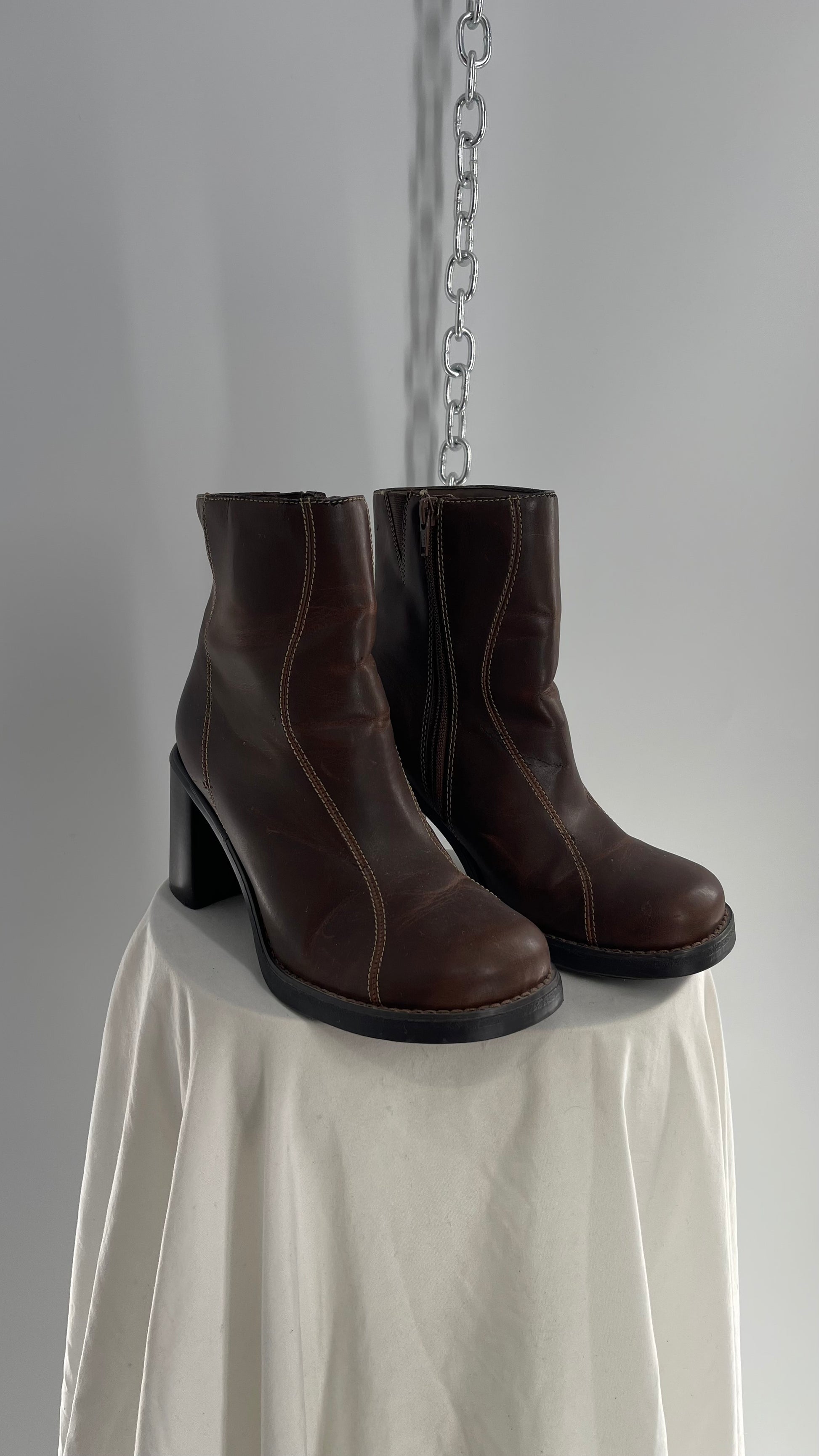 Vintage Lower East Side Brown Leather Wavy Stitch Round Toe Booties with Chunky Heel (8.5)