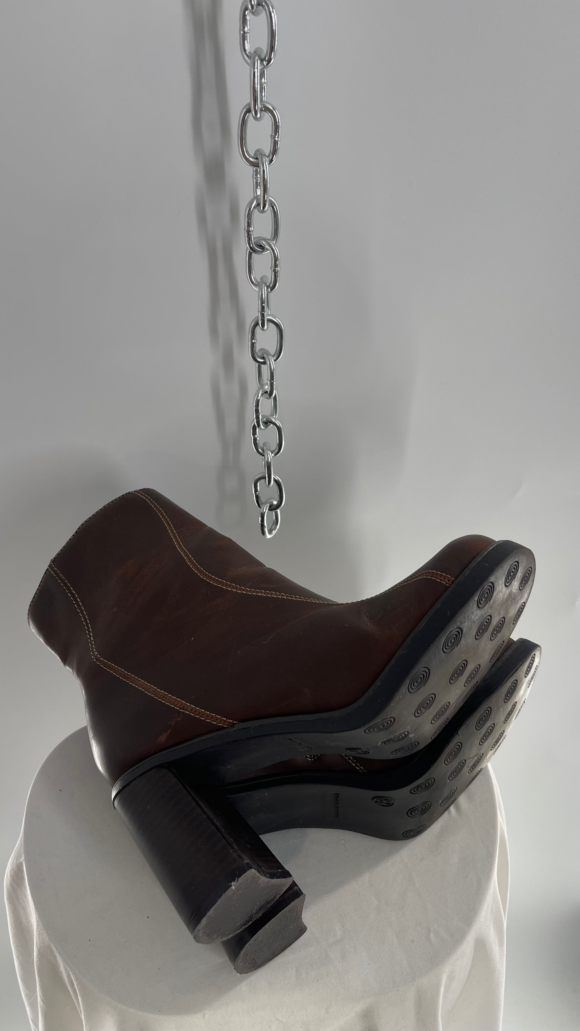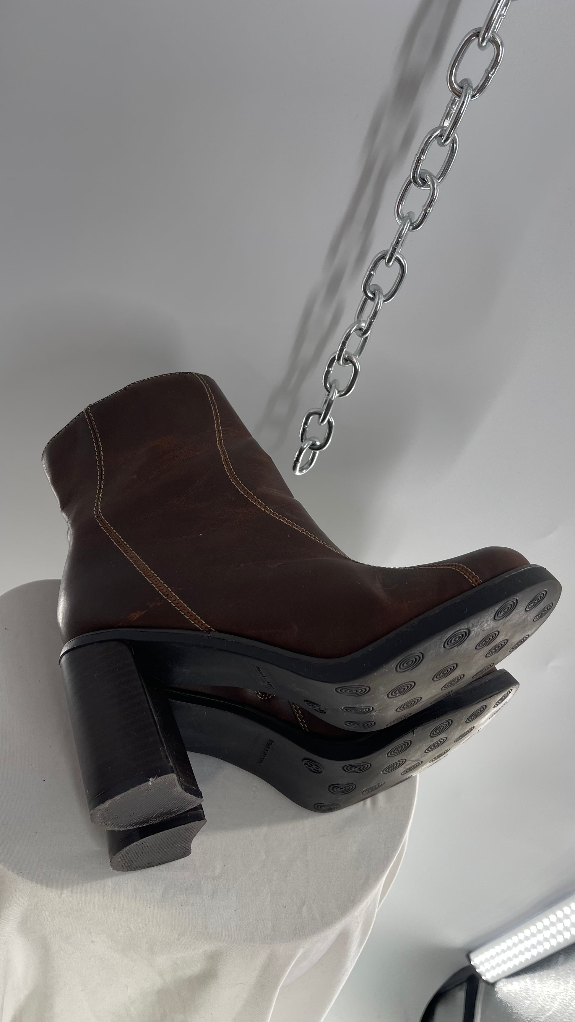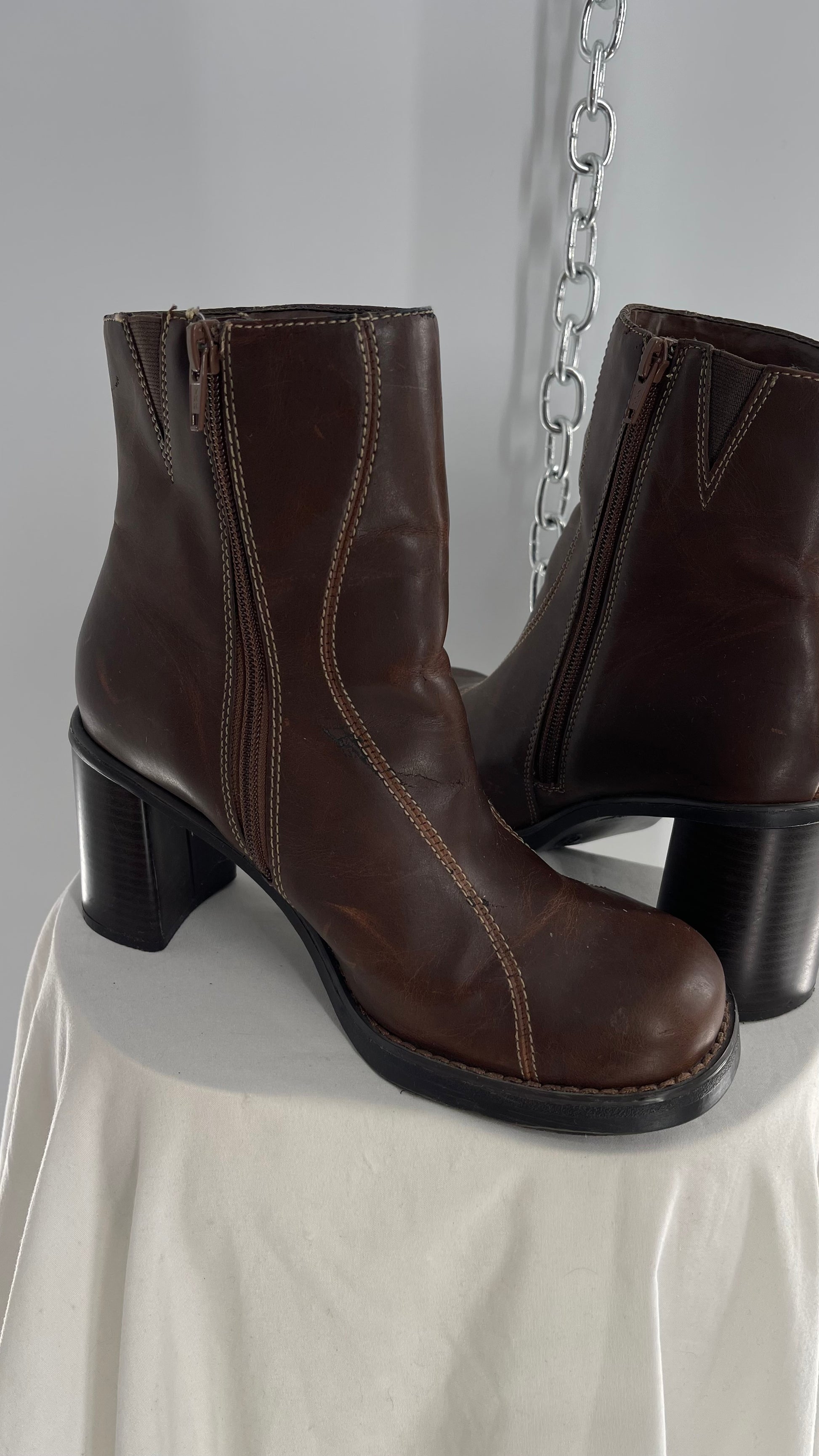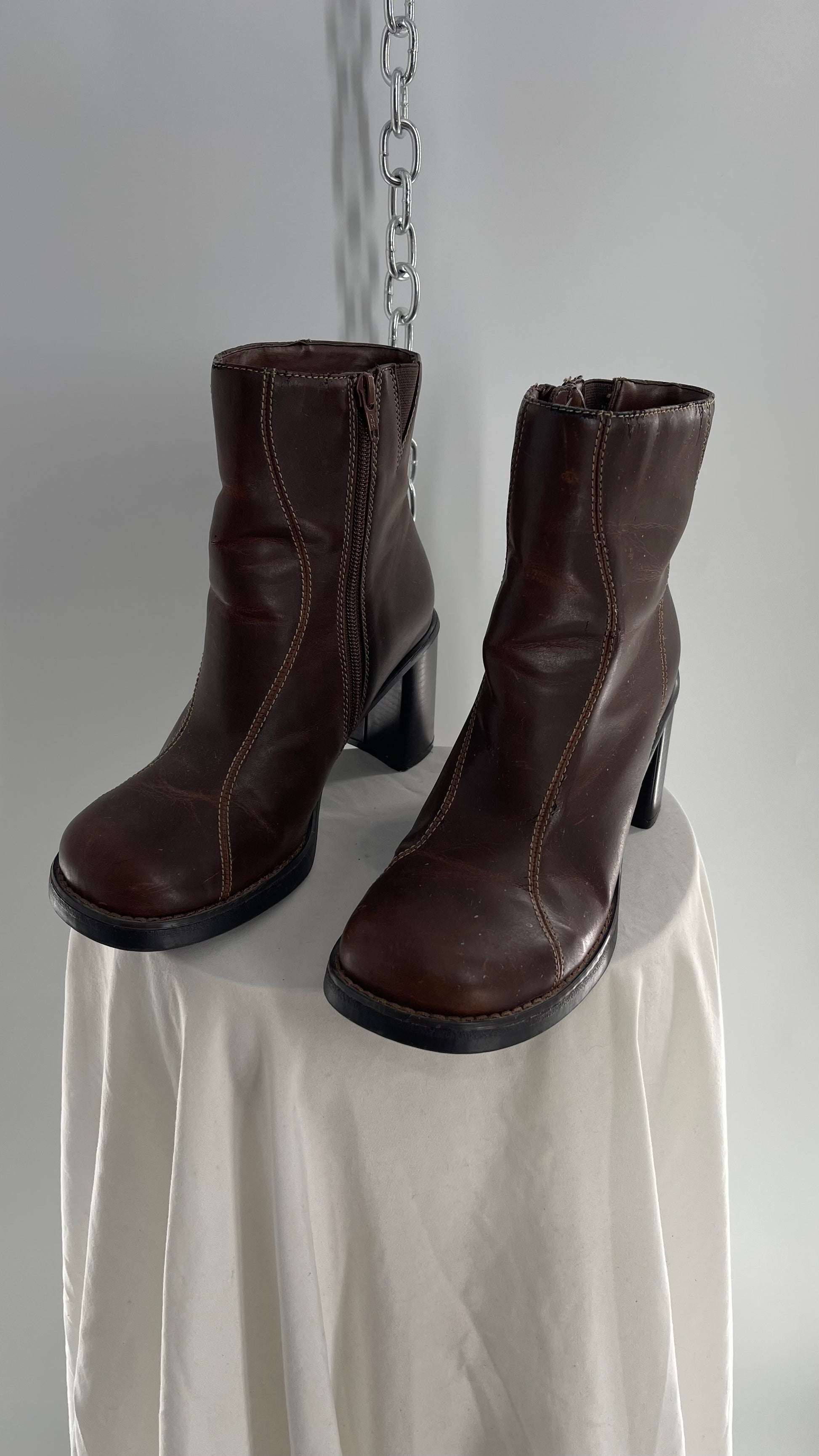 Vintage Lower East Side Brown Leather Wavy Stitch Round Toe Booties with Chunky Heel (8.5)