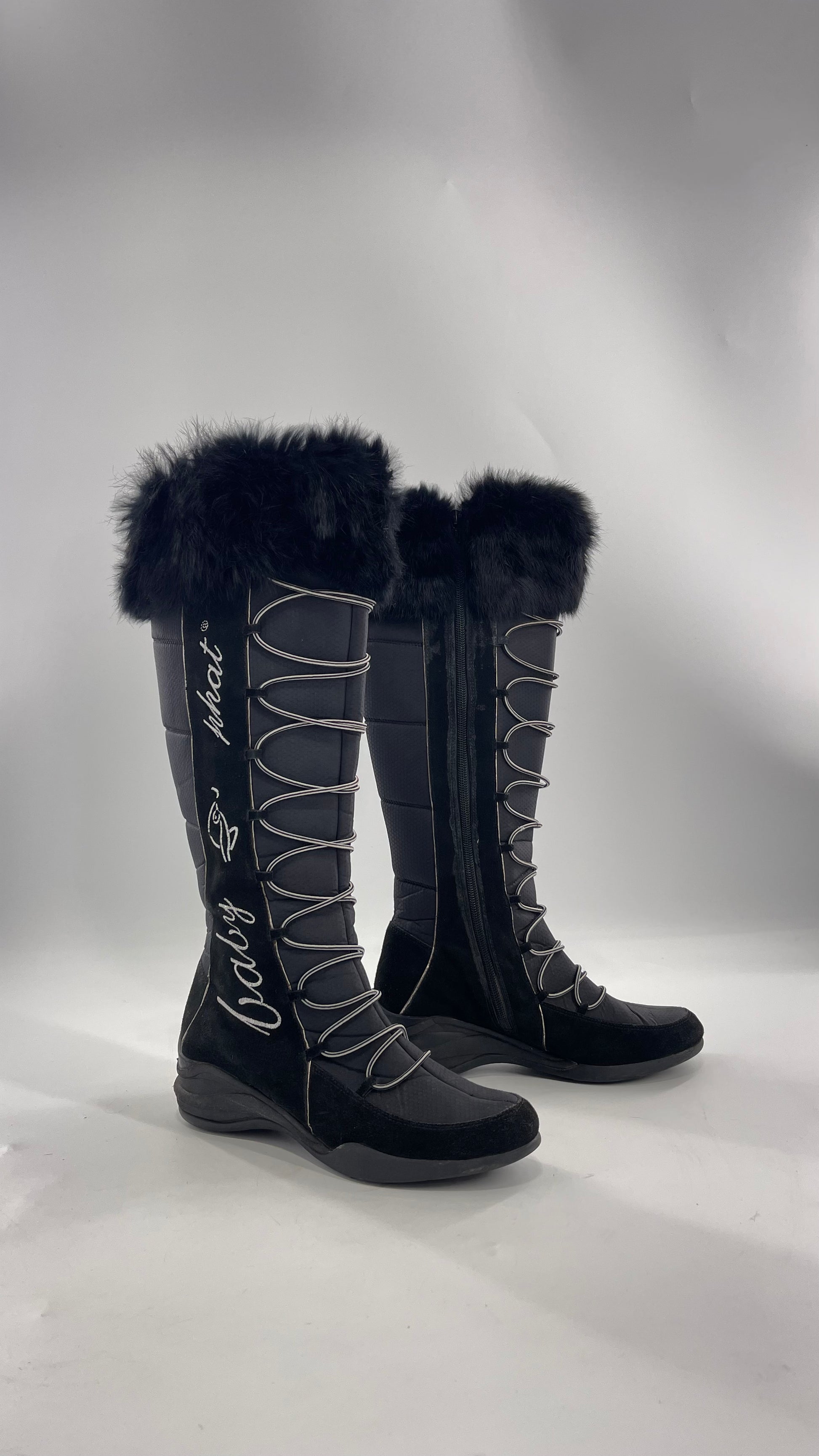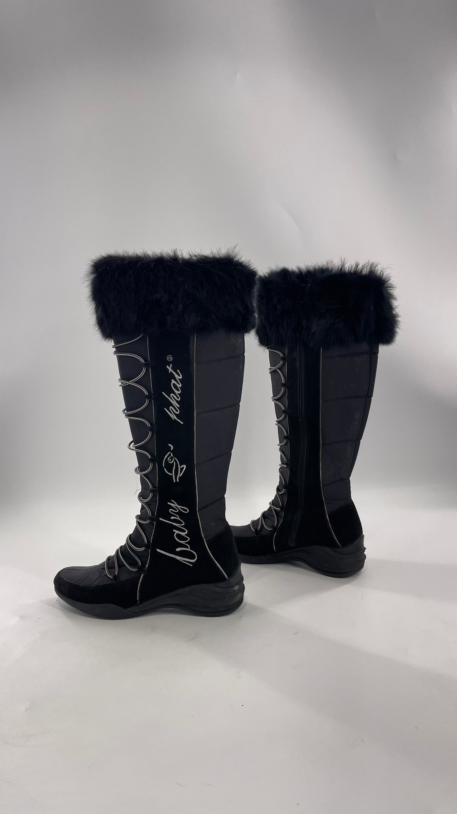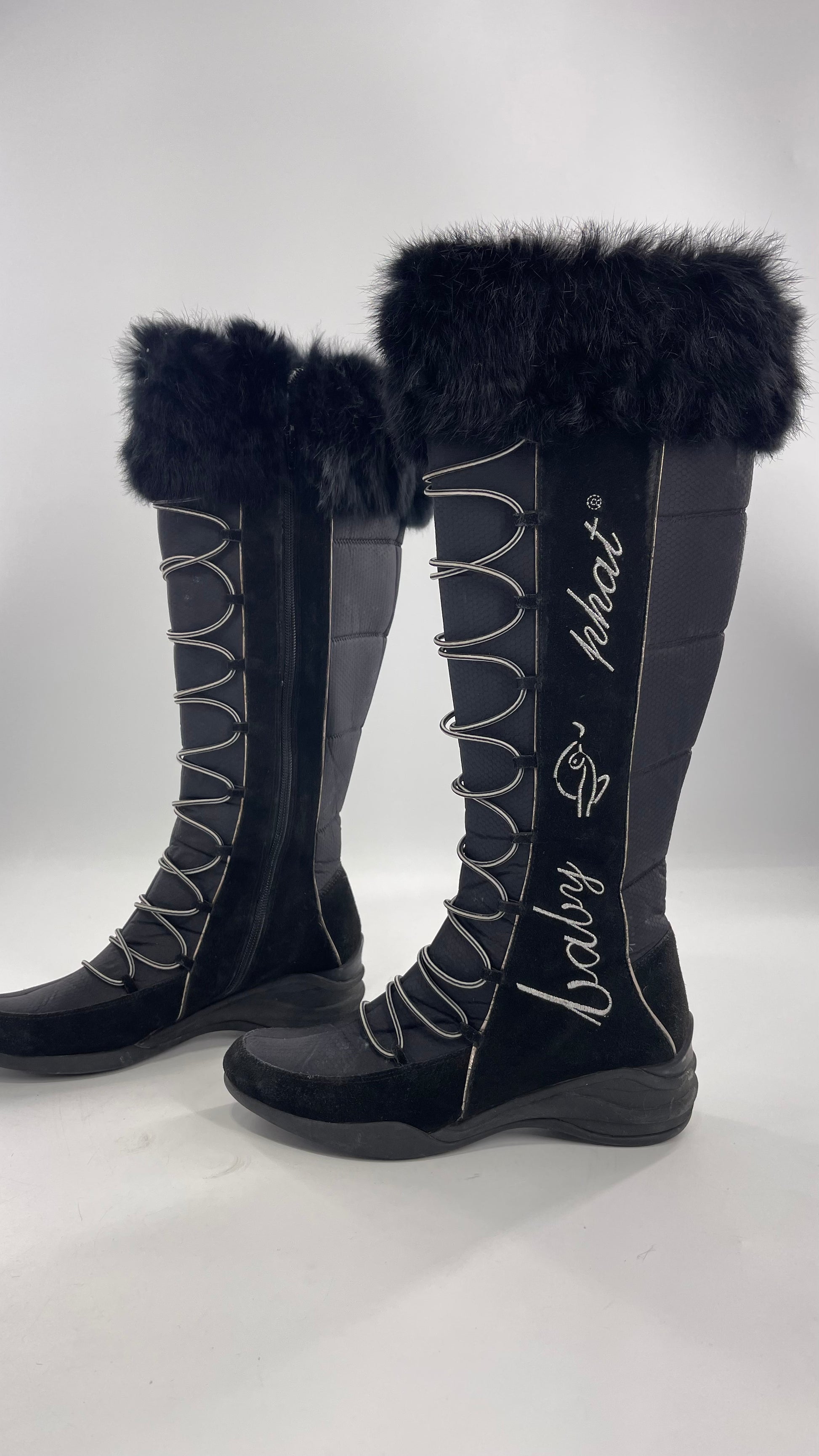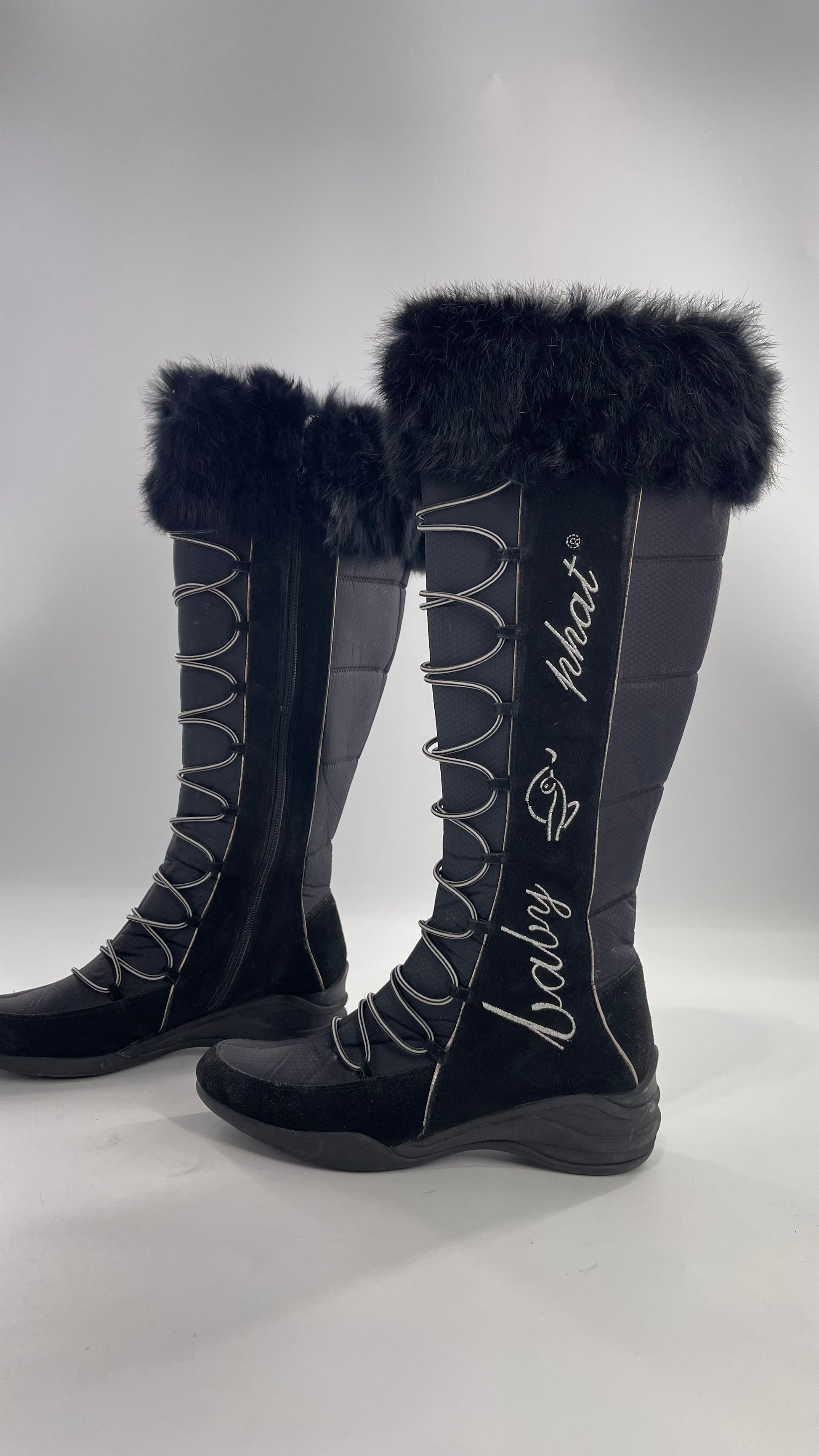 Baby Phat Black Knee High Boots with Rabbit Fur Trim, Bungee Cord Ties, and Embroidered Logo Design |
