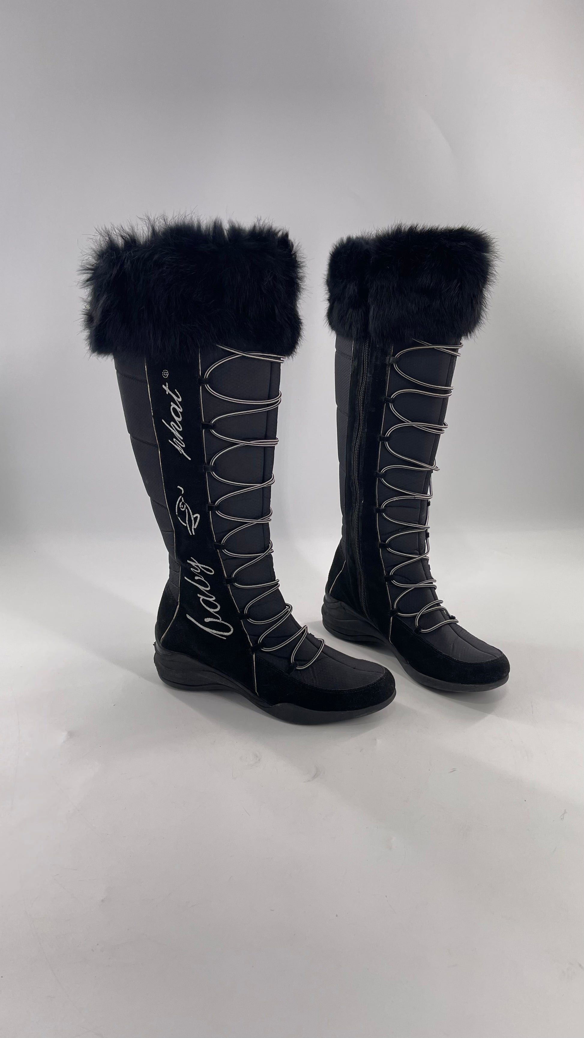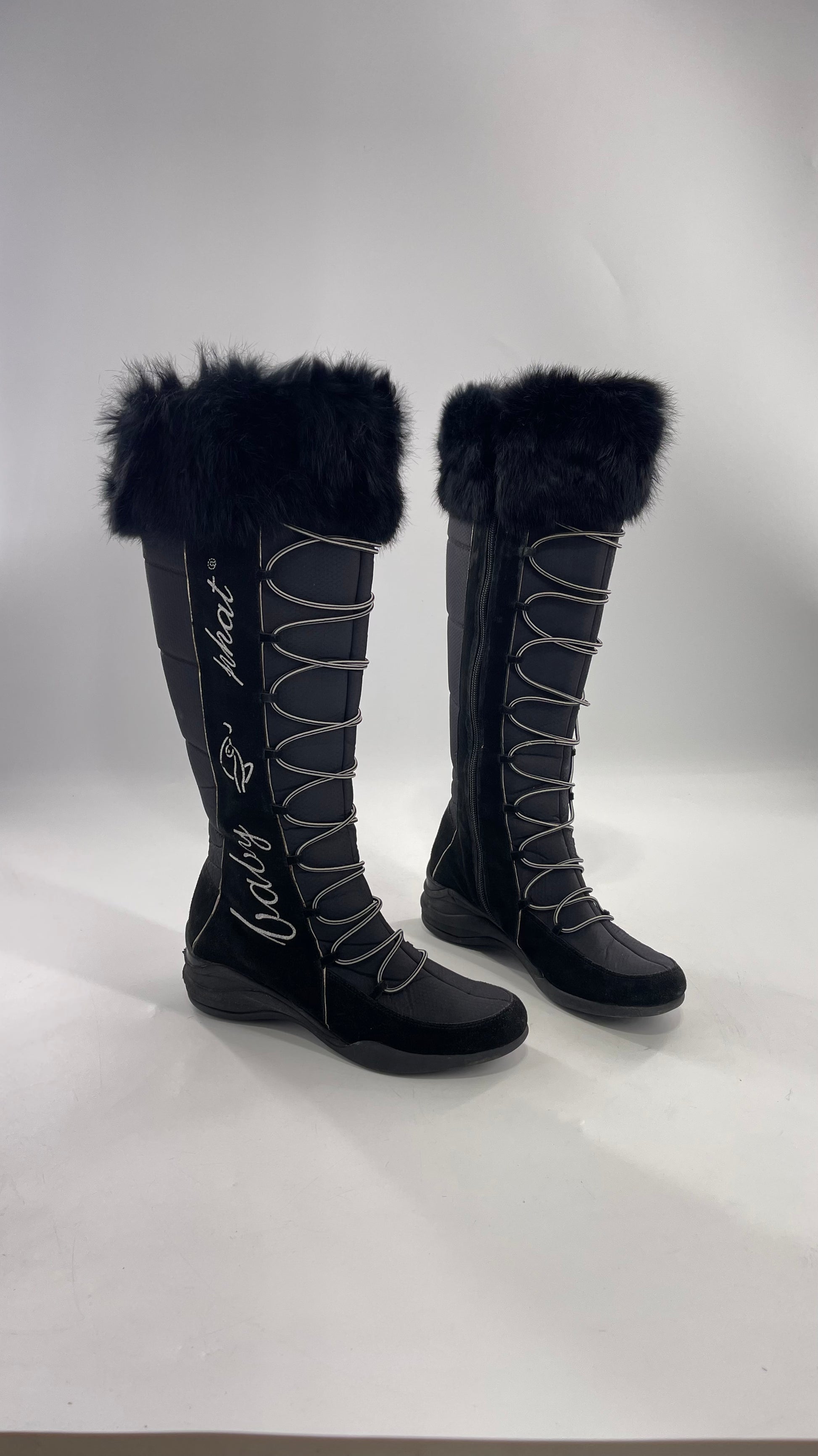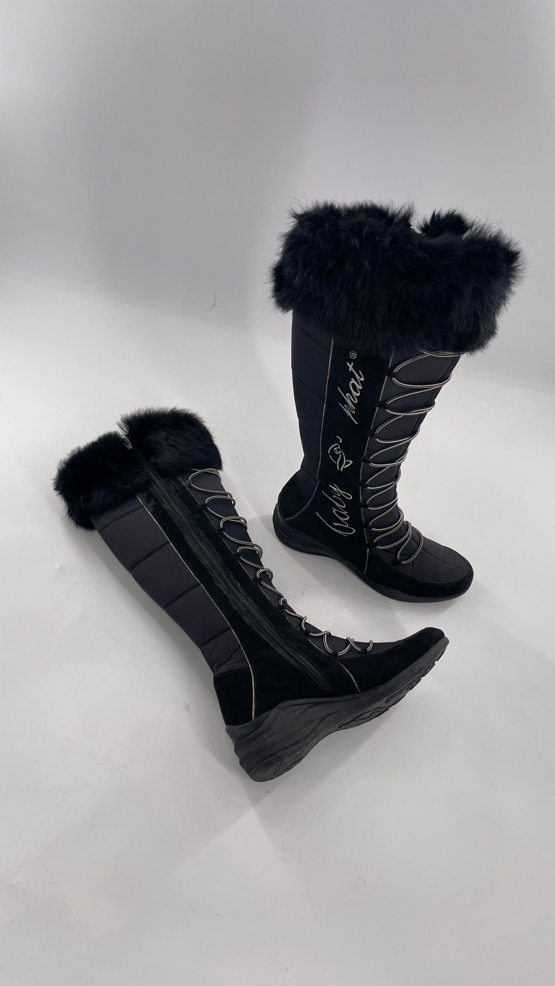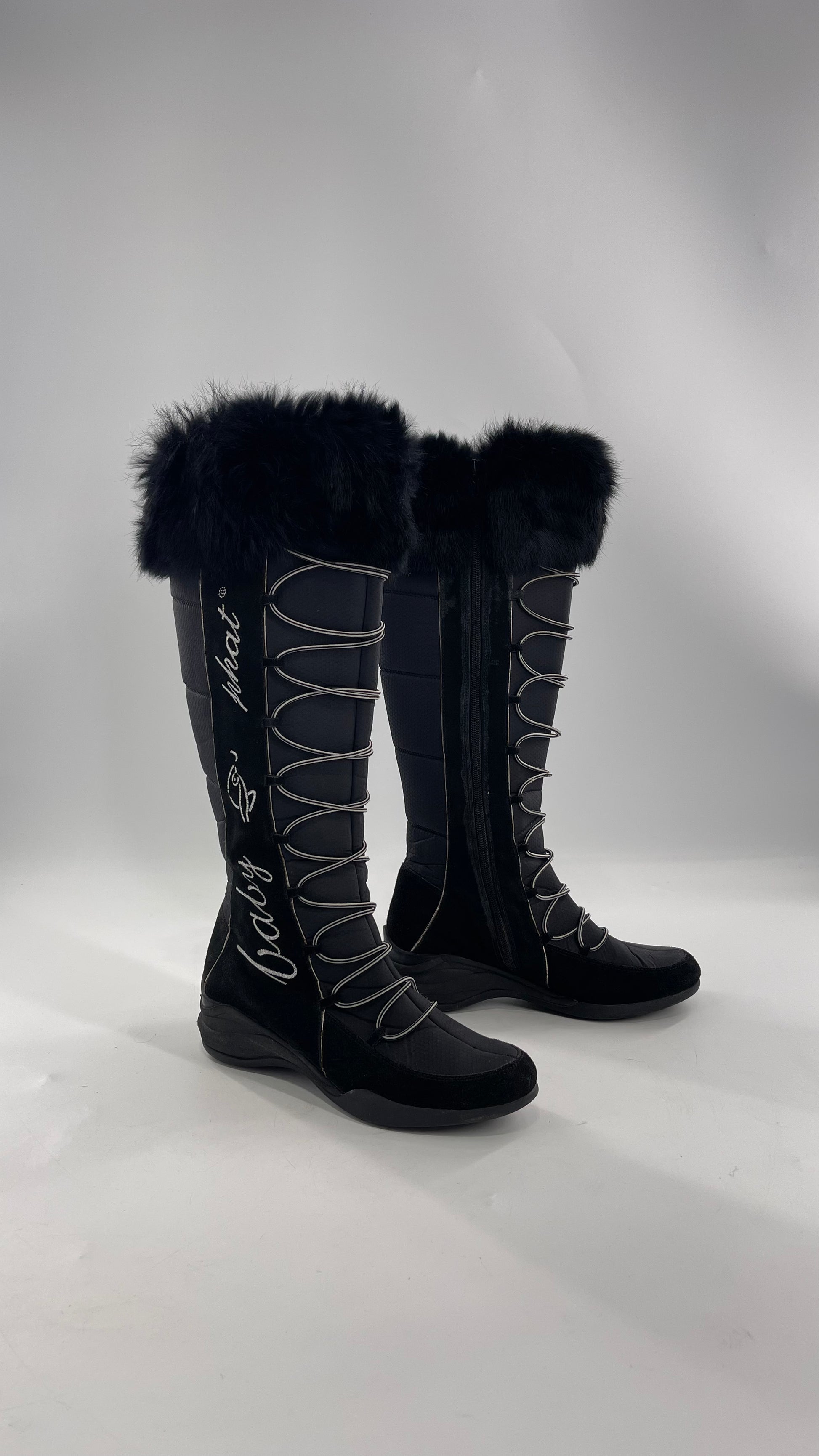 Baby Phat Black Knee High Boots with Rabbit Fur Trim, Bungee Cord Ties, and Embroidered Logo Design |