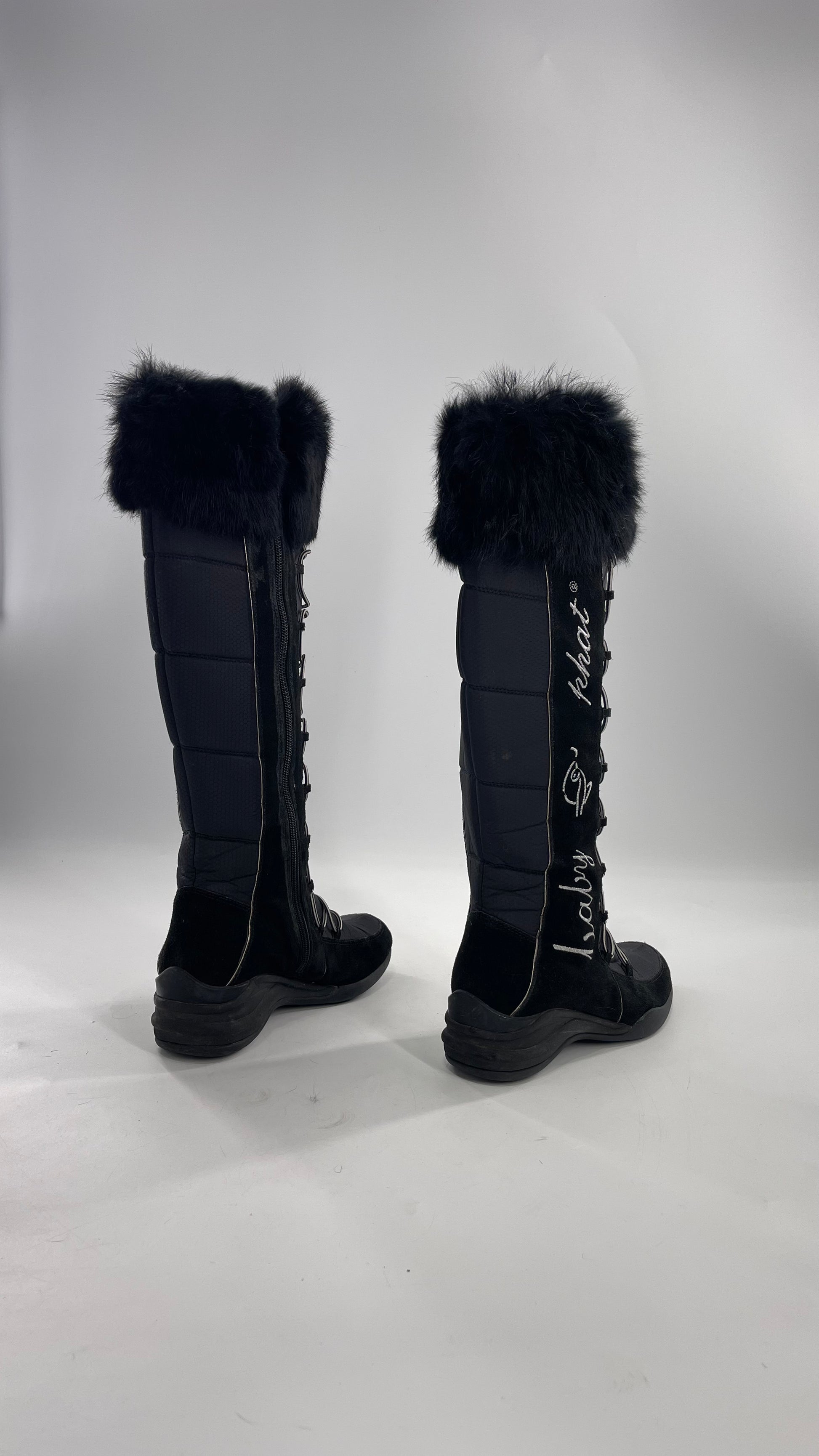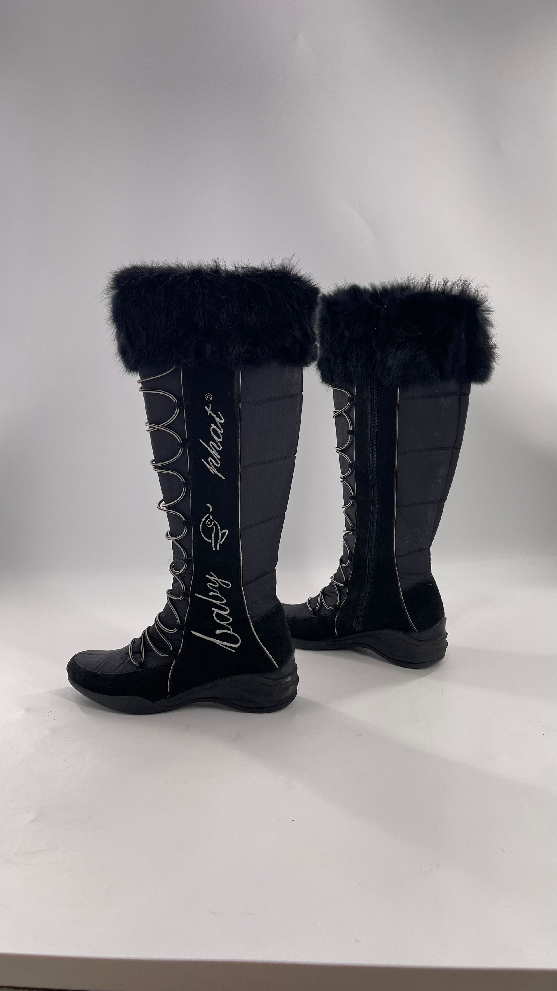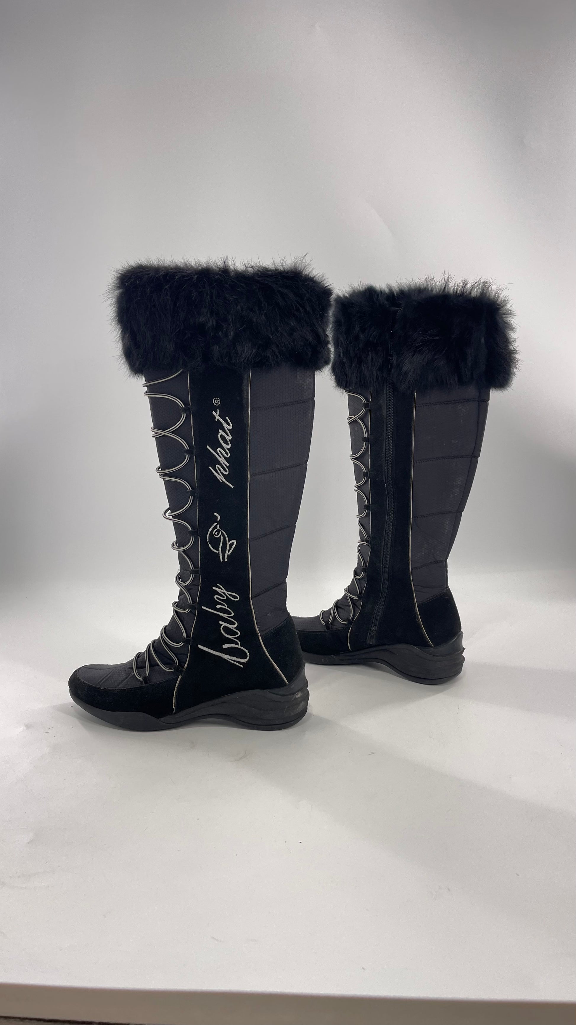 Baby Phat Black Knee High Boots with Rabbit Fur Trim, Bungee Cord Ties, and Embroidered Logo Design (8)