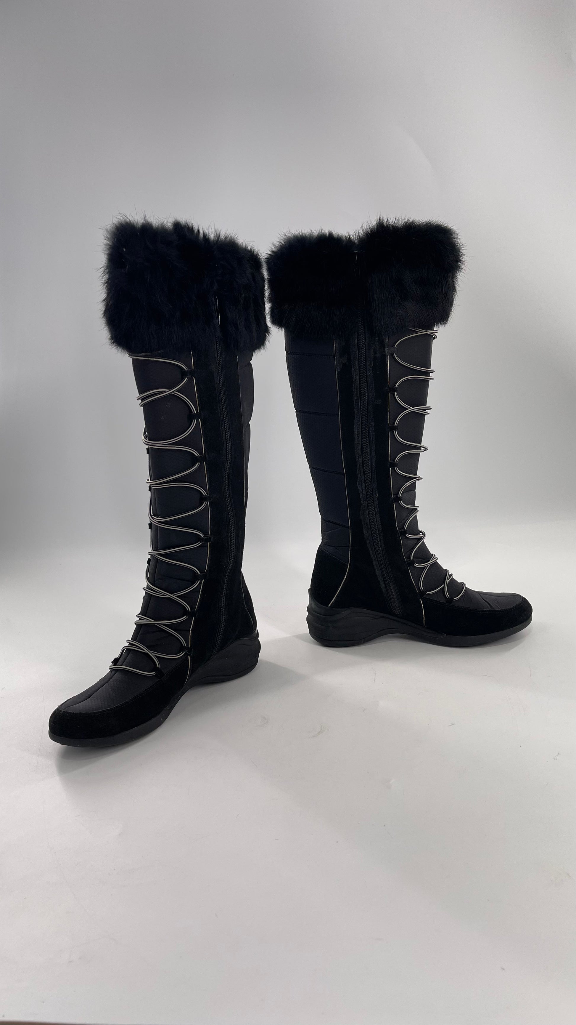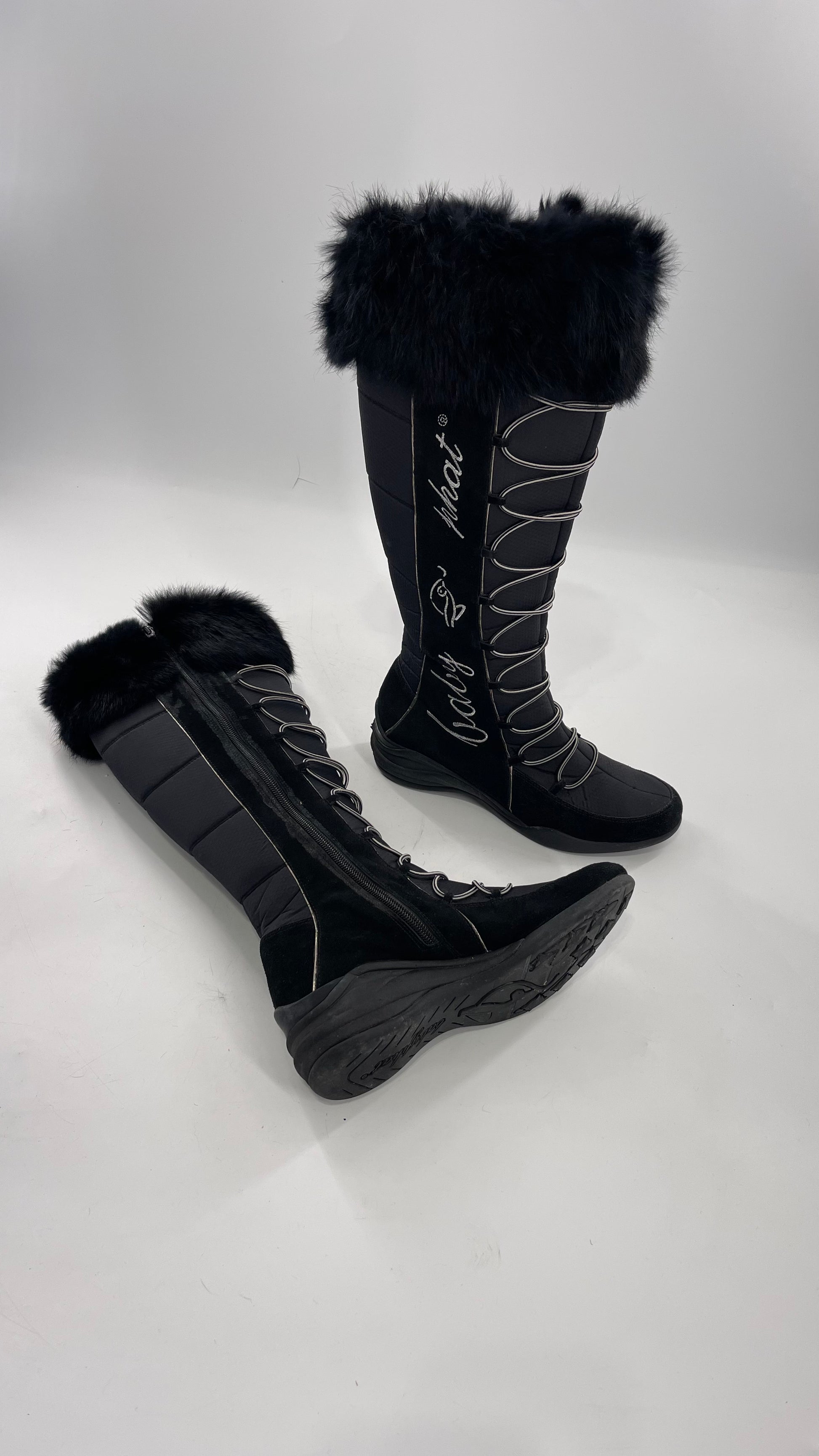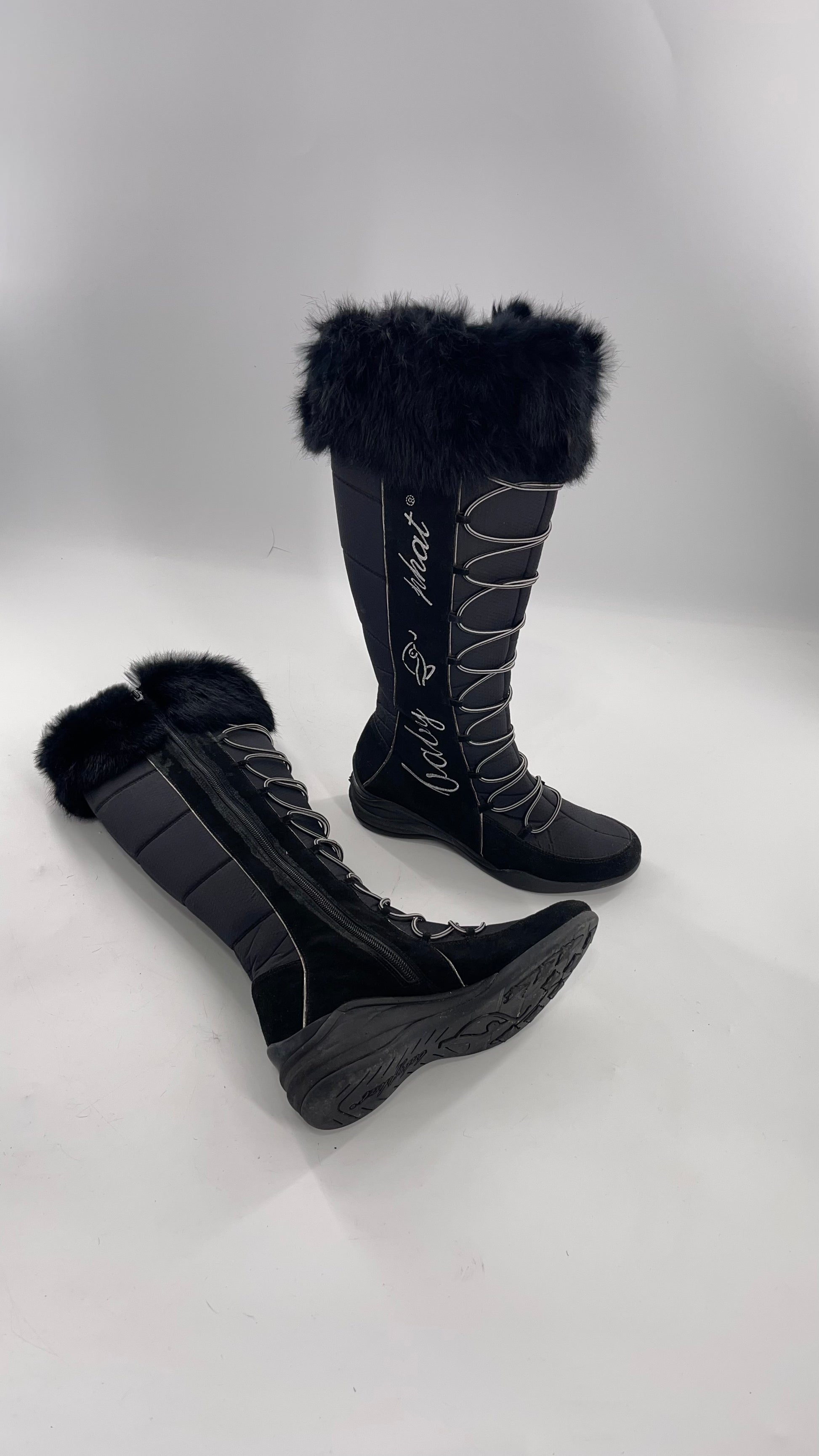 Baby Phat Black Knee High Boots with Rabbit Fur Trim, Bungee Cord Ties, and Embroidered Logo Design (8)