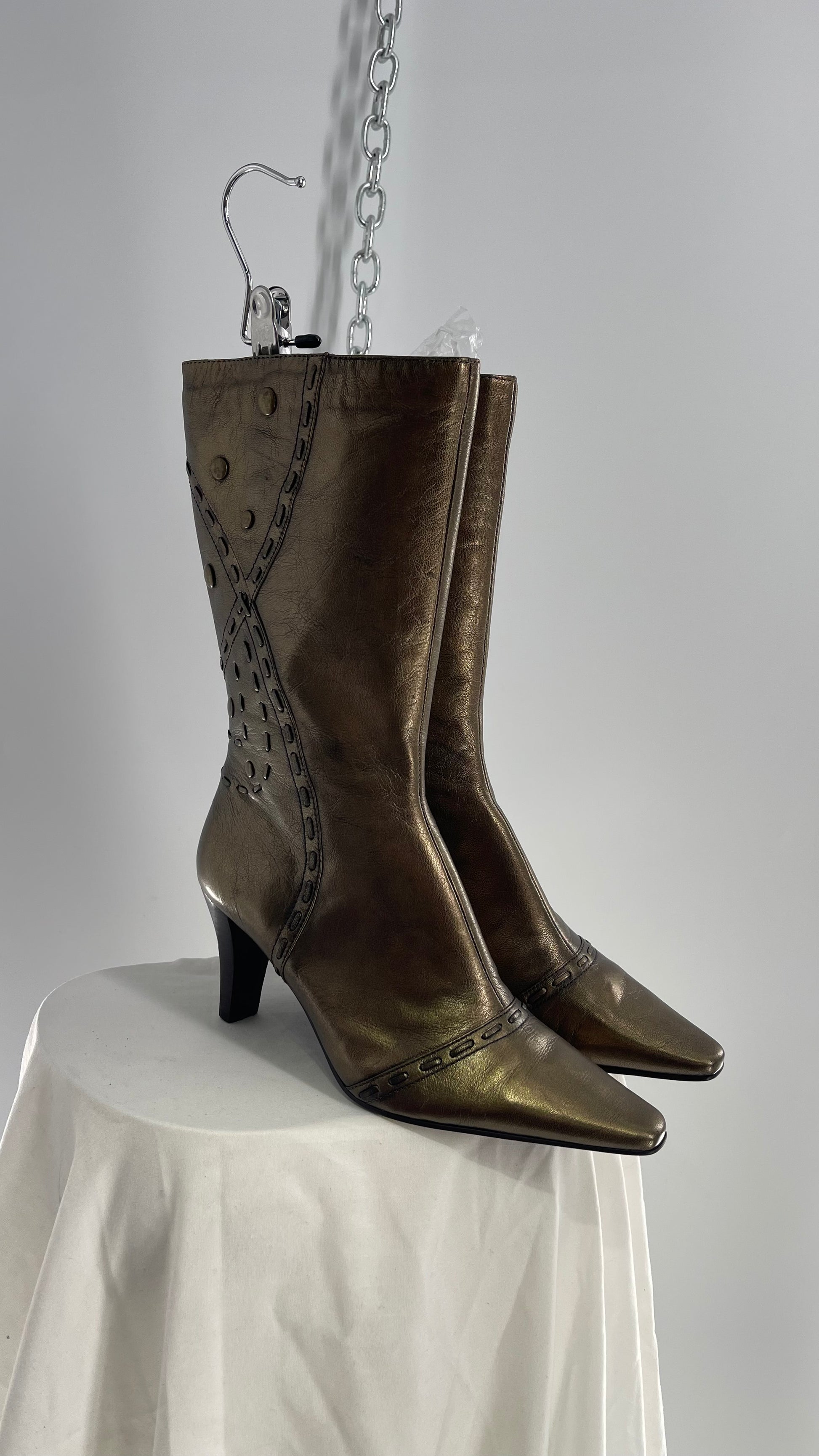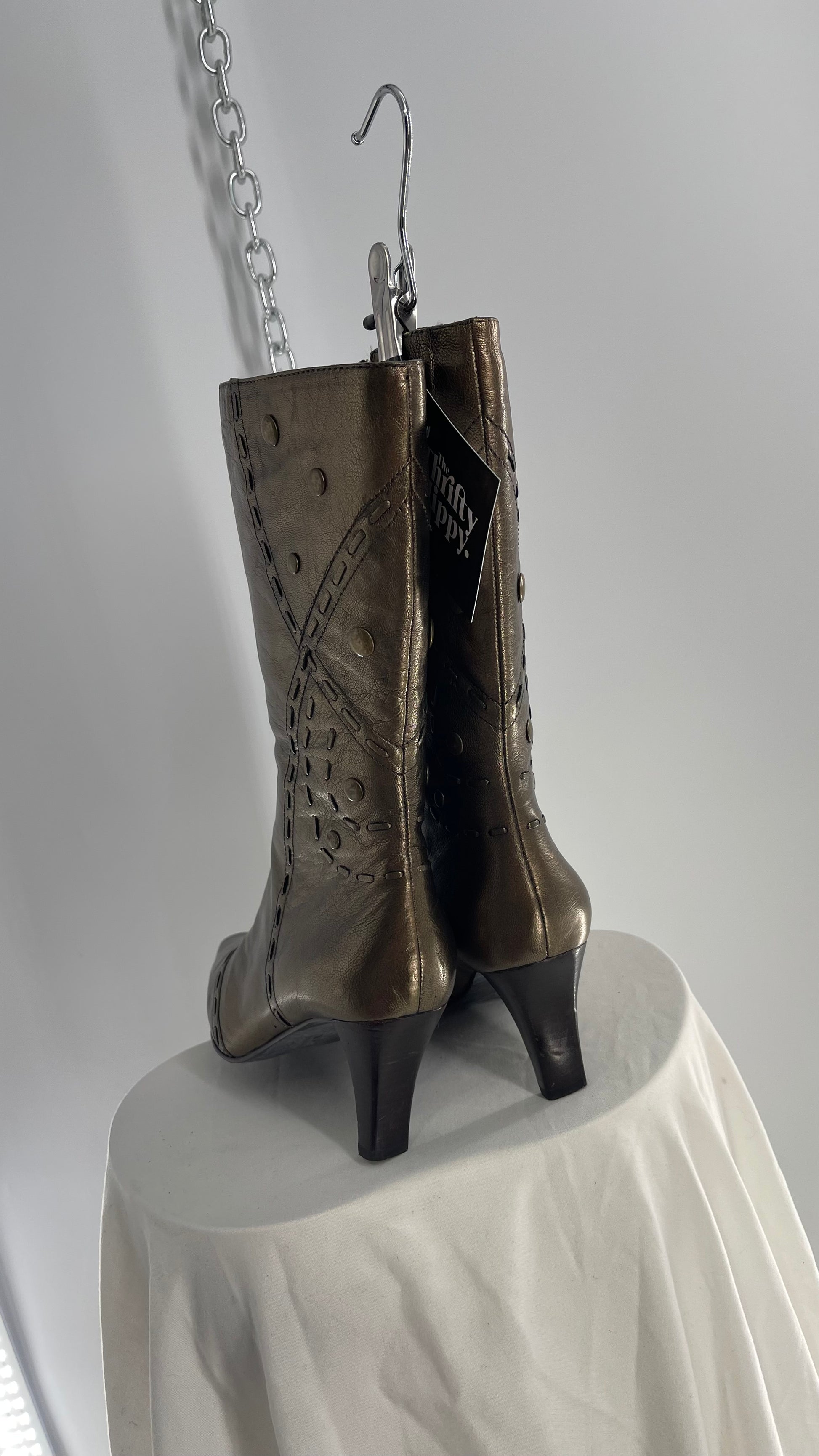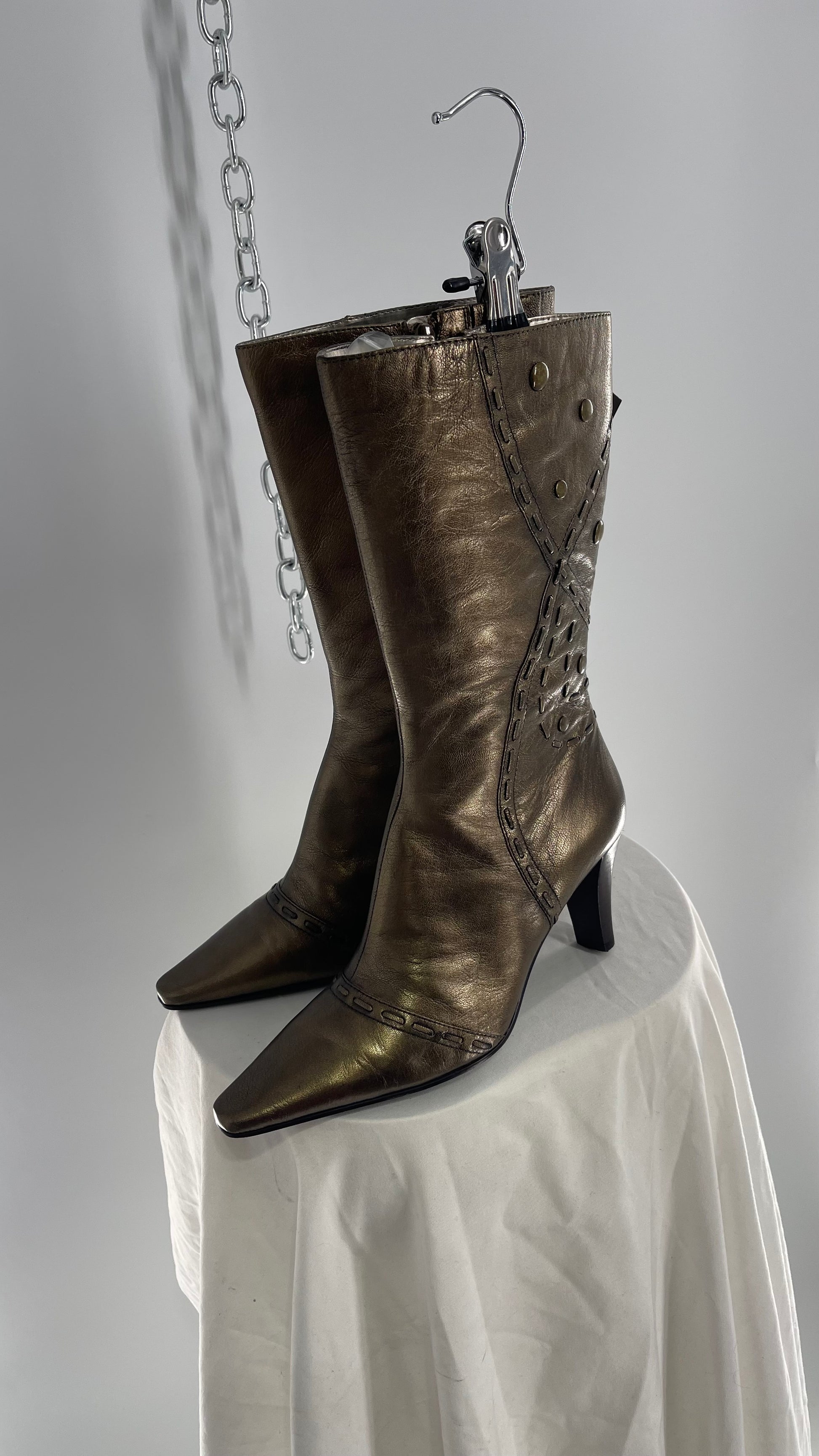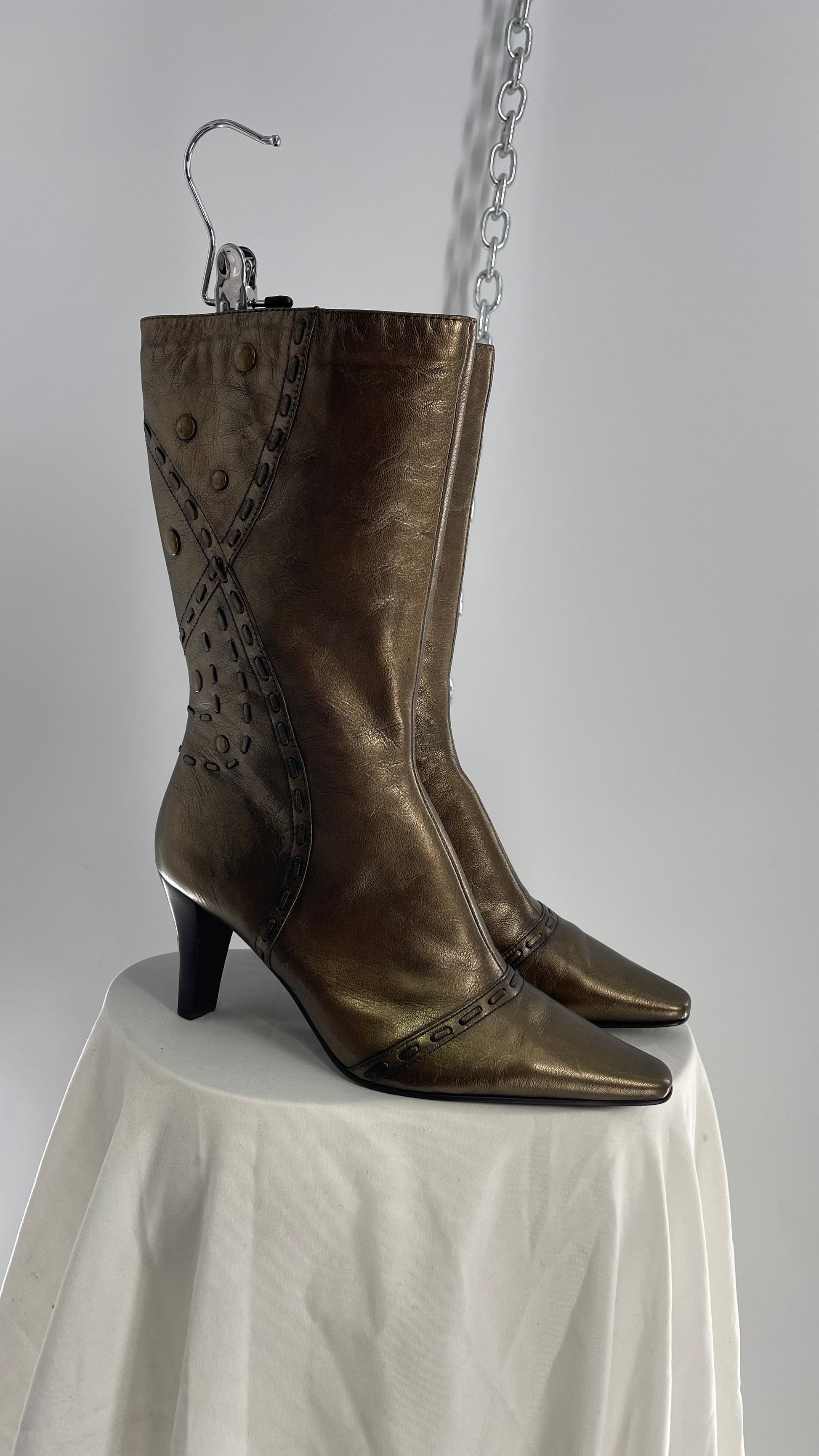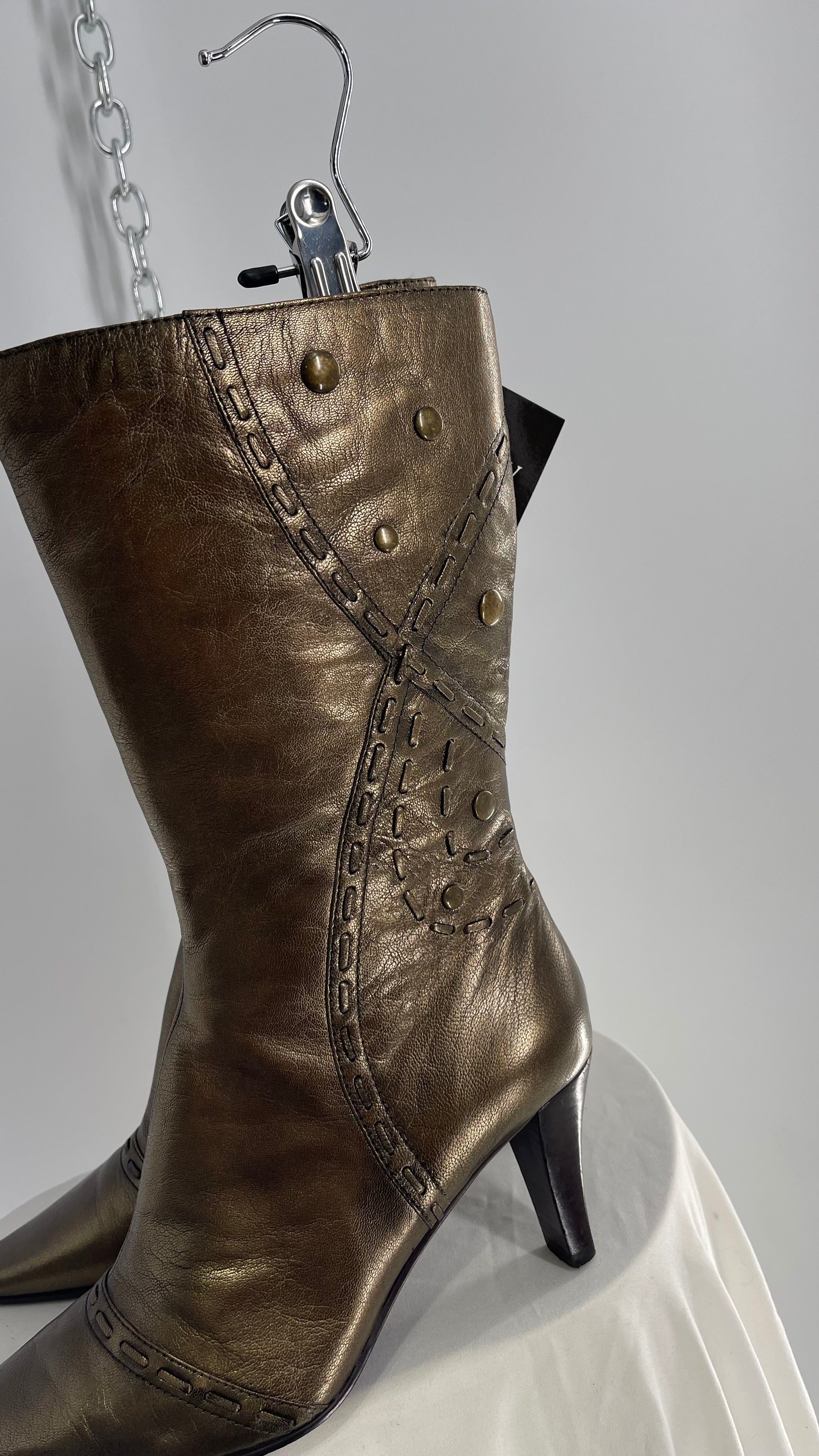 Vintage BANDOLINO Bronze Metallic Pointed Toe Boots with Leather Stitching and Studded Details