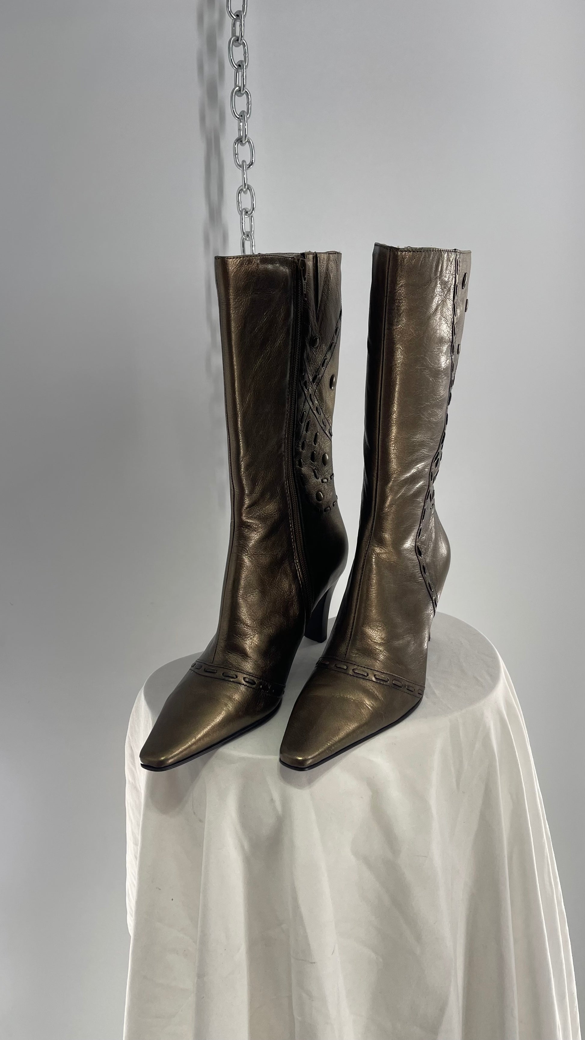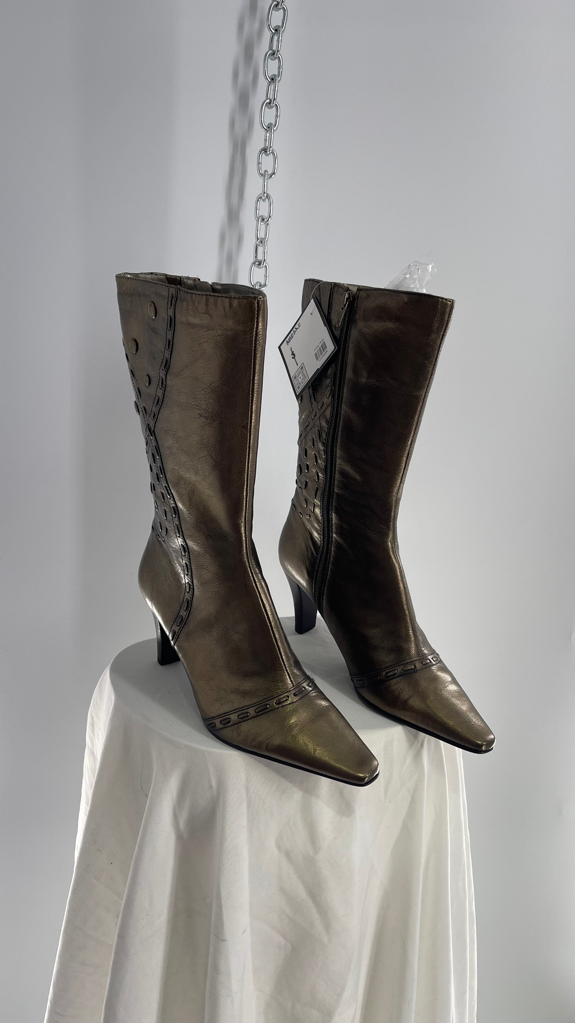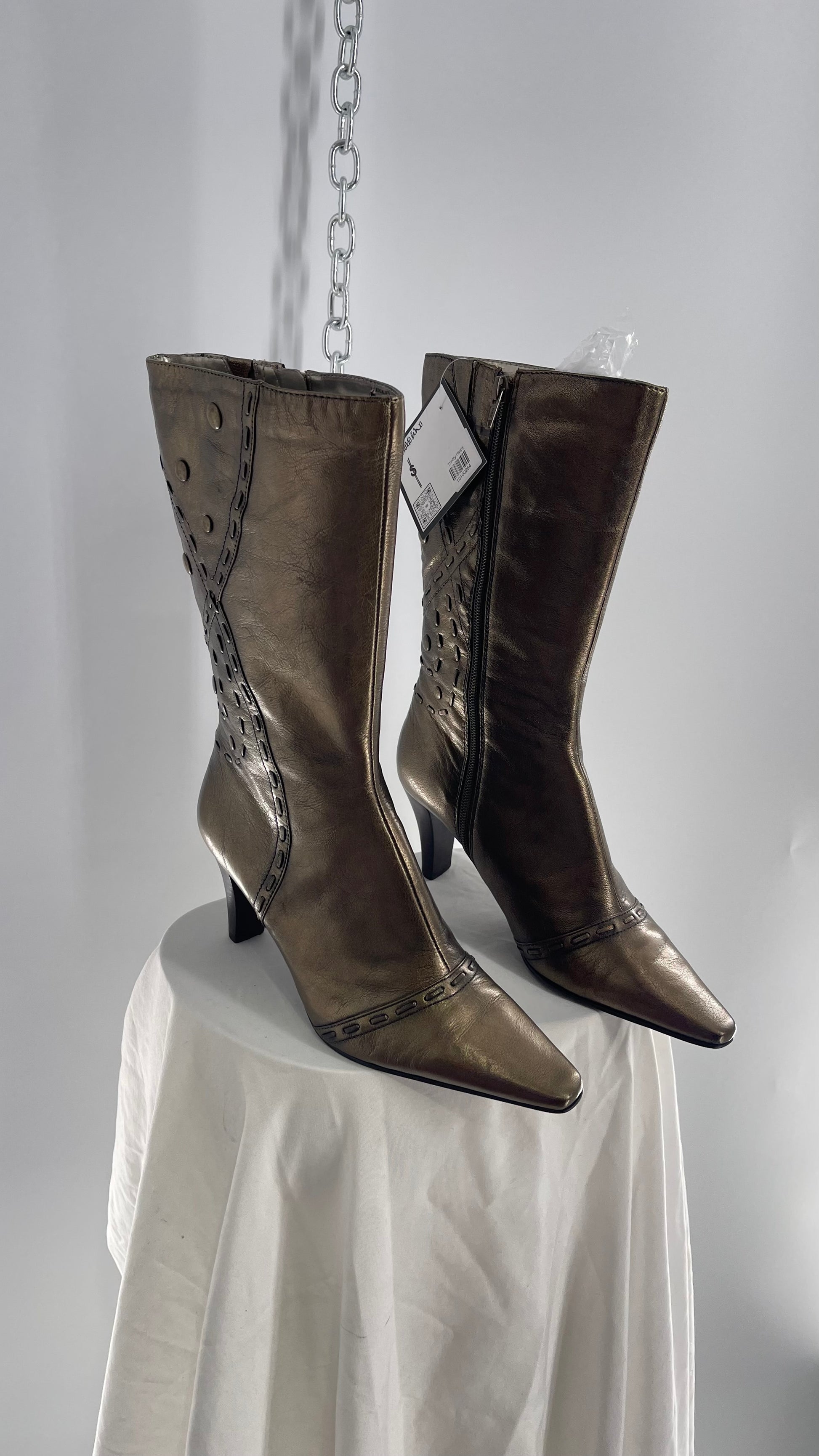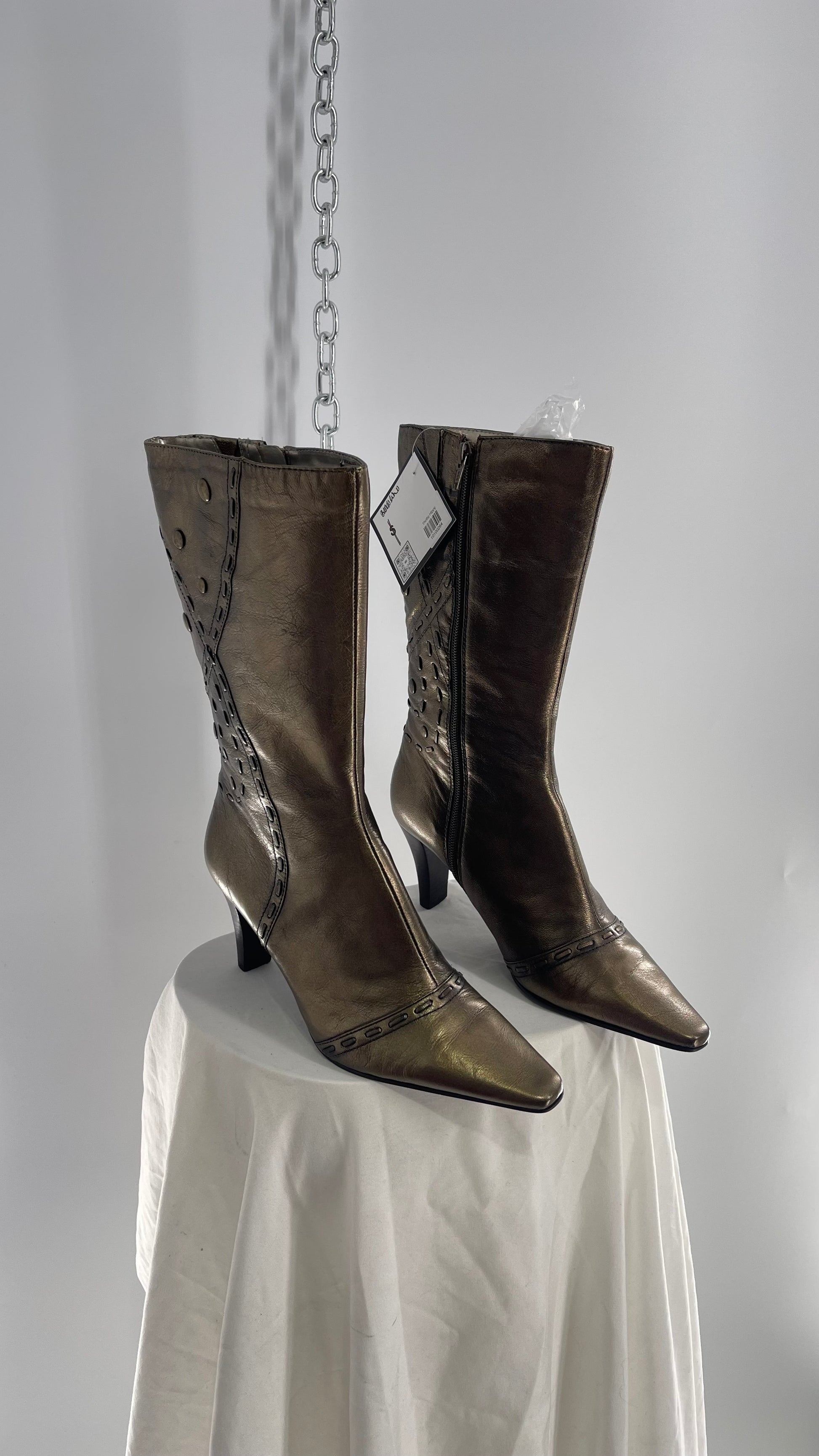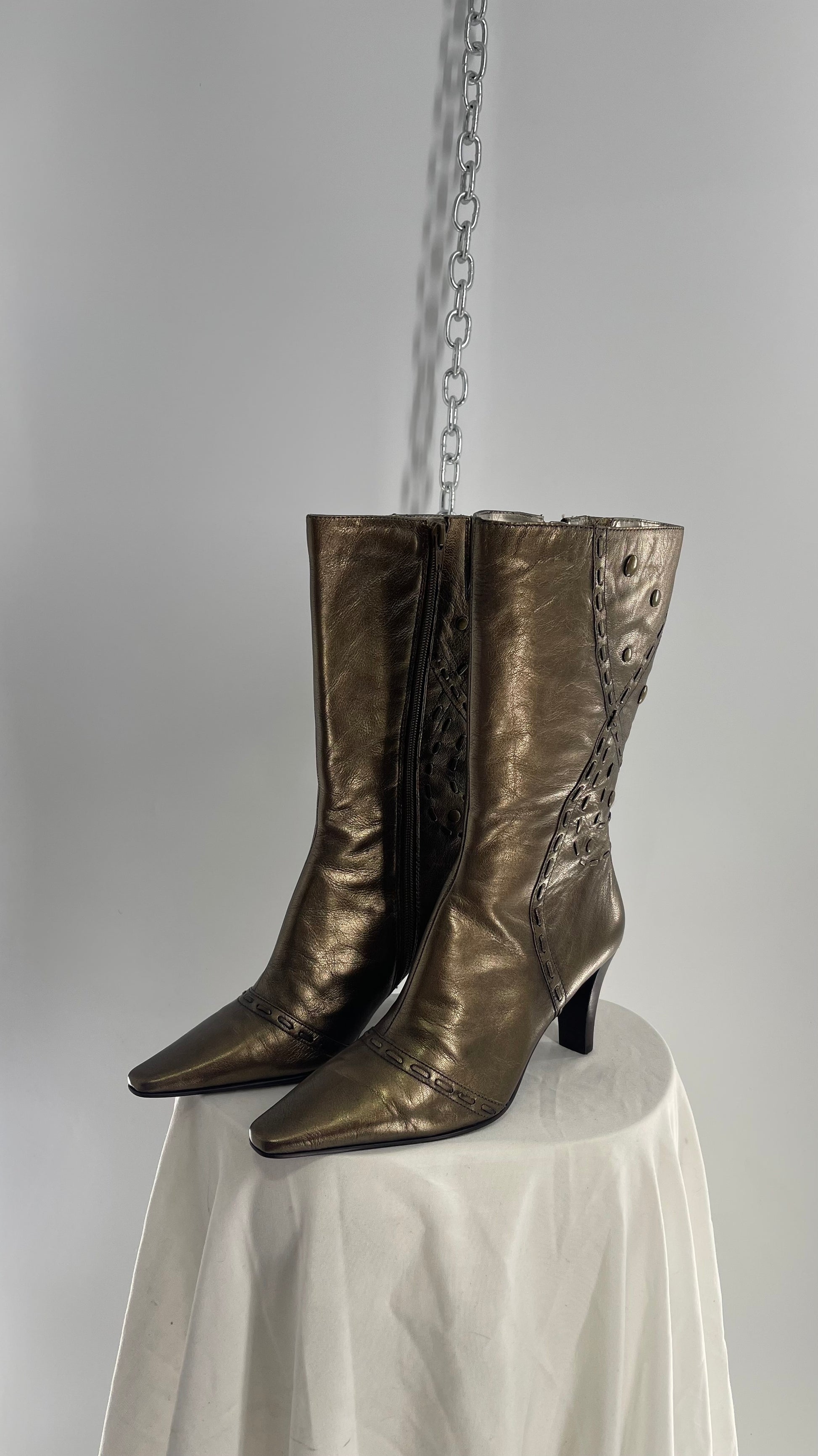 Vintage BANDOLINO Bronze Metallic Pointed Toe Boots with Leather Stitching and Studded Details