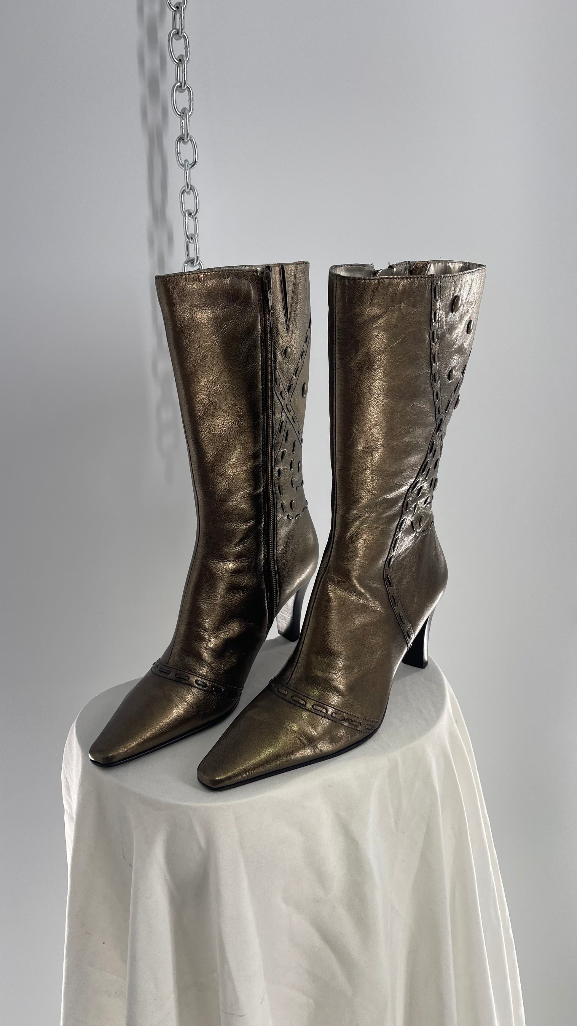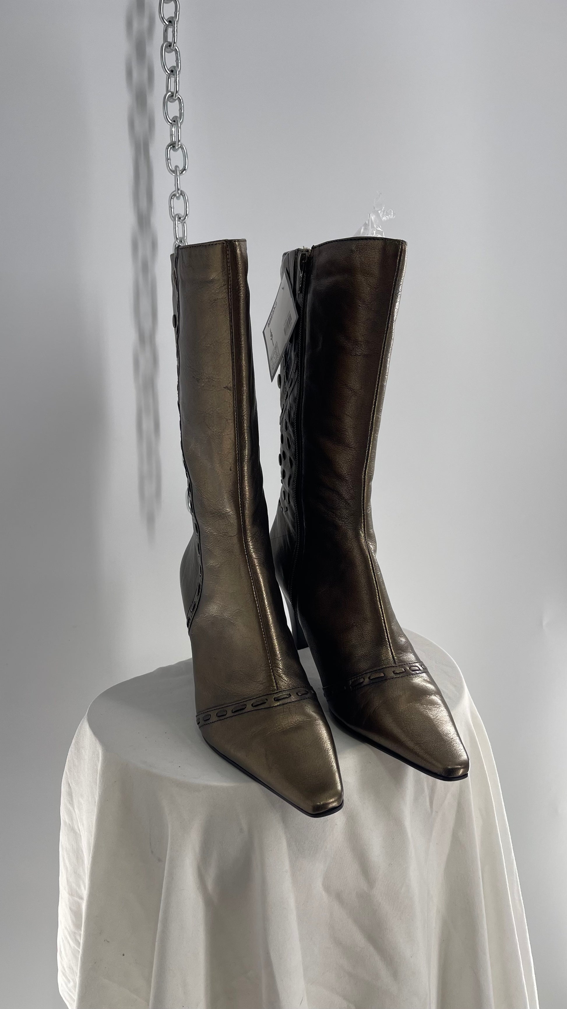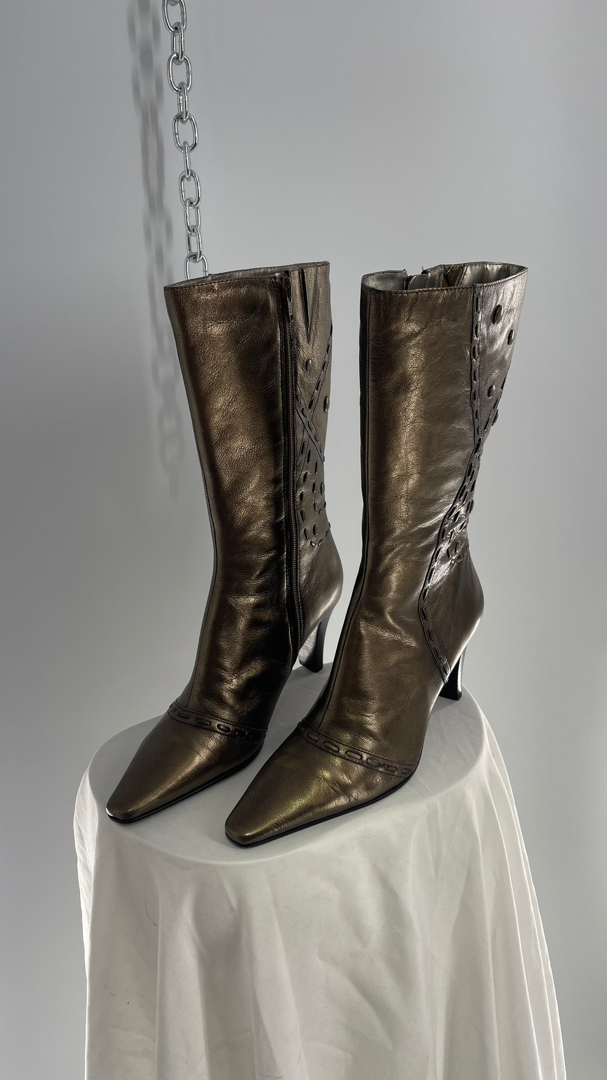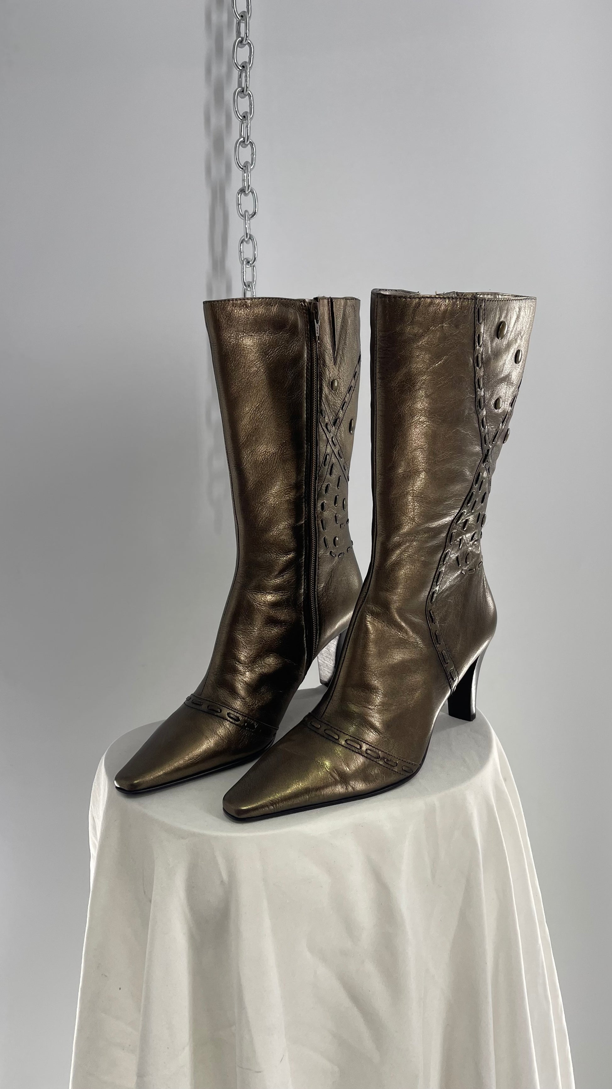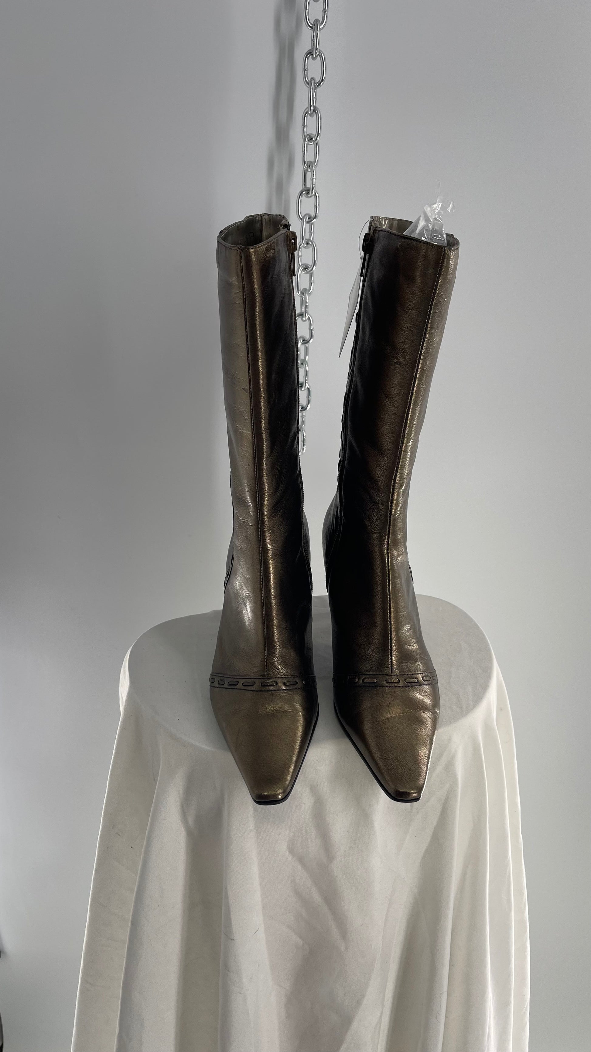 Vintage BANDOLINO Bronze Metallic Pointed Toe Boots with Leather Stitching and Studded Details