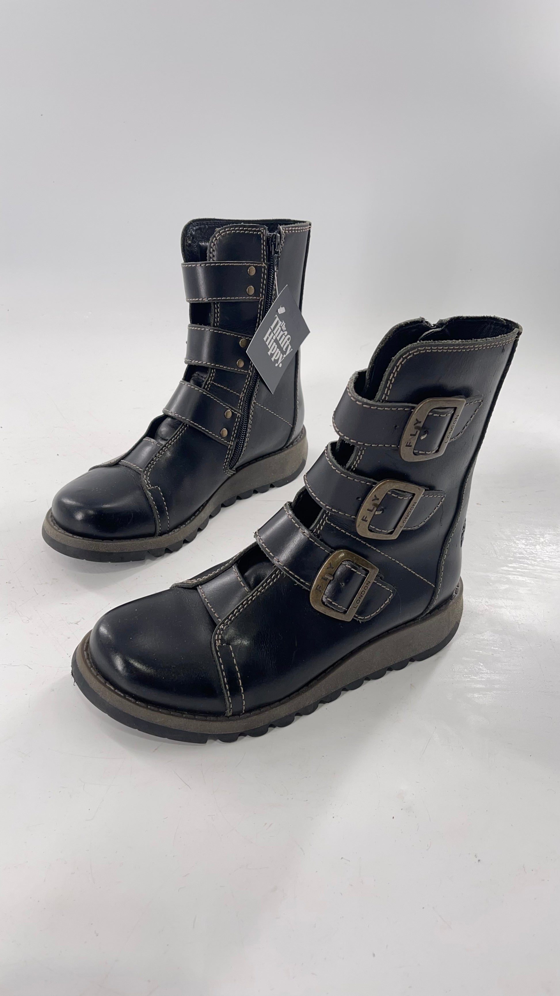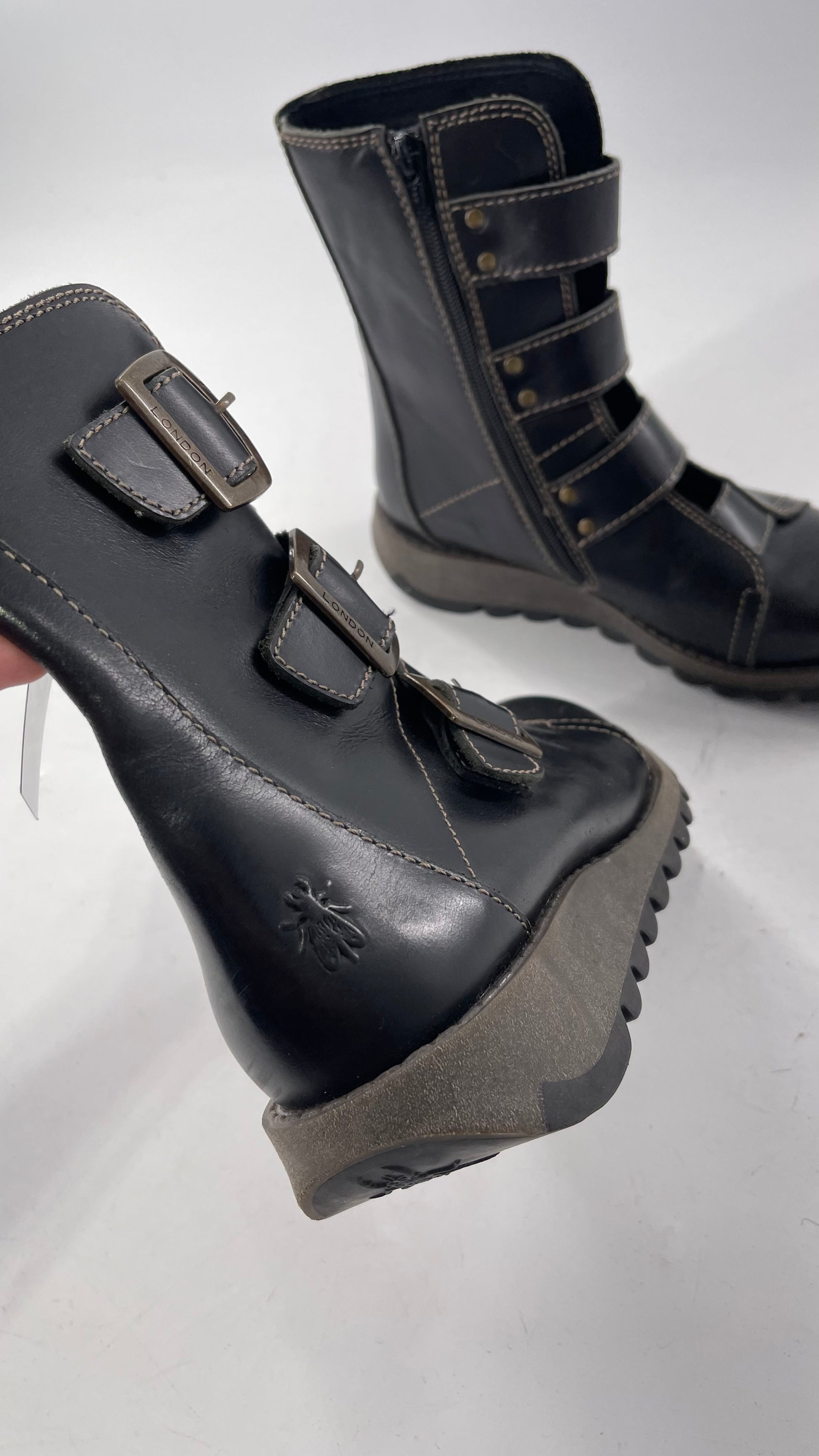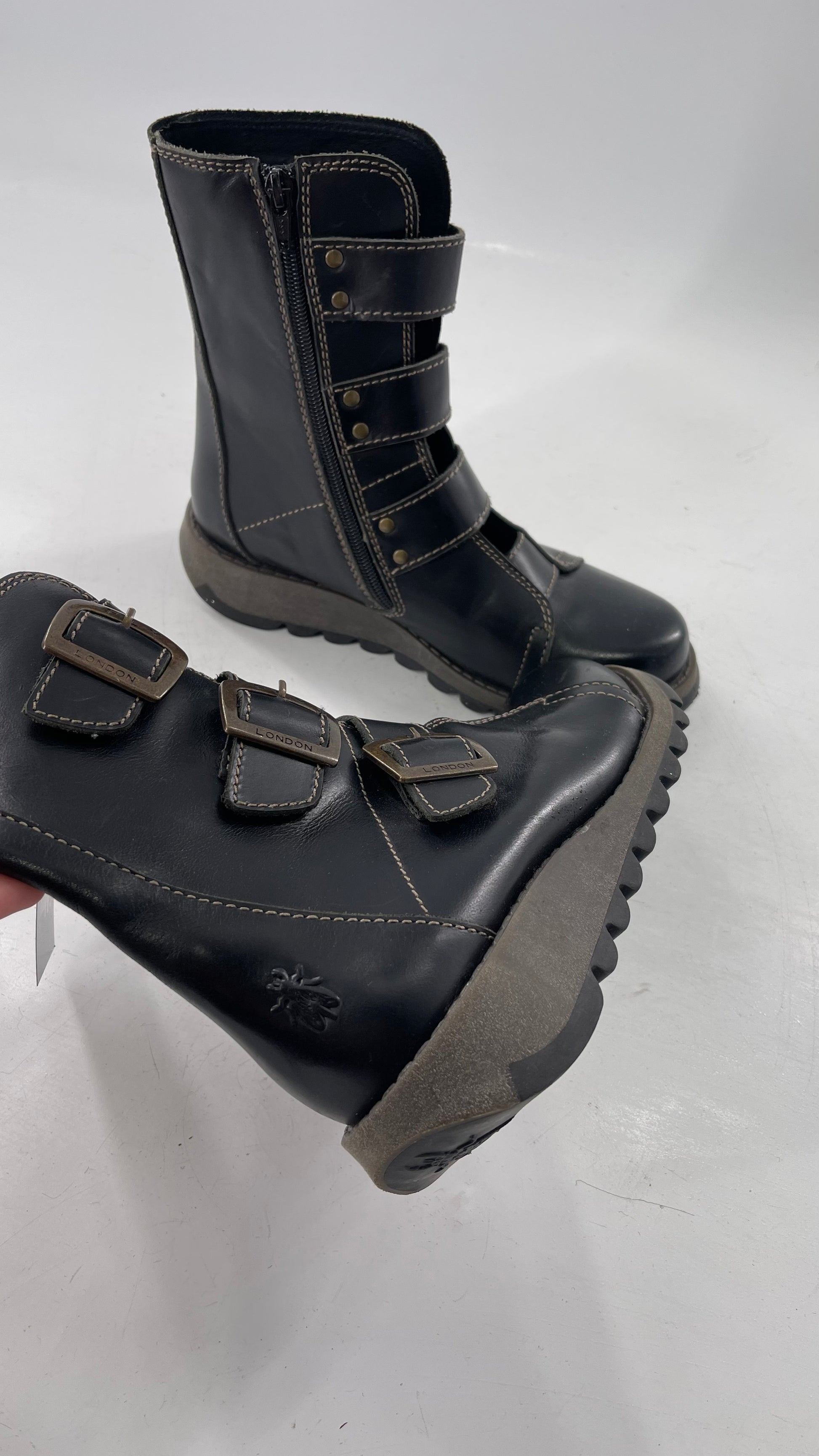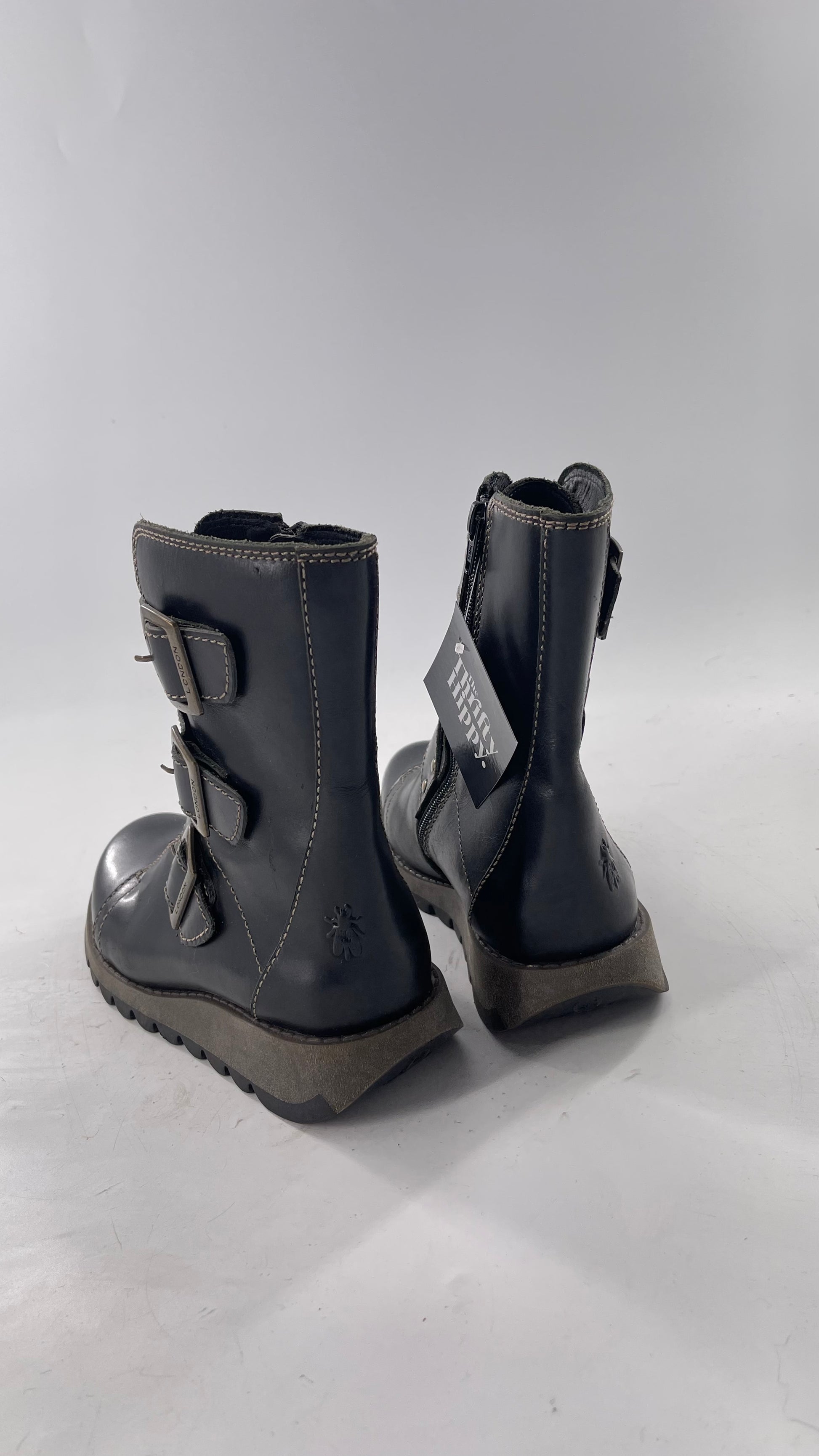 Fly London Black Zipper Side Boot with Oversized Brass Buckles (38)
