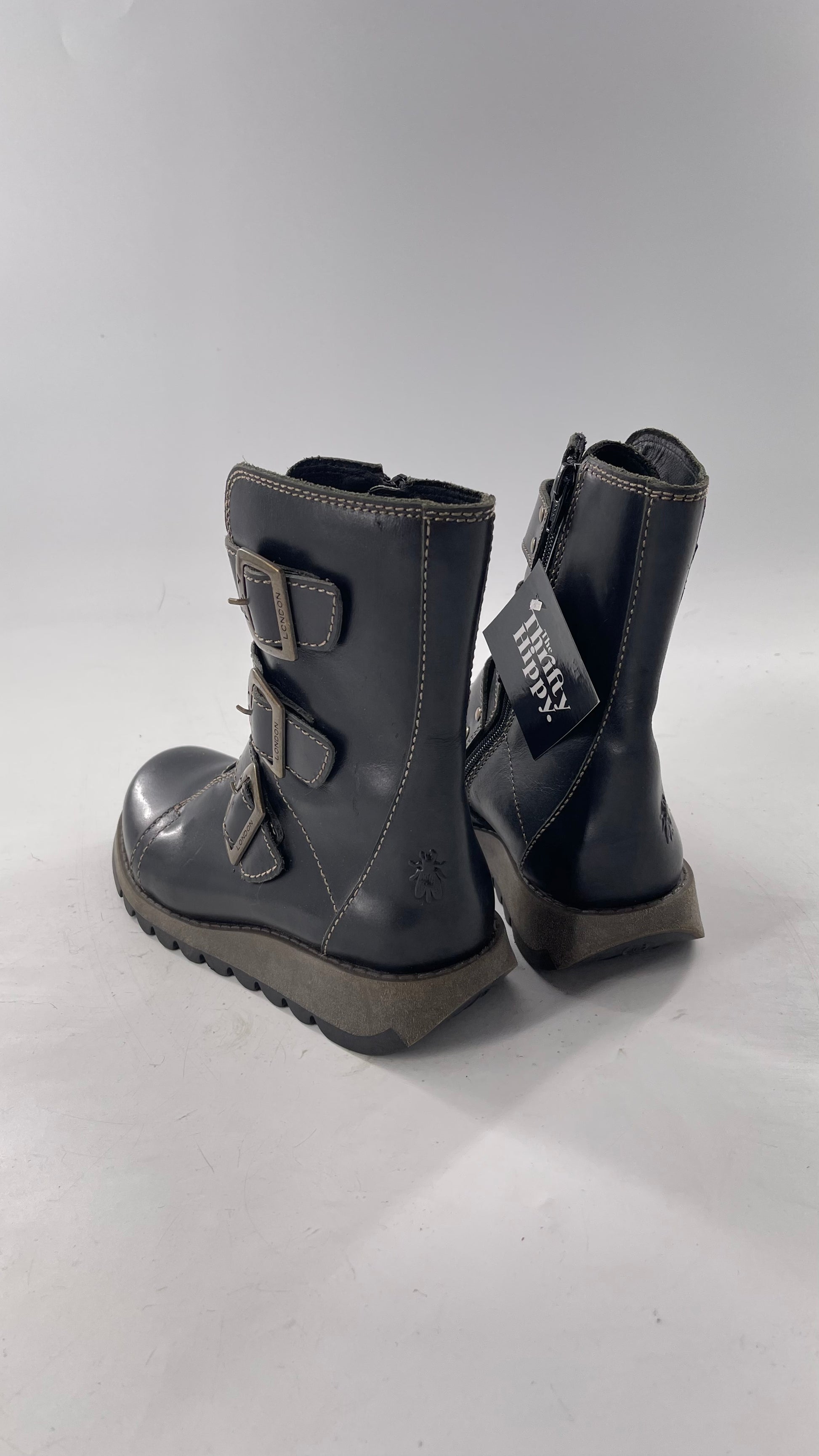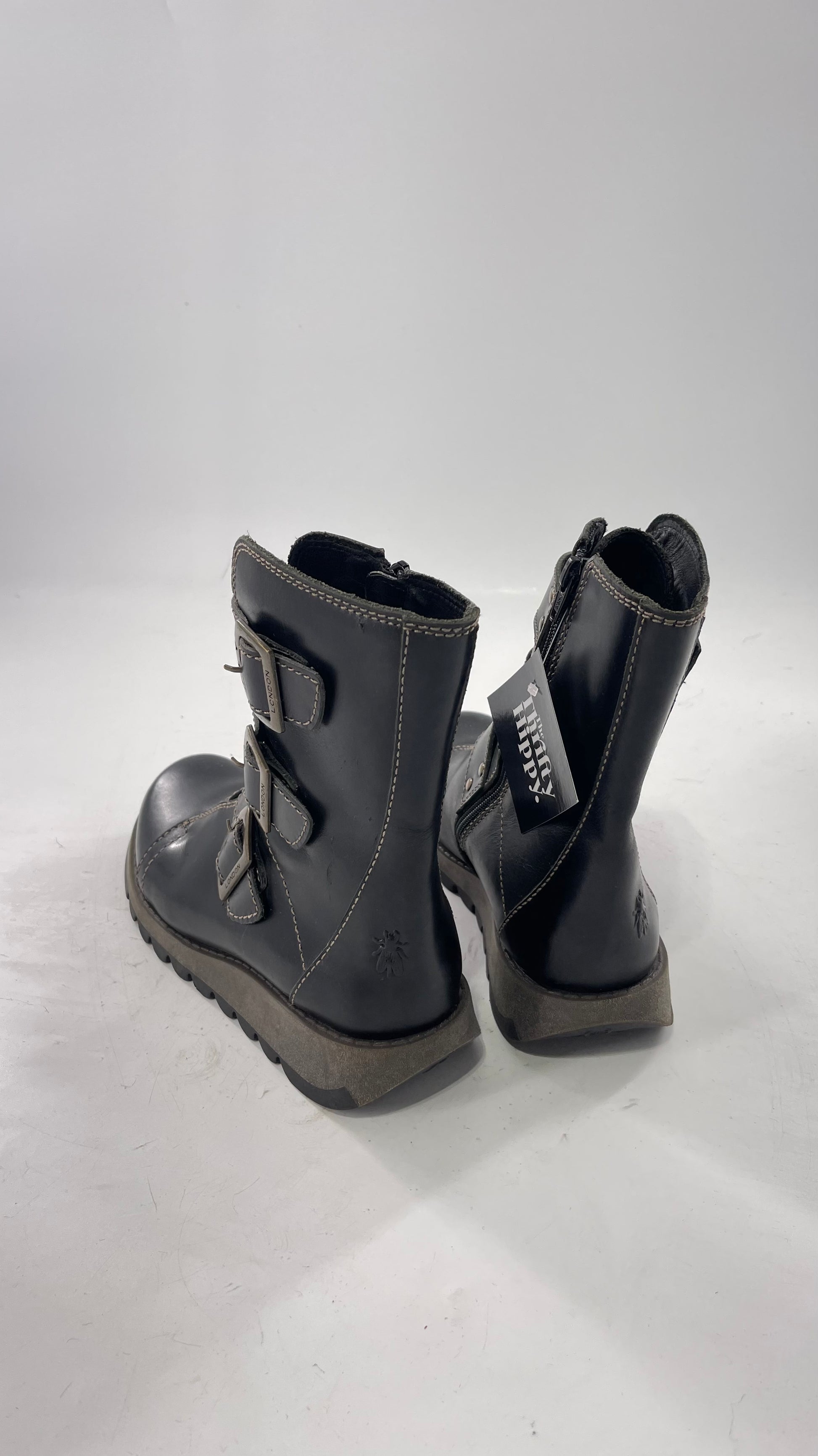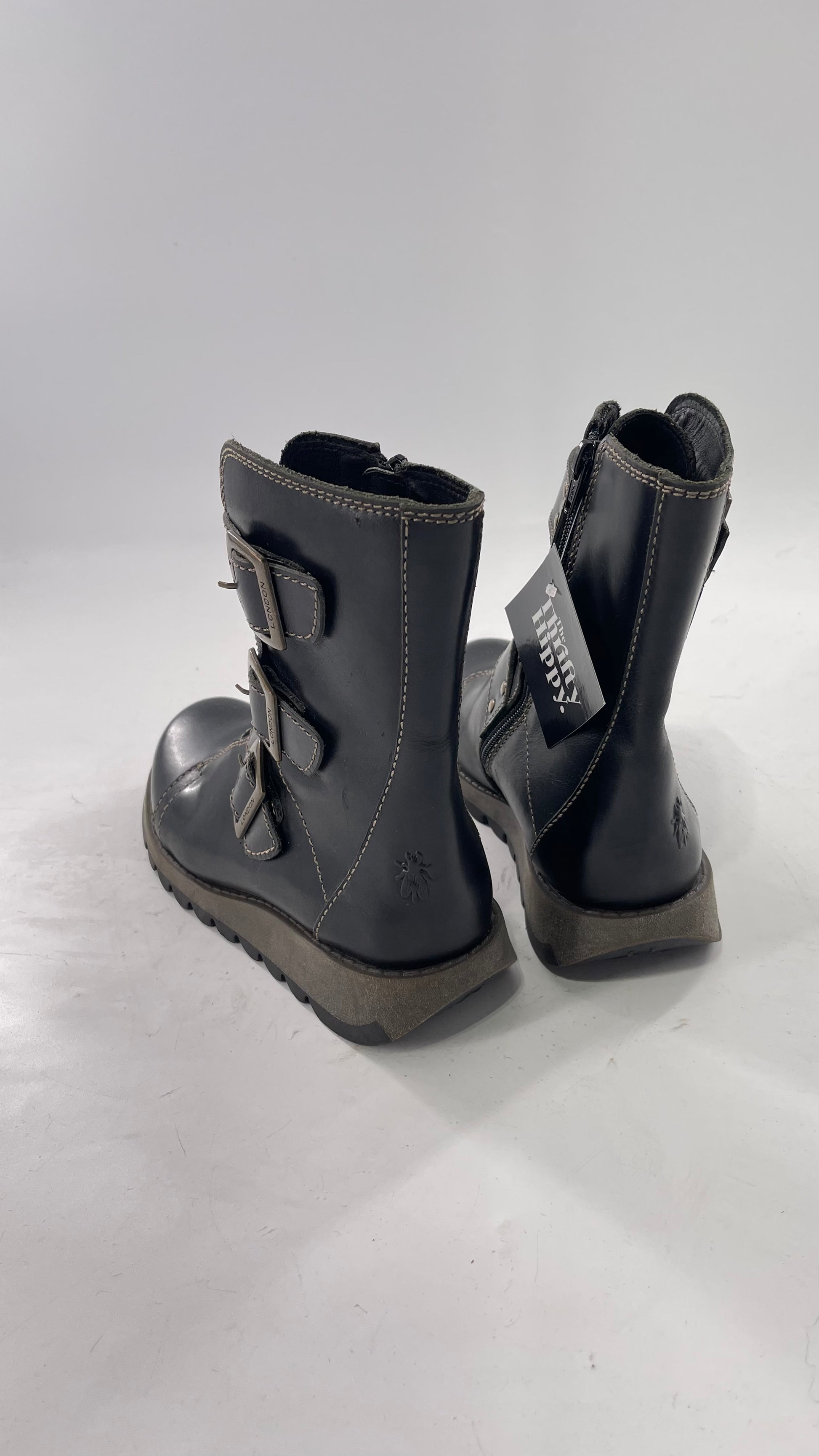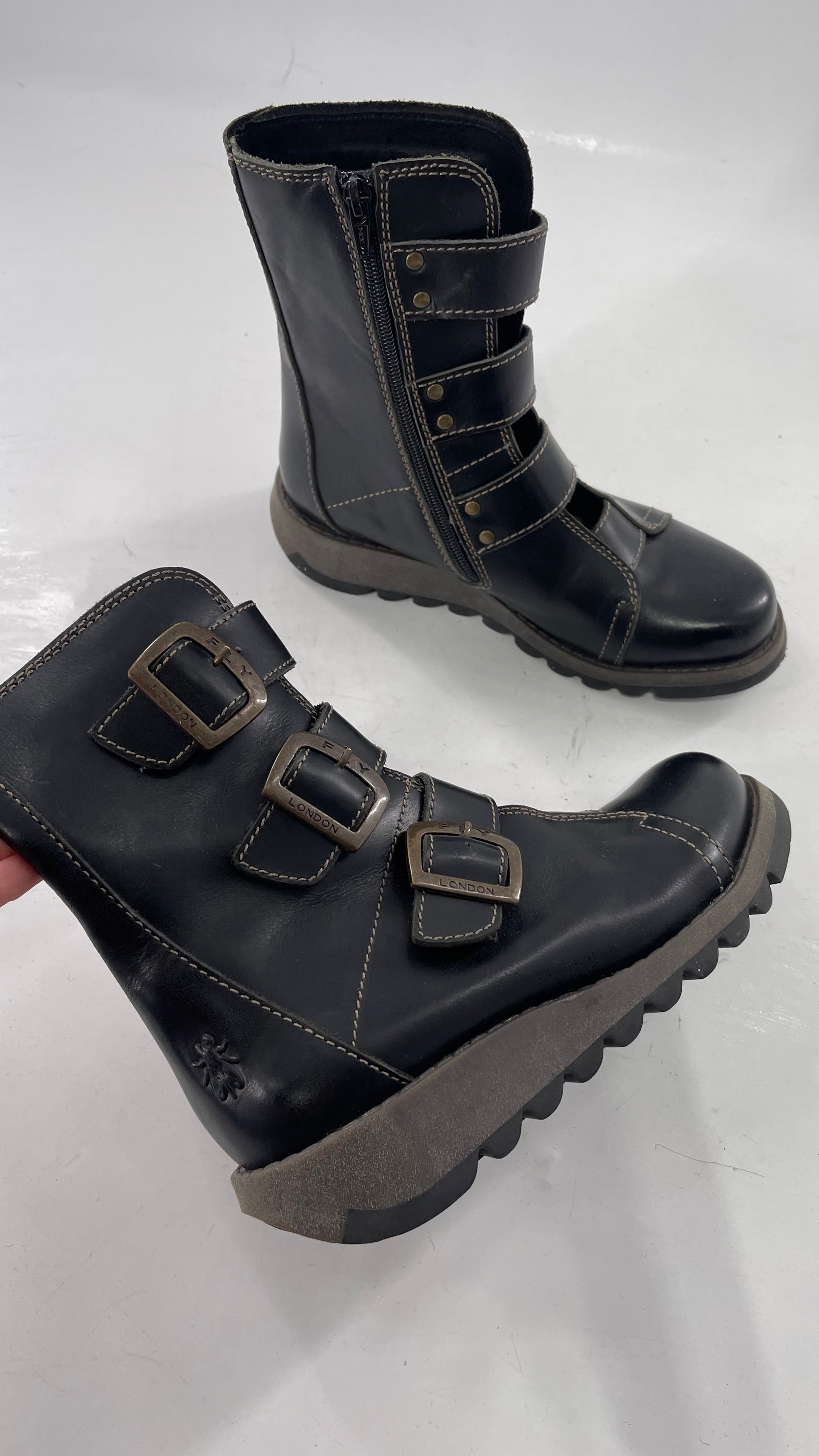 Fly London Black Zipper Side Boot with Oversized Brass Buckles (38)