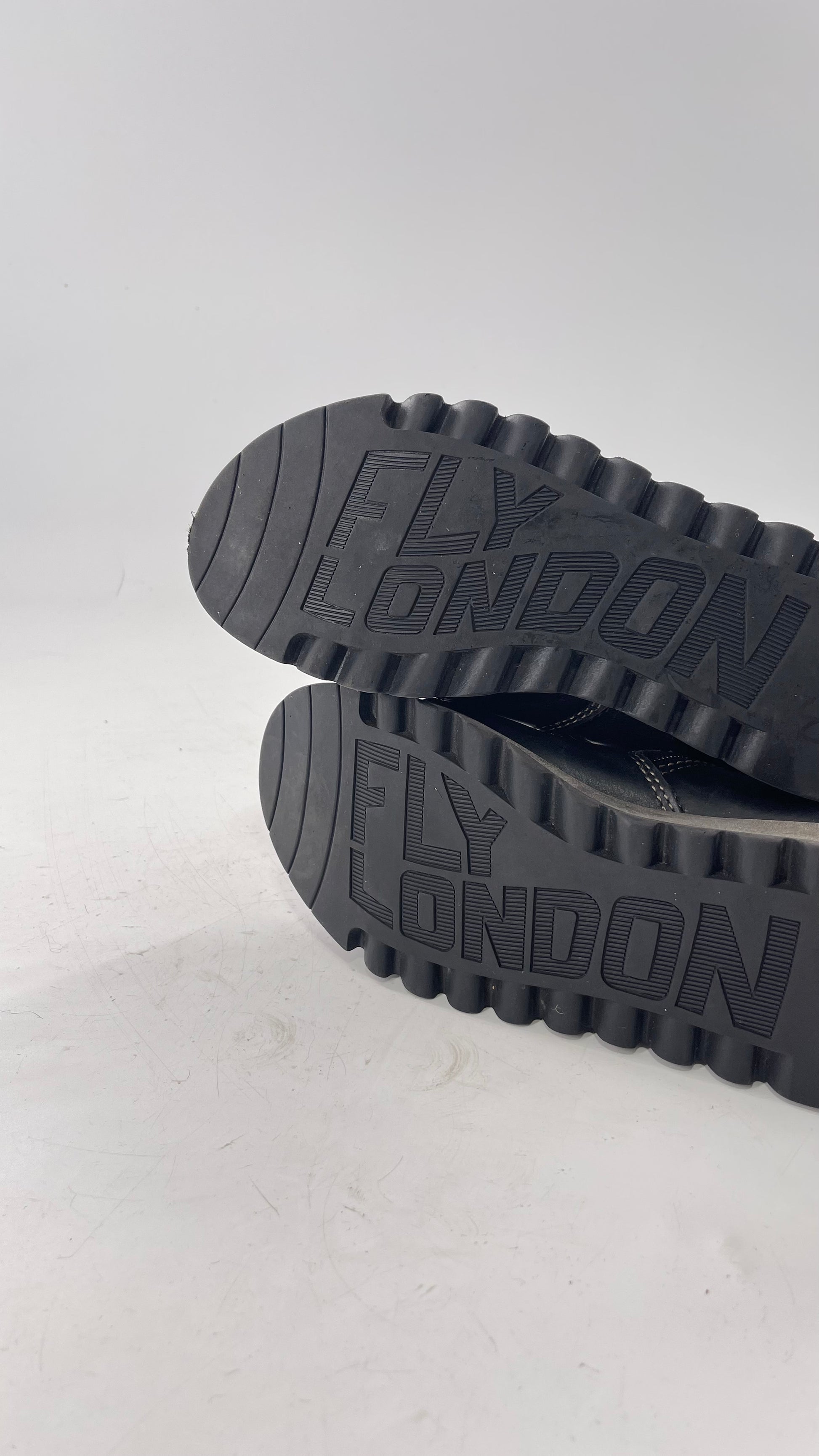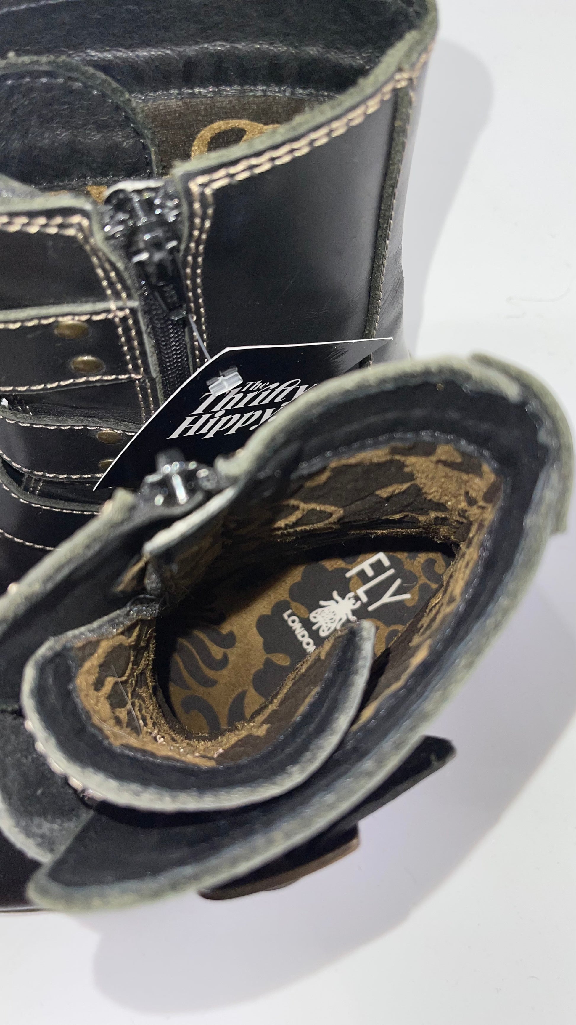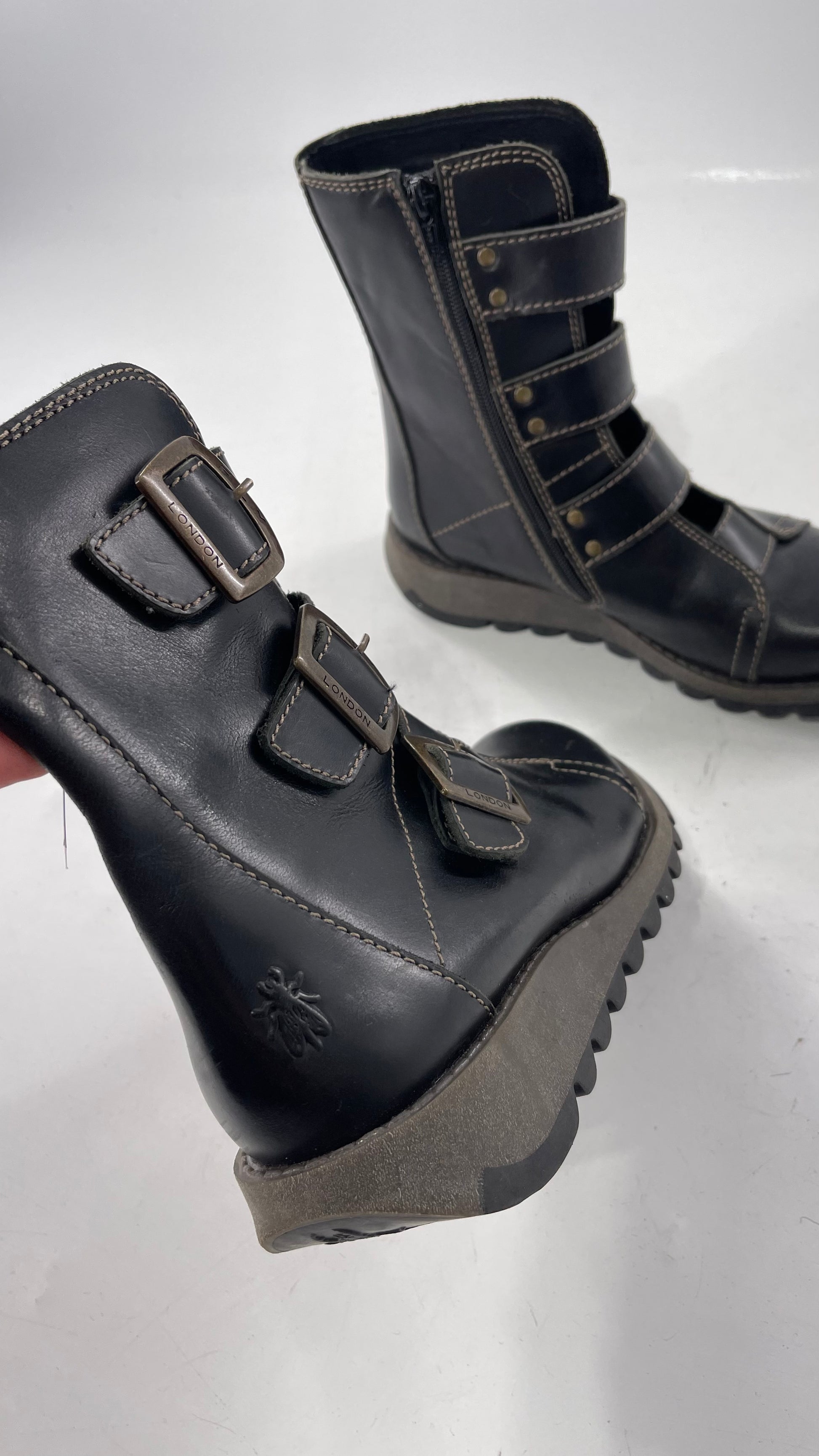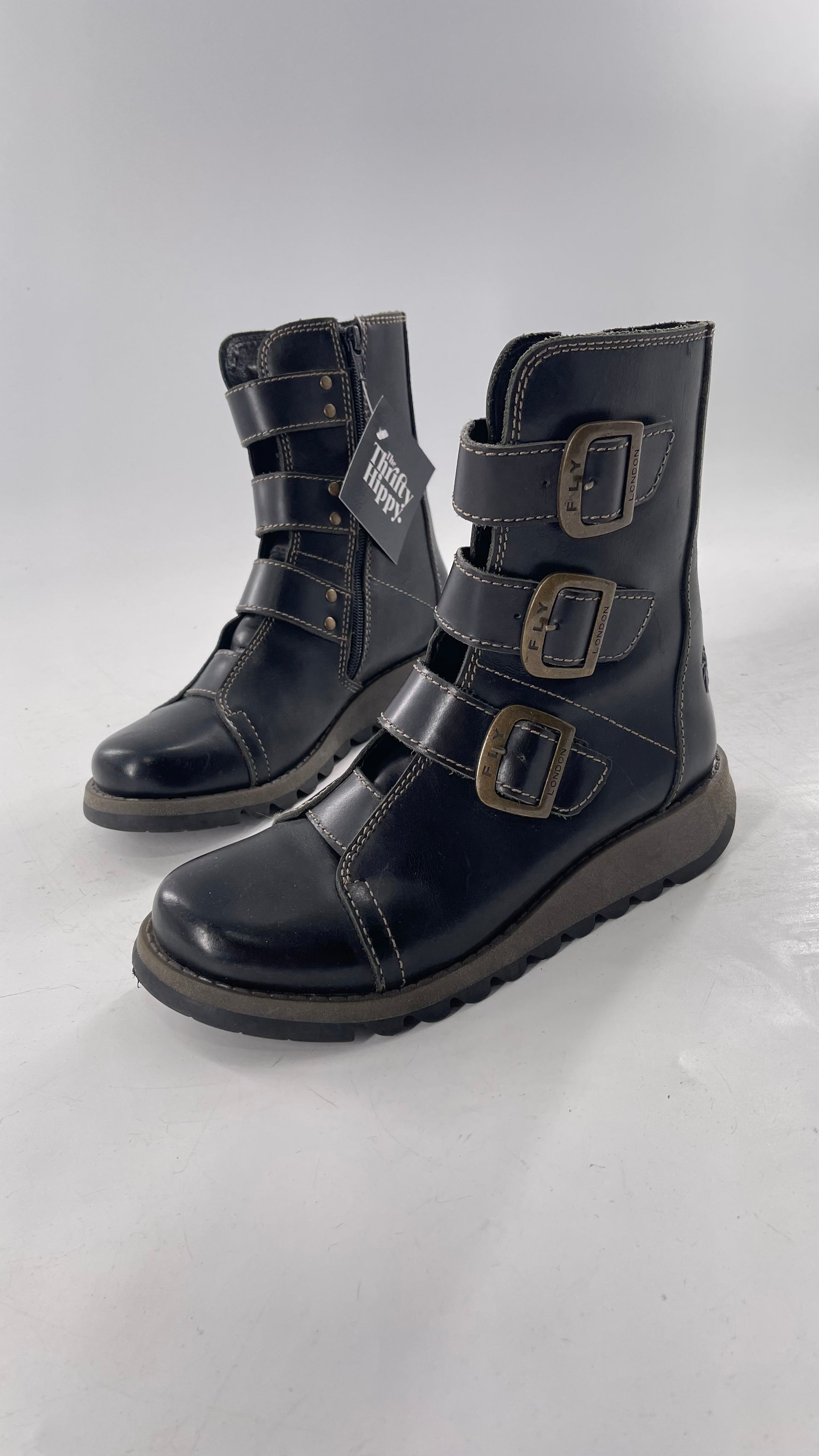 Fly London Black Zipper Side Boot with Oversized Brass Buckles (38)