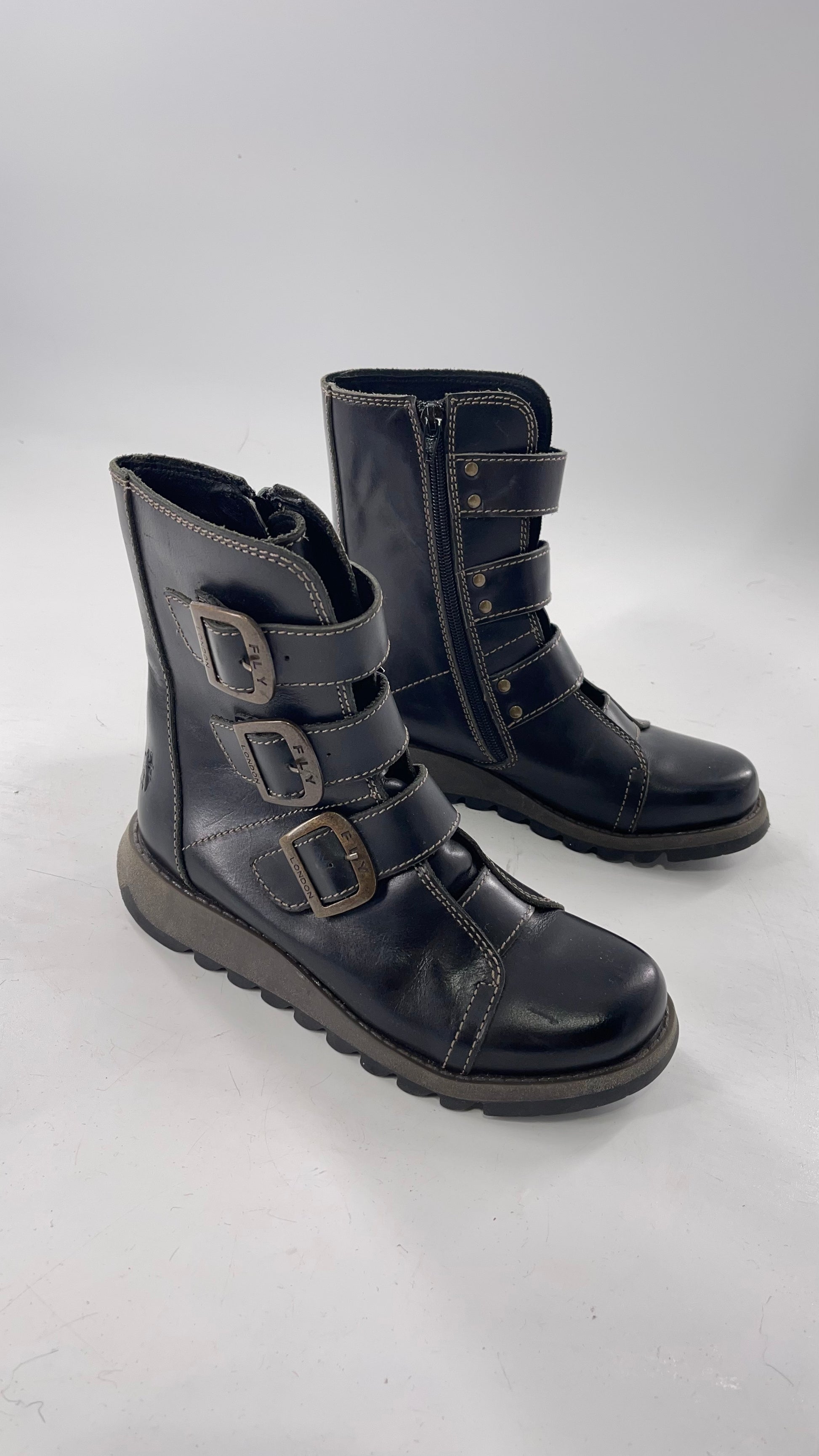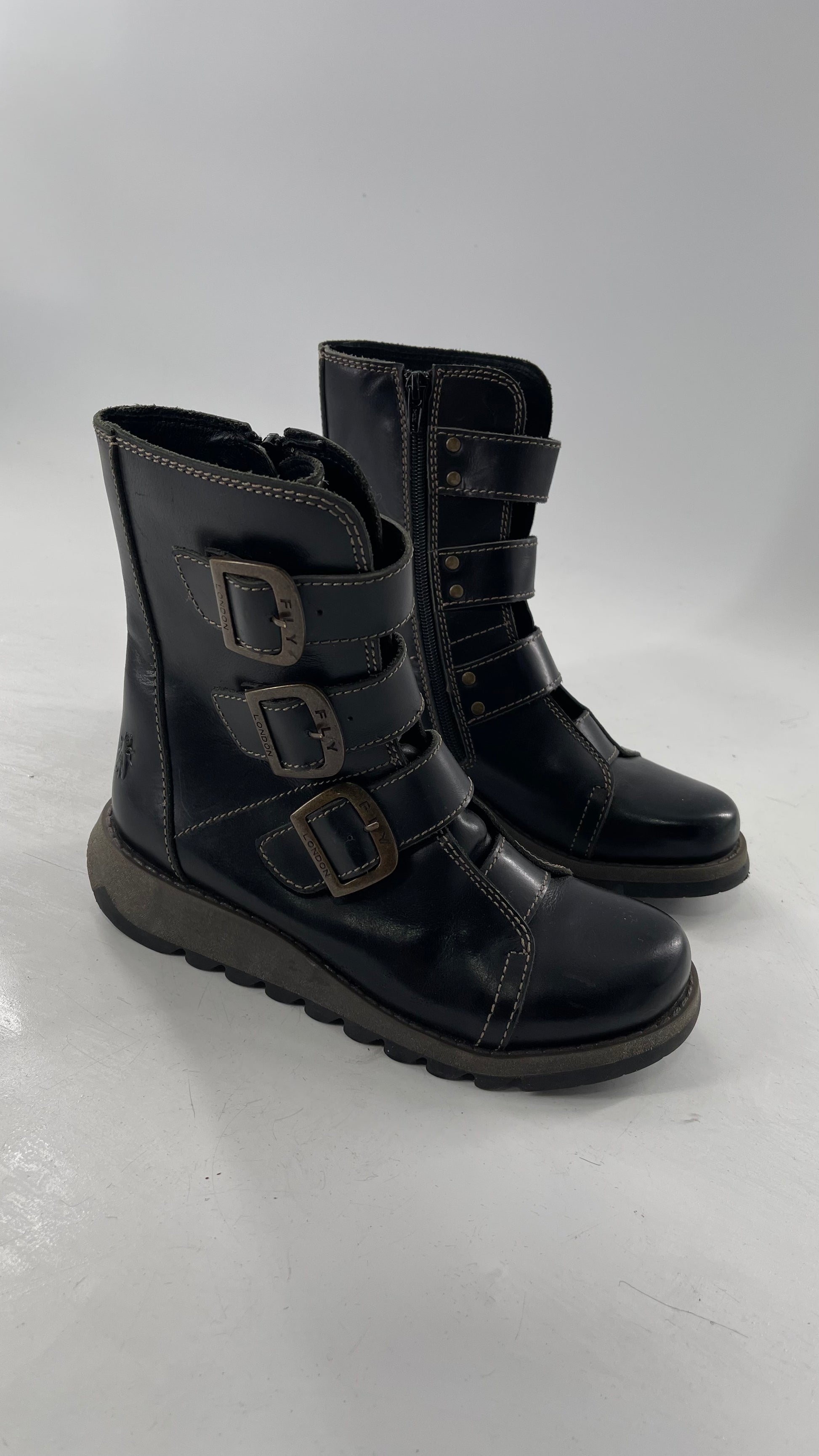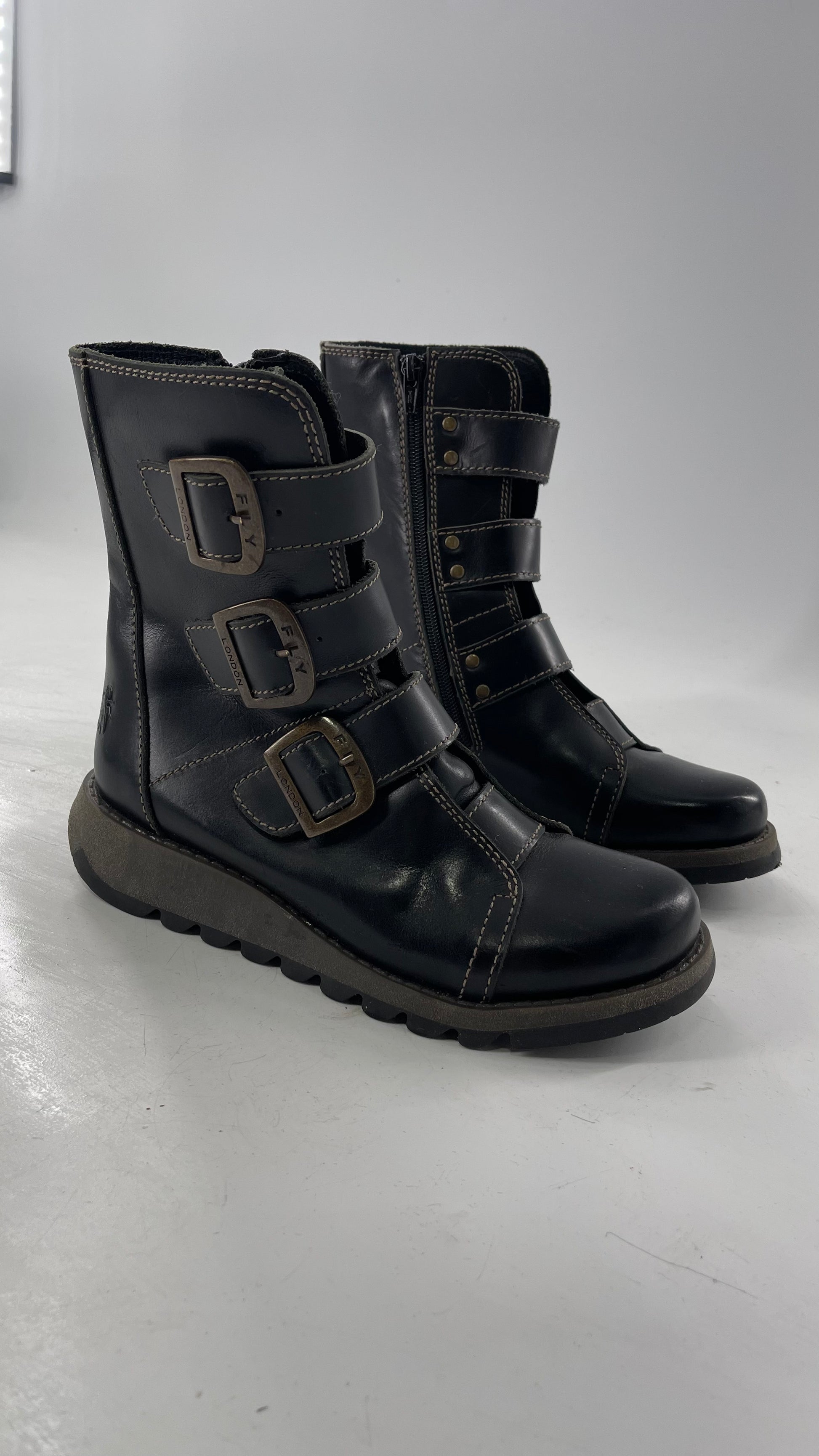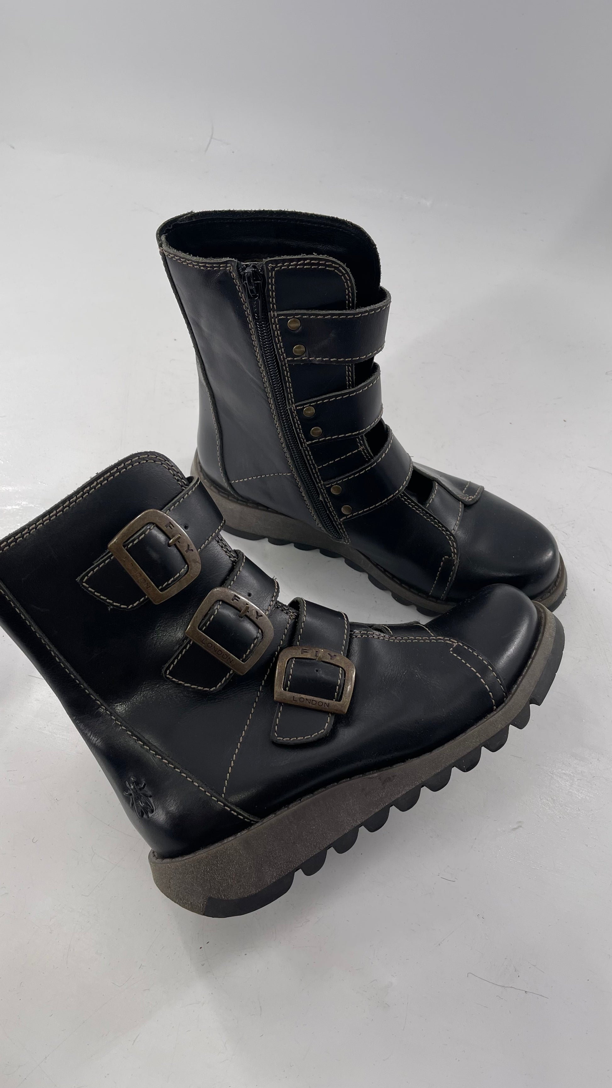 Fly London Black Zipper Side Biker Boot with Oversized Brass Buckles (38)