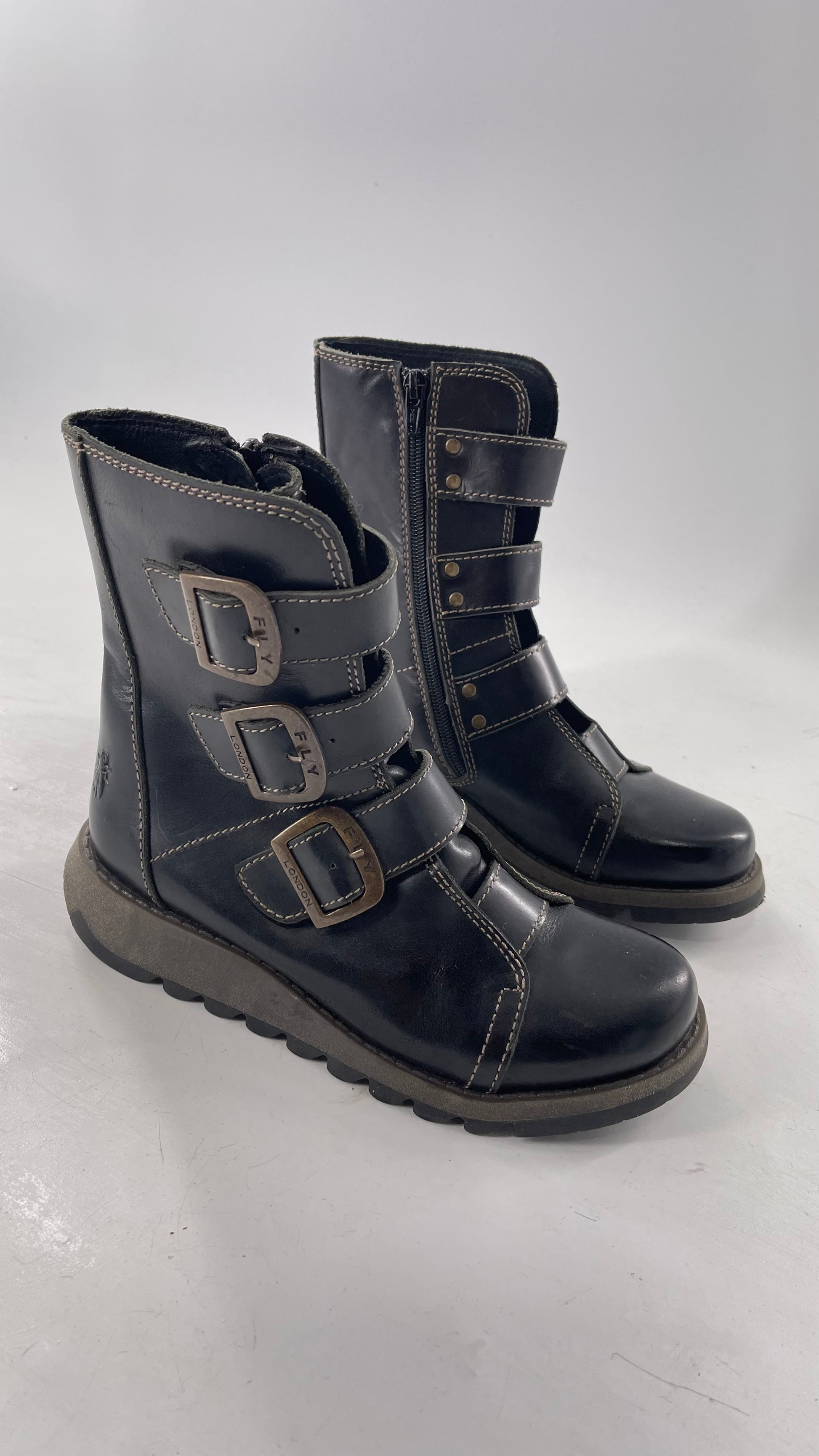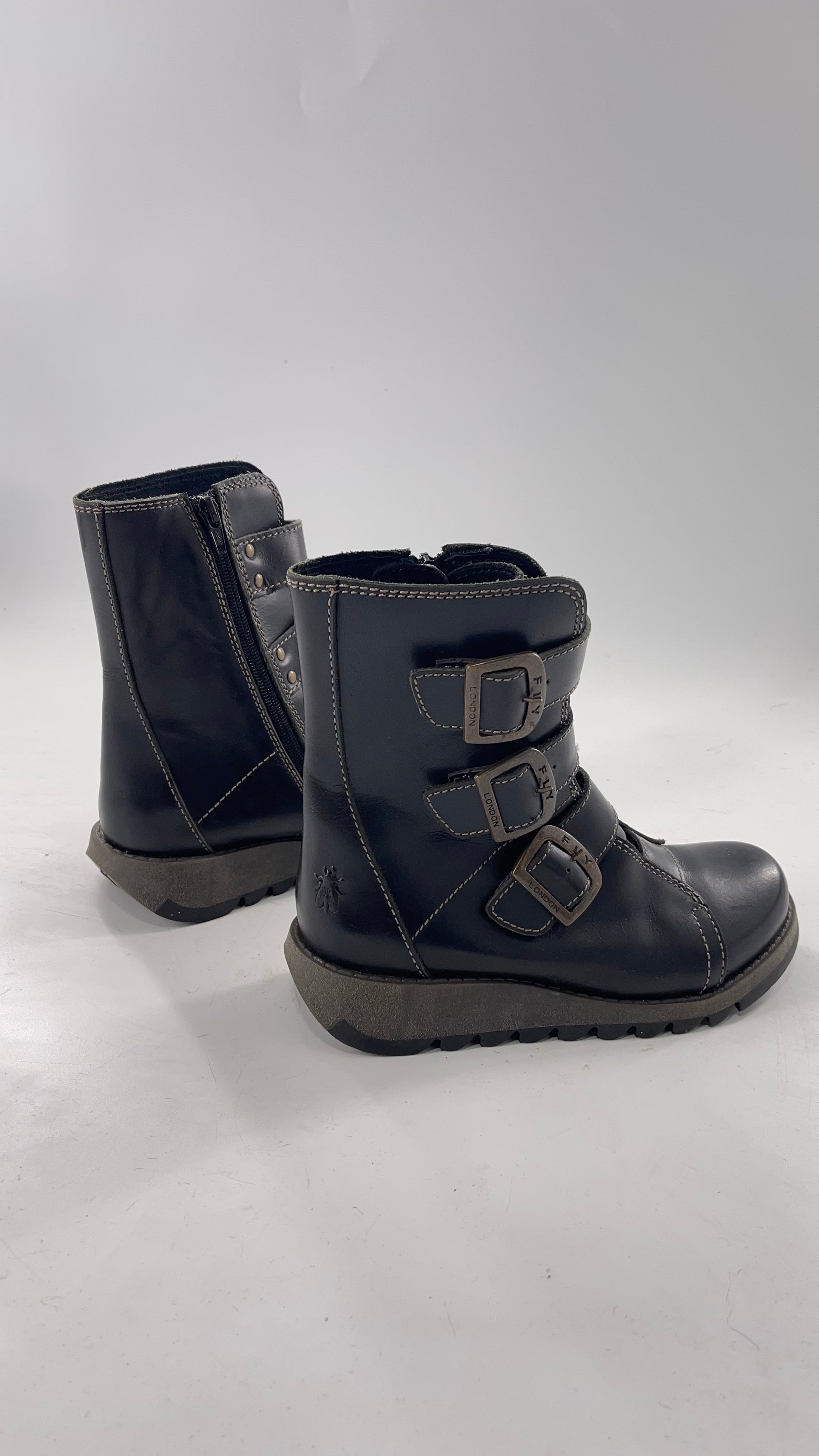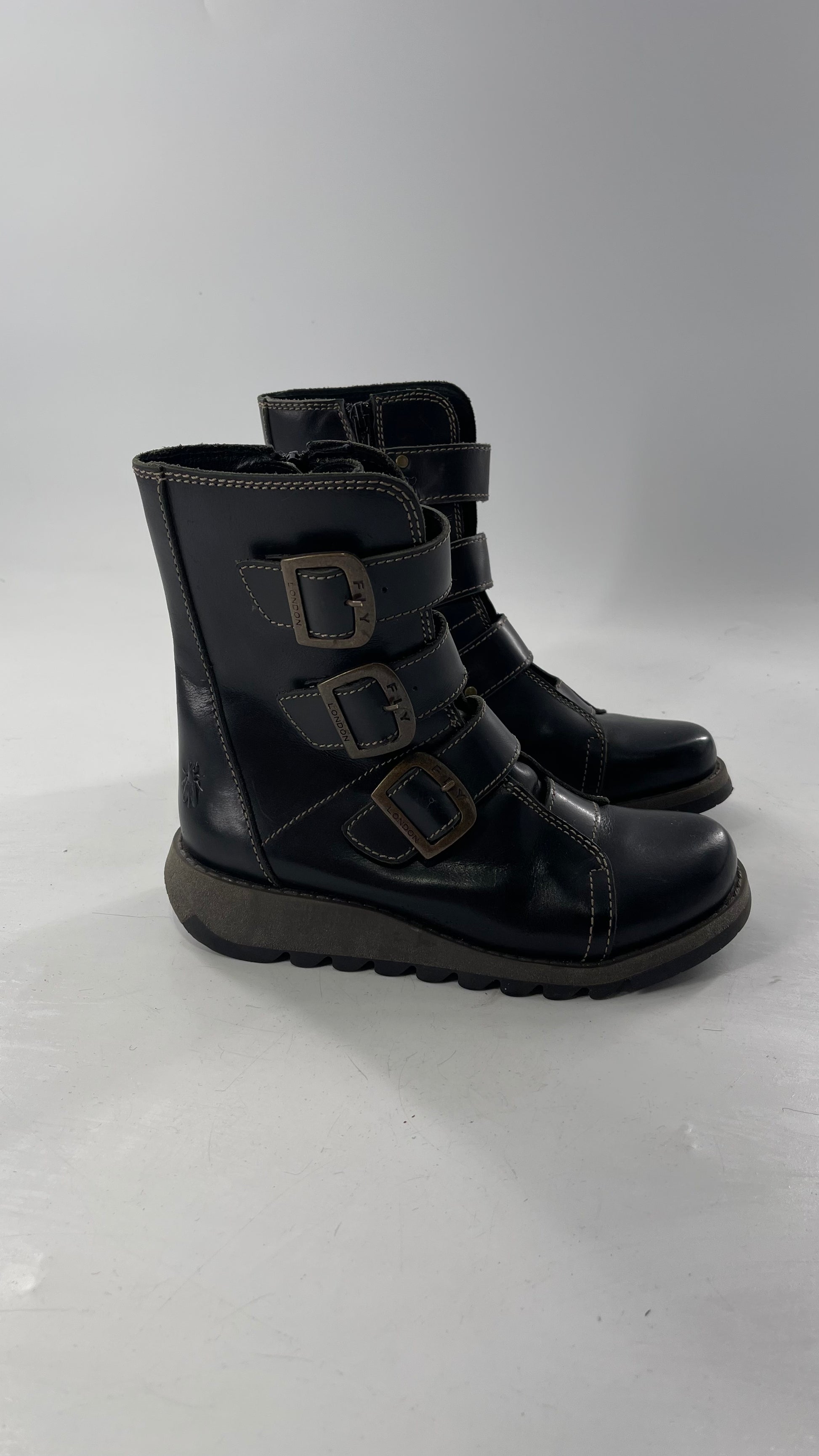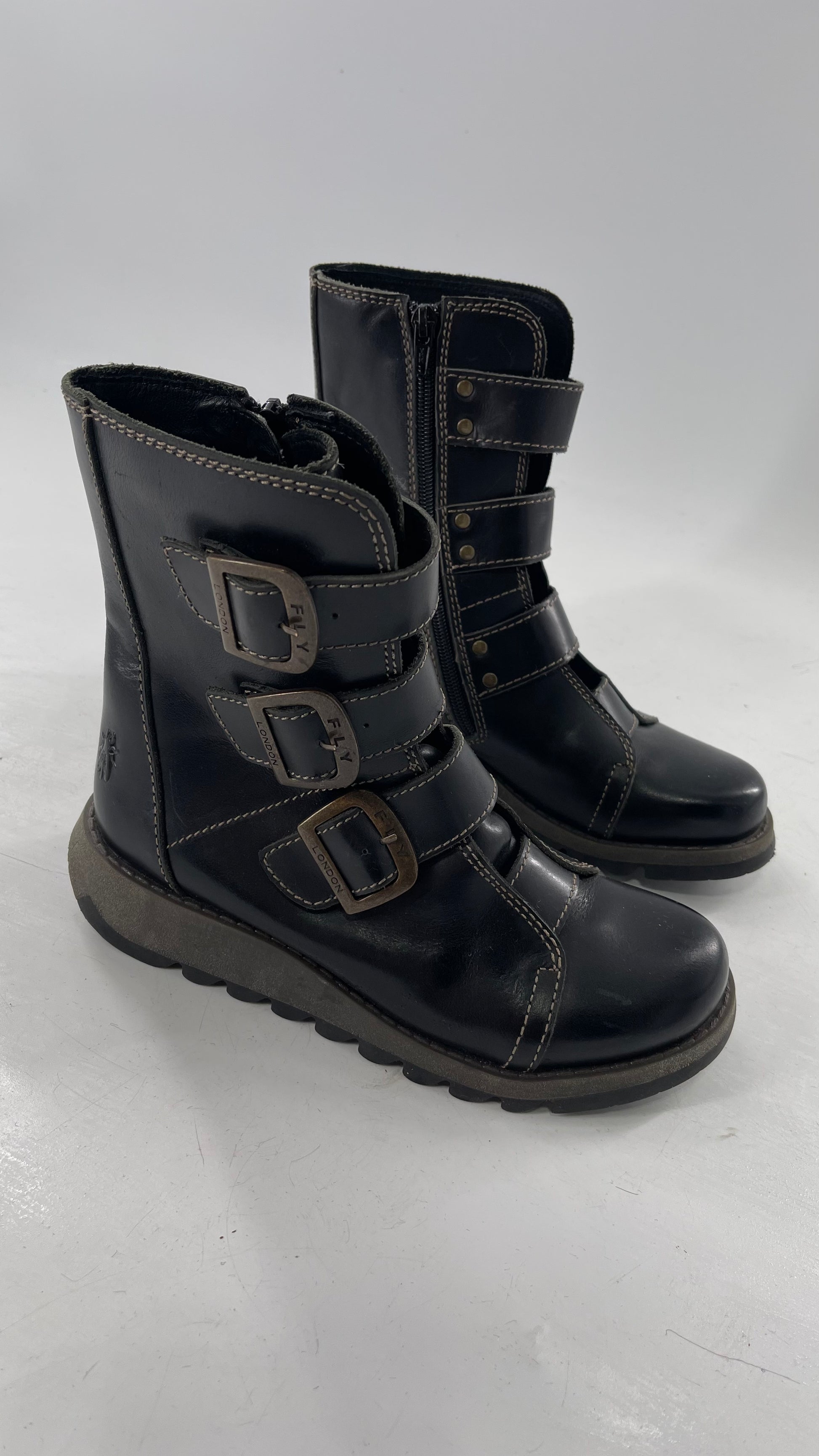 Fly London Black Zipper Side Biker Boot with Oversized Brass Buckles (38)