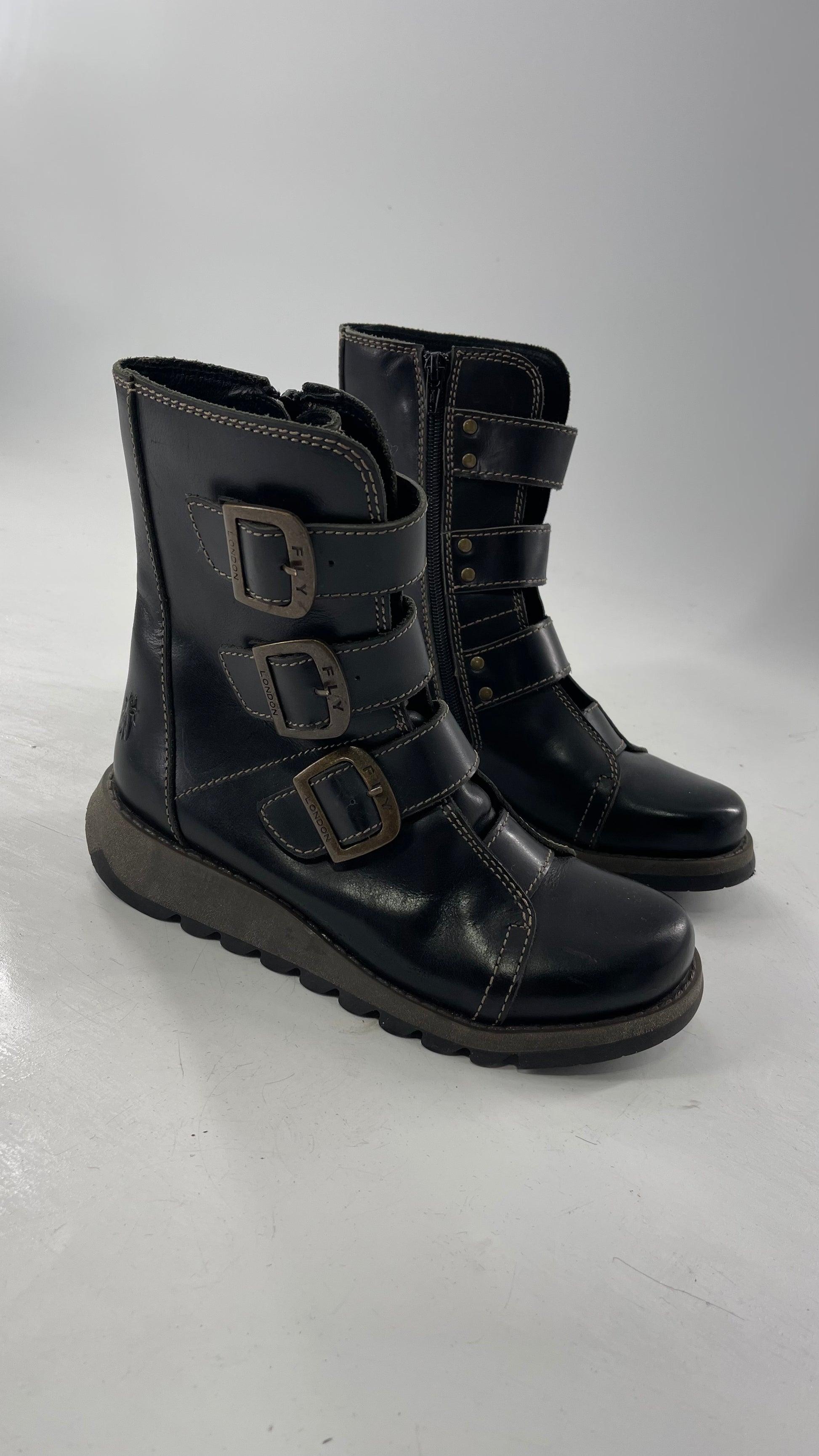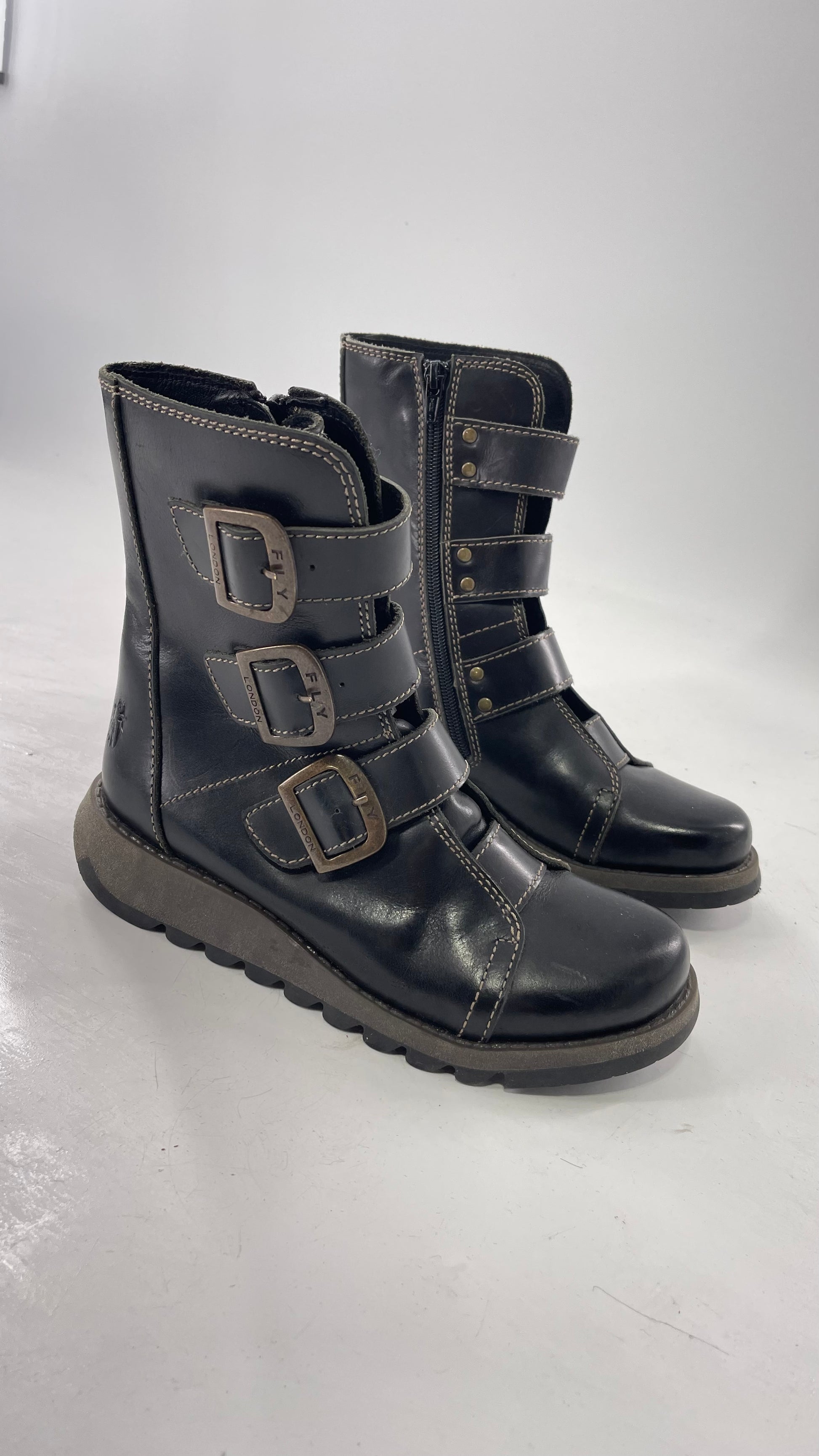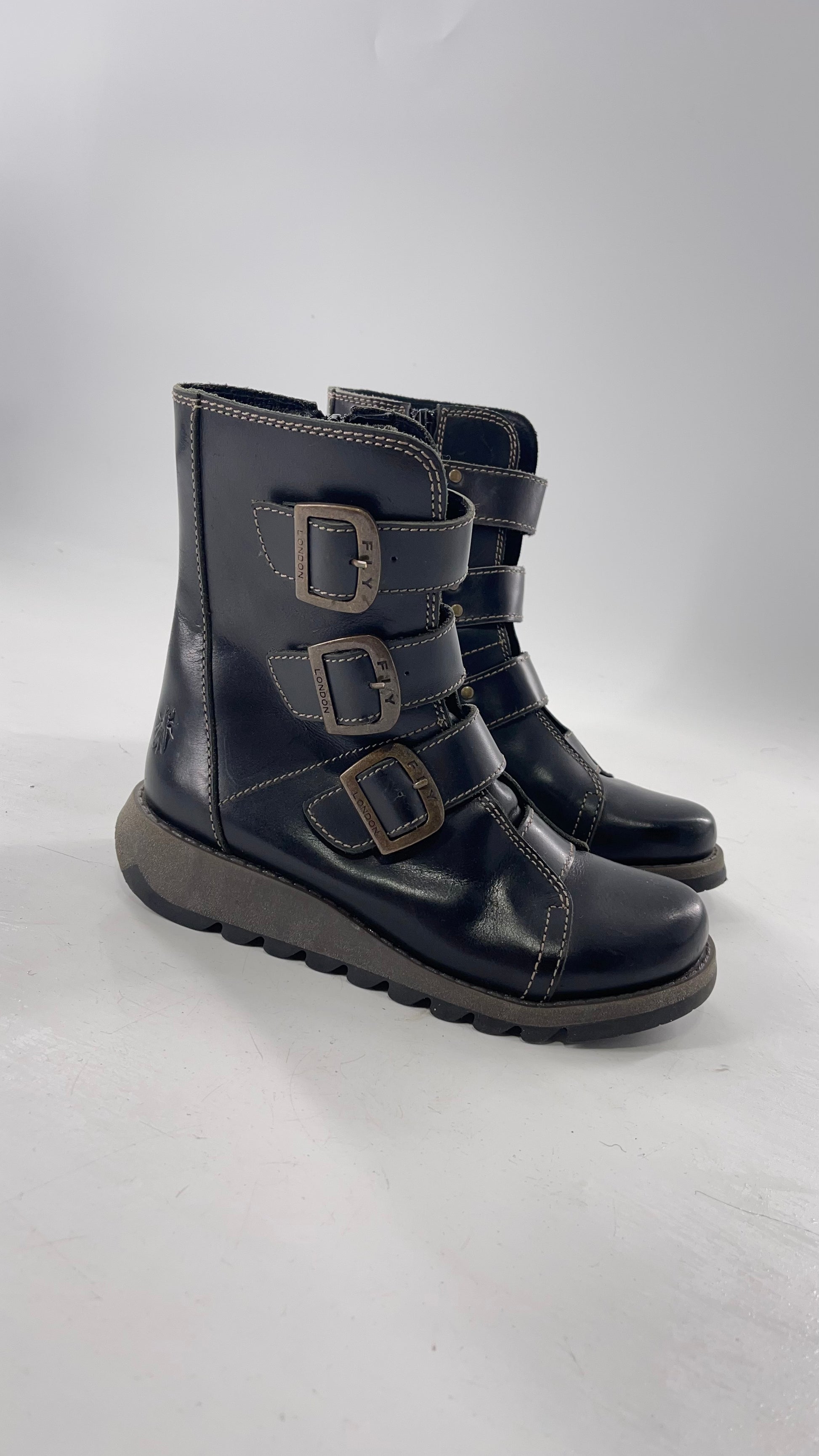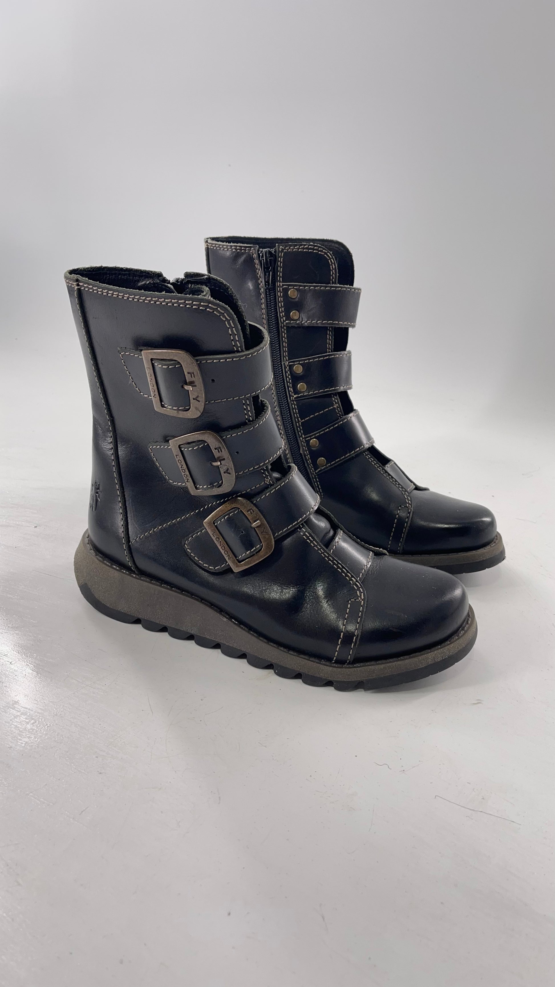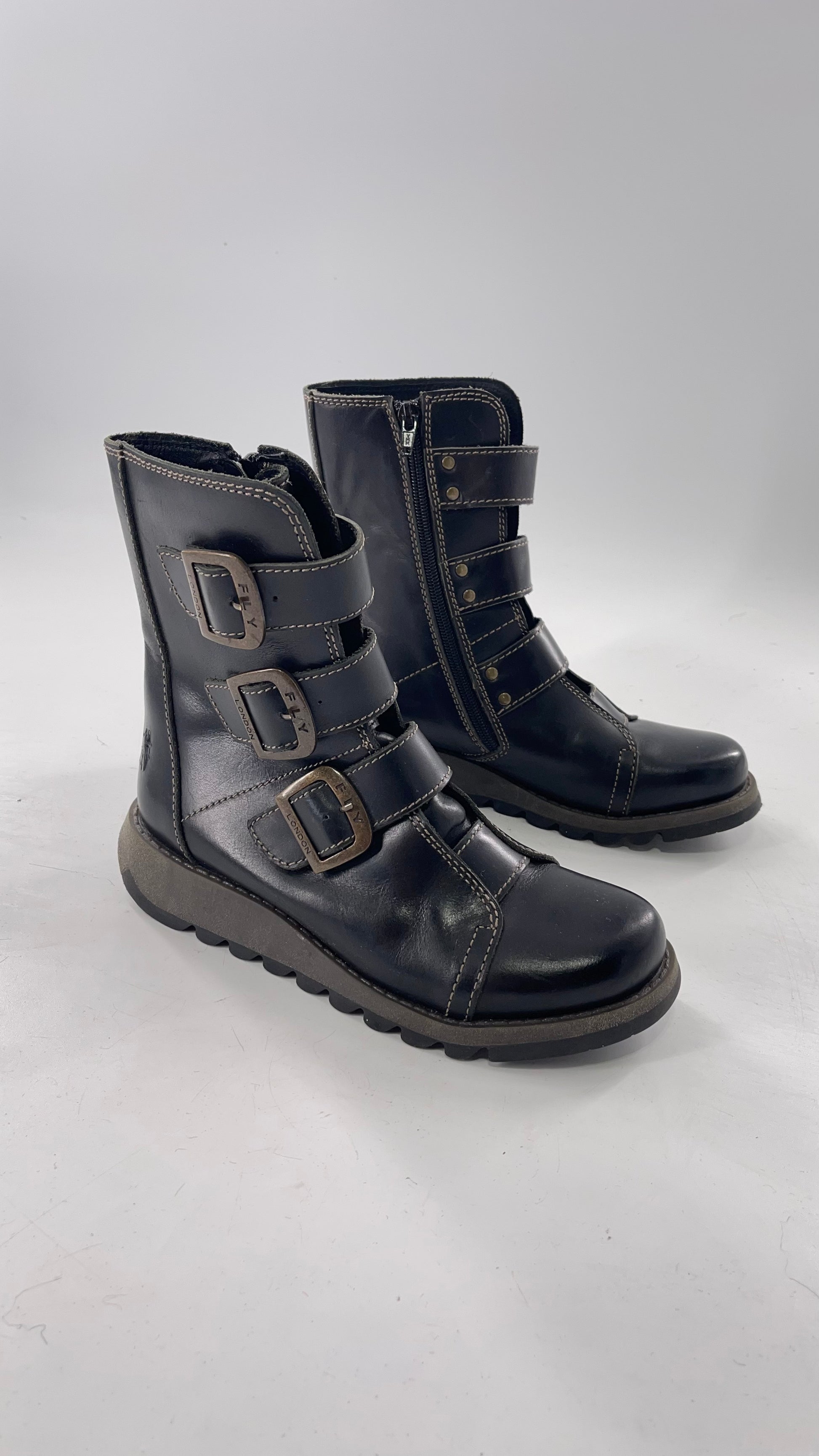 Fly London Black Zipper Side Biker Boot with Oversized Brass Buckles (38)