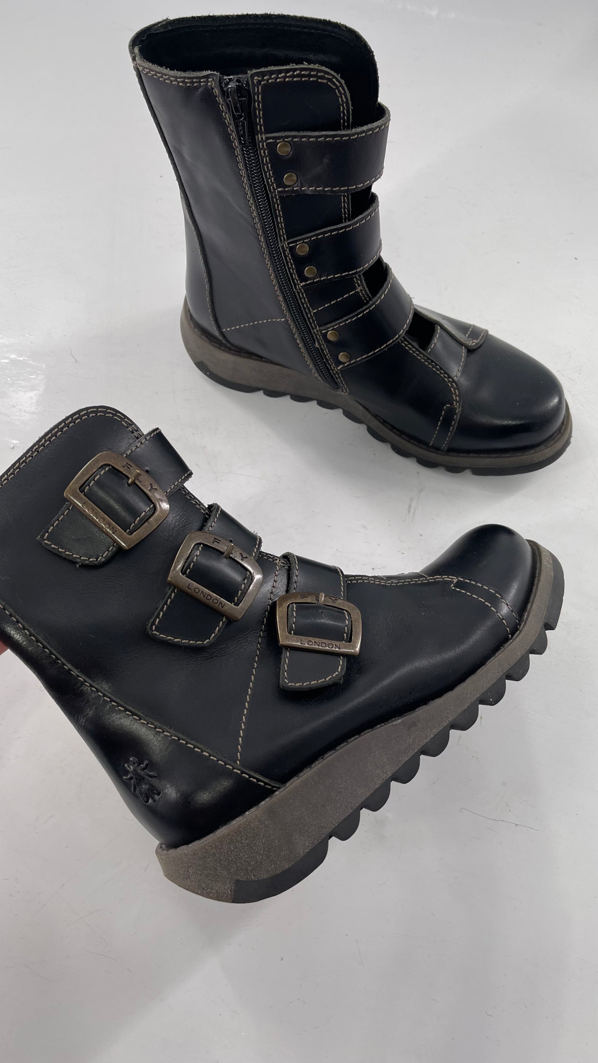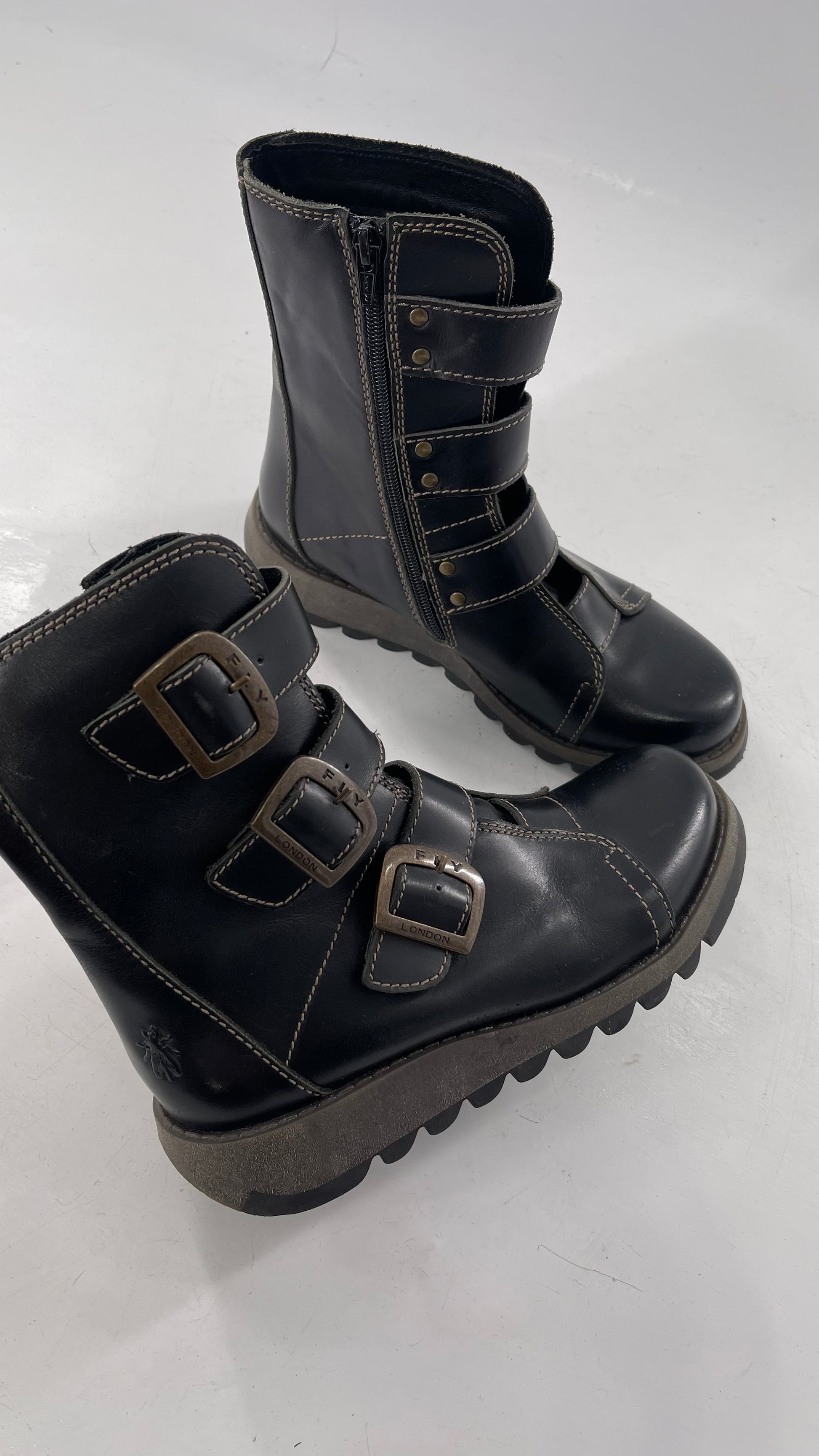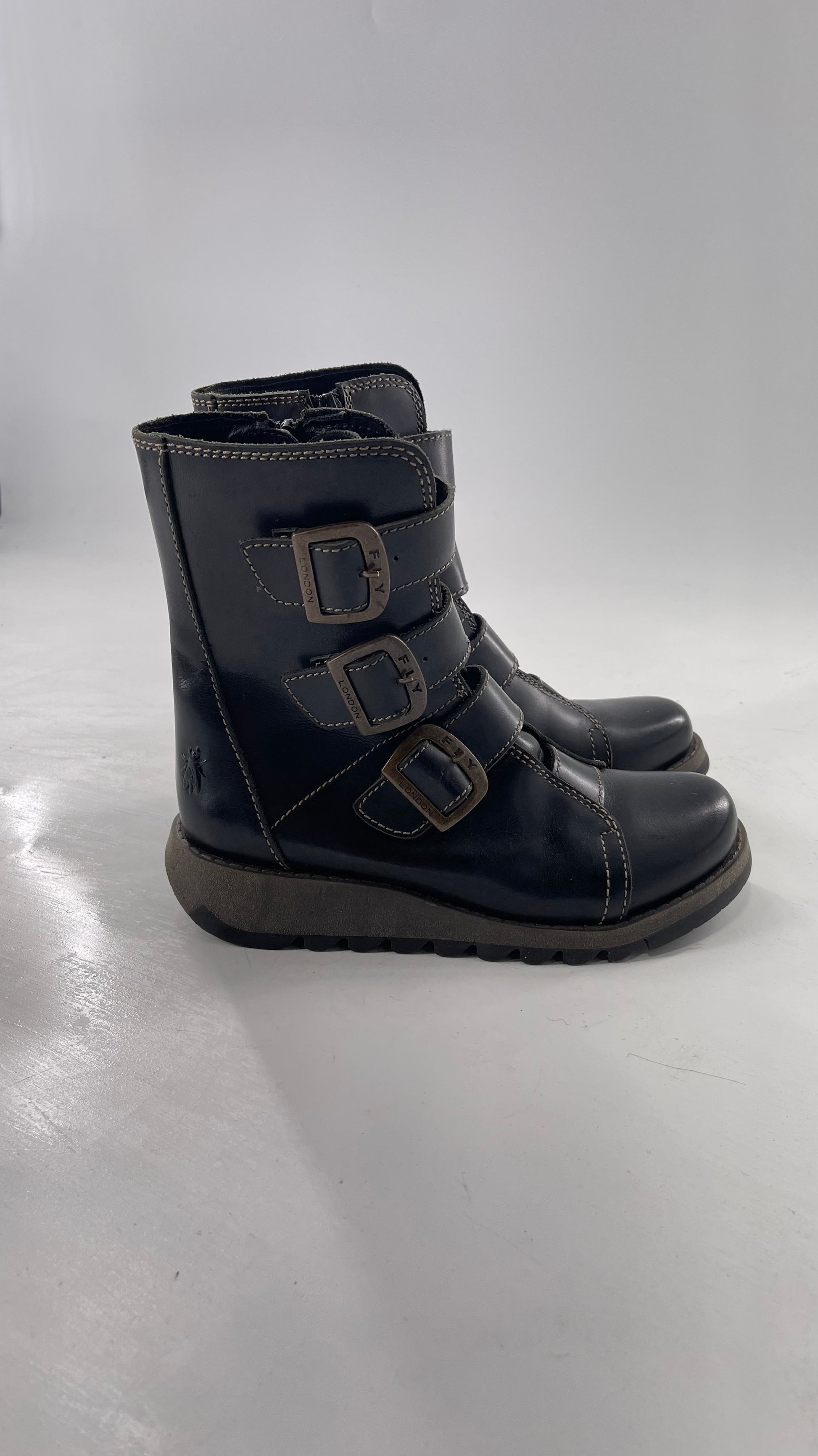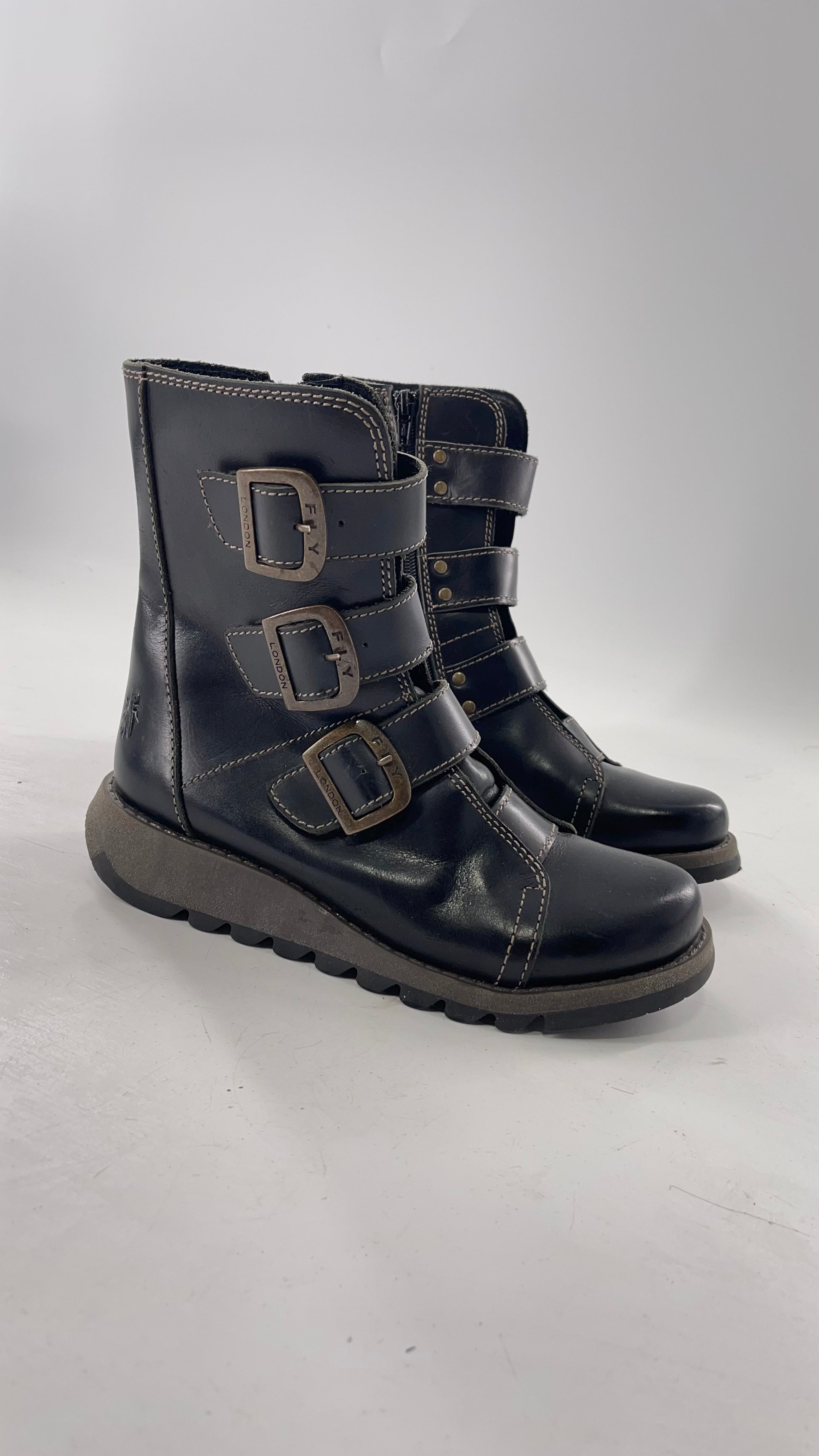 Fly London Black Zipper Side Biker Boot with Oversized Brass Buckles (38)