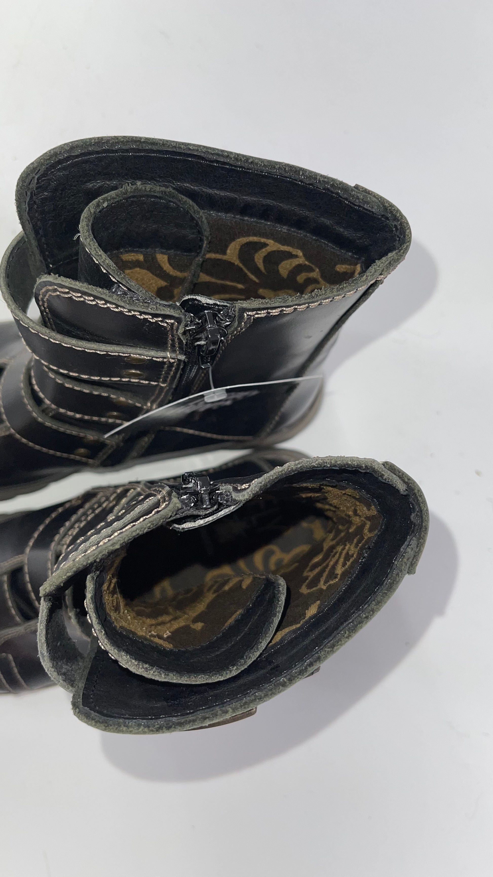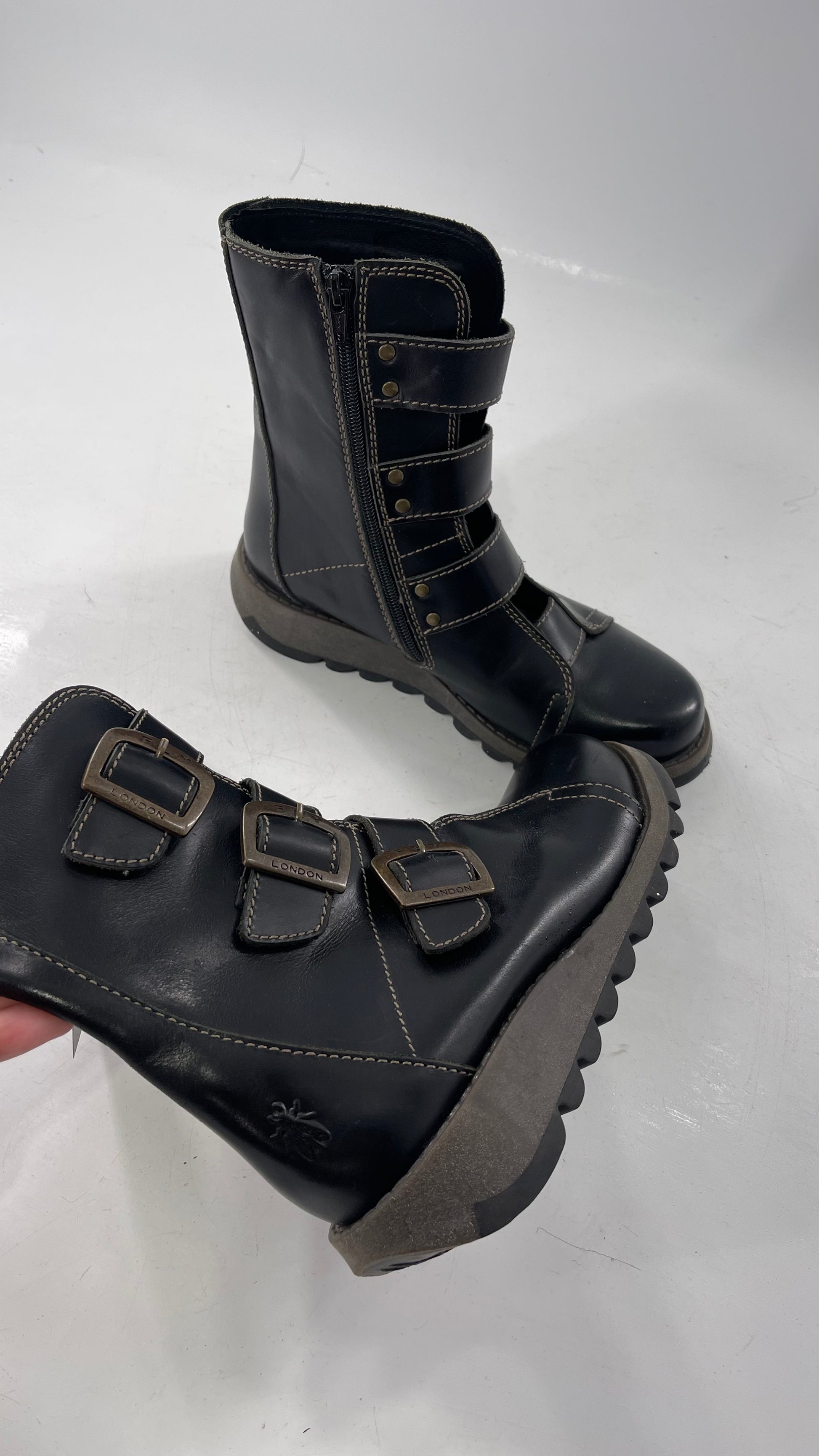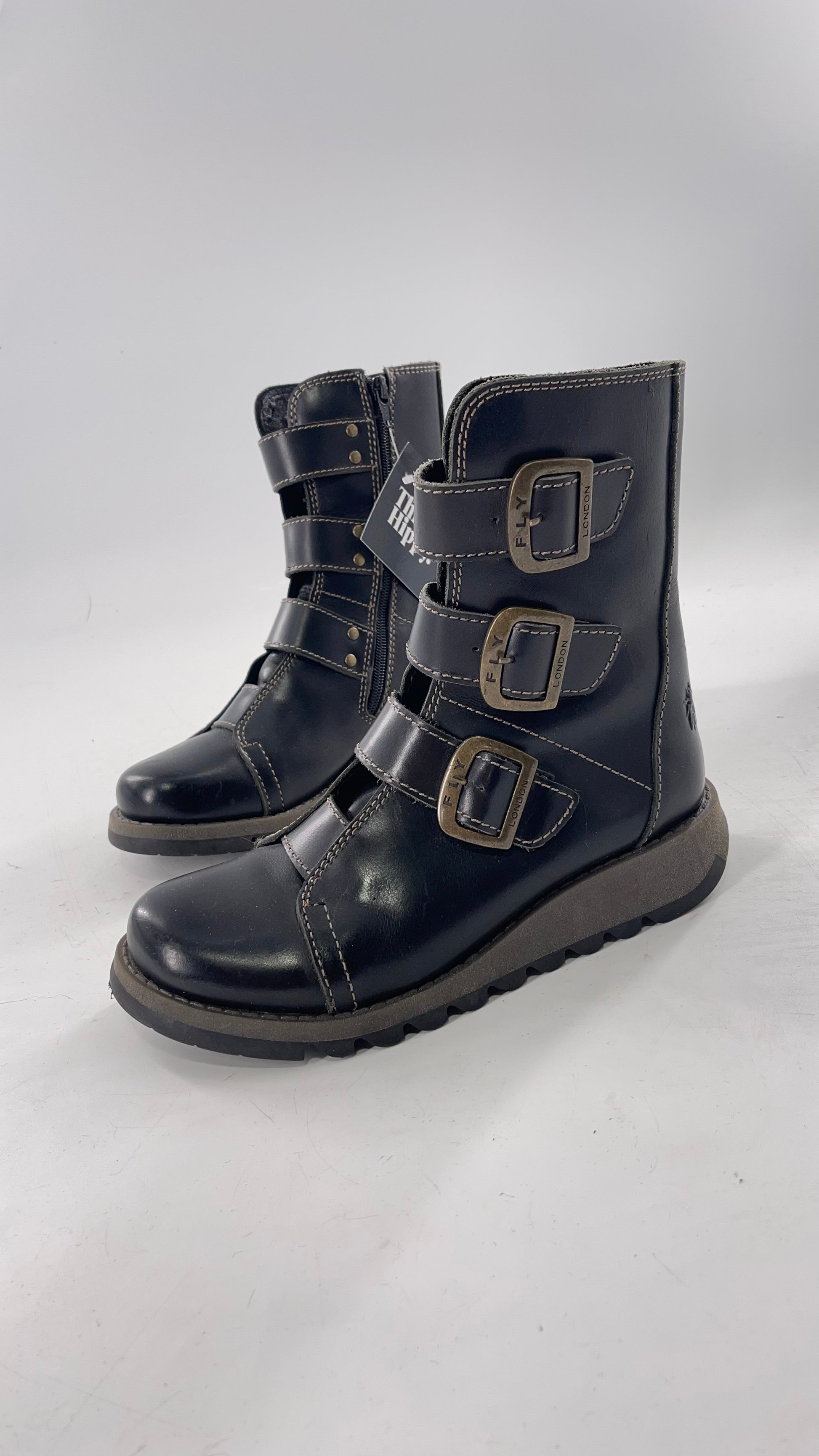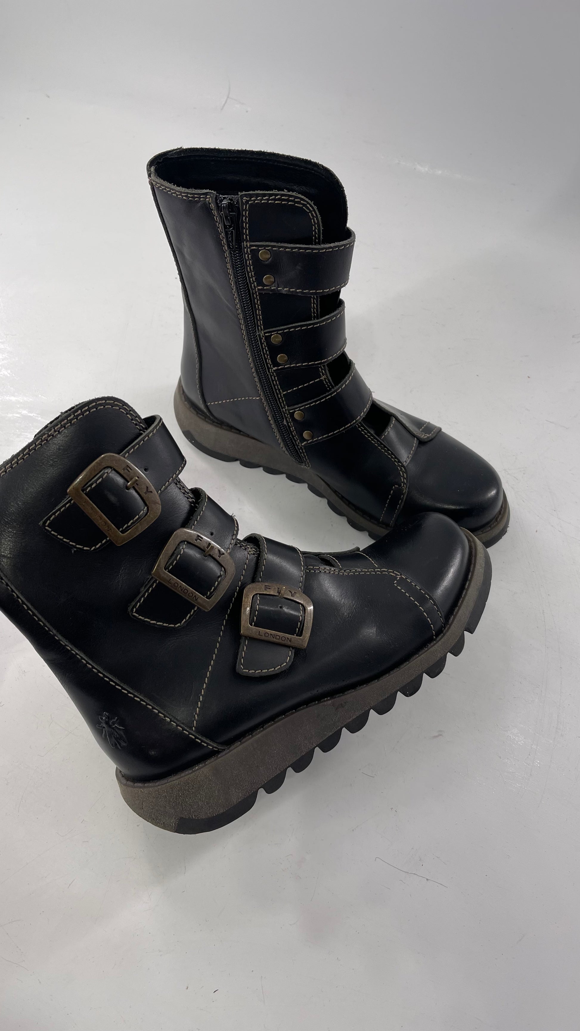 Fly London Black Zipper Side Biker Boot with Oversized Brass Buckles (38)