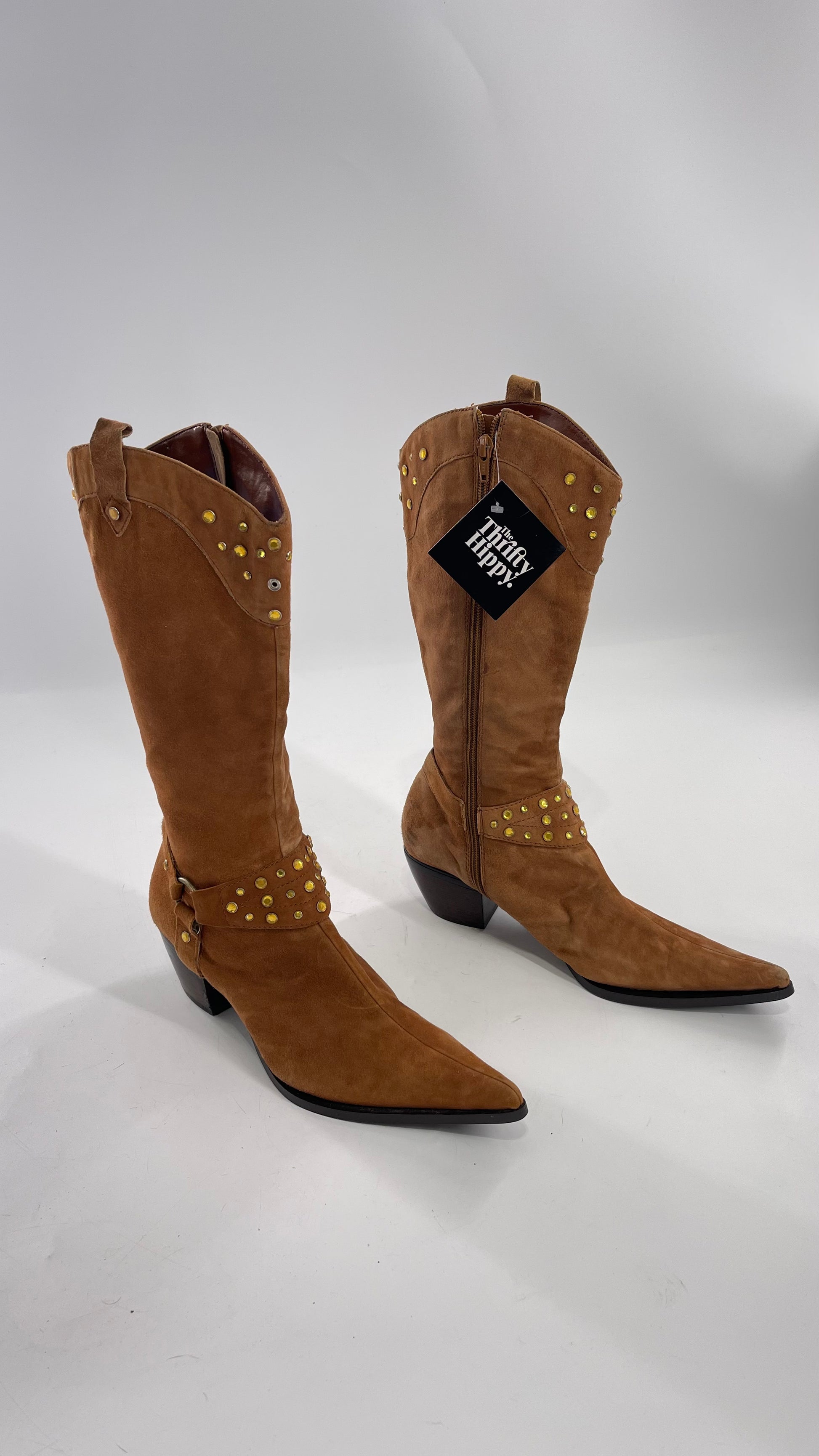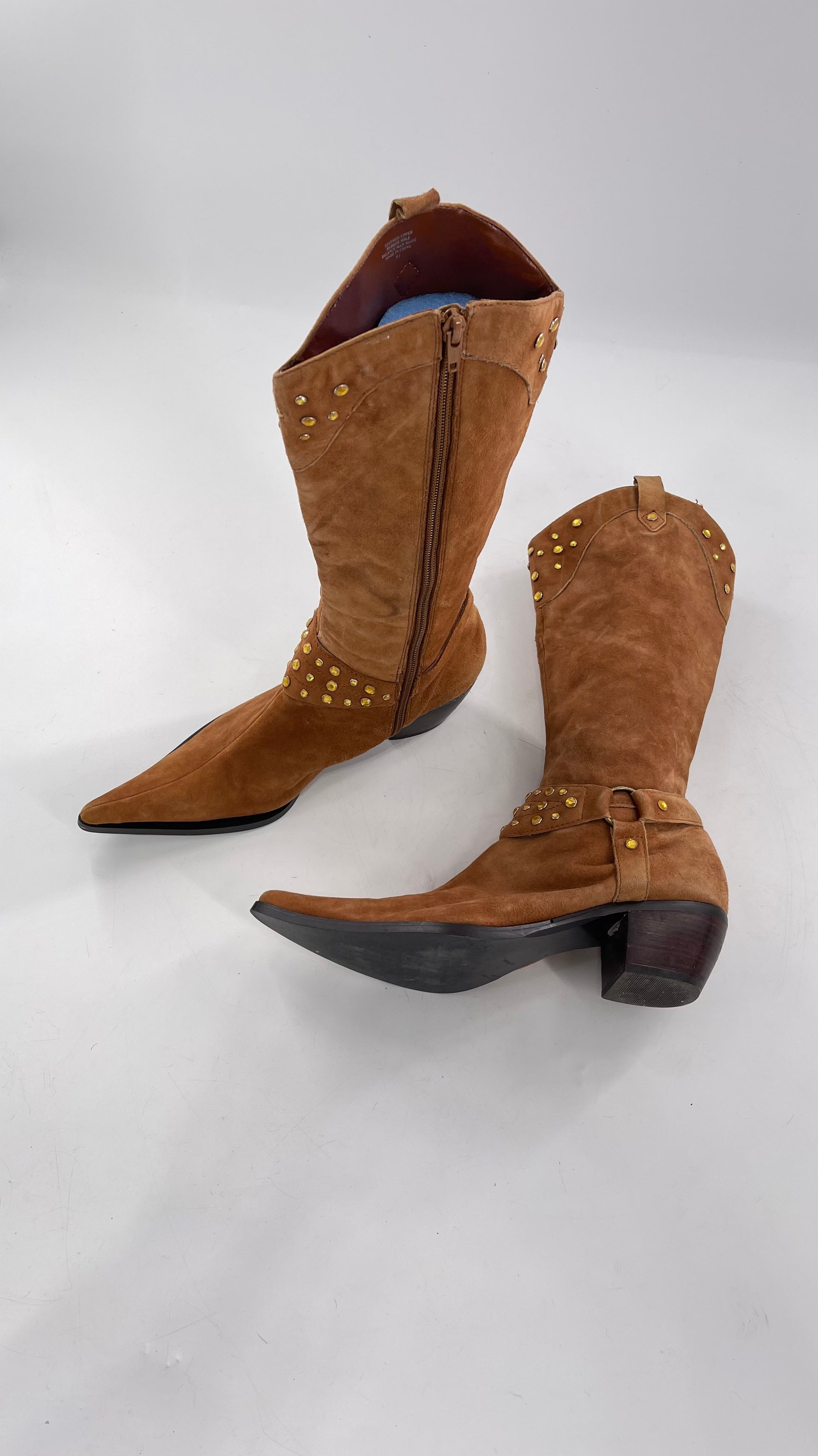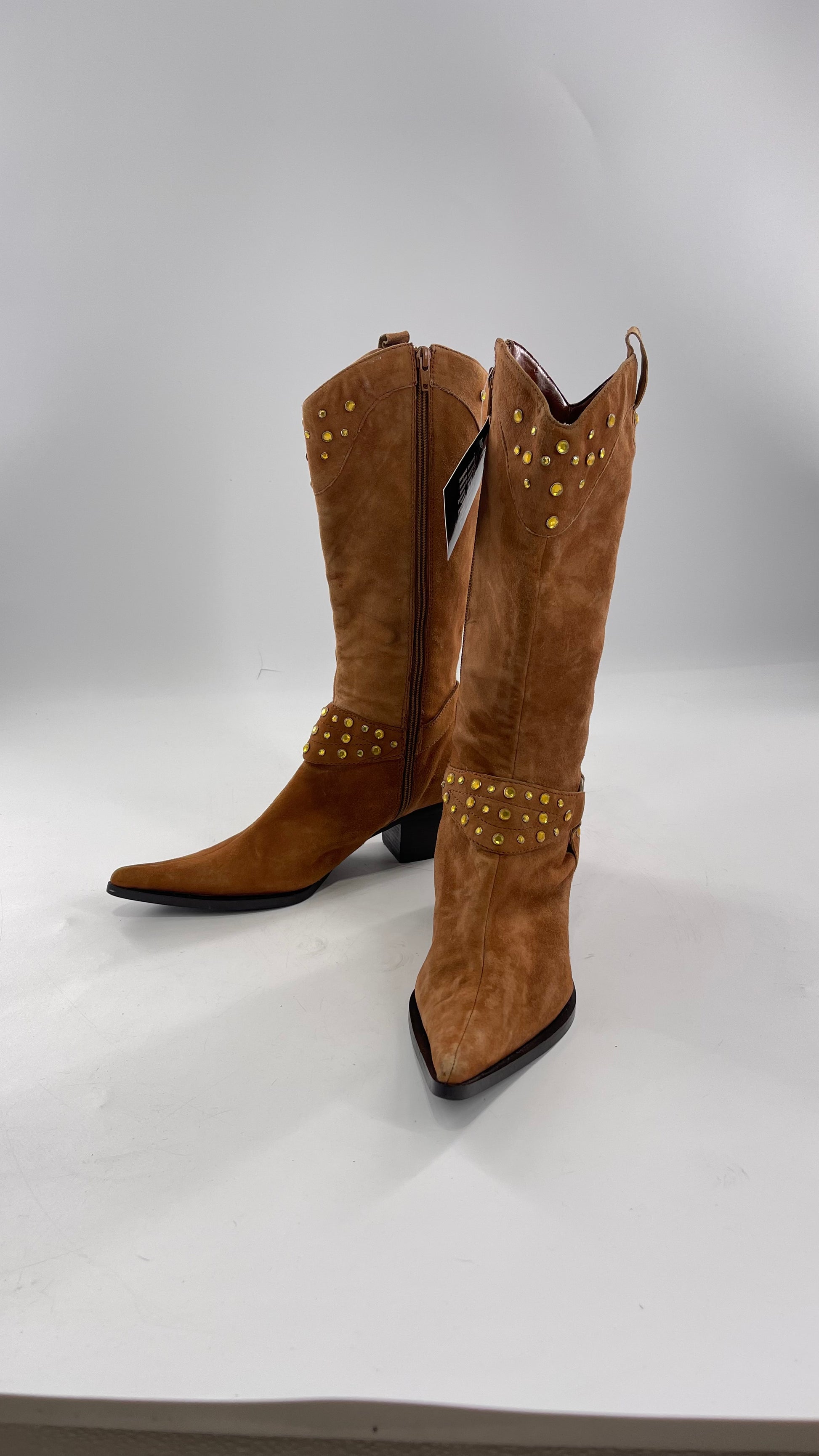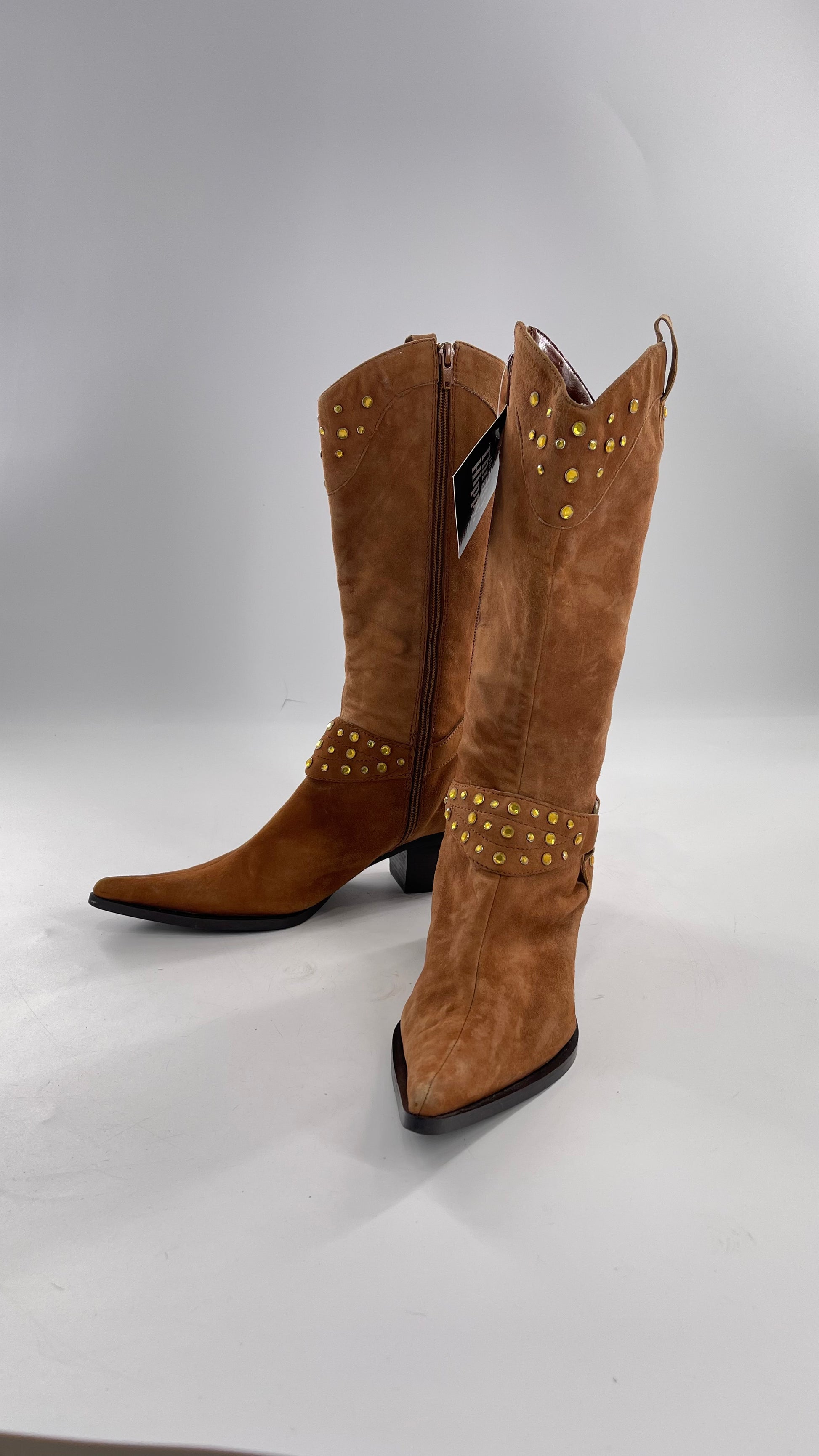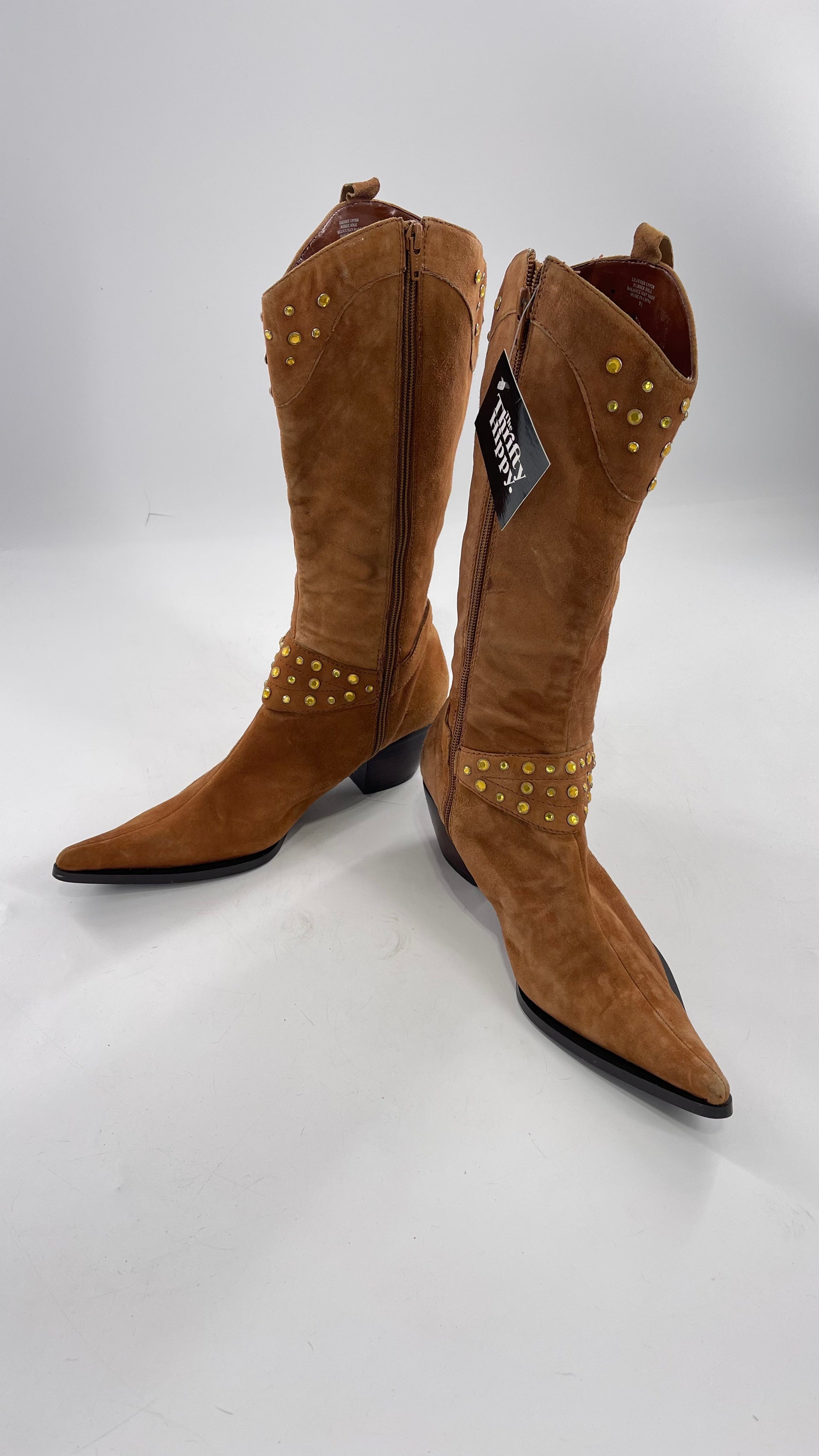 Vintage Tan Suede Pointed Cowboy Boots with Yellow Crystal Embellishments (9.5)