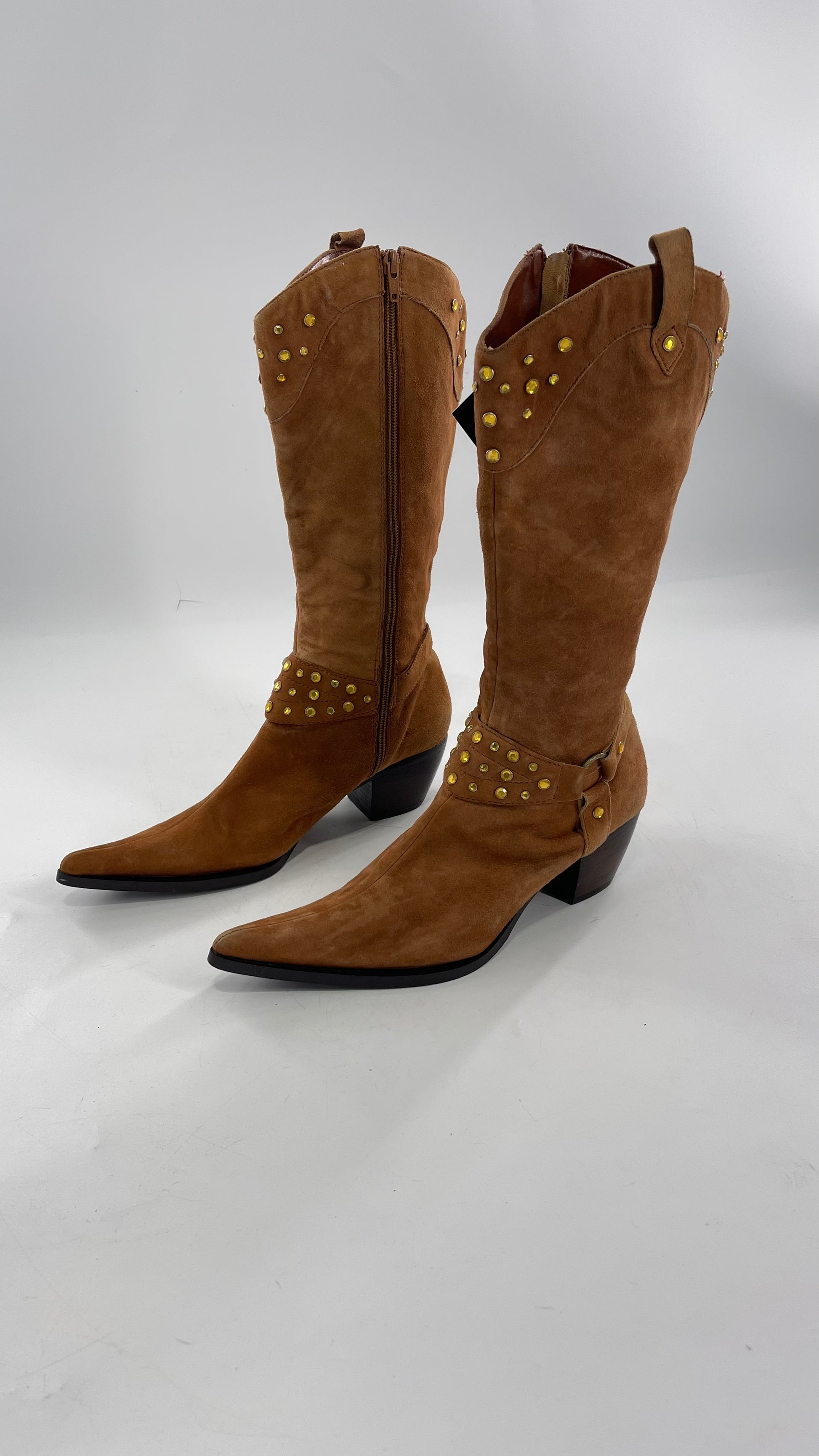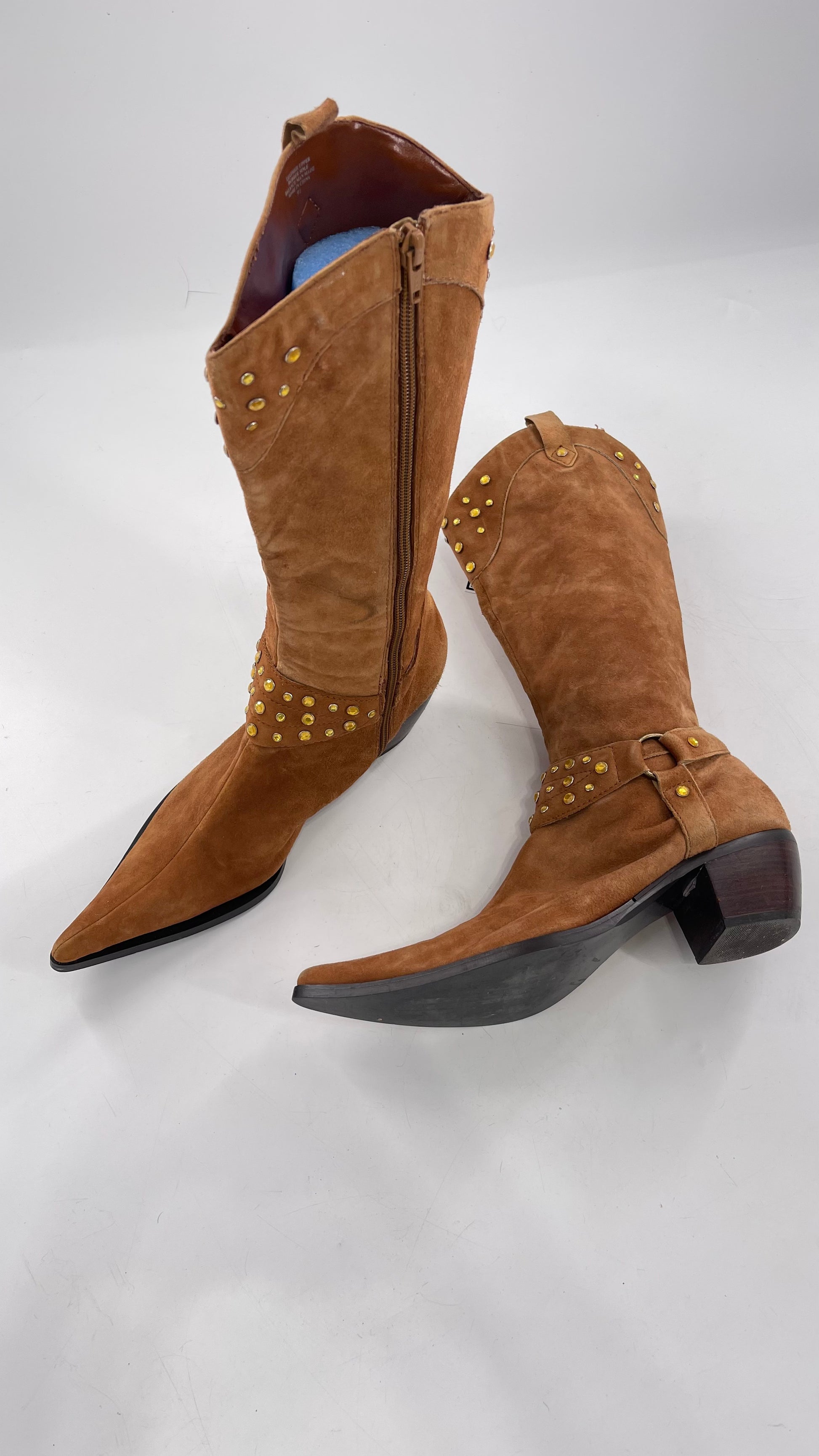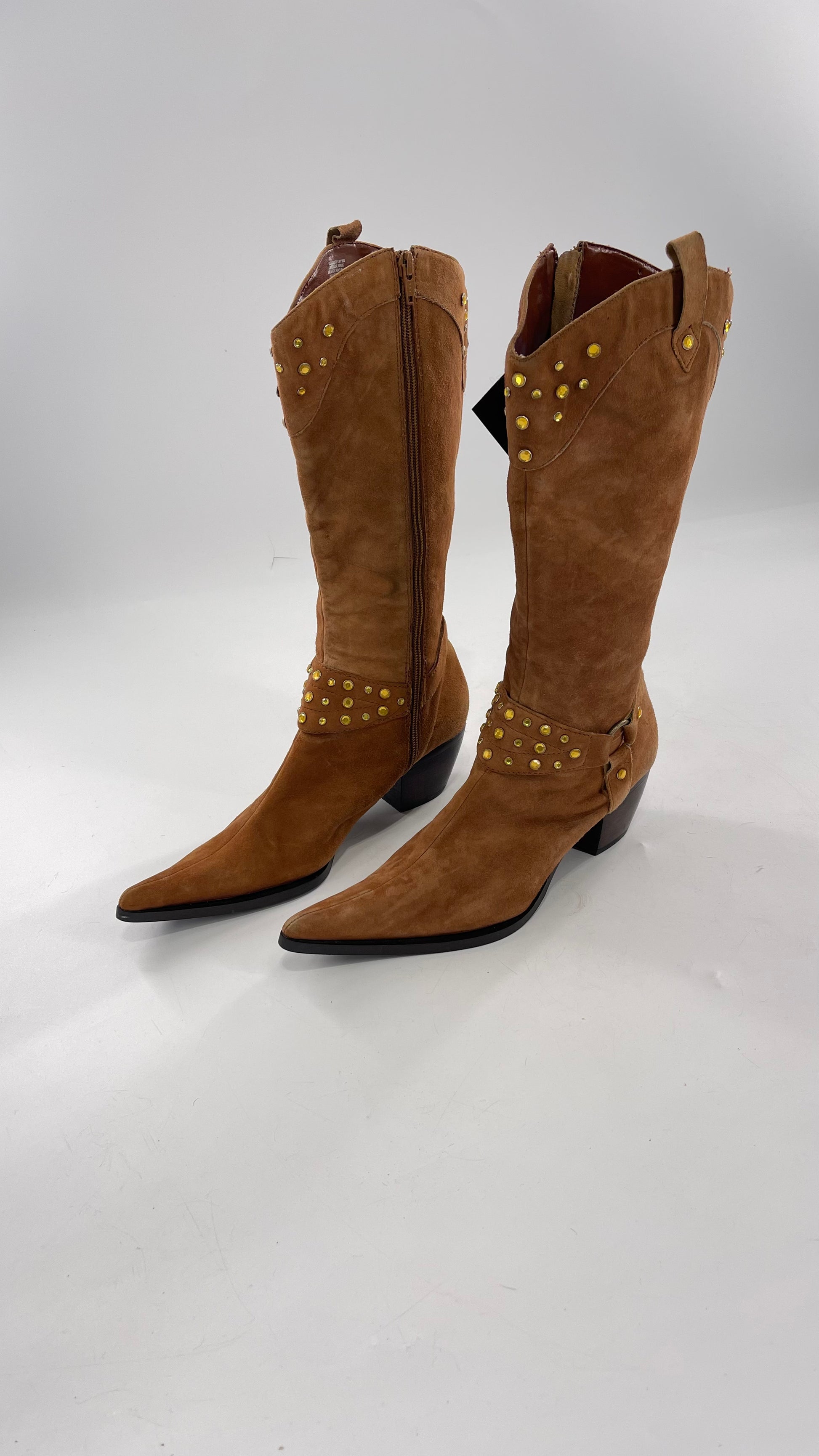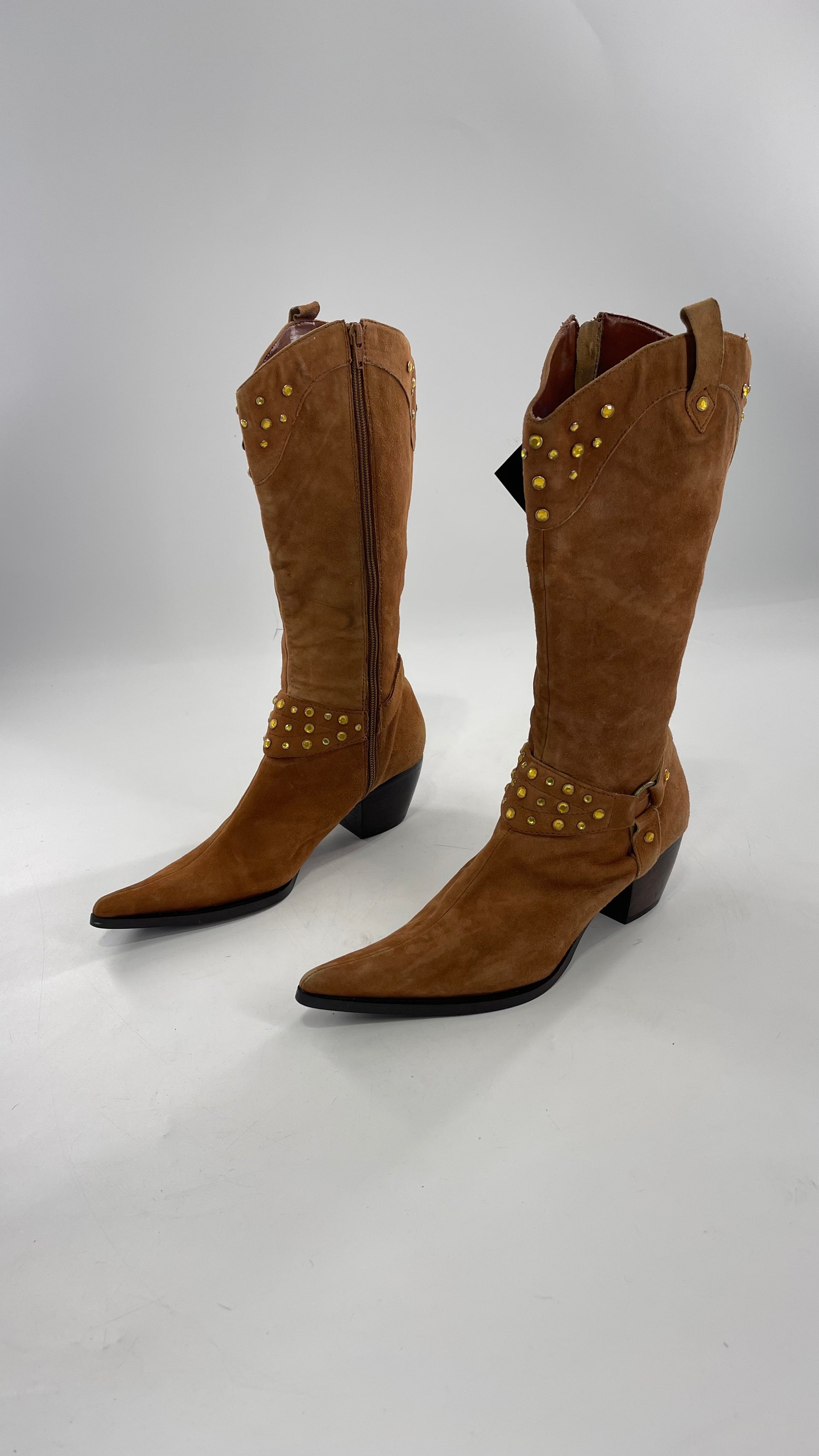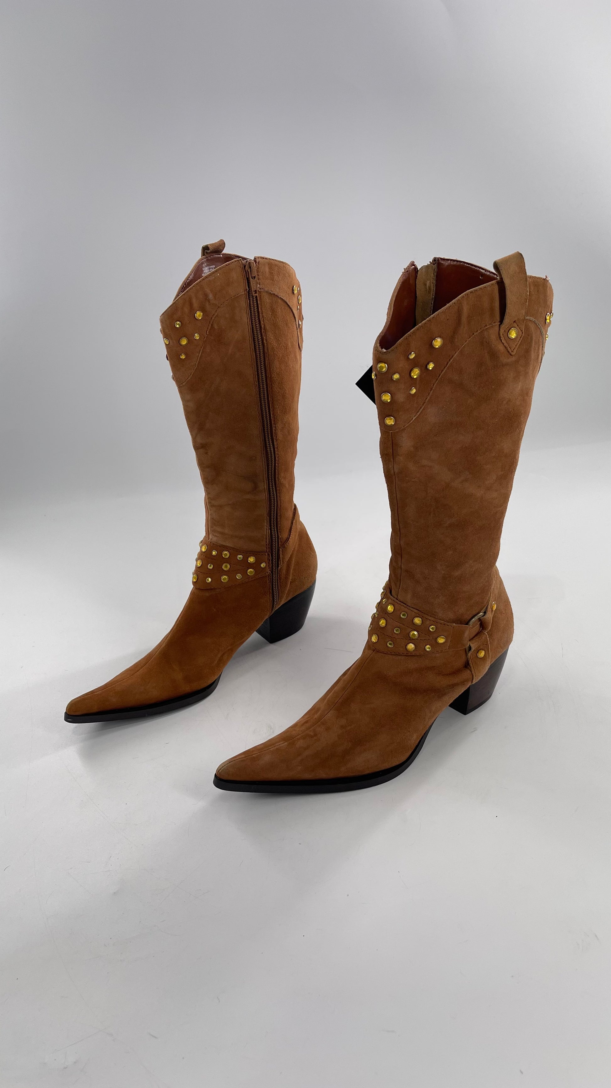 Vintage Tan Suede Pointed Cowboy Boots with Yellow Crystal Embellishments (9.5)