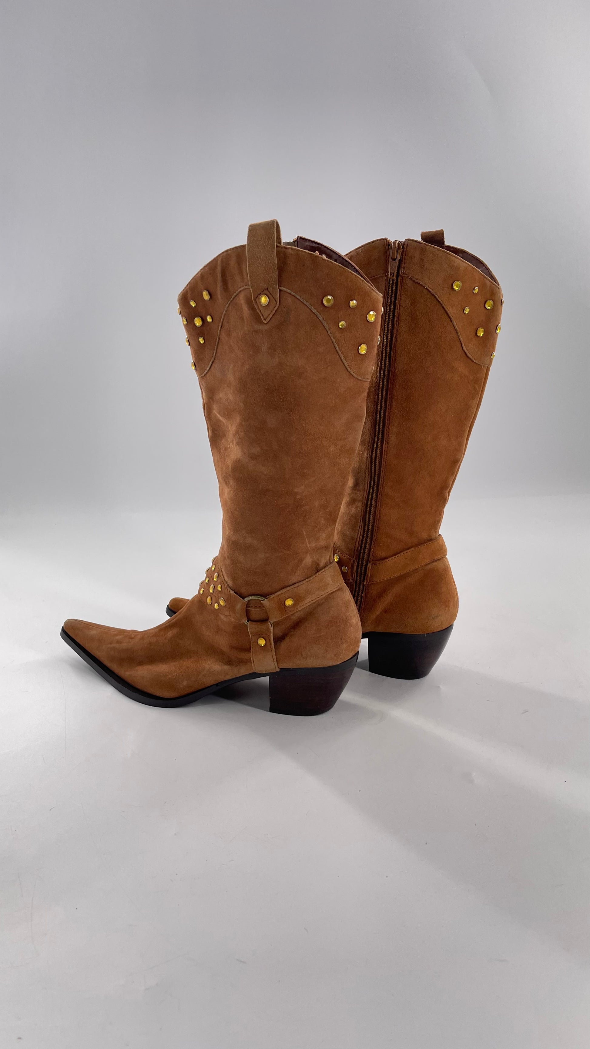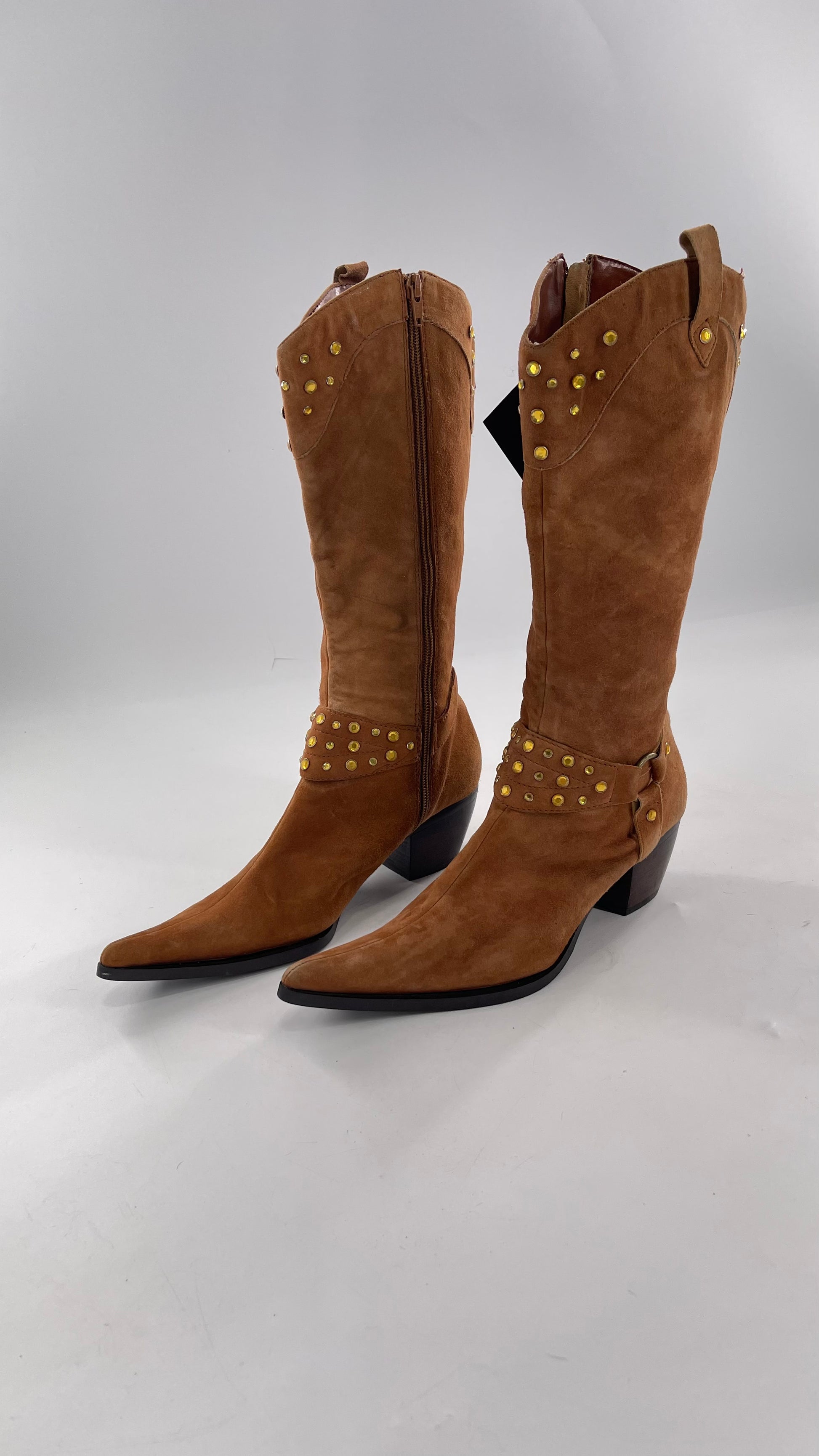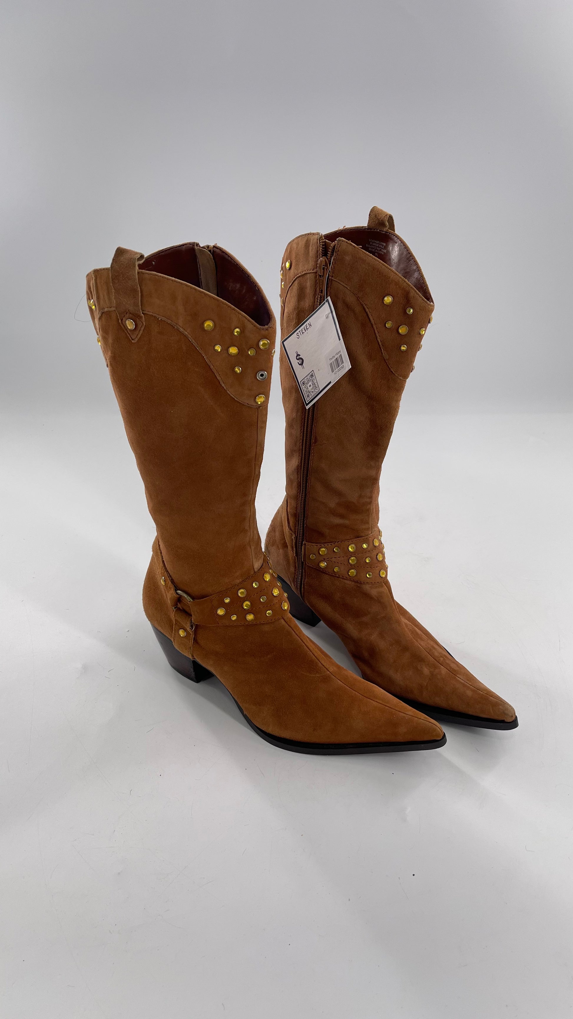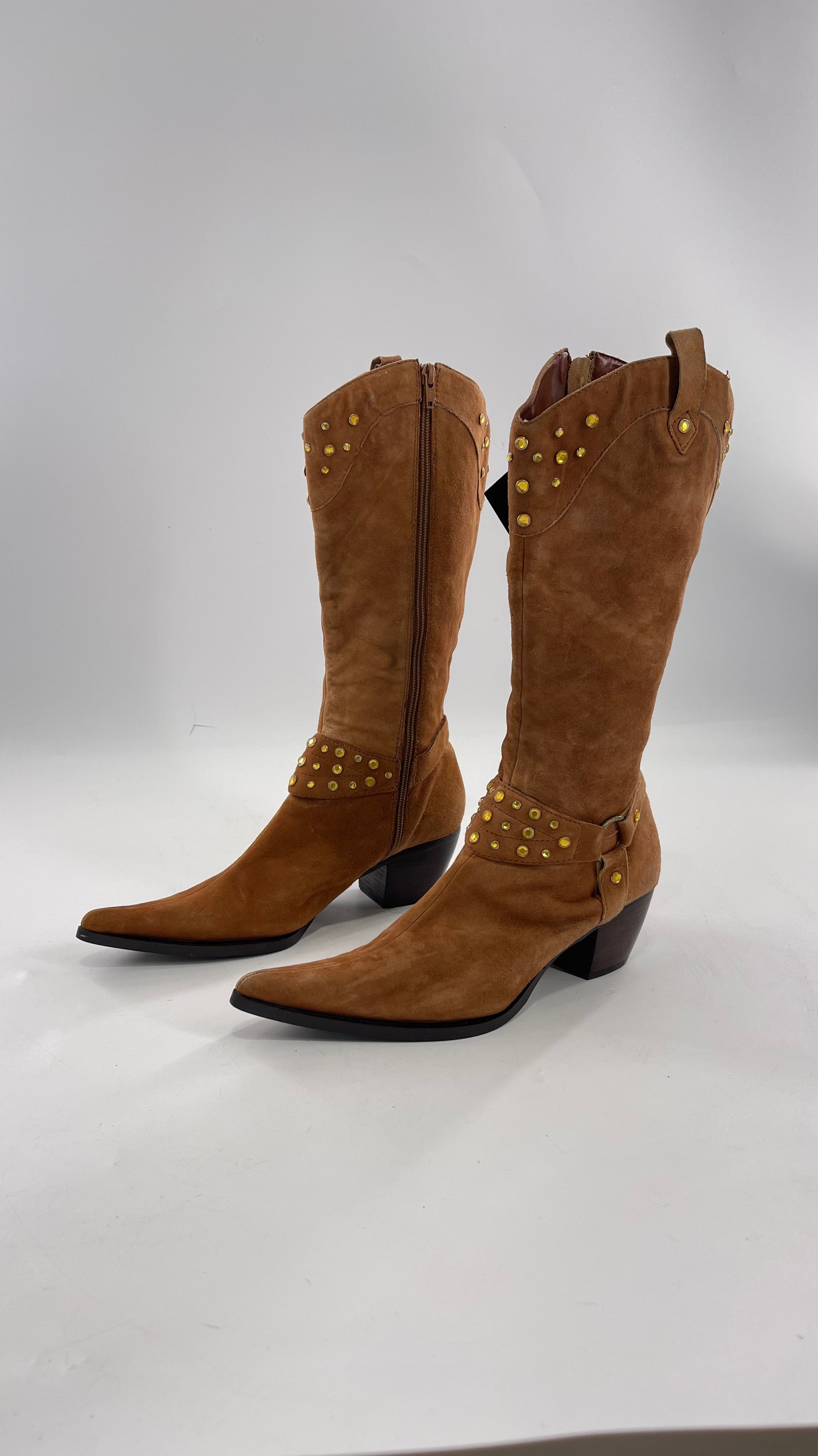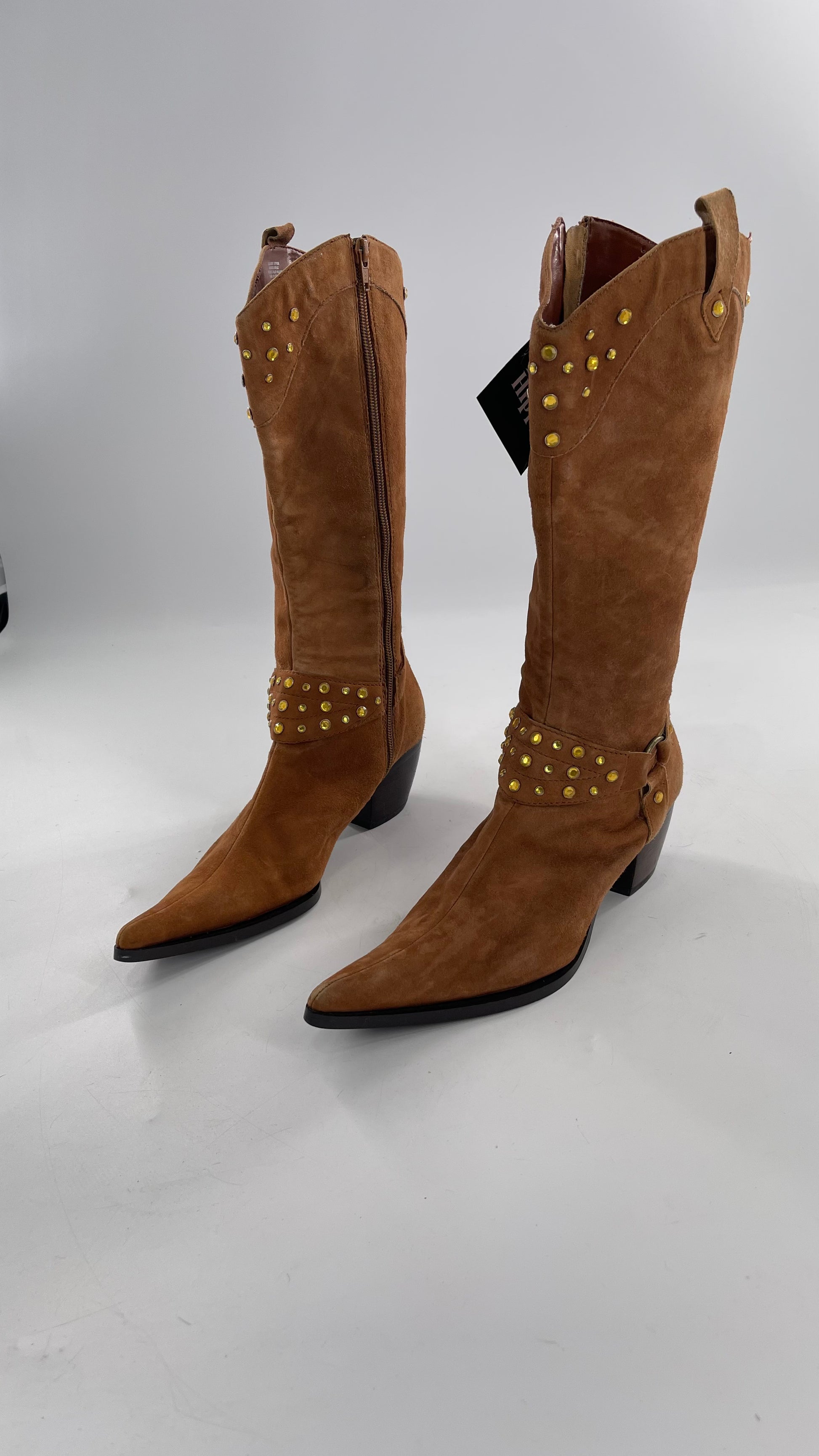 Vintage Tan Suede Pointed Cowboy Boots with Yellow Crystal Embellishments (9.5)