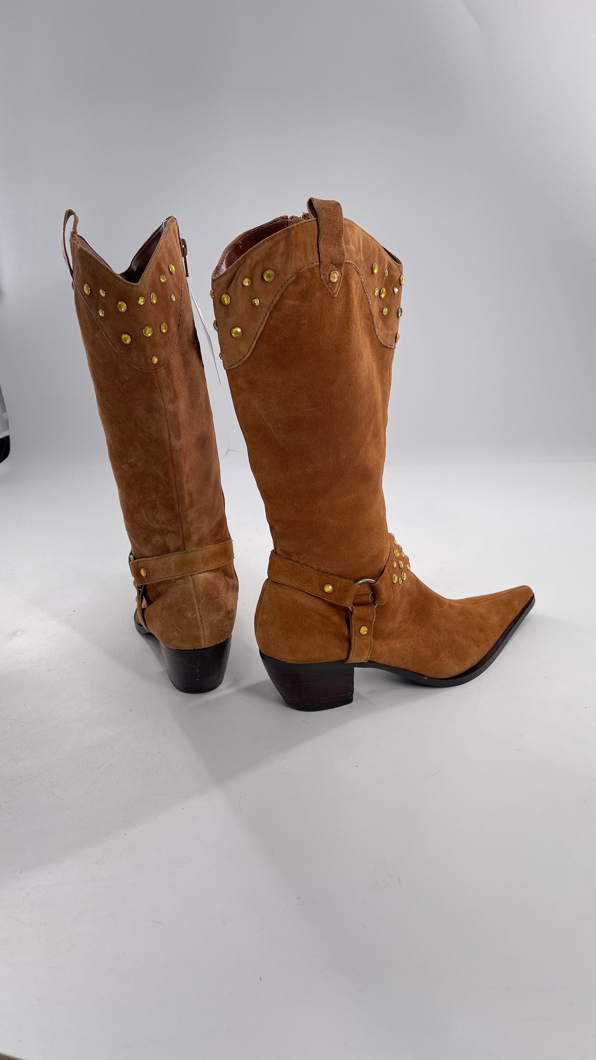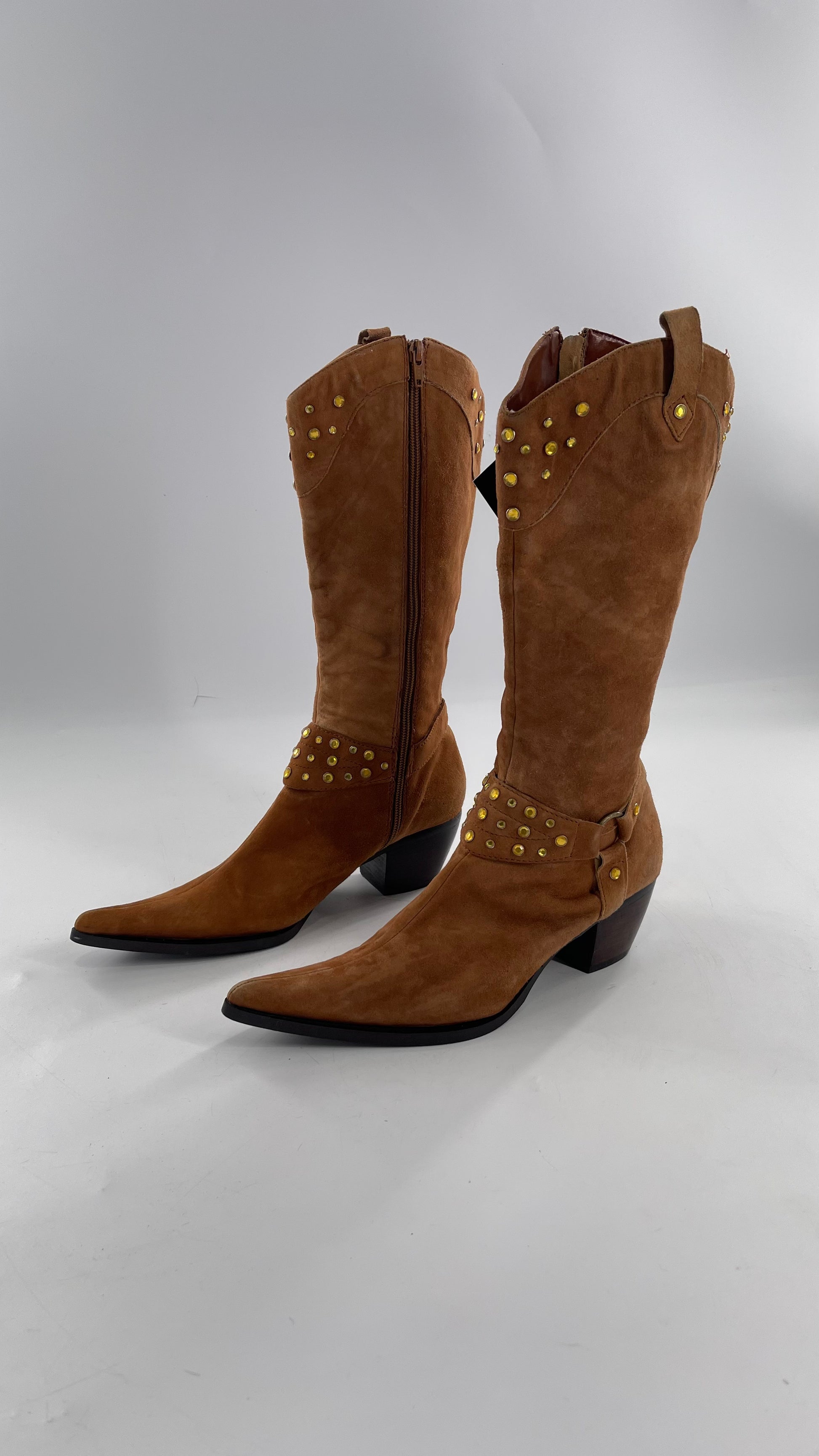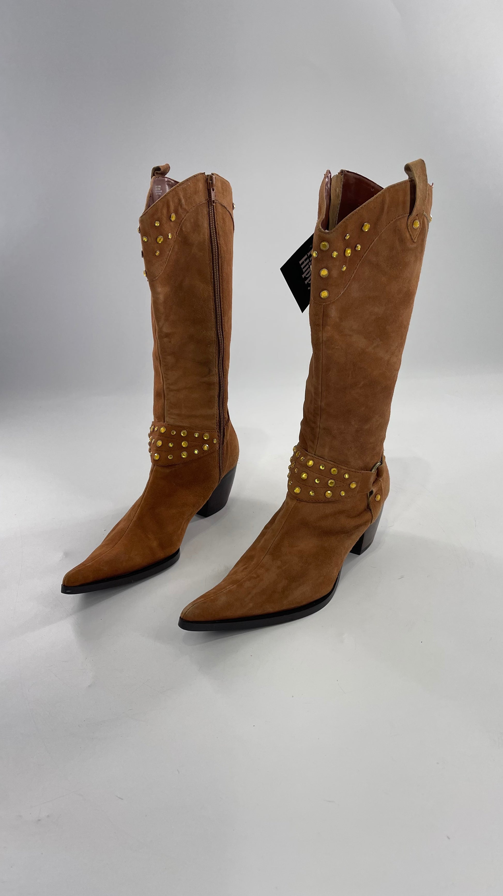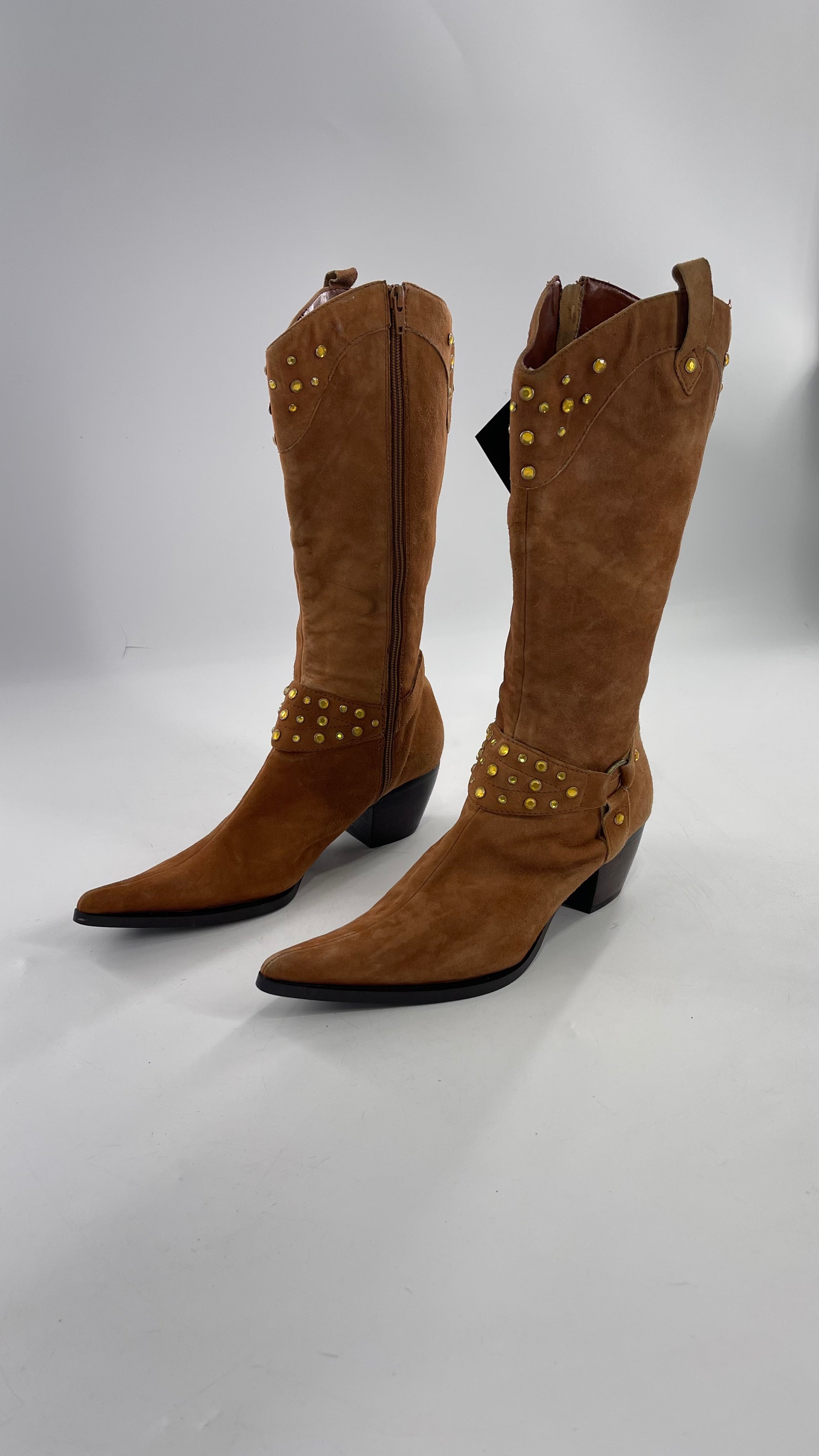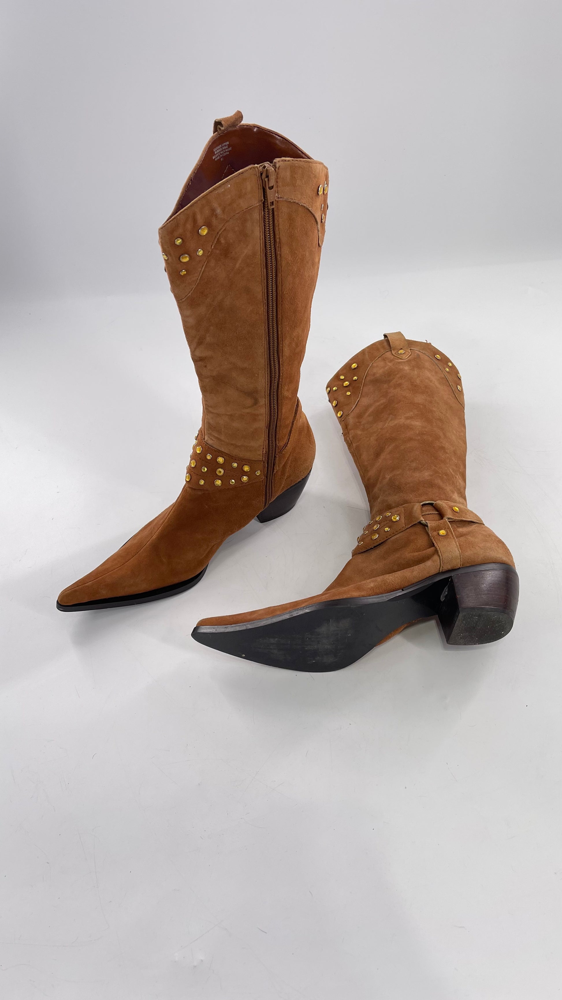 Vintage Tan Suede Pointed Cowboy Boots with Yellow Crystal Embellishments (9.5)