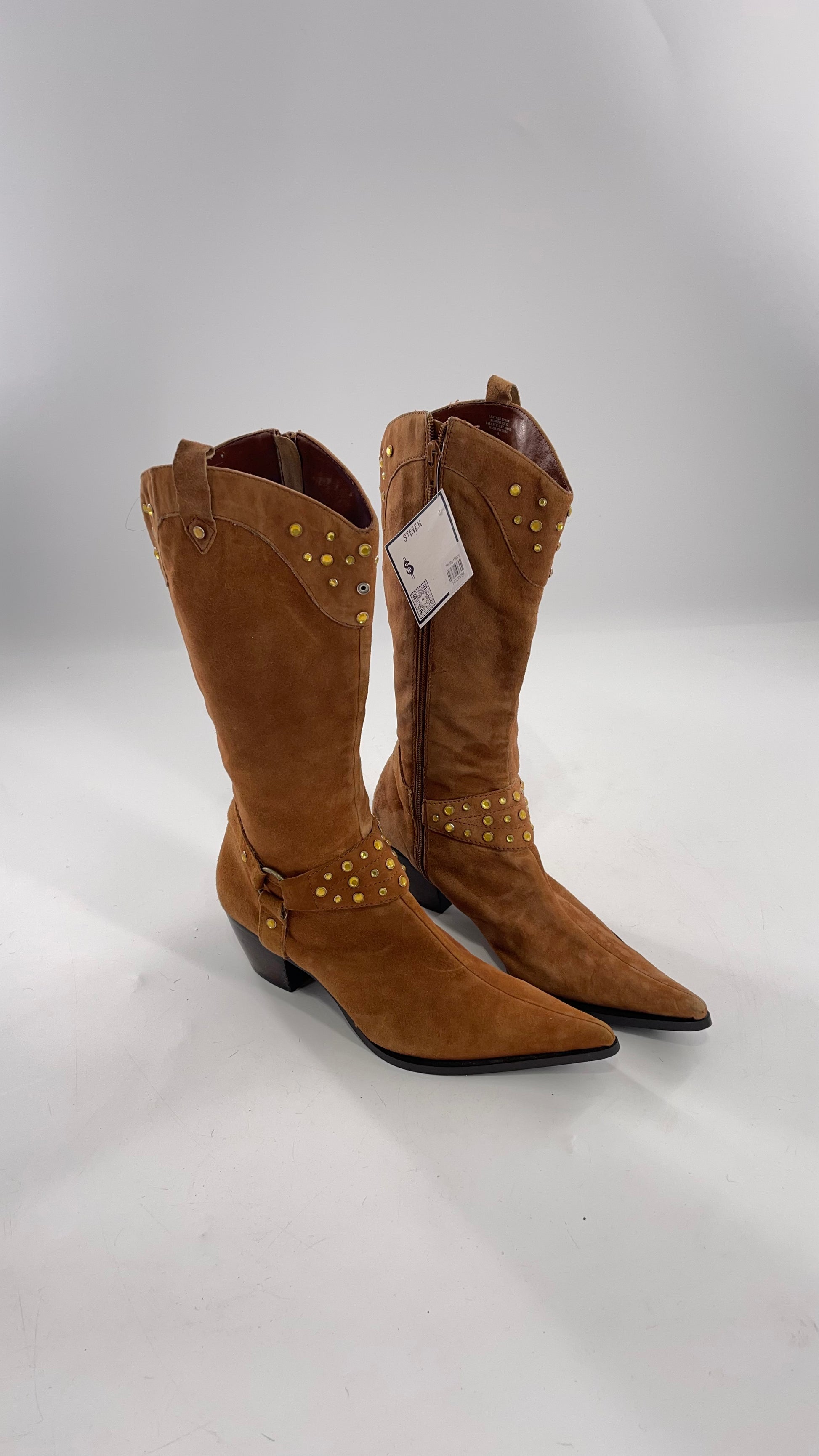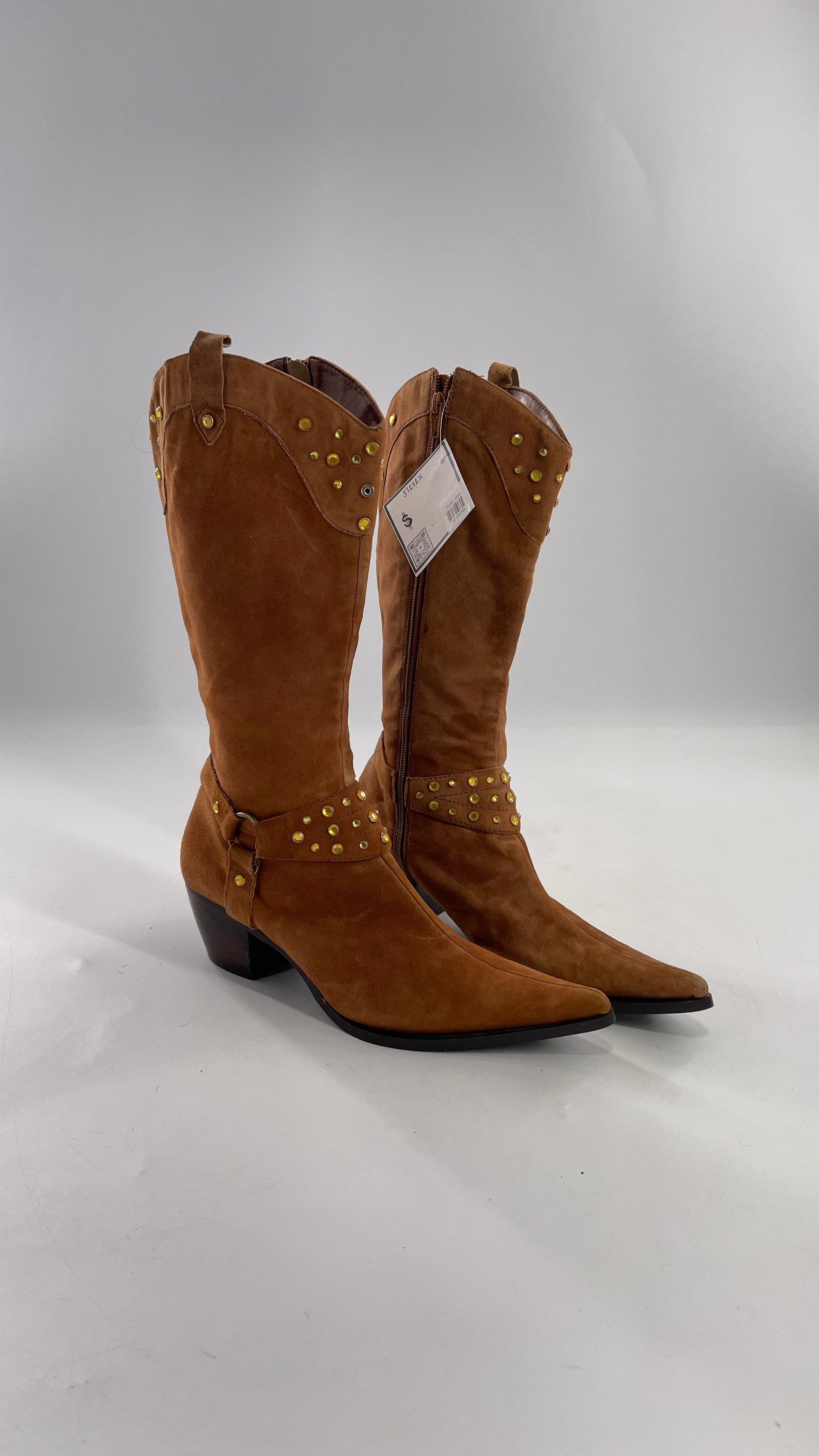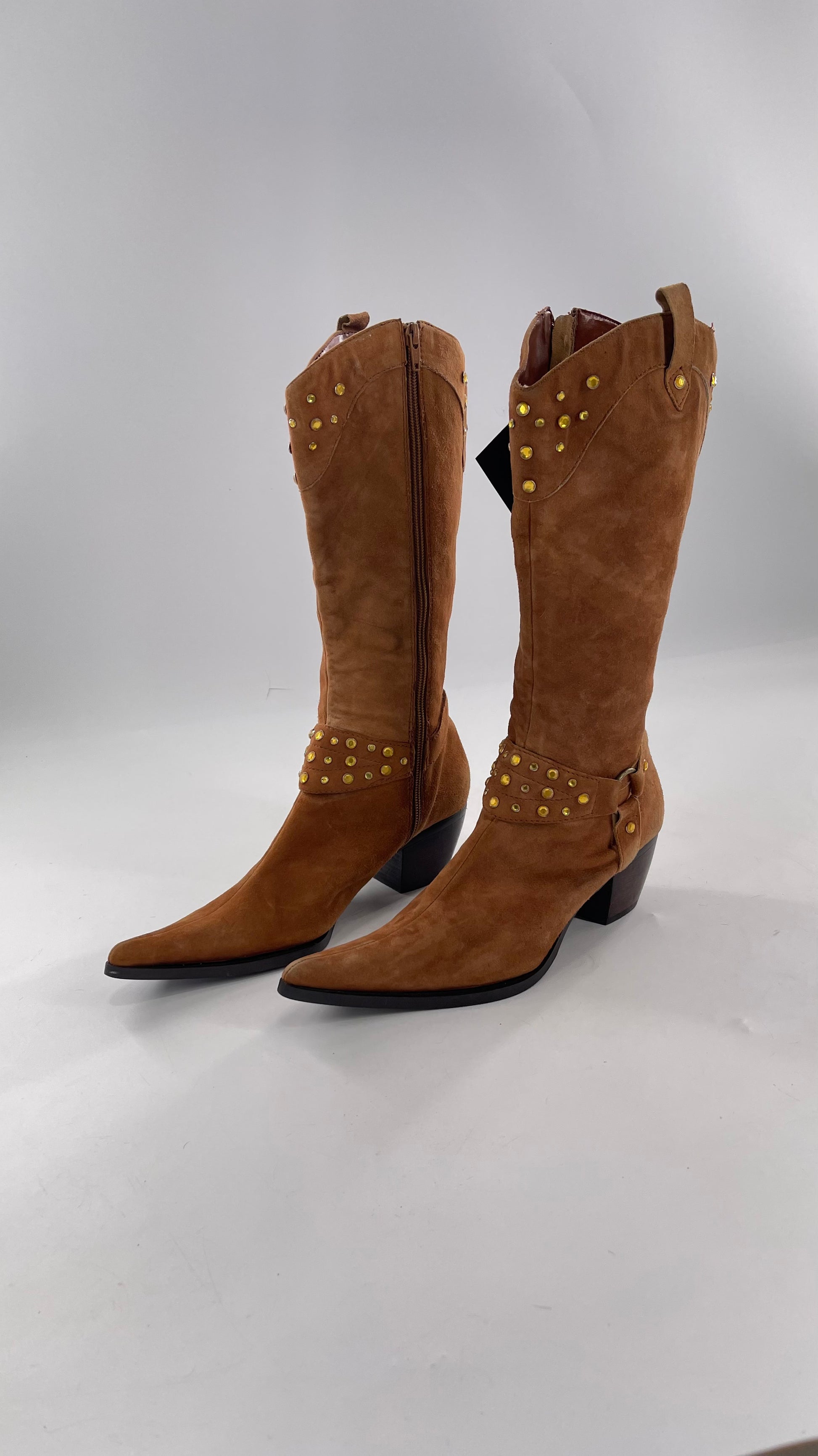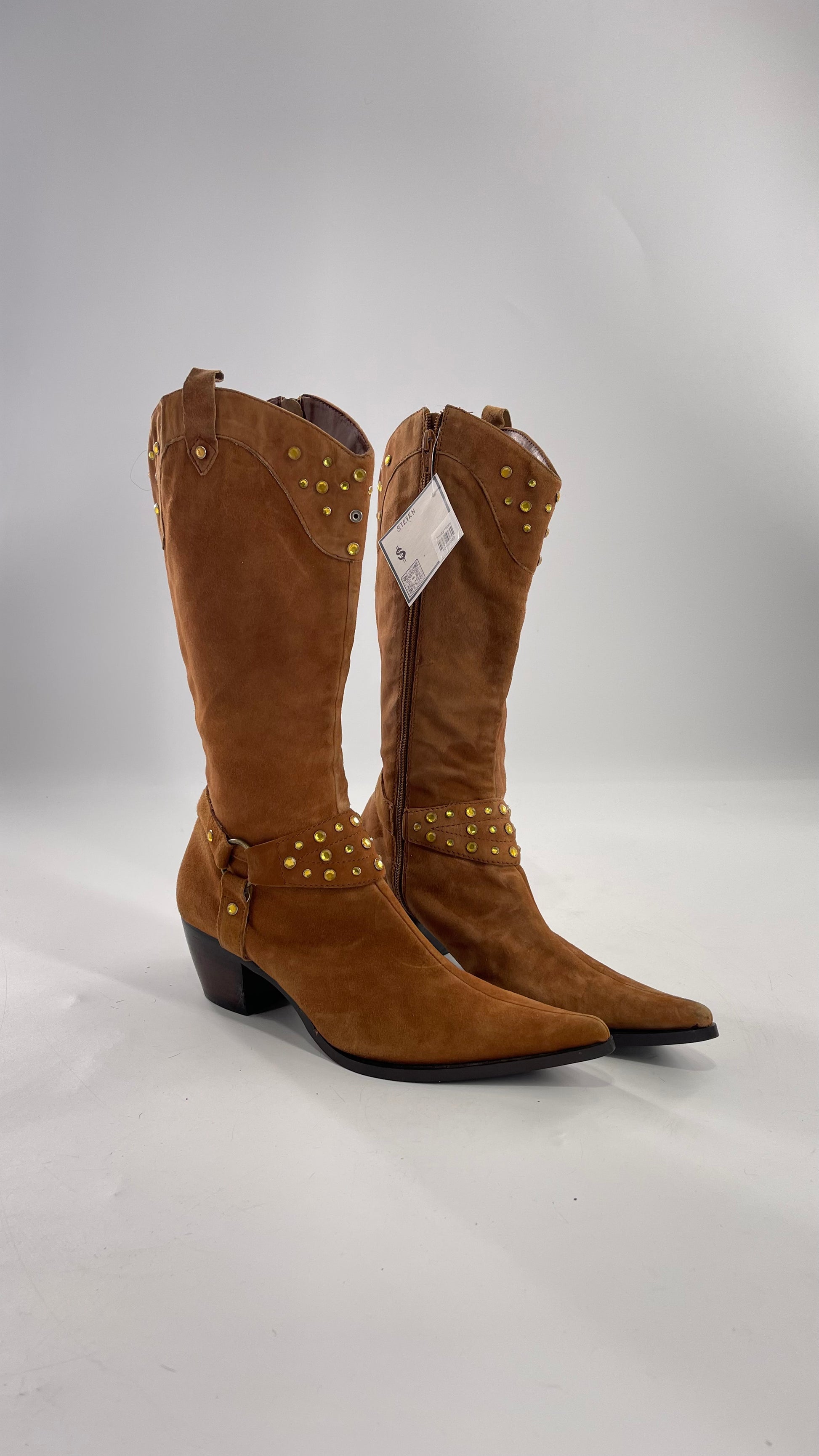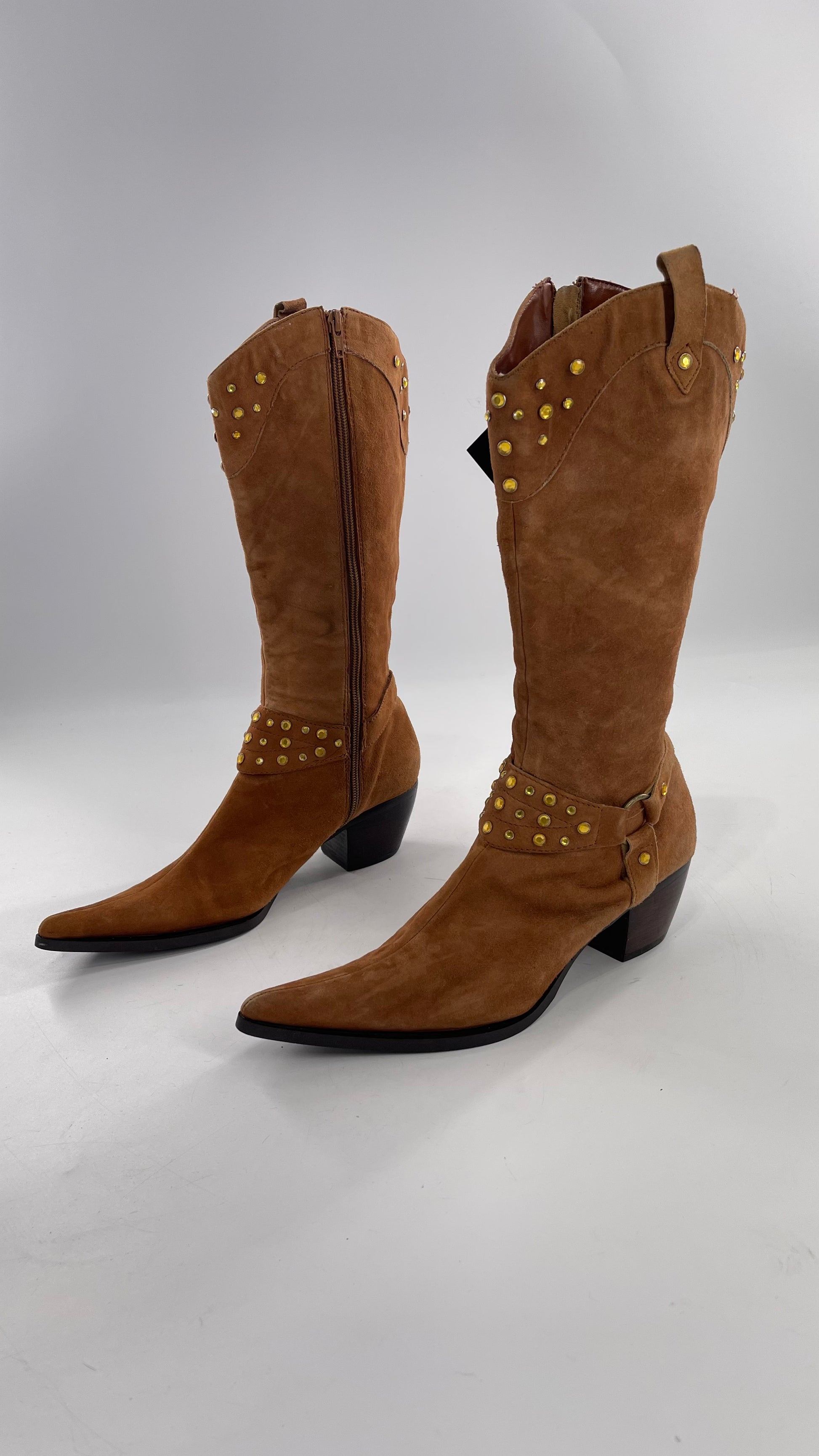Vintage Tan Suede Pointed Cowboy Boots with Yellow Crystal Embellishments (9.5)