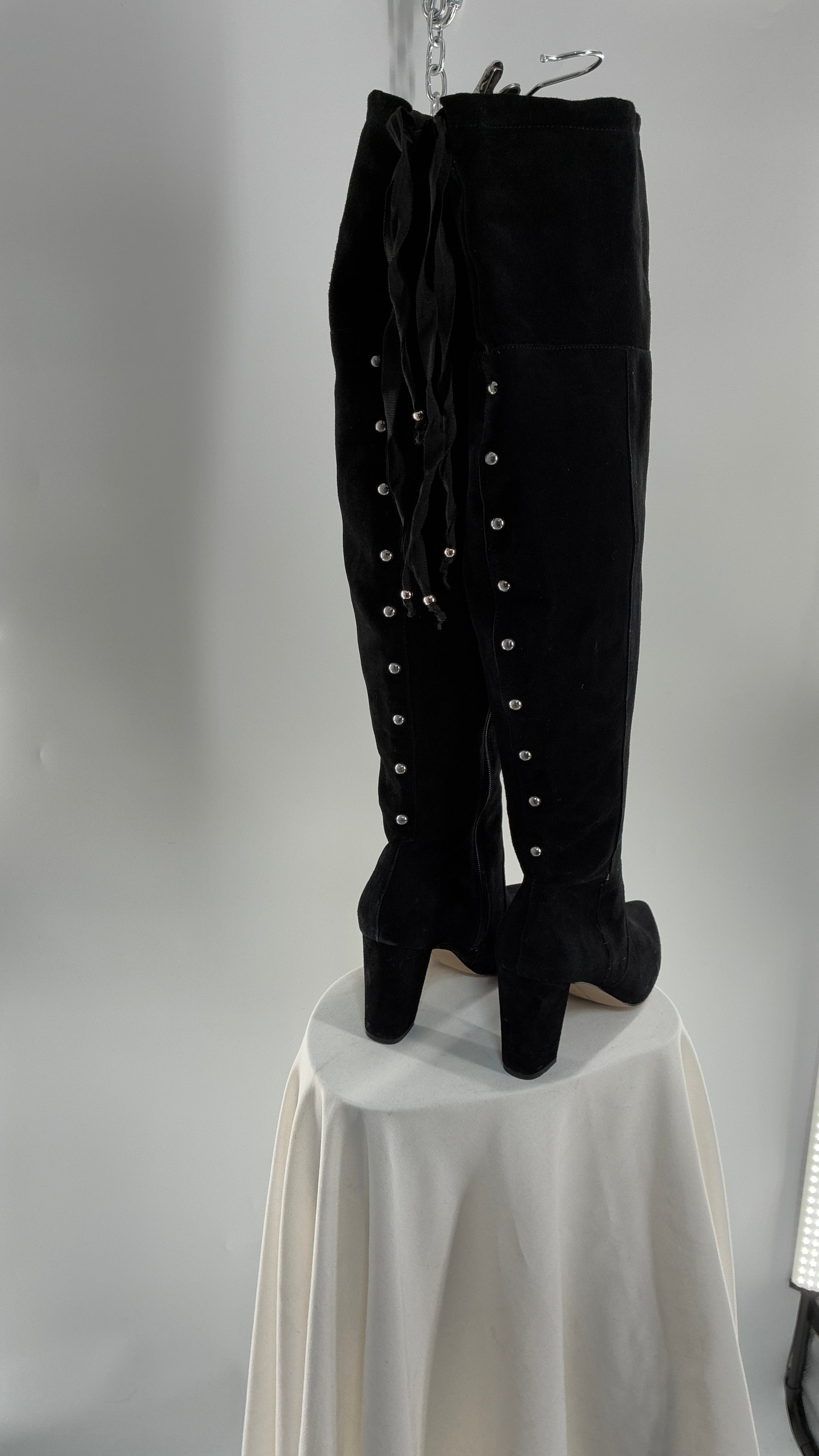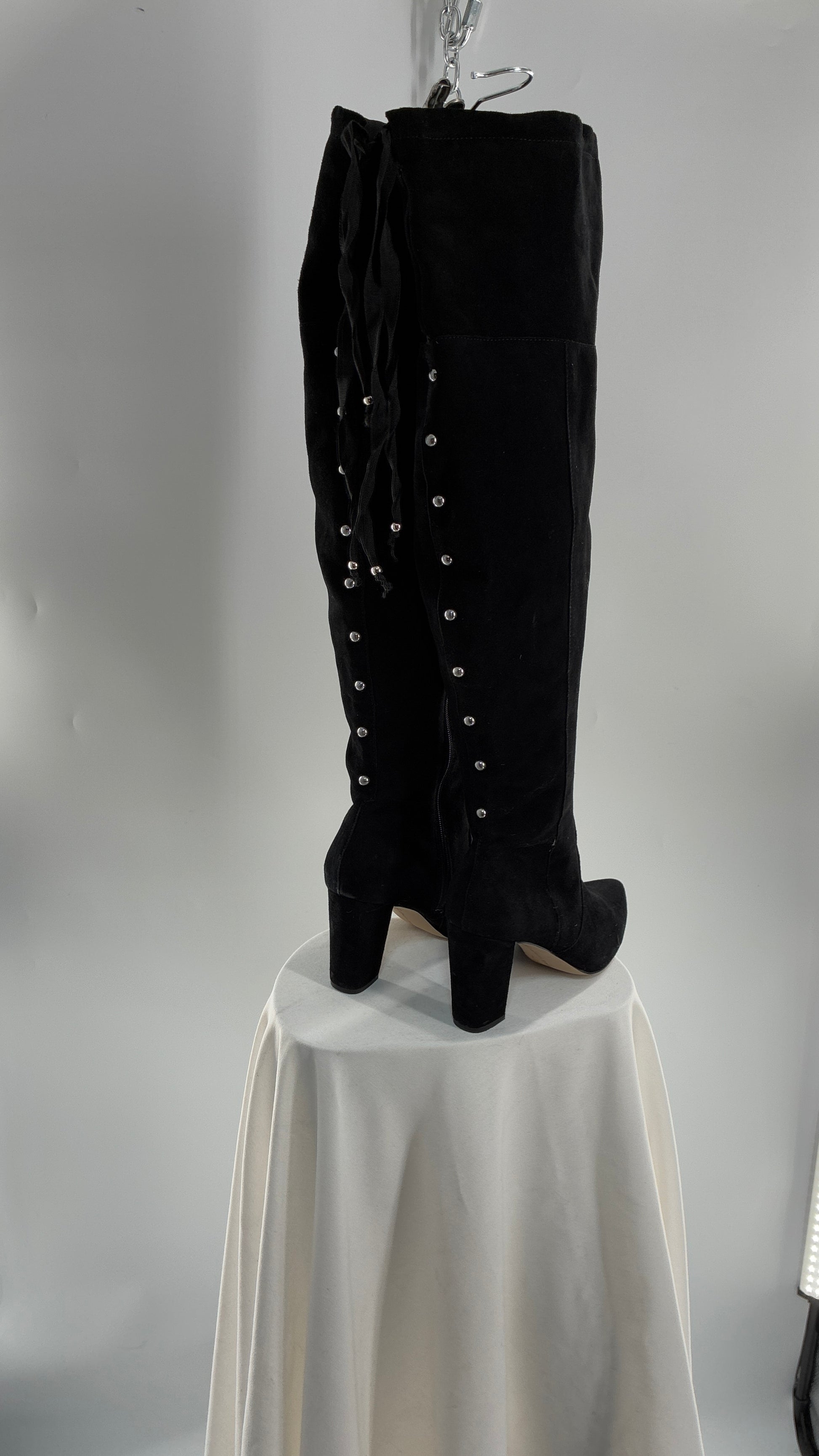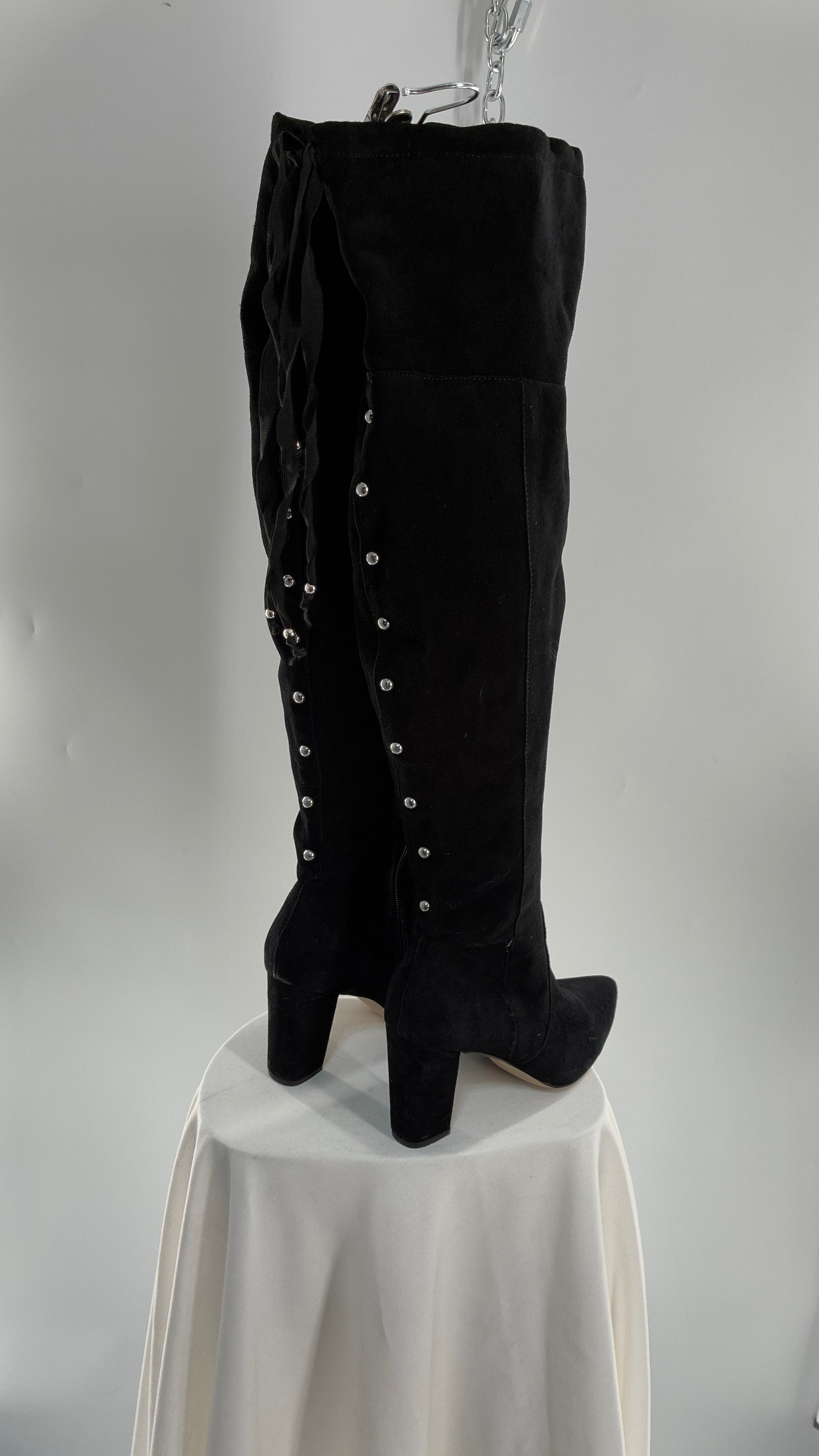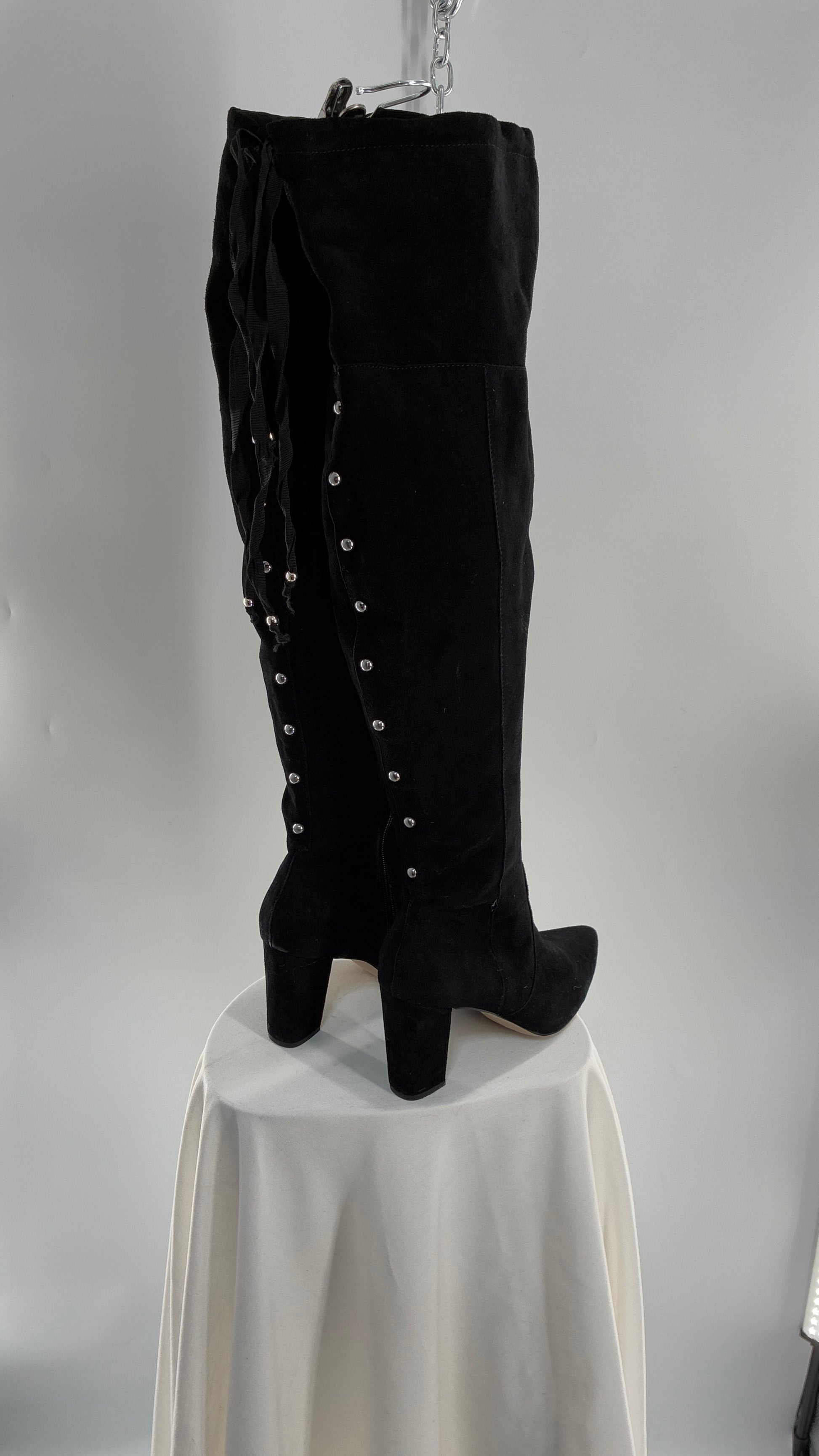 Vintage Black Genuine Suede ADRIENNE VITADINI Thigh High Pointed Toe Boots with Stud Detailing (10)