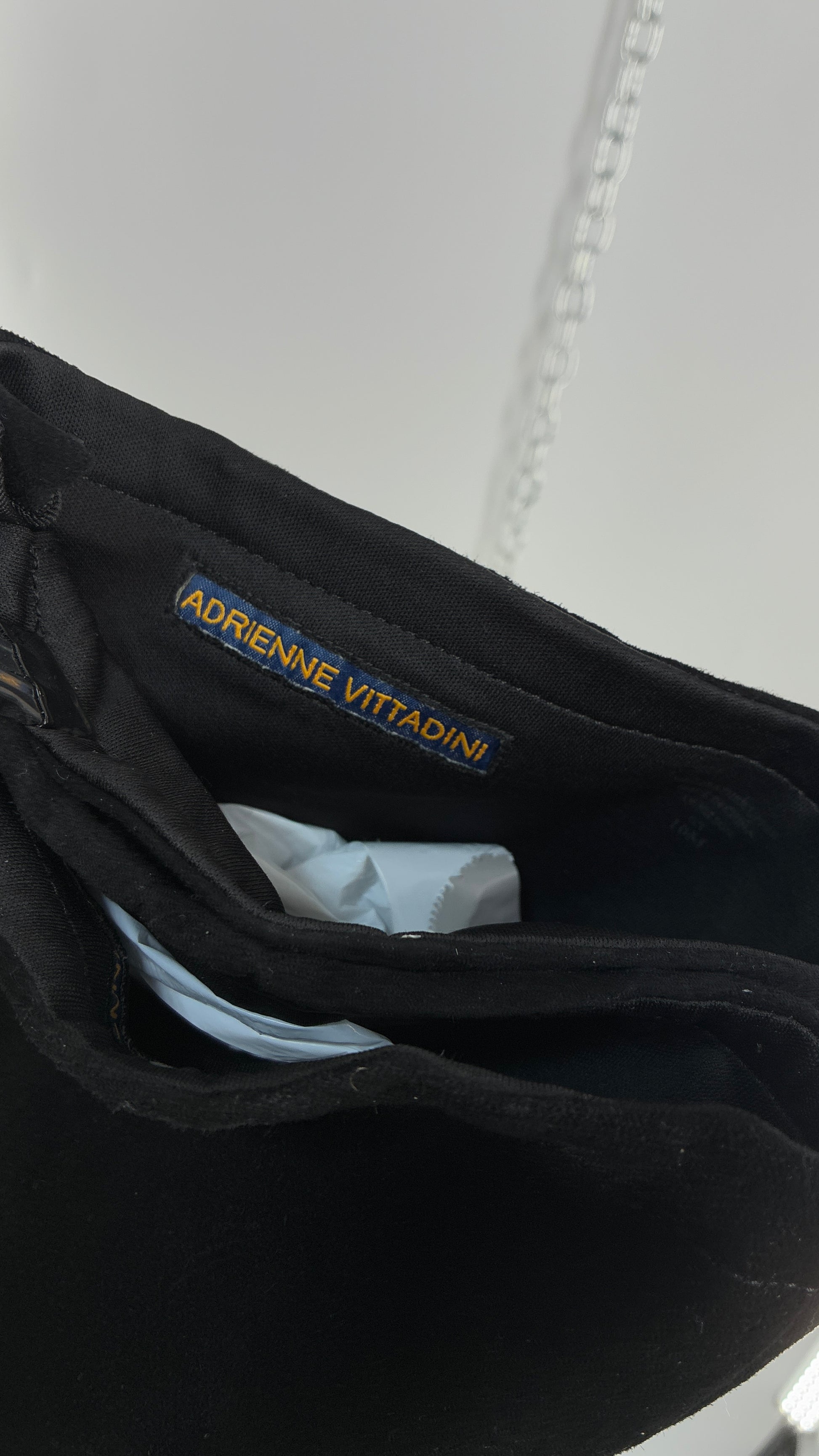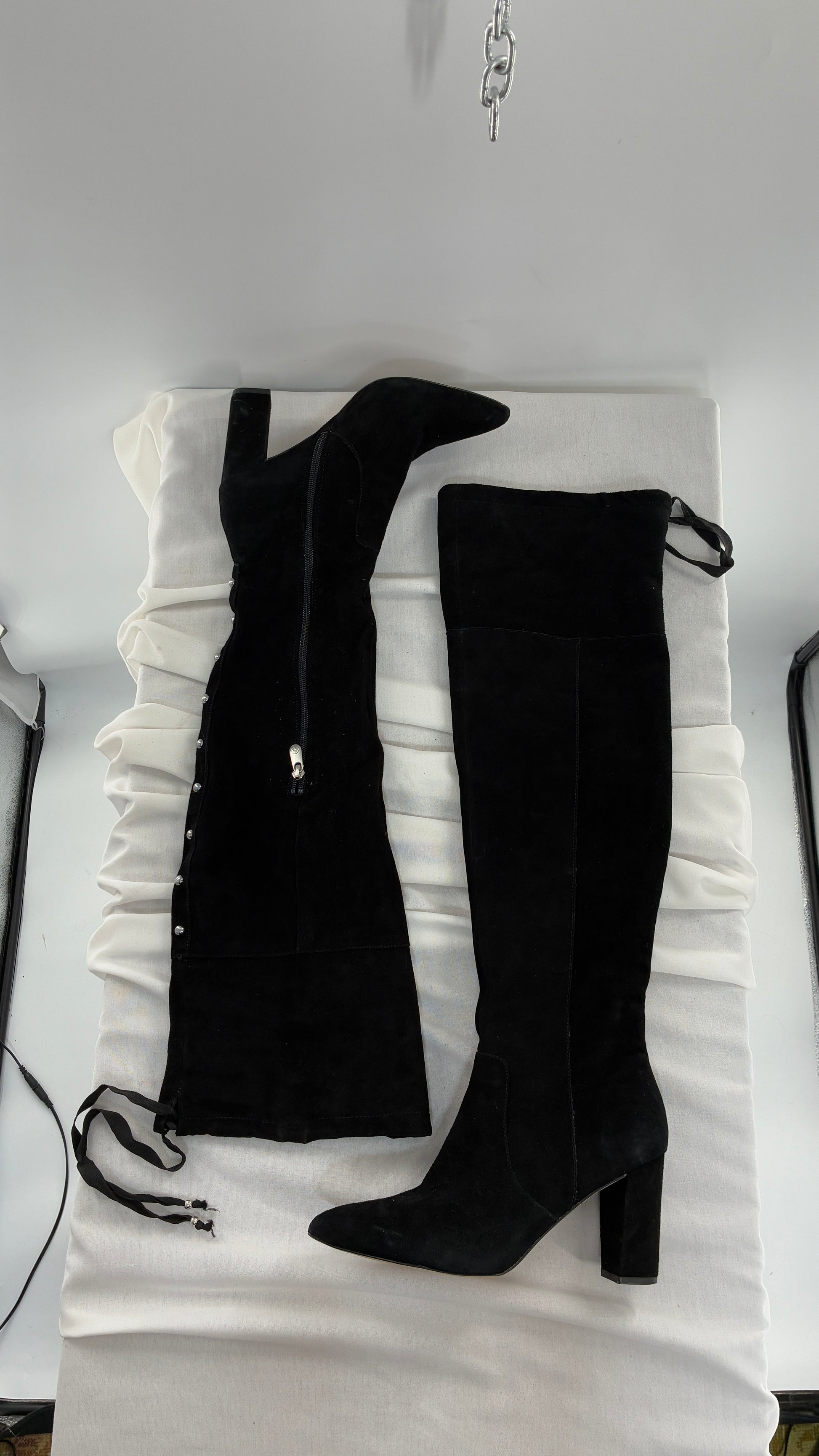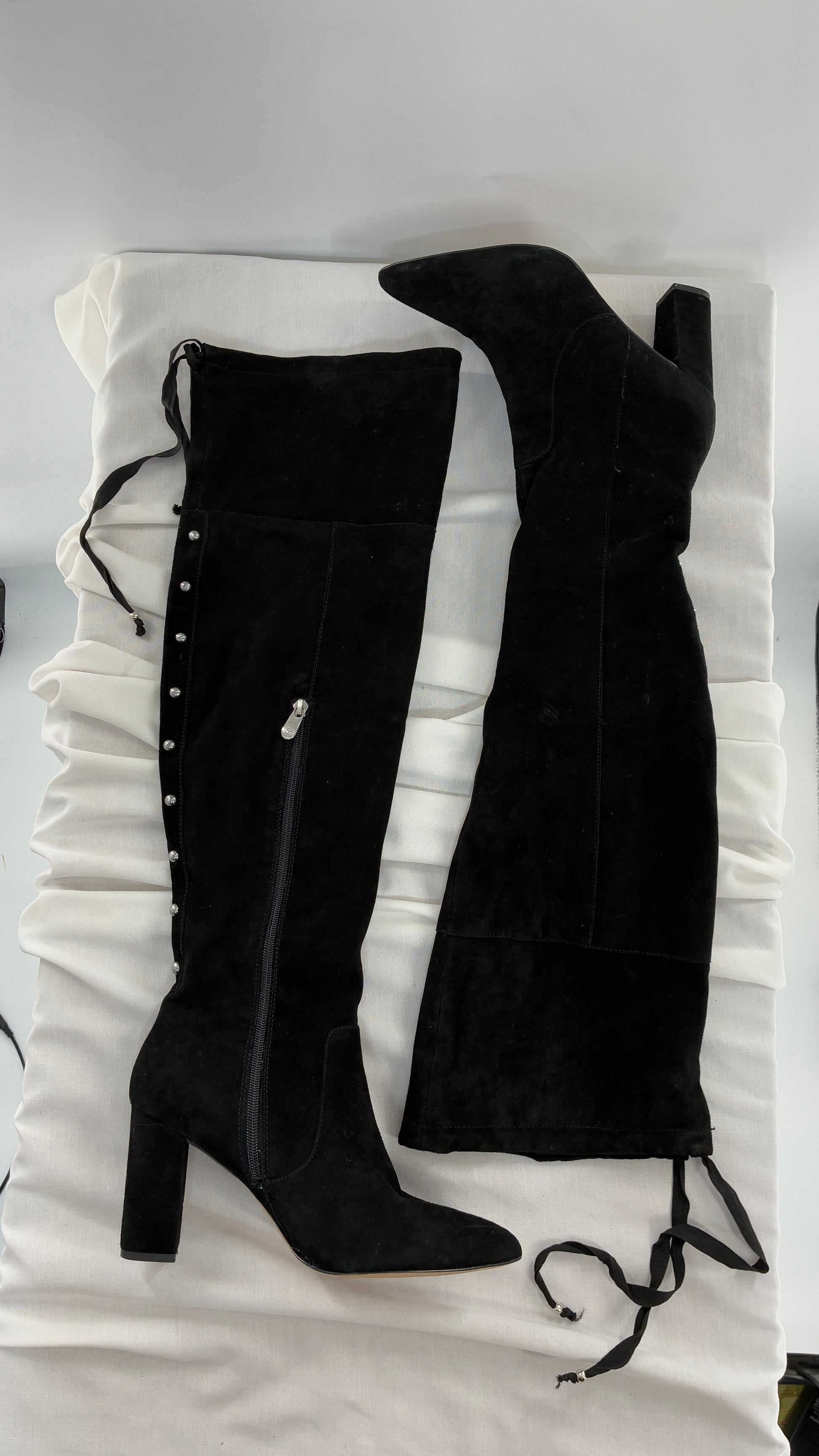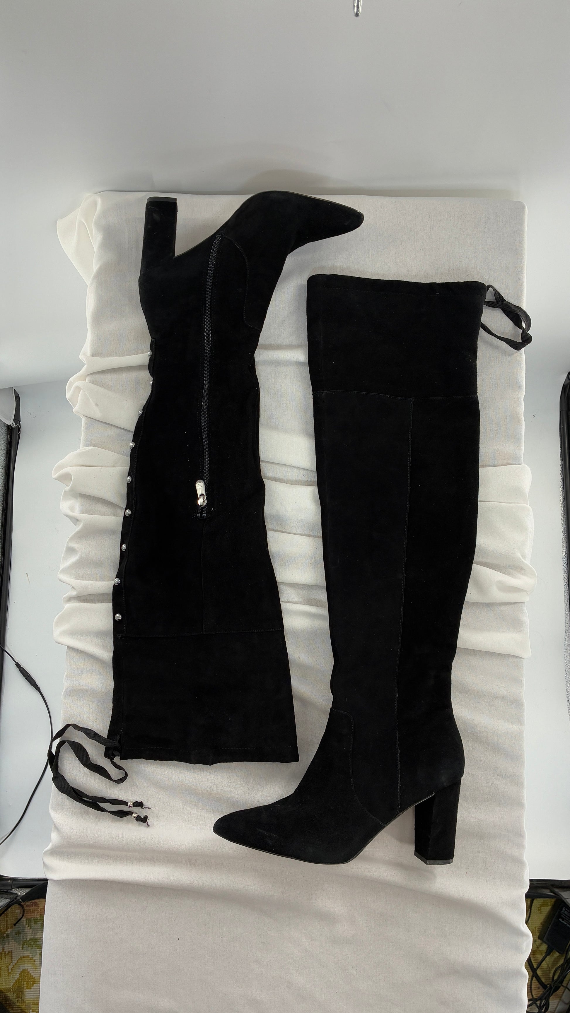 Vintage Black Genuine Suede ADRIENNE VITADINI Thigh High Pointed Toe Boots with Stud Detailing