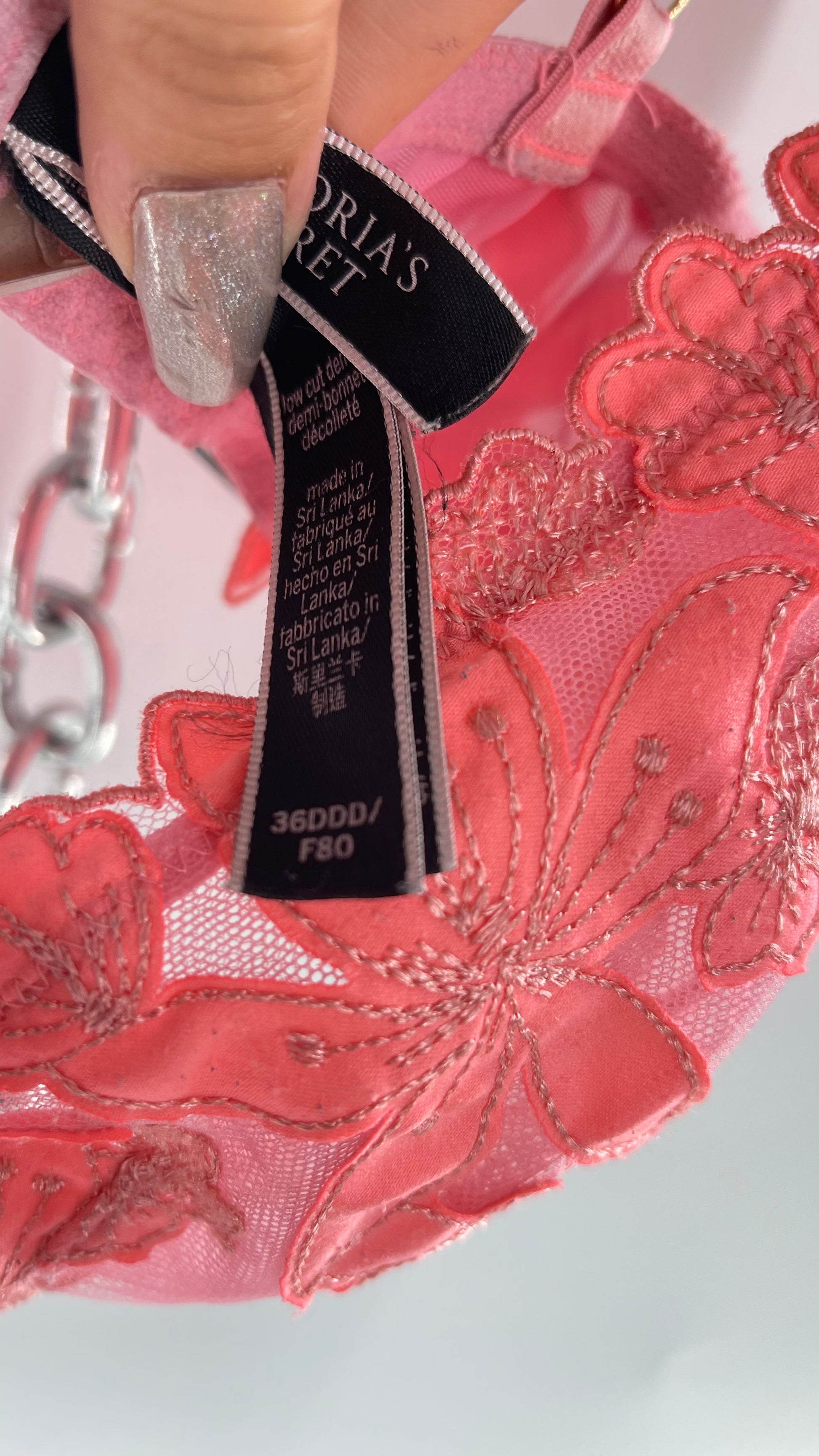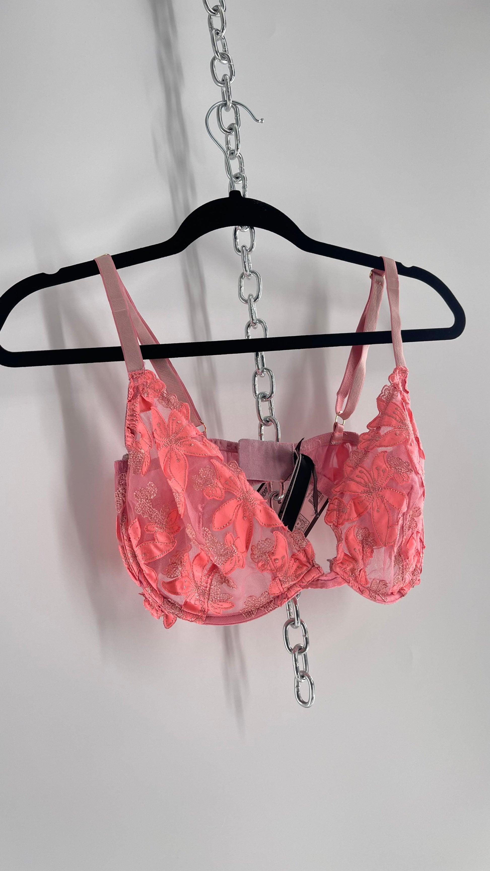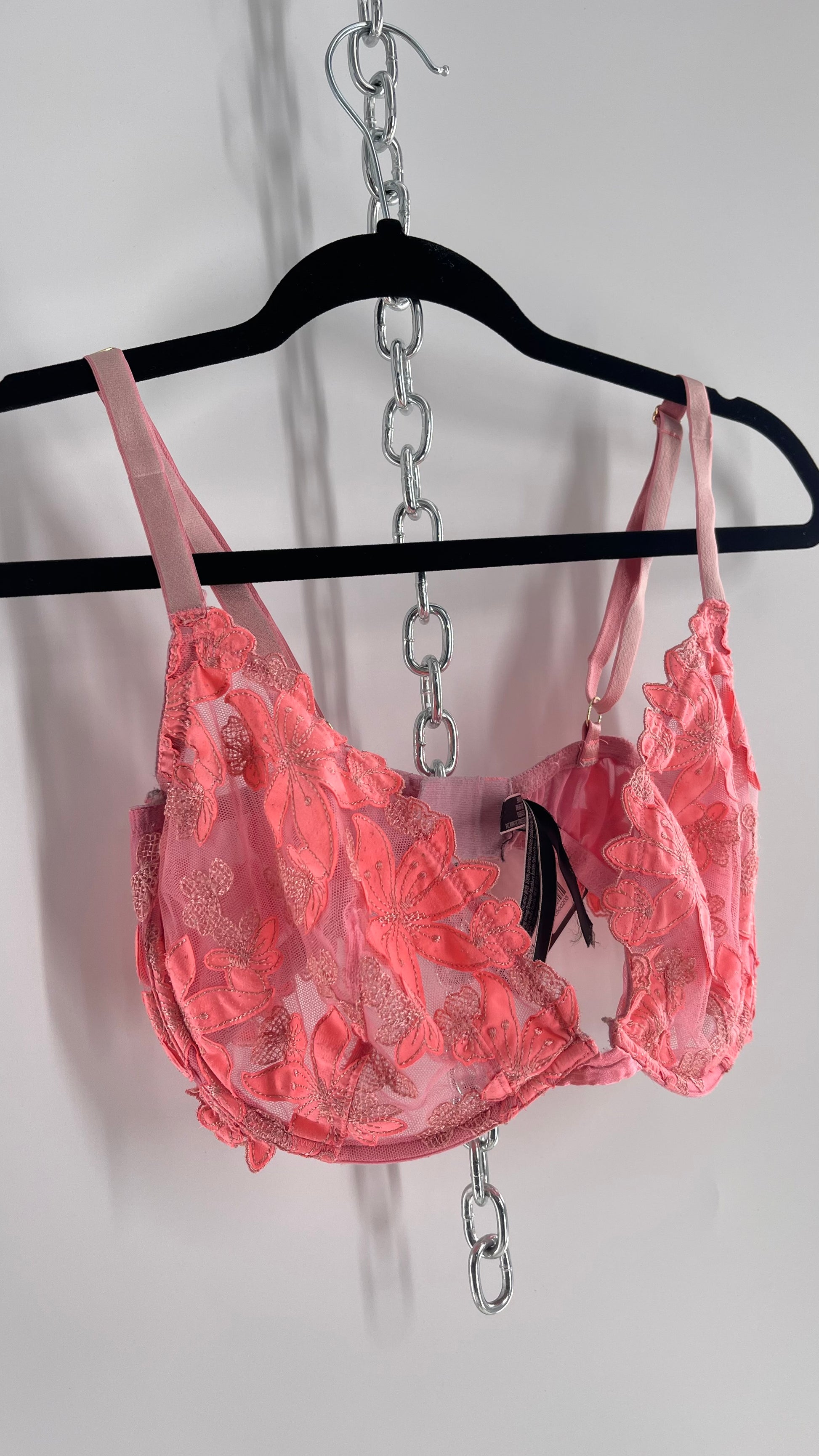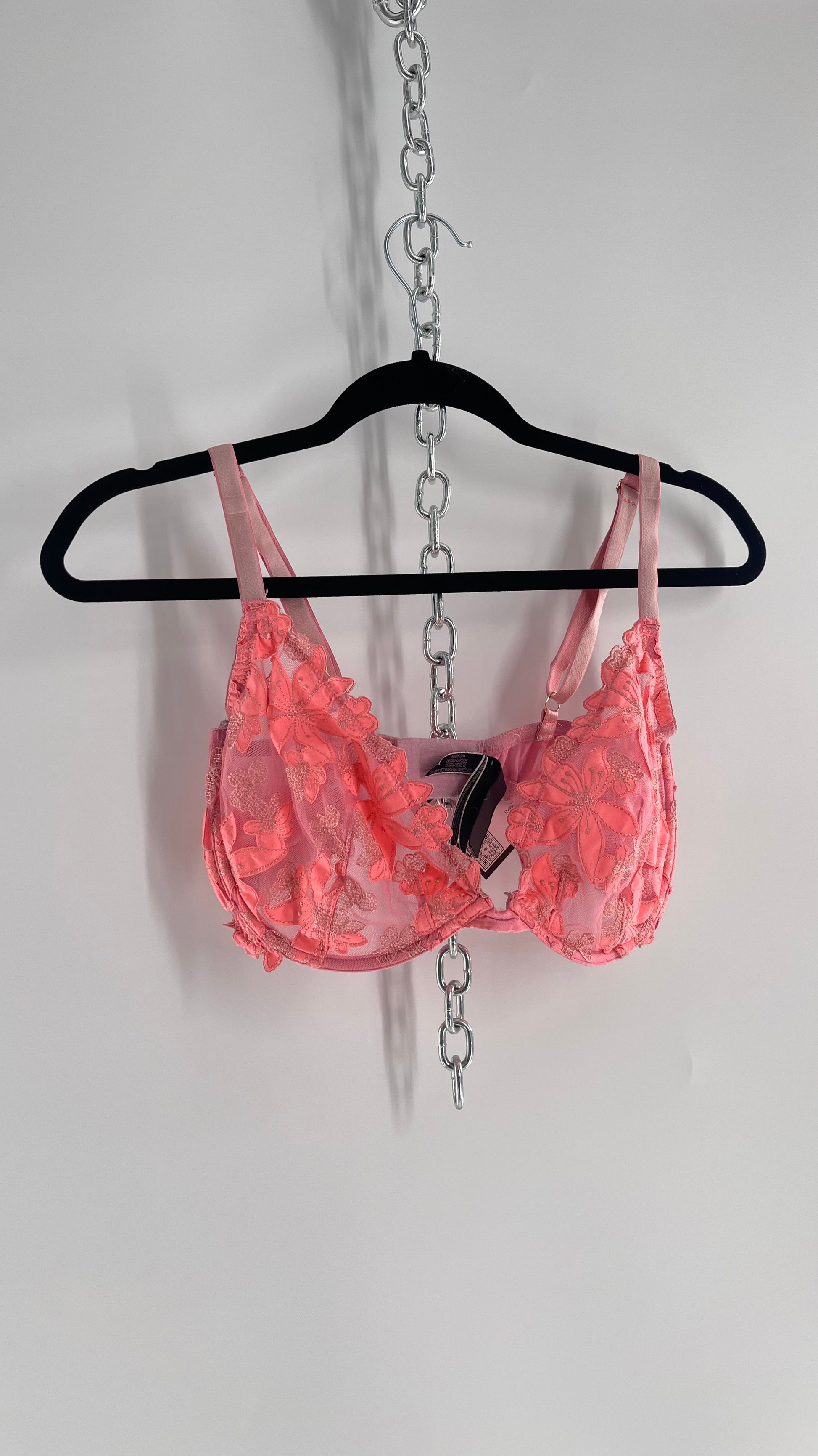 Vintage Victorias Secret Neon Pink Mesh Bra with Floral Appliqués (36DDD)